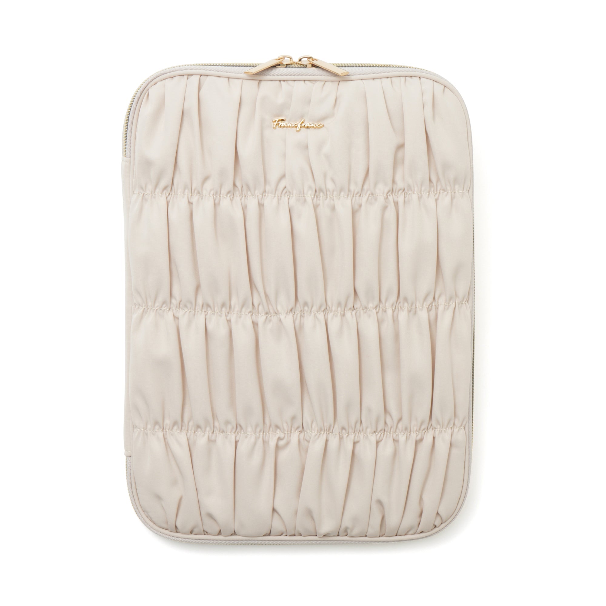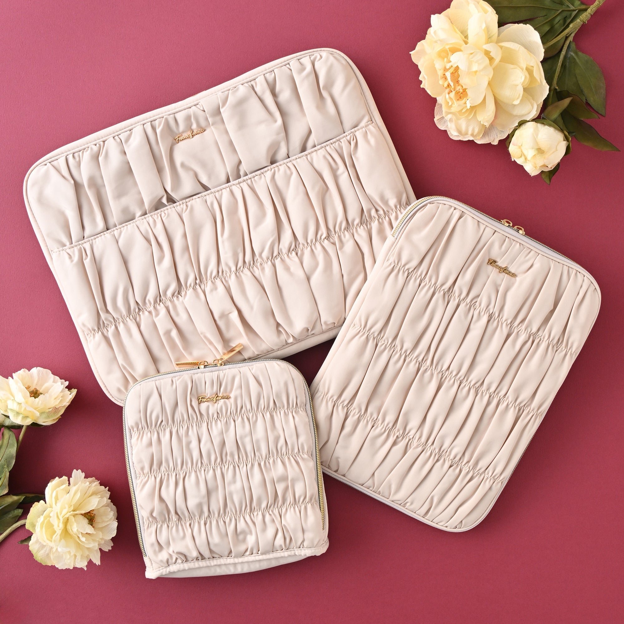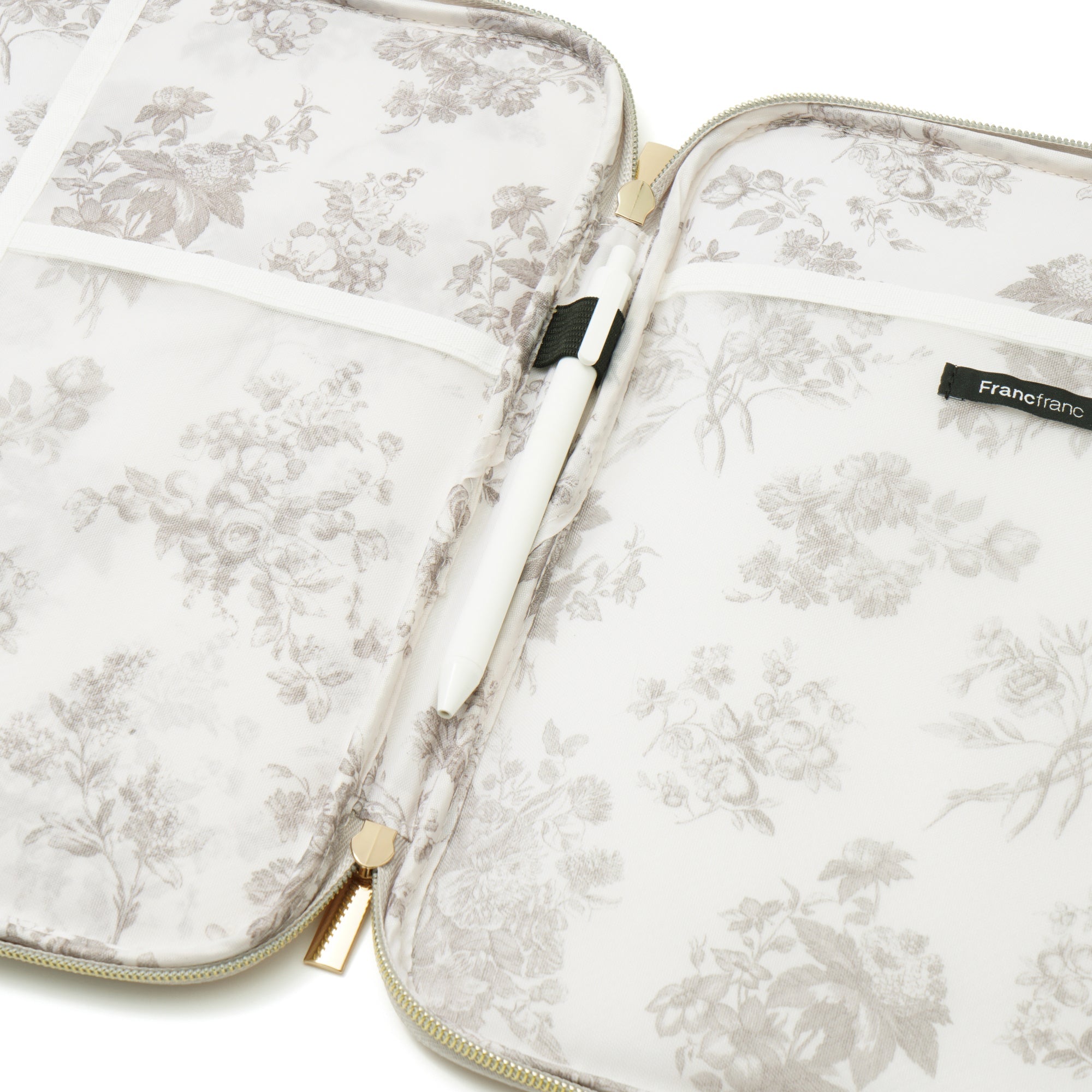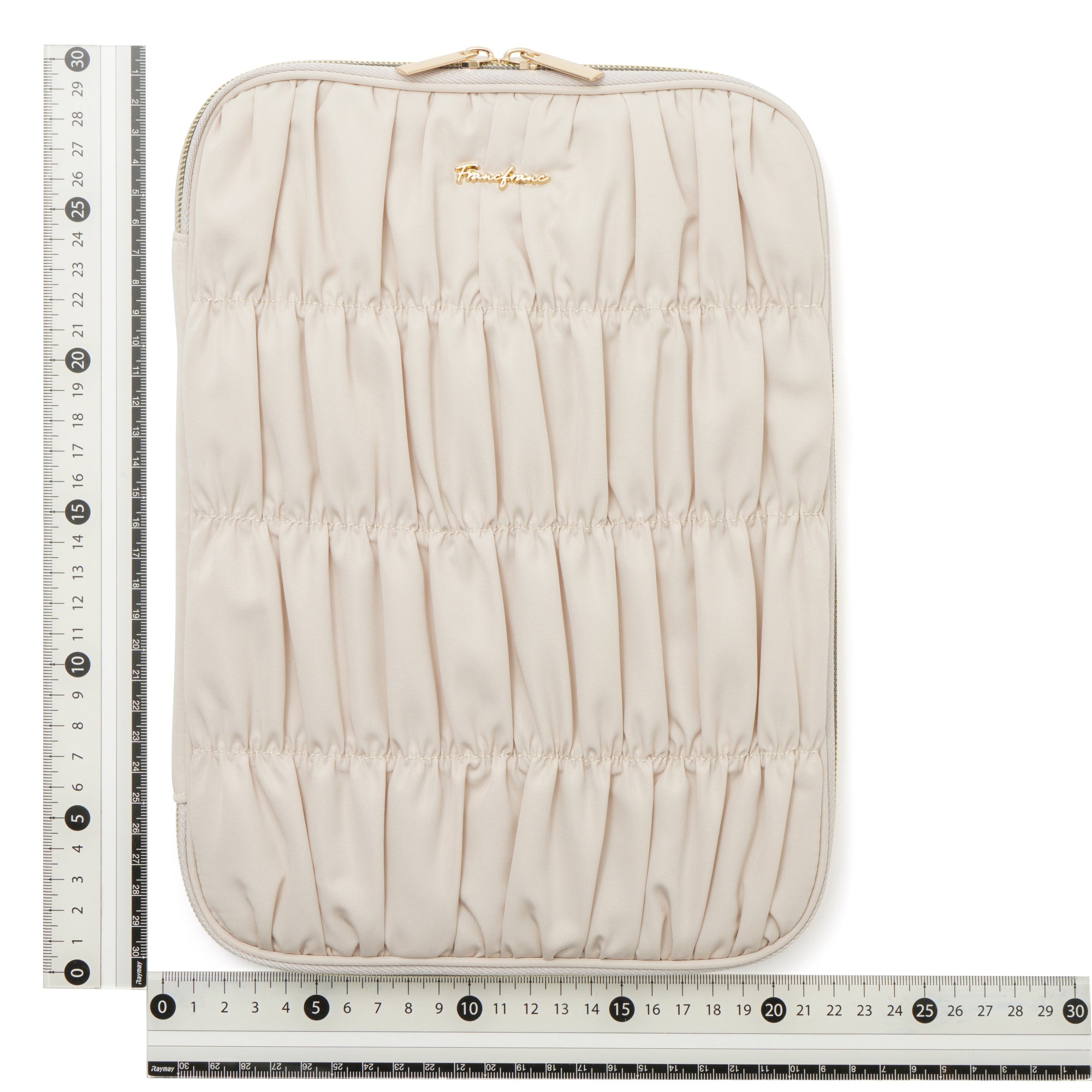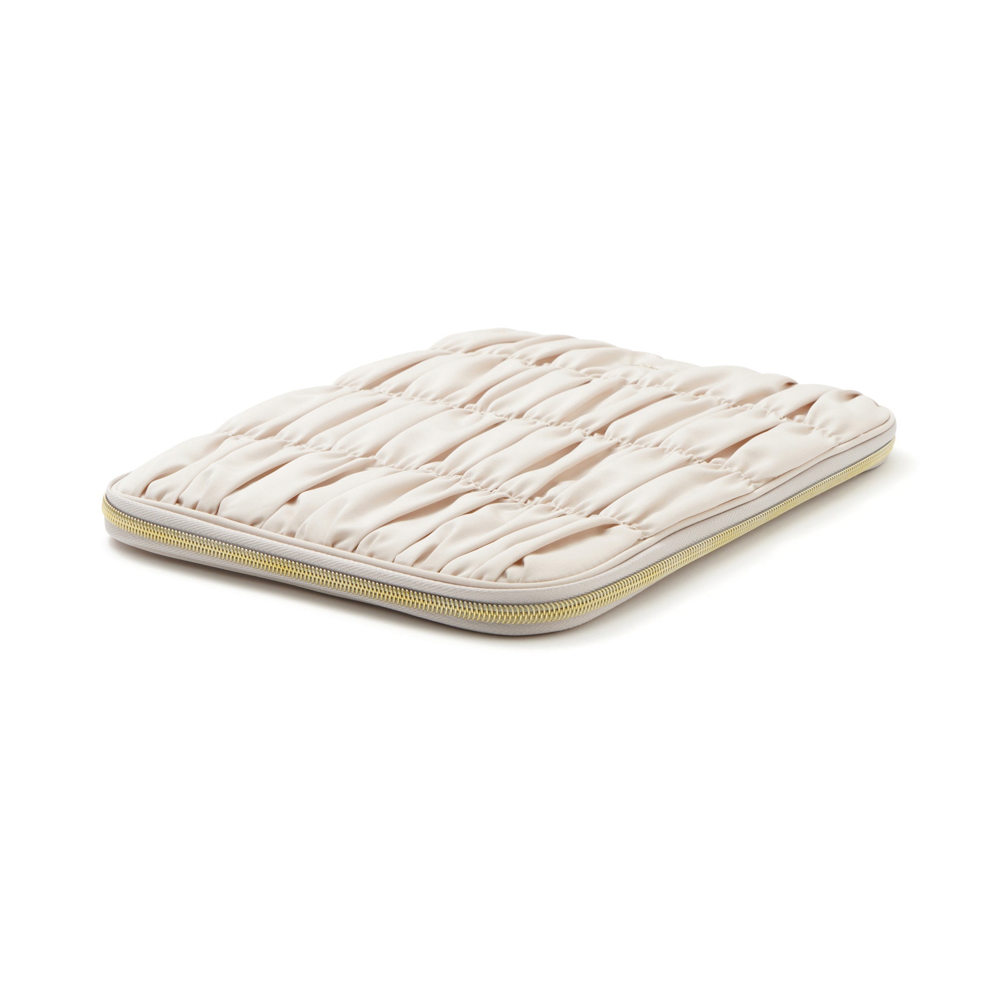 テレワーク生活に便利なタブレットケースです。10.2~11インチ対応、ペンホルダーとポケット2つ付きで仕事道具が使いやすく収納できます。大人っぽいギャザーデザインで、オフィスやワーキングスペースで素敵にお使いいただけます。