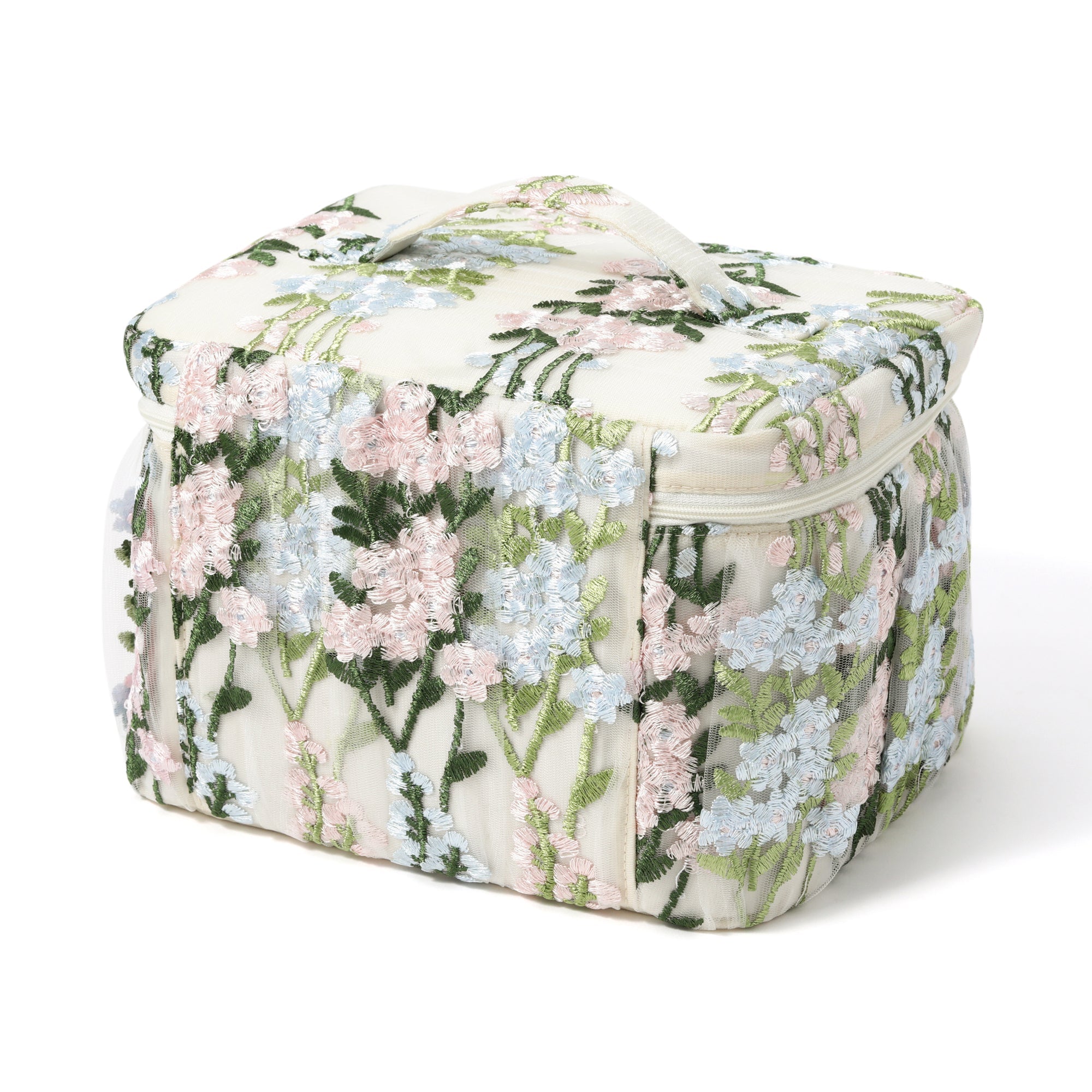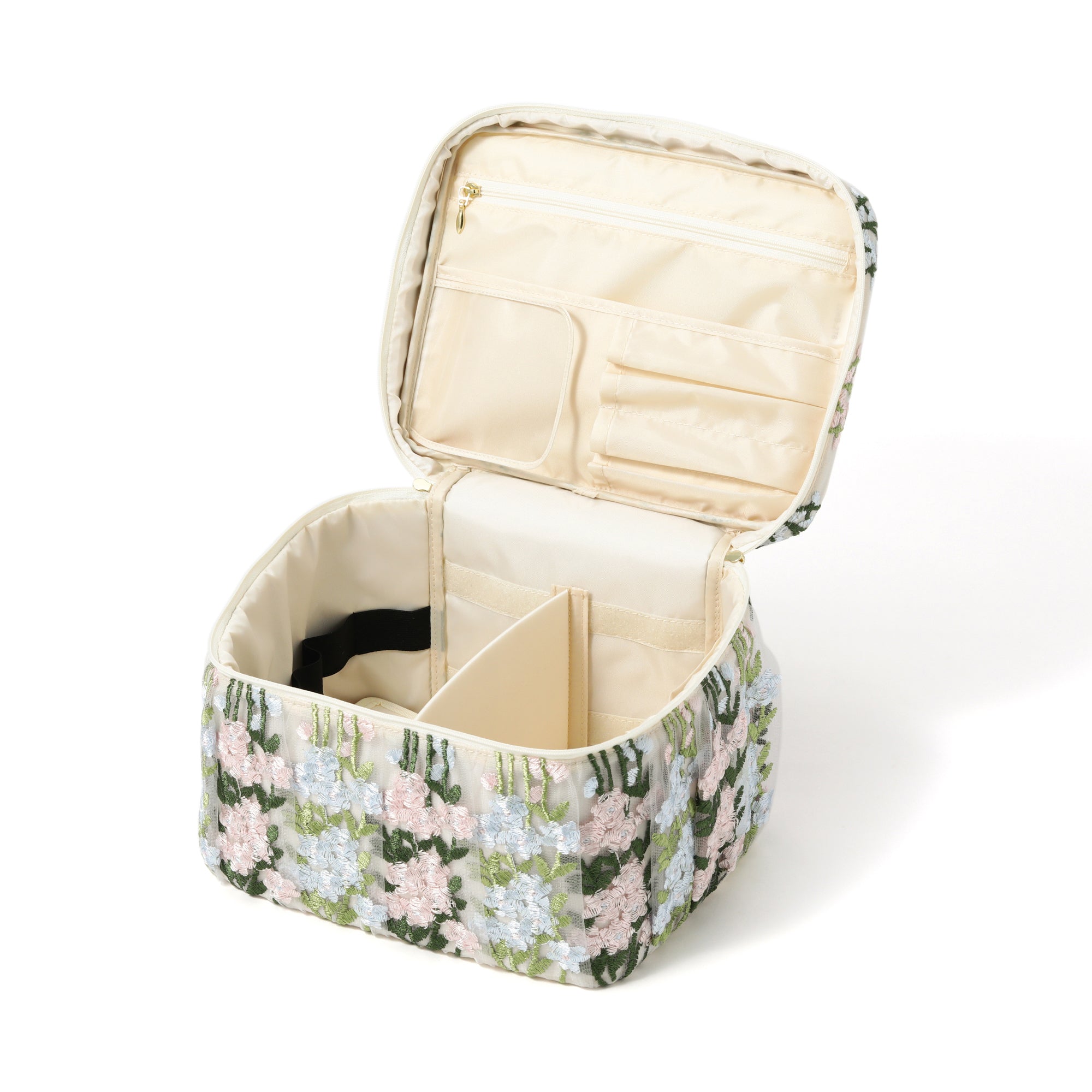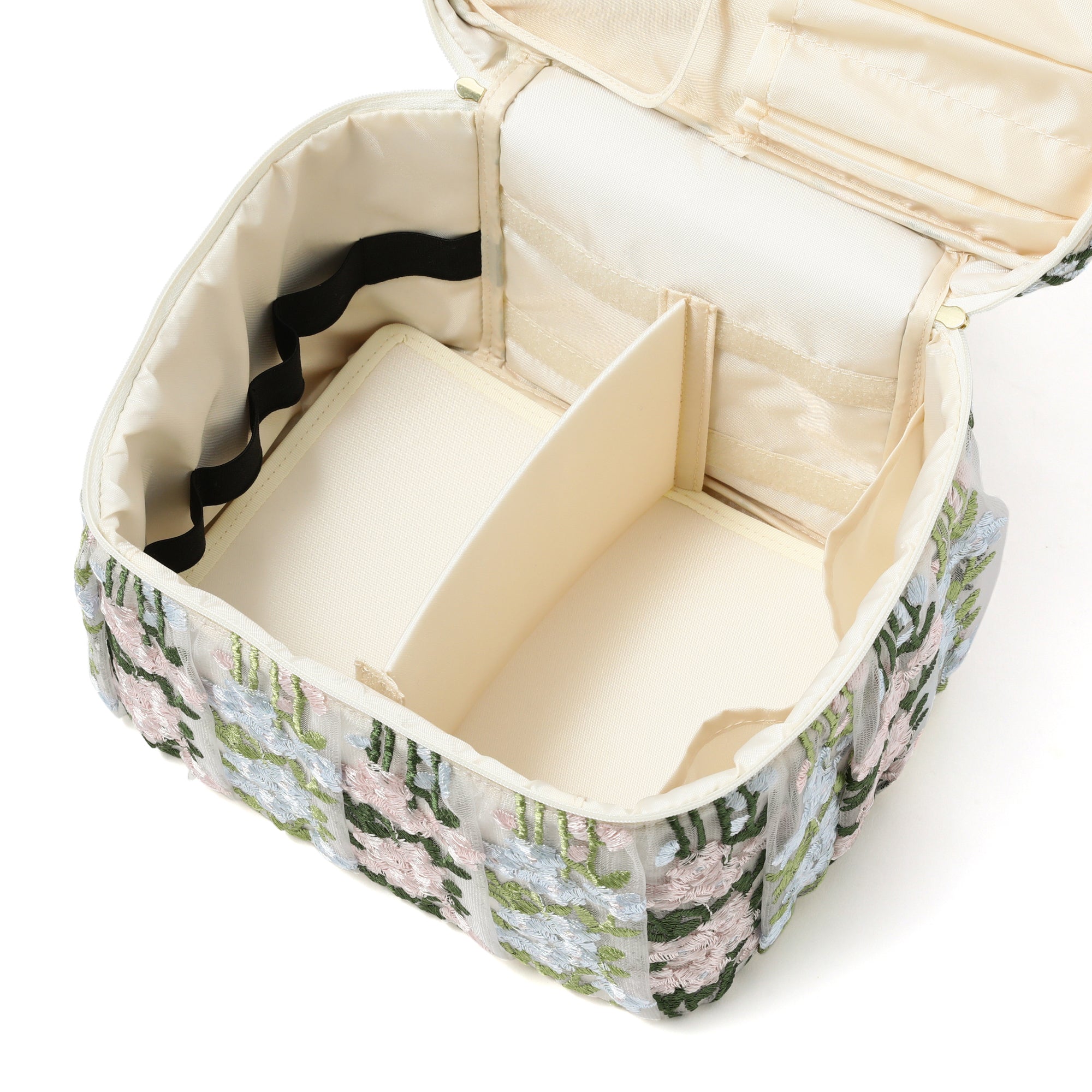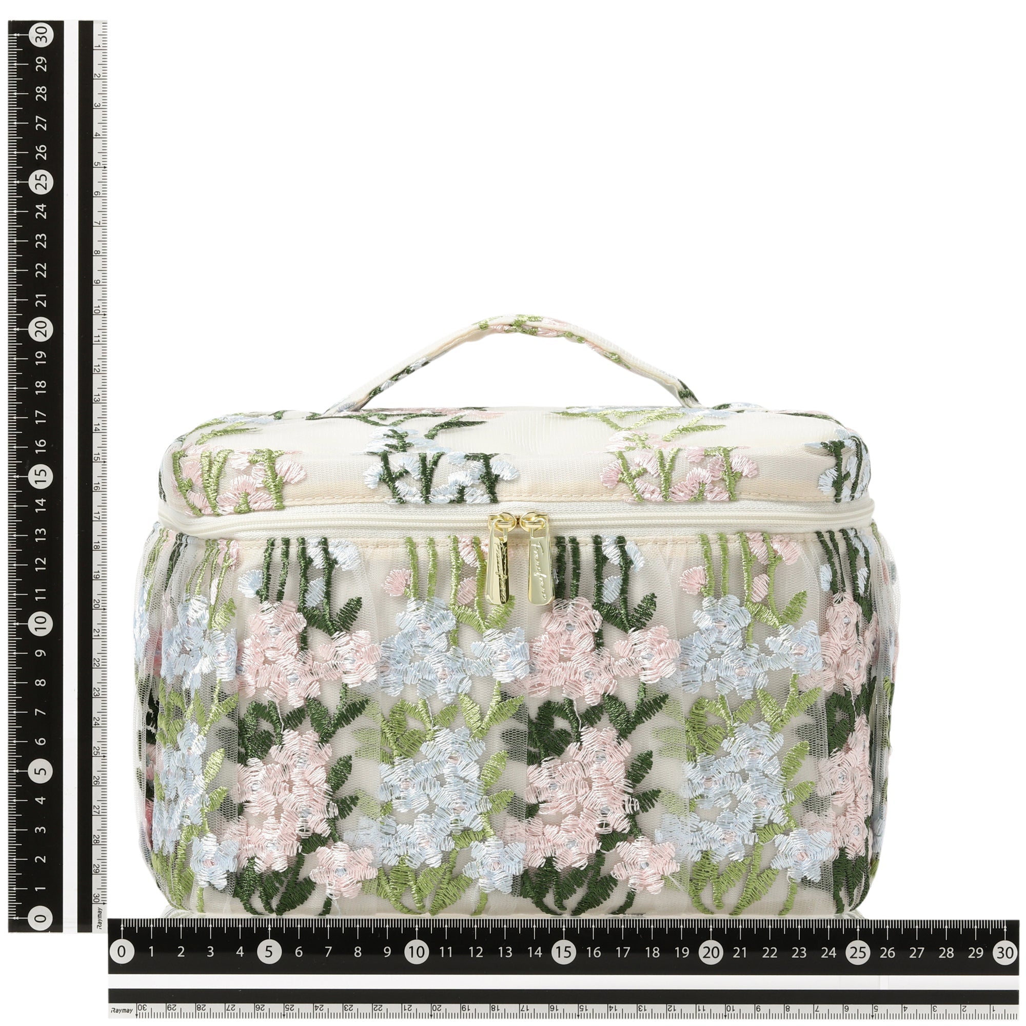 チュール素材の透け感とフラワーモチーフの刺繍がキュートな、たっぷり大きめサイズのバニティポーチです。 内側のブラシホルダーやポケットでお気に入りのメイク道具をすっきり整理整頓できます。 取り外しが可能な仕切りが付いて使い勝手抜群。 両開き式のファスナーも使いやすさのポイントです。