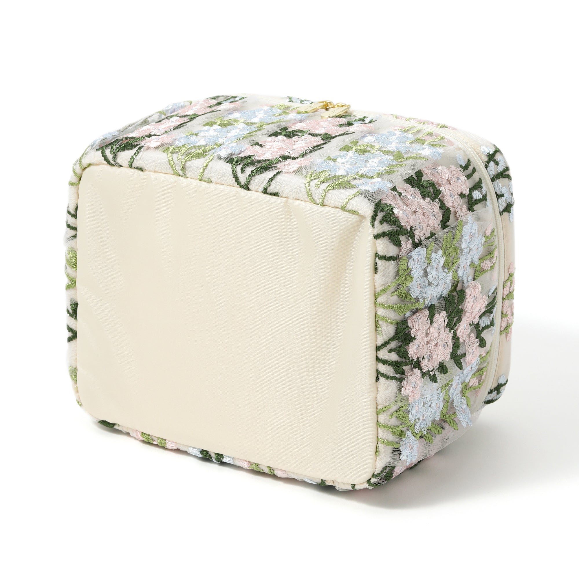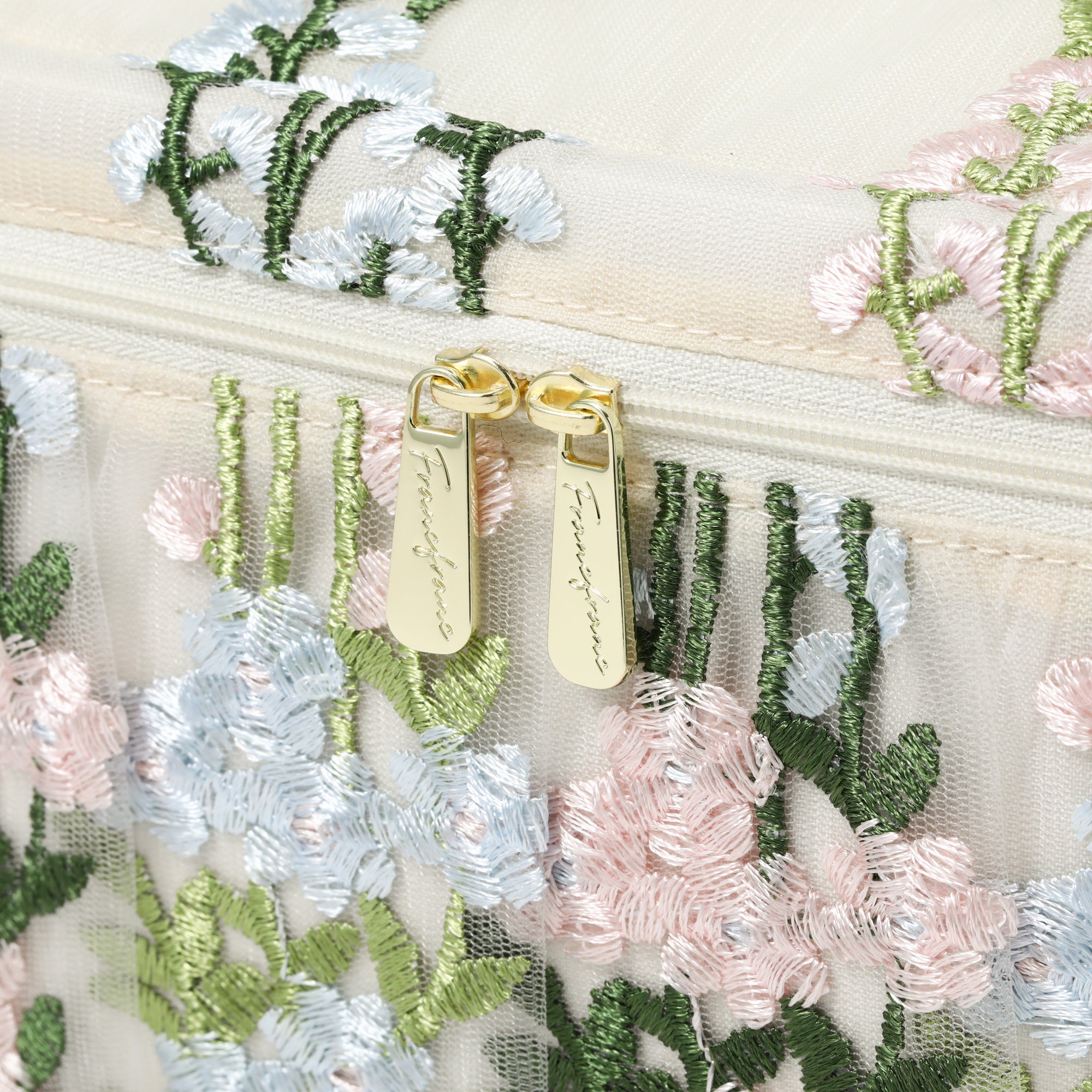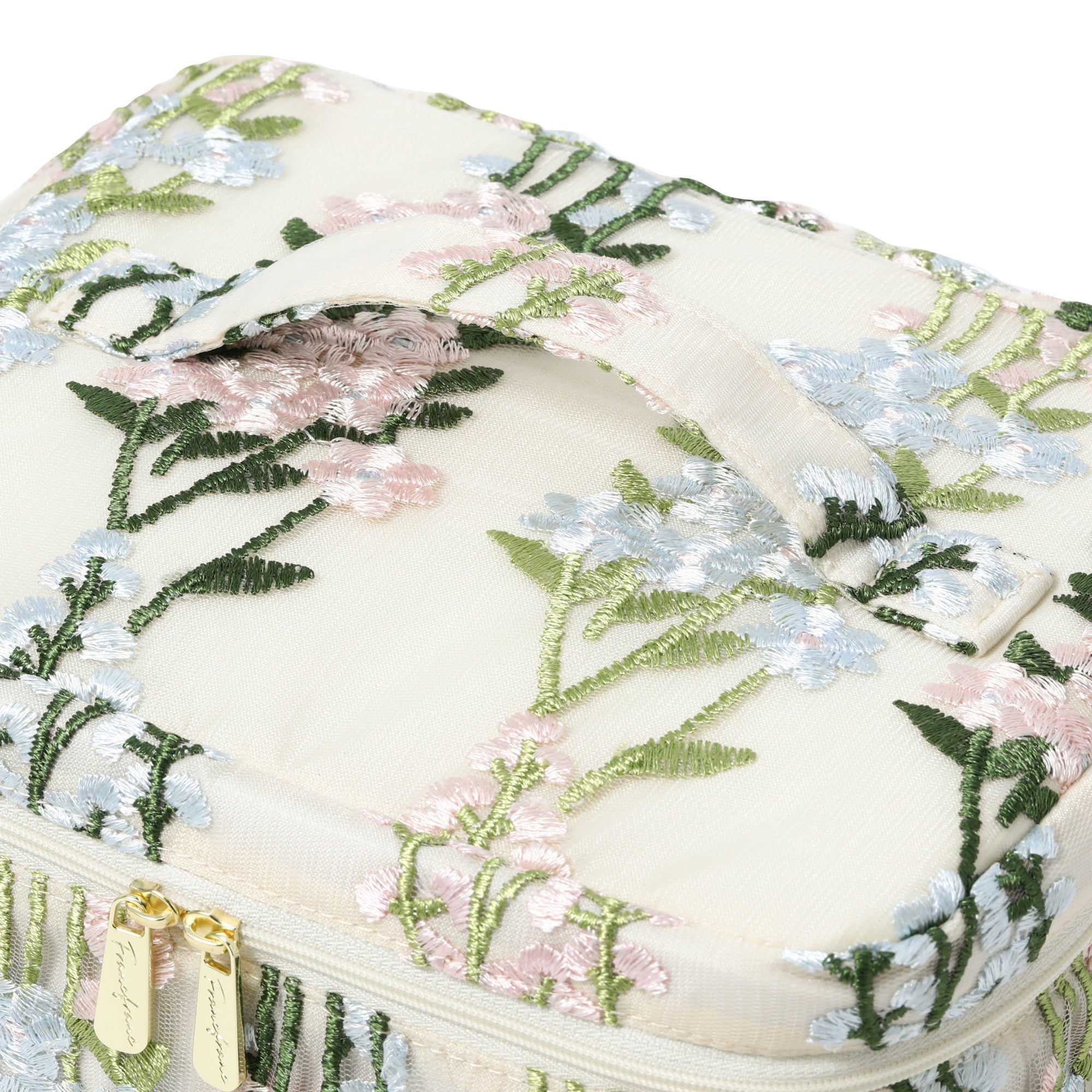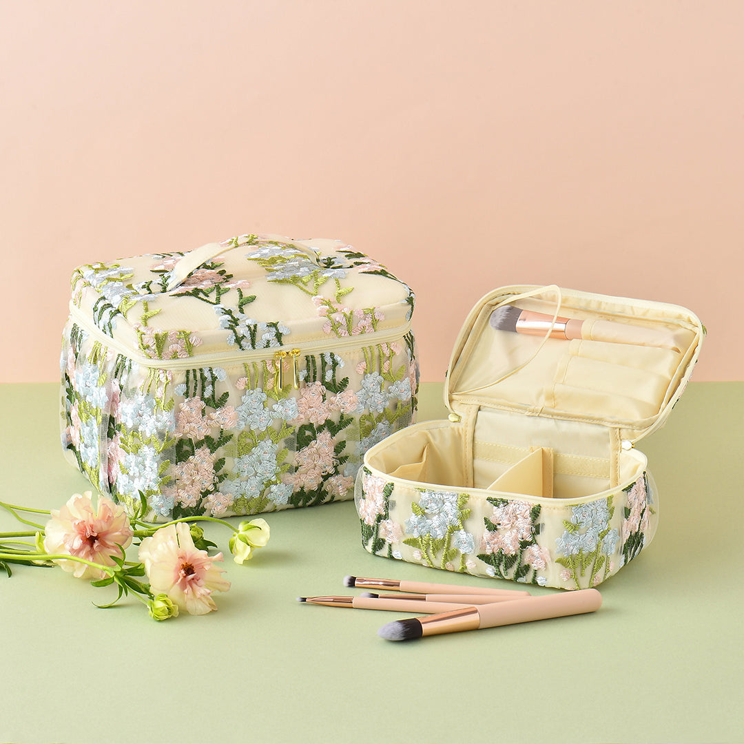 チュール素材の透け感とフラワーモチーフの刺繍がキュートな、たっぷり大きめサイズのバニティポーチです。 内側のブラシホルダーやポケットでお気に入りのメイク道具をすっきり整理整頓できます。 取り外しが可能な仕切りが付いて使い勝手抜群。 両開き式のファスナーも使いやすさのポイントです。