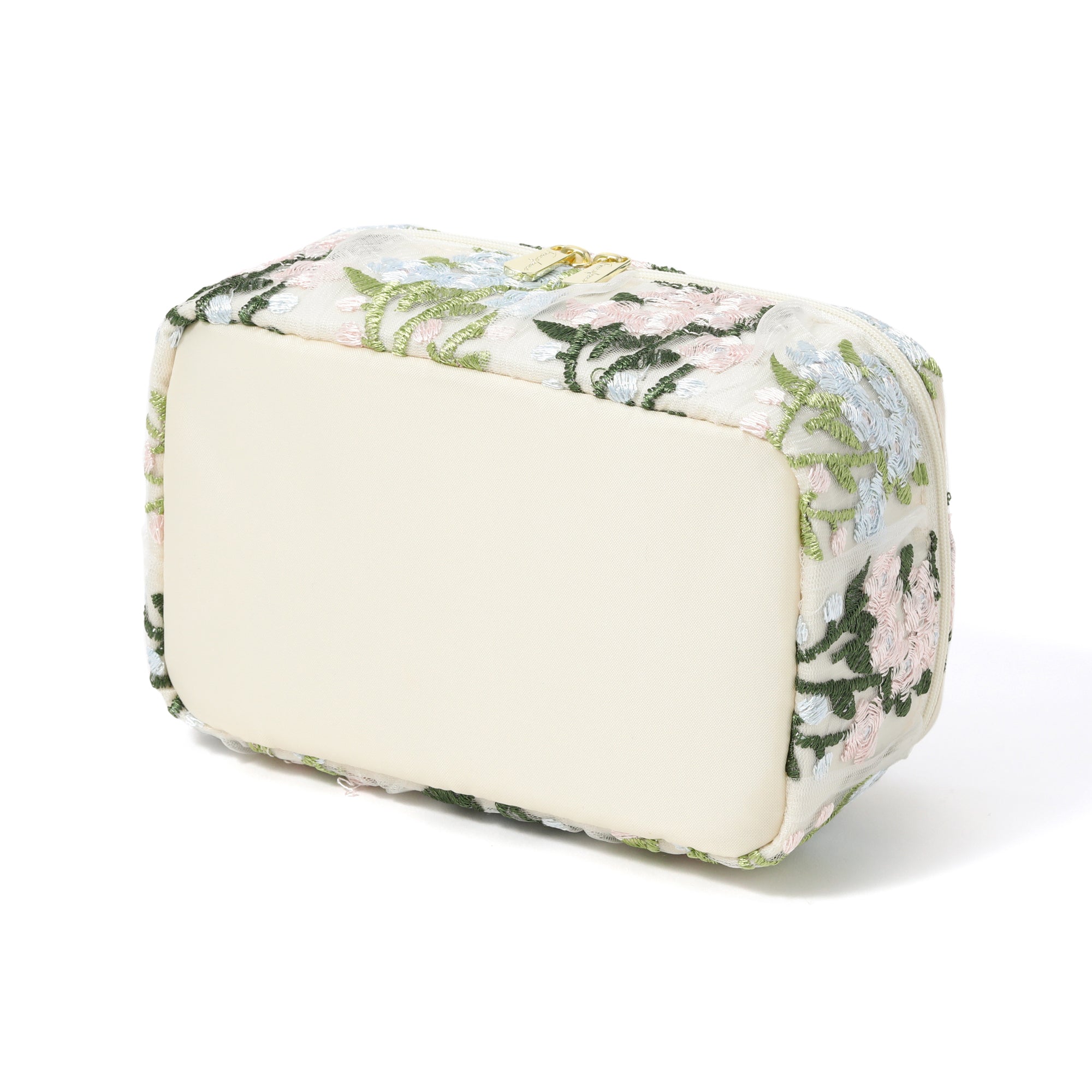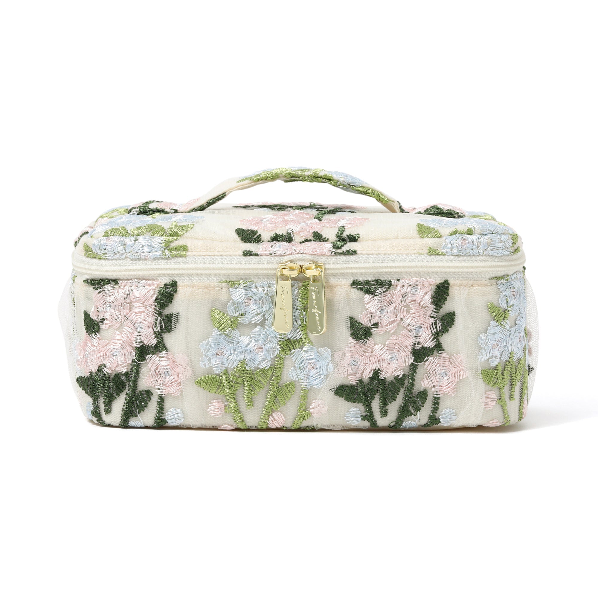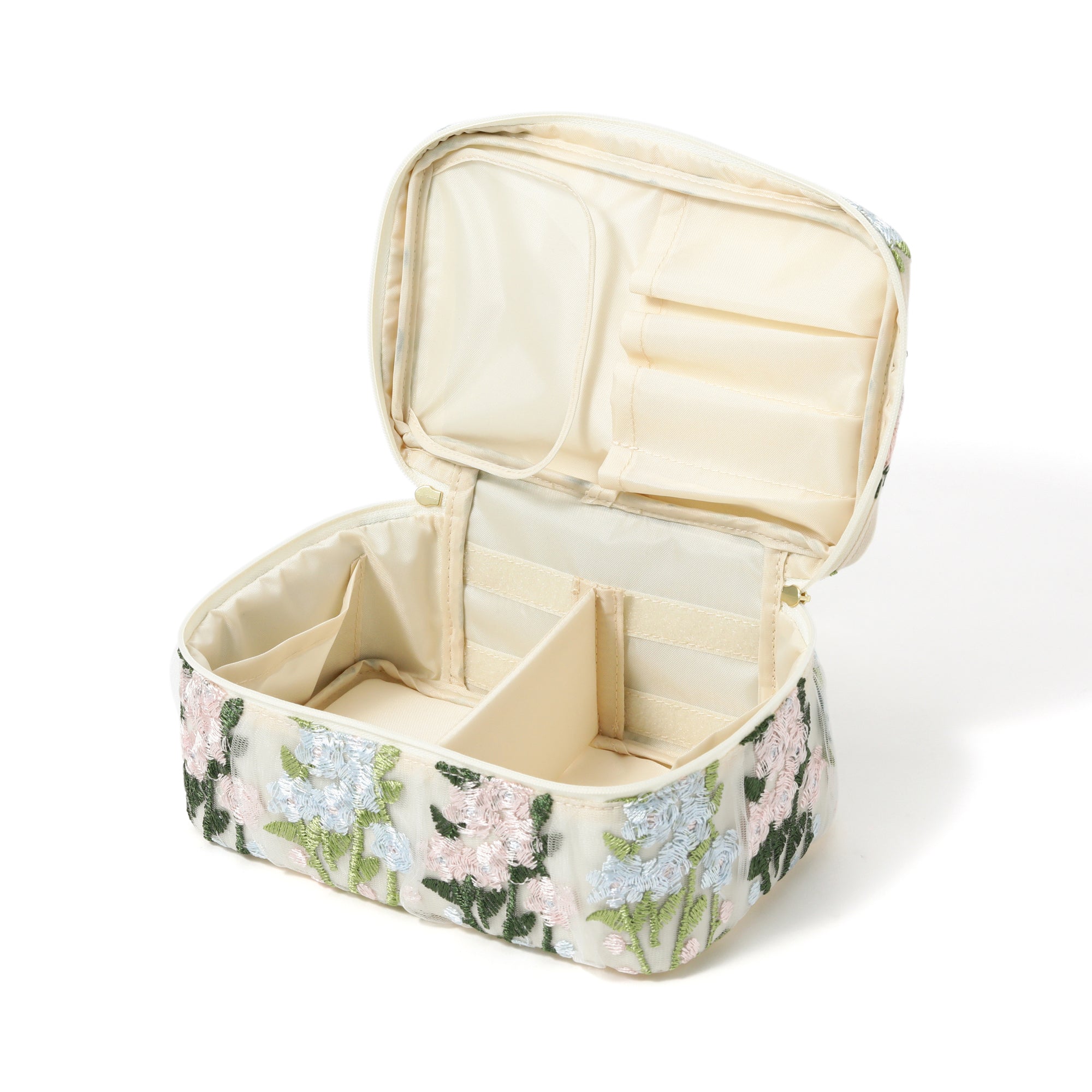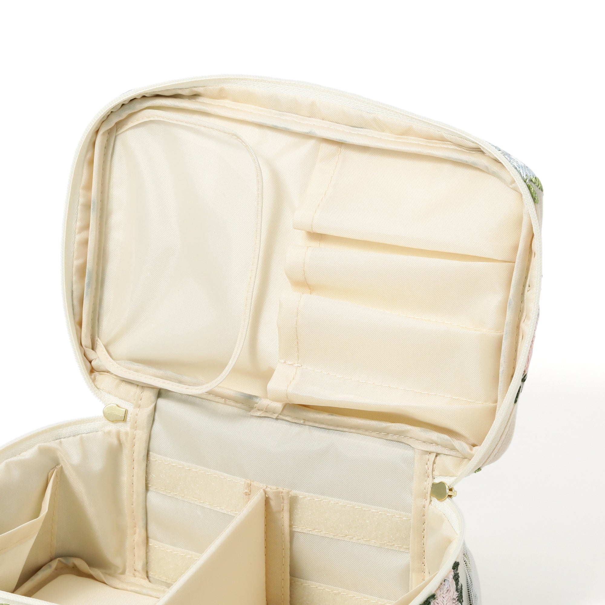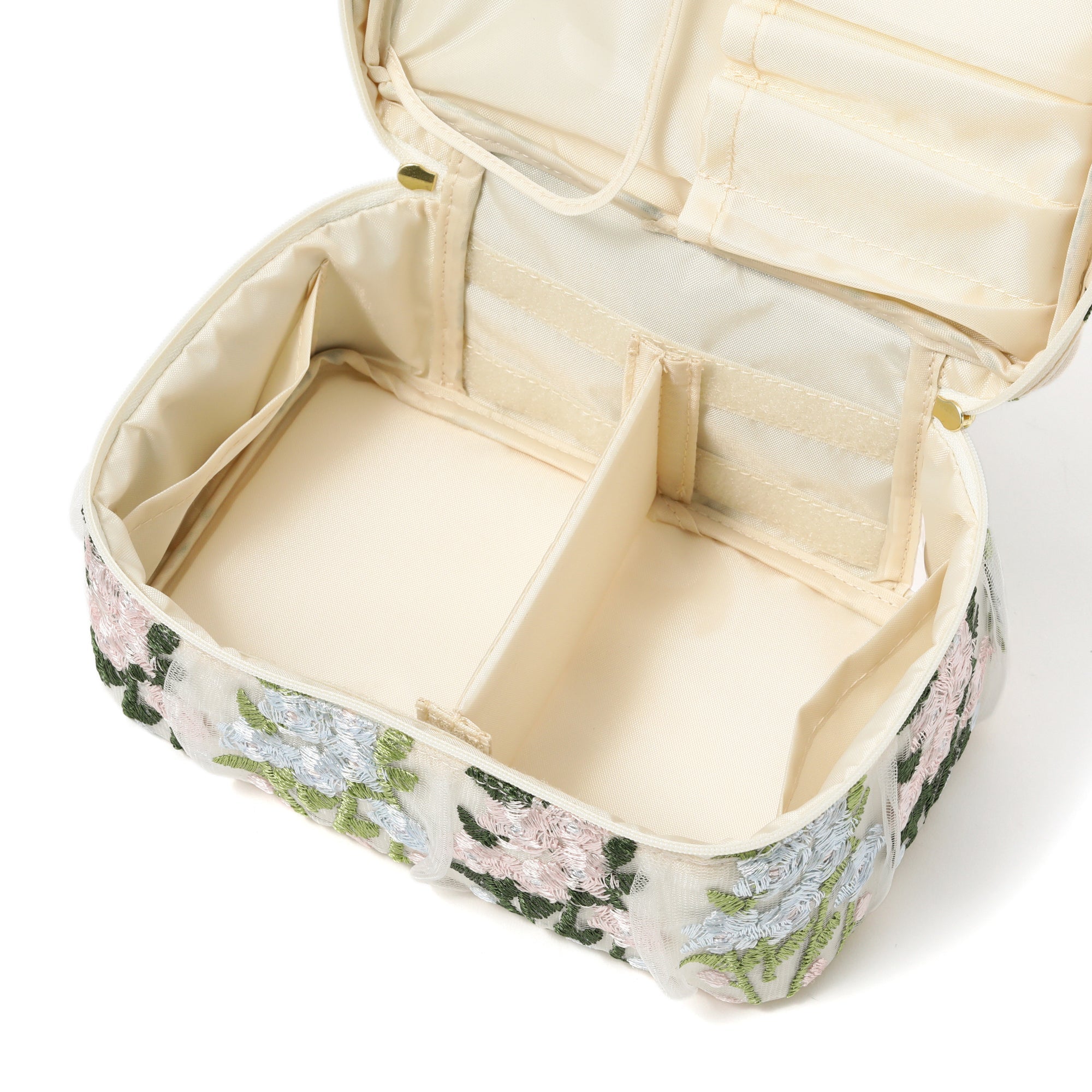 チュール素材の透け感とフラワーモチーフの刺繍がキュートなバニティポーチです。 内側のブラシホルダーやポケットでお気に入りのメイク道具をすっきり整理整頓できます。 取り外しが可能な仕切りが付いて使い勝手抜群。 両開き式のファスナーも使いやすさのポイントです。