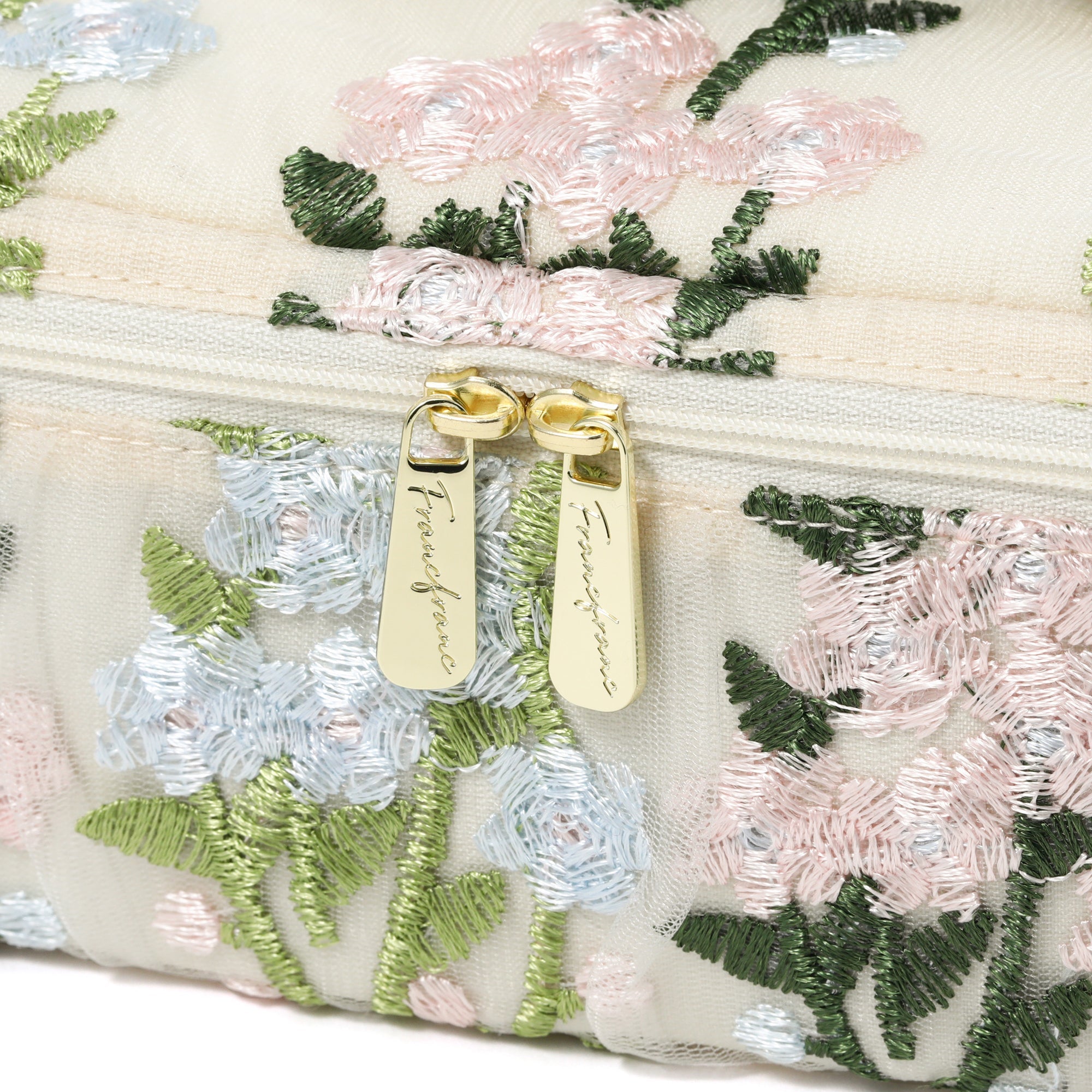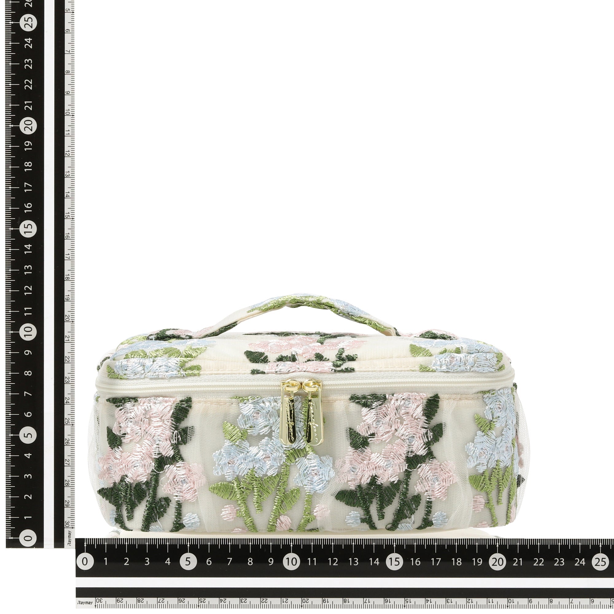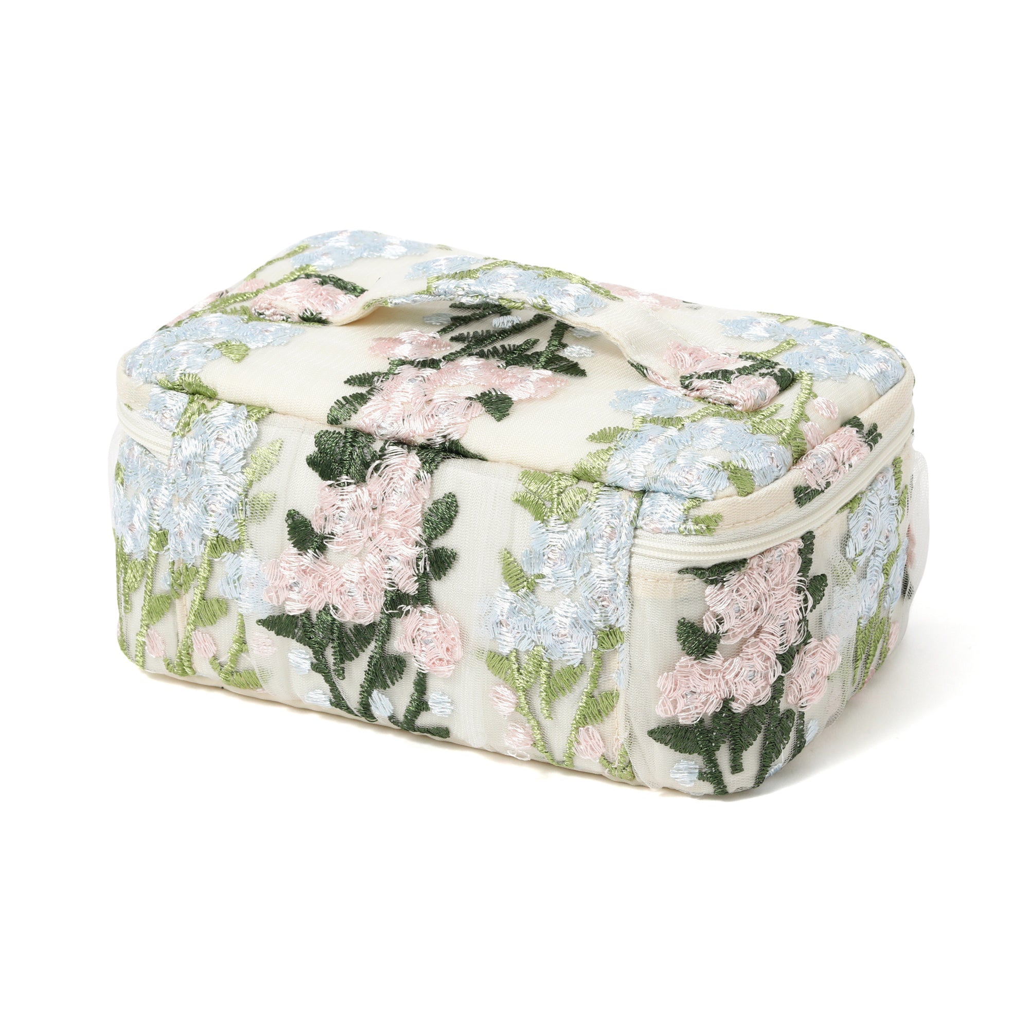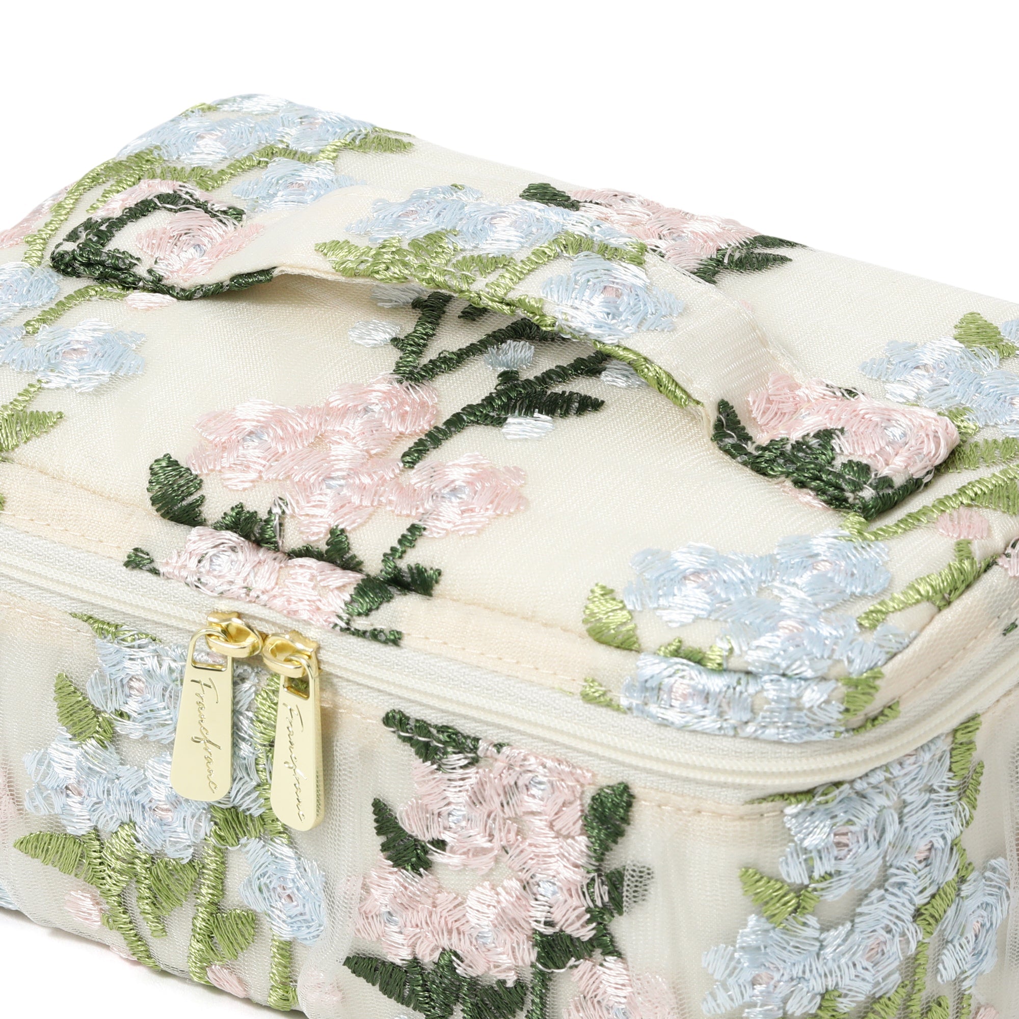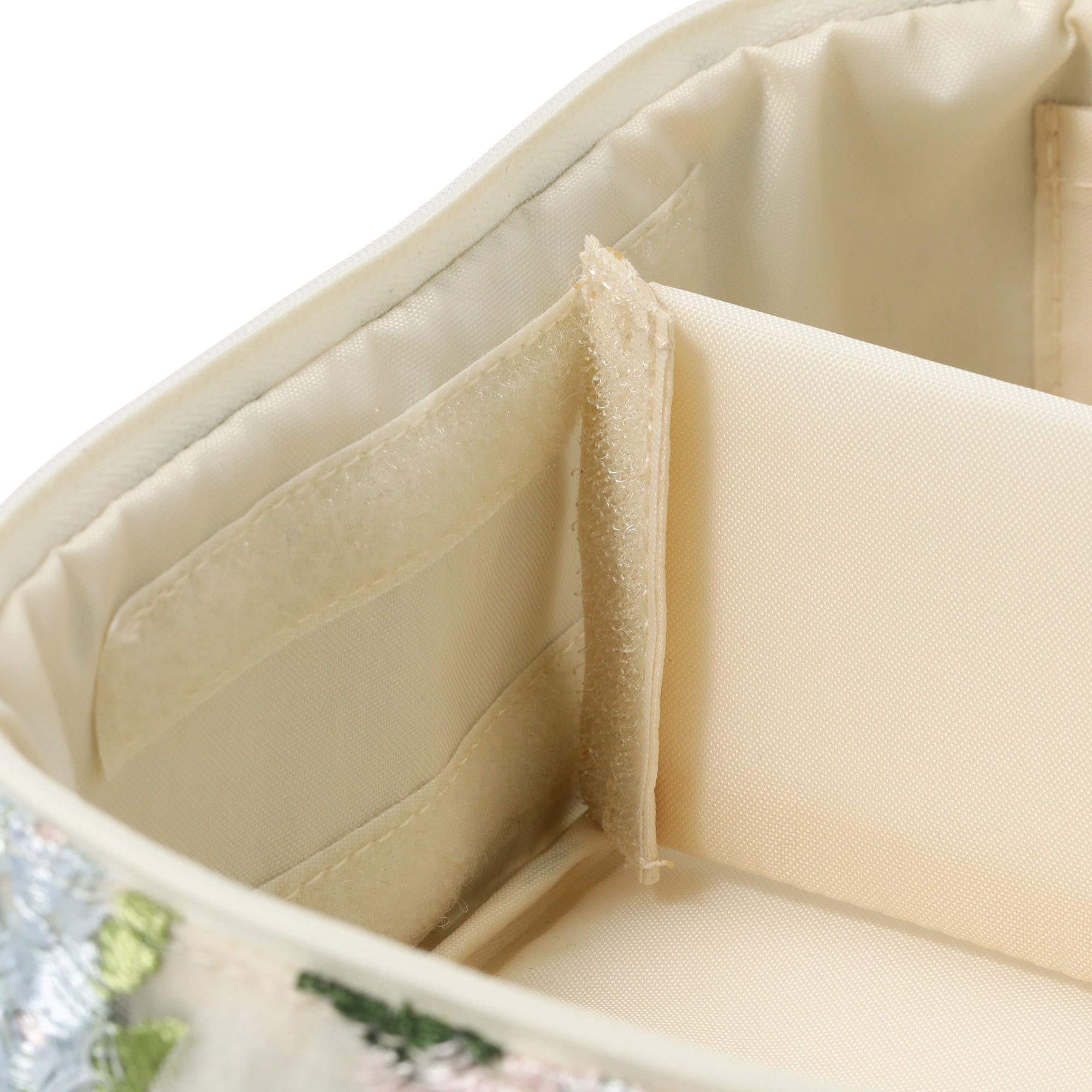 チュール素材の透け感とフラワーモチーフの刺繍がキュートなバニティポーチです。 内側のブラシホルダーやポケットでお気に入りのメイク道具をすっきり整理整頓できます。 取り外しが可能な仕切りが付いて使い勝手抜群。 両開き式のファスナーも使いやすさのポイントです。