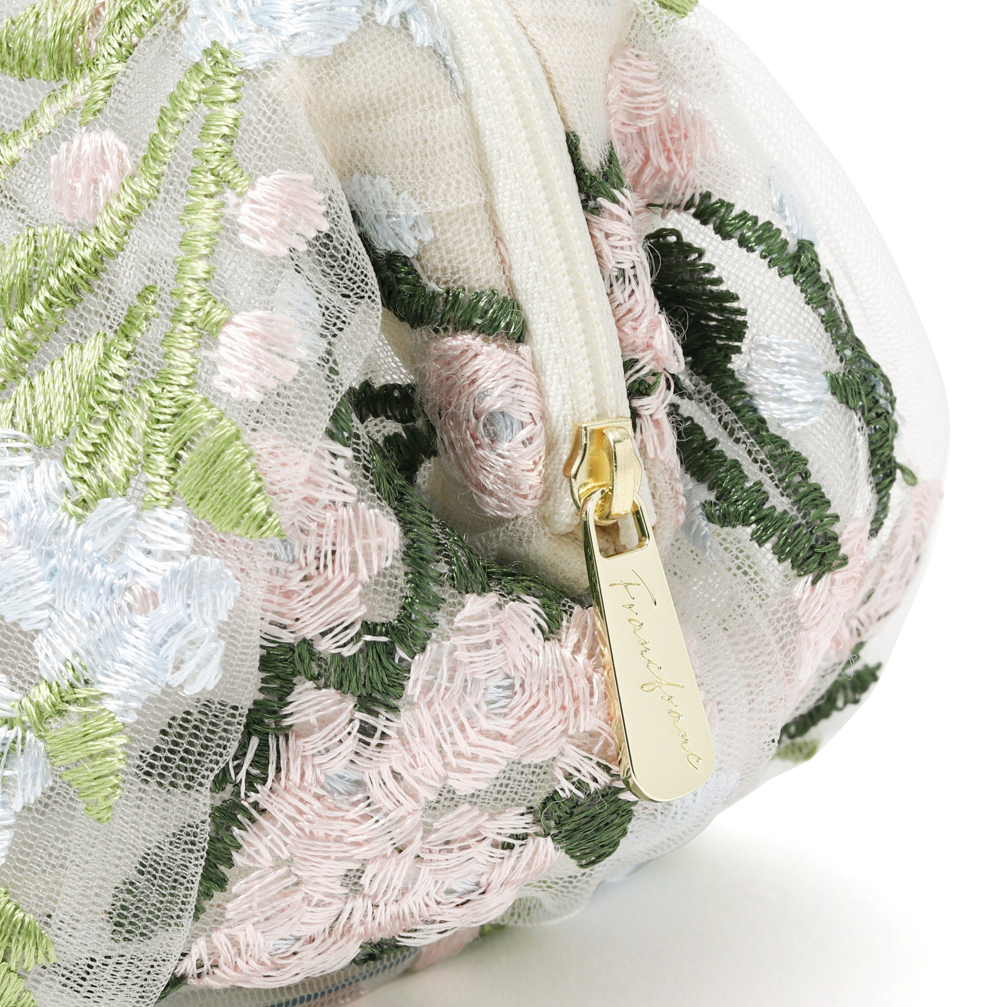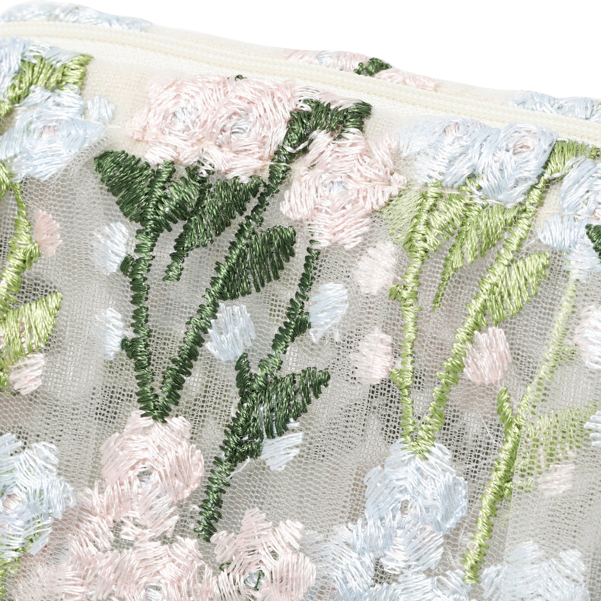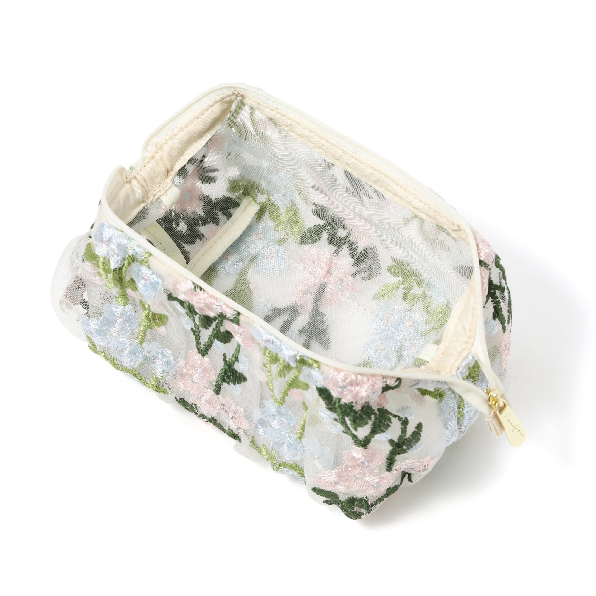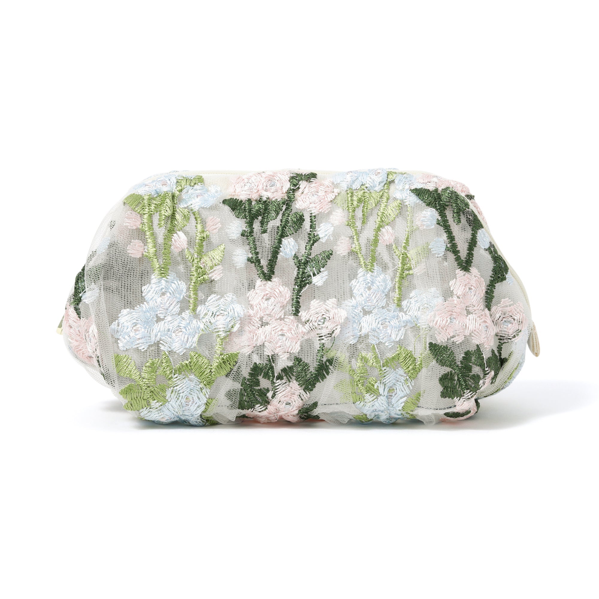 チュール素材の透け感とフラワーモチーフの刺繍がキュートなワイヤーポーチです。 チュールならではの透け感が軽やかな印象です。 ワイヤー入りなのでポーチの口が大きく開けられて、アイテムの出し入れがしやすく便利。シンプルな構造でたっぷり収納できます。