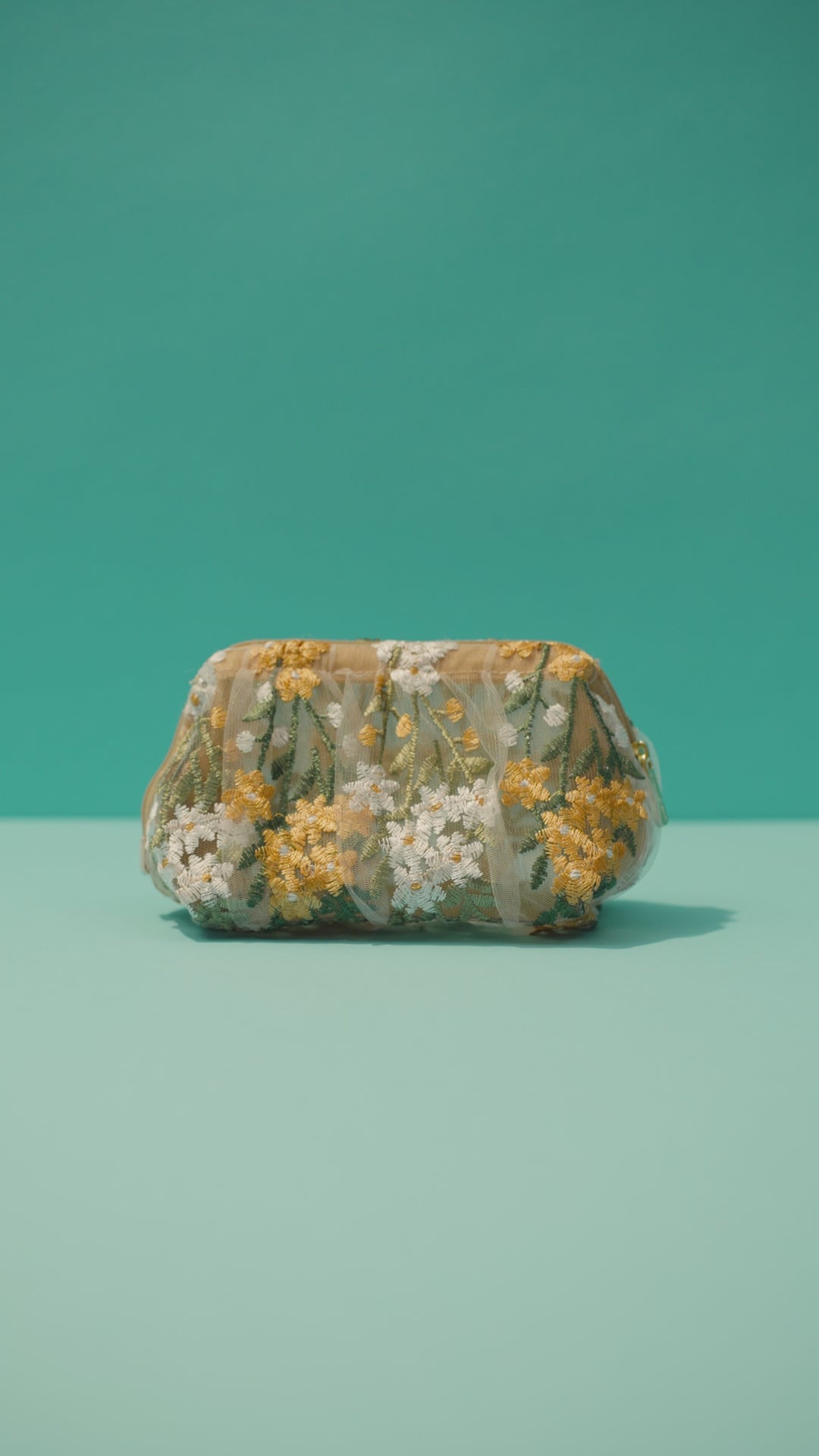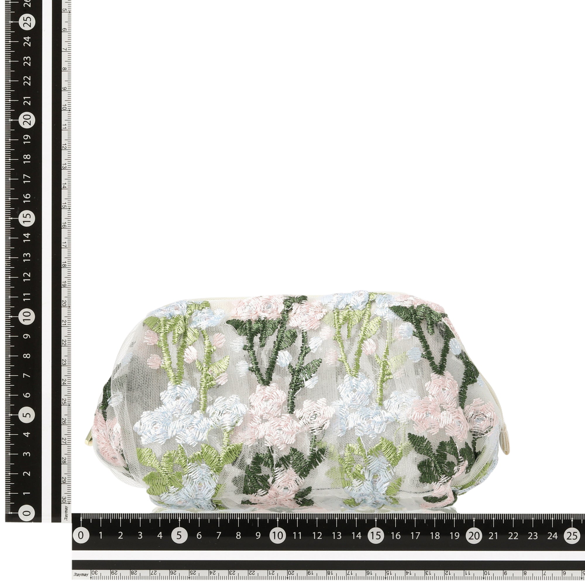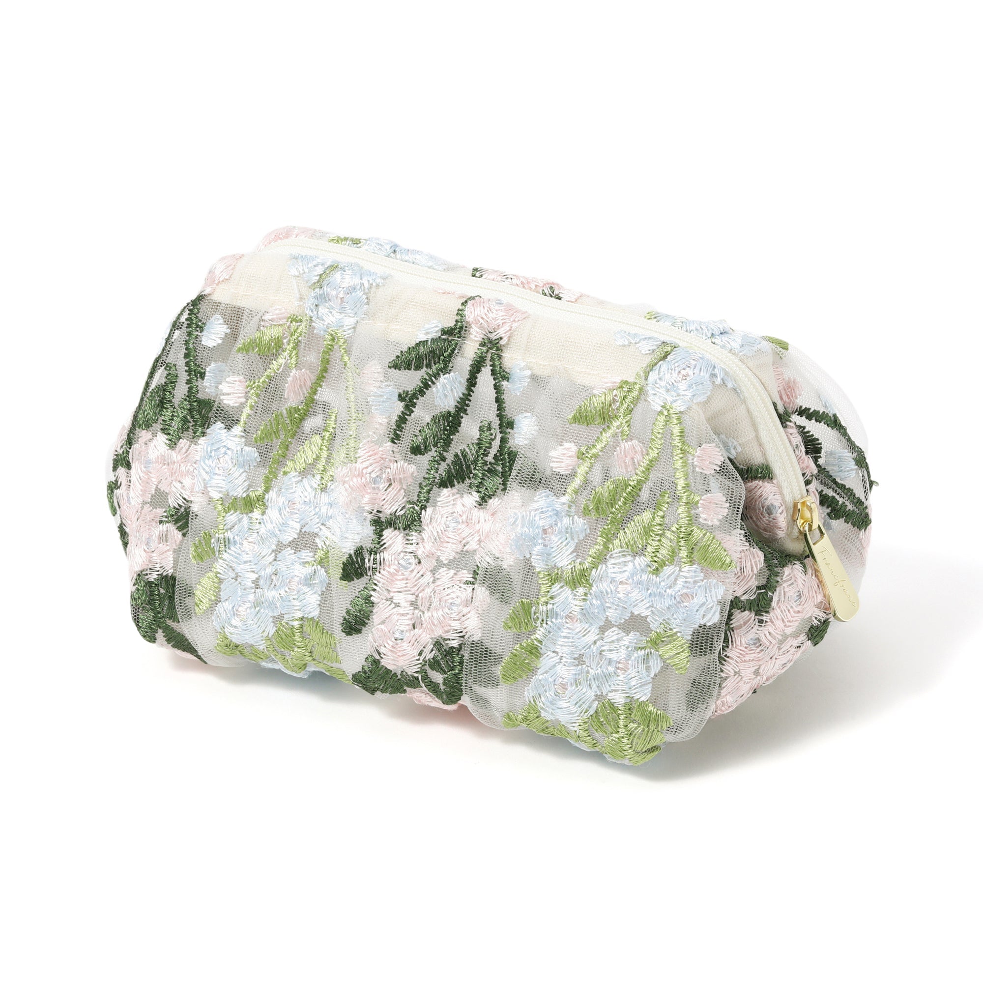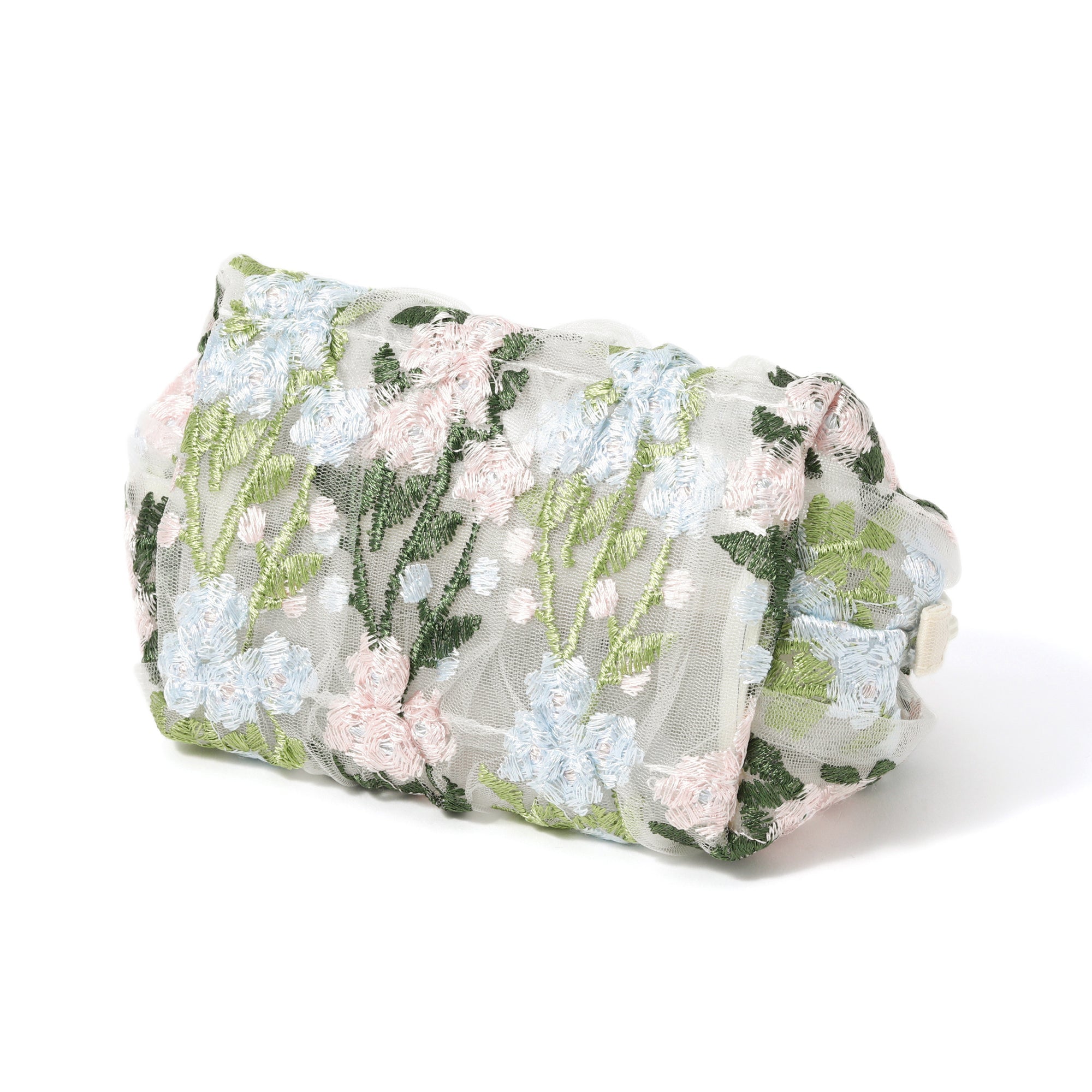 チュール素材の透け感とフラワーモチーフの刺繍がキュートなワイヤーポーチです。 チュールならではの透け感が軽やかな印象です。 ワイヤー入りなのでポーチの口が大きく開けられて、アイテムの出し入れがしやすく便利。シンプルな構造でたっぷり収納できます。