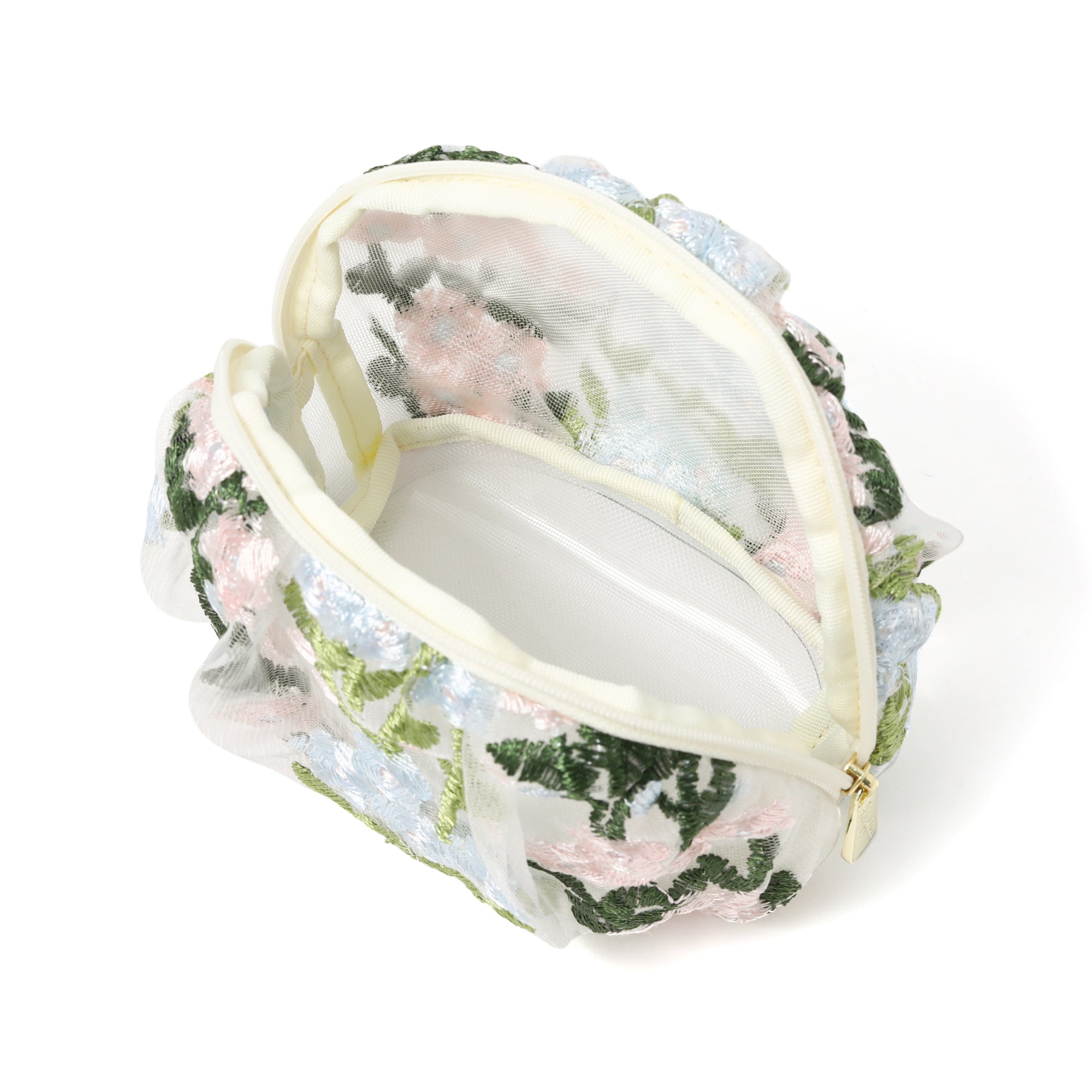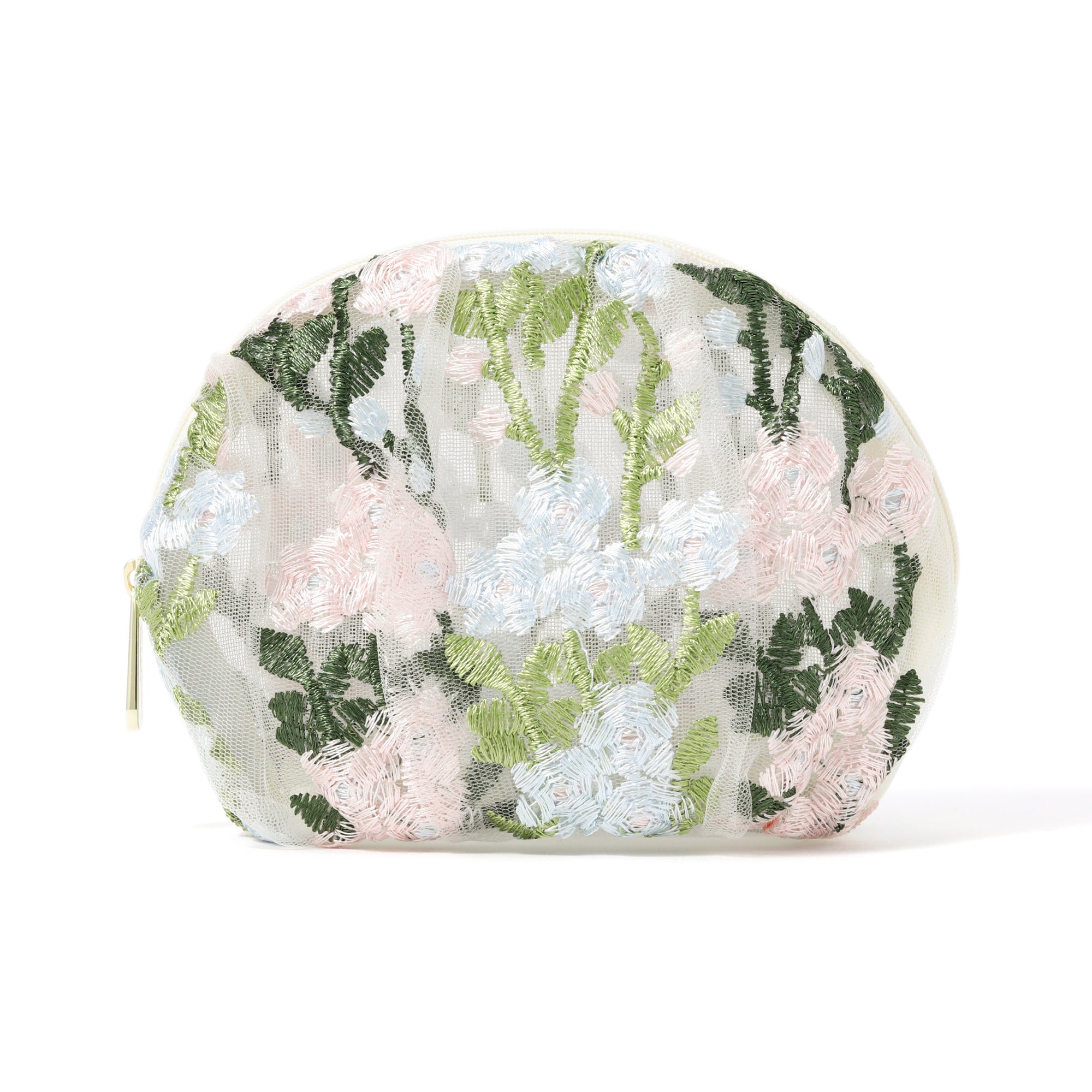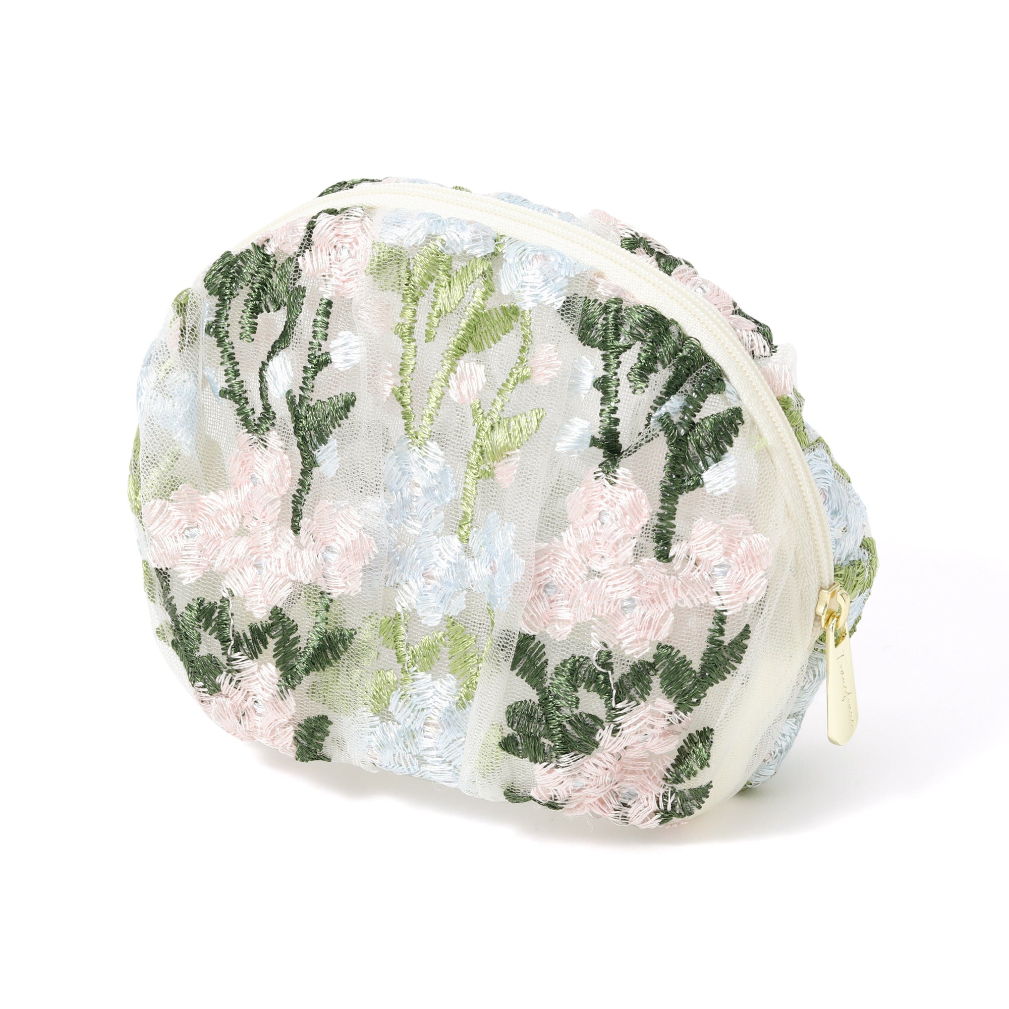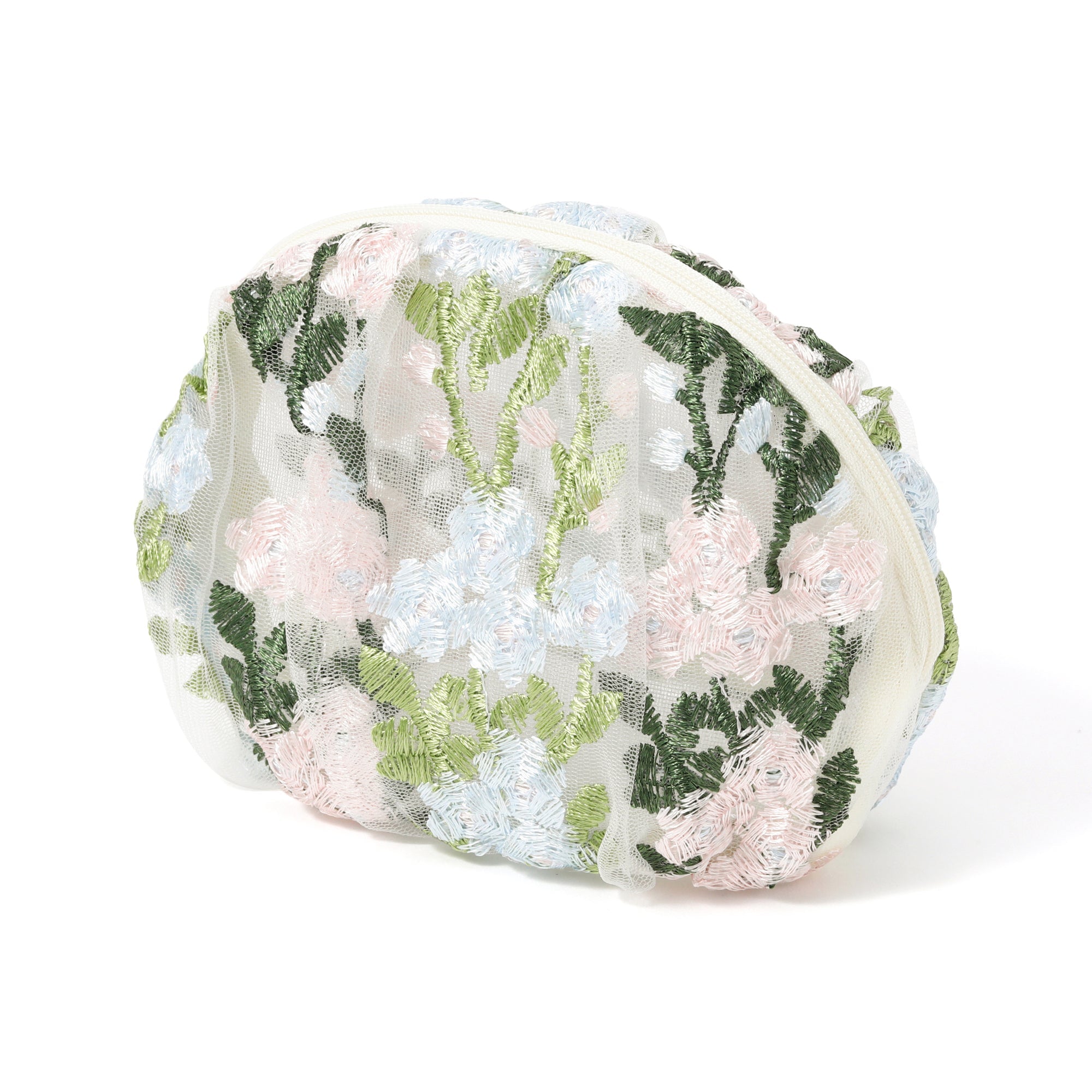 チュール素材の透け感とフラワーモチーフの刺繍がキュートなラウンドポーチです。 チュールのふわふわ感を存分に生かした優しいフォルム。チュールならではの透け感が軽やかな印象です。 内生地をハードチュールにすることできれいなフォルムをキープして、メイク道具を出し入れしやすく仕上げました。
