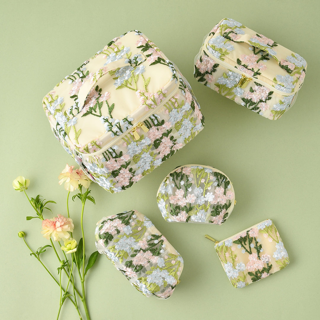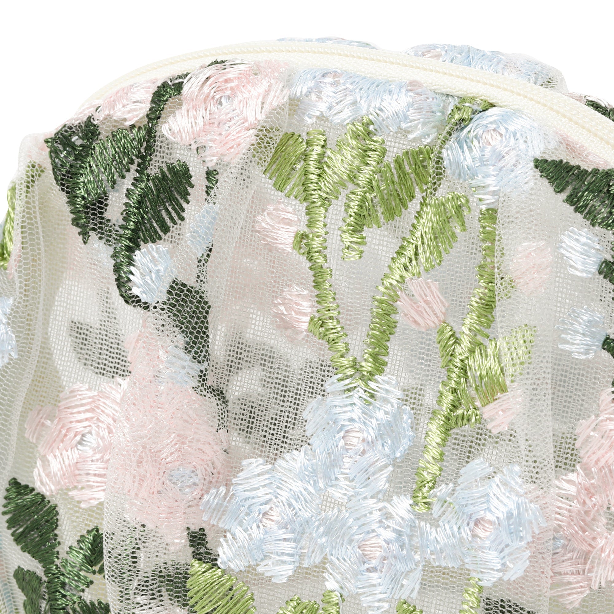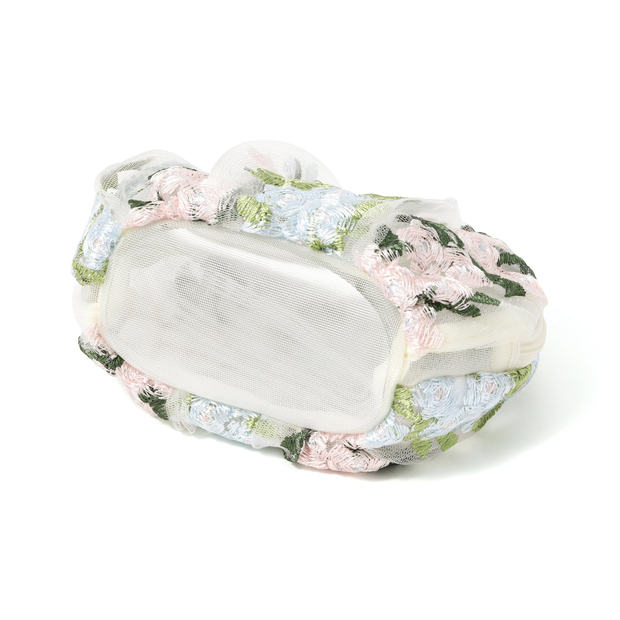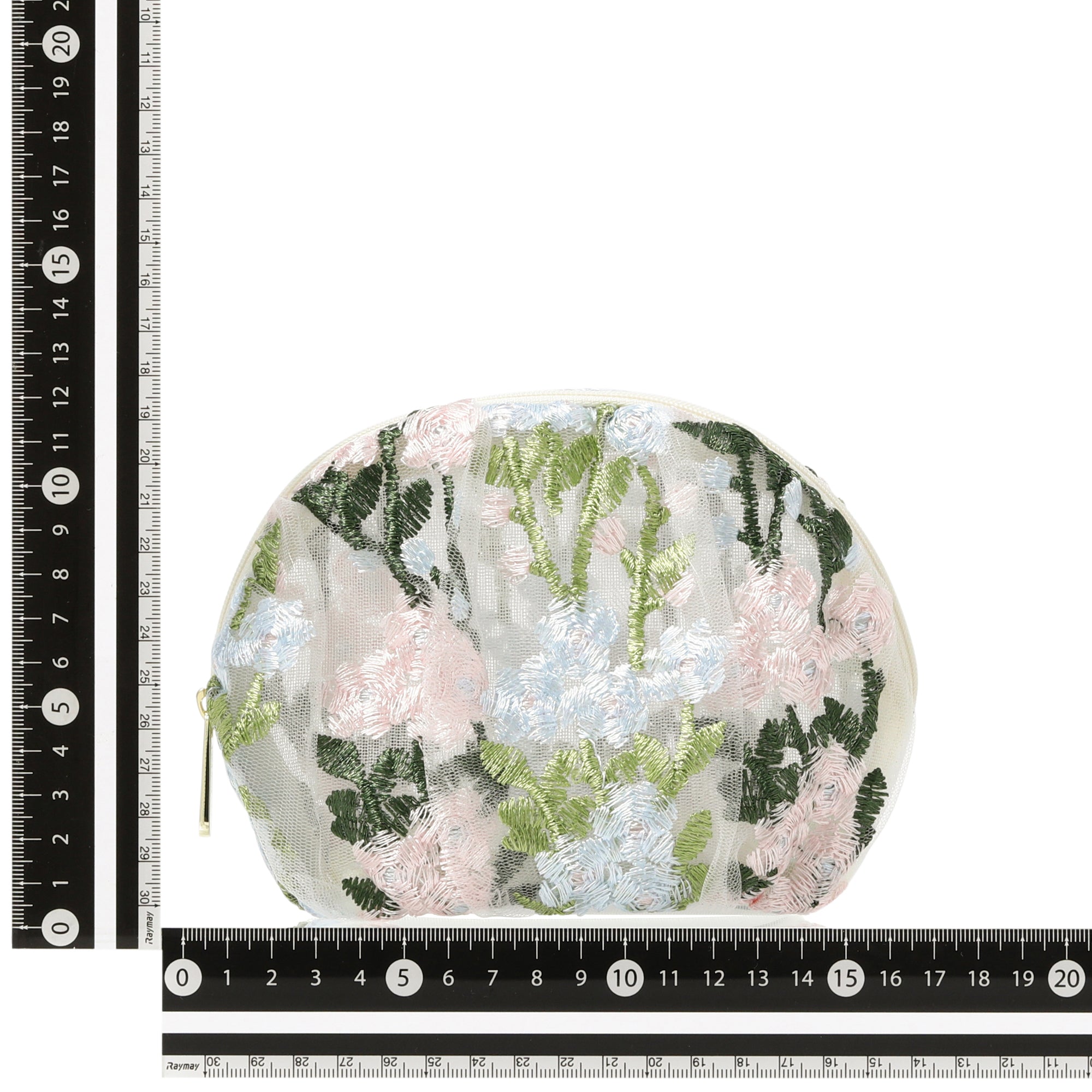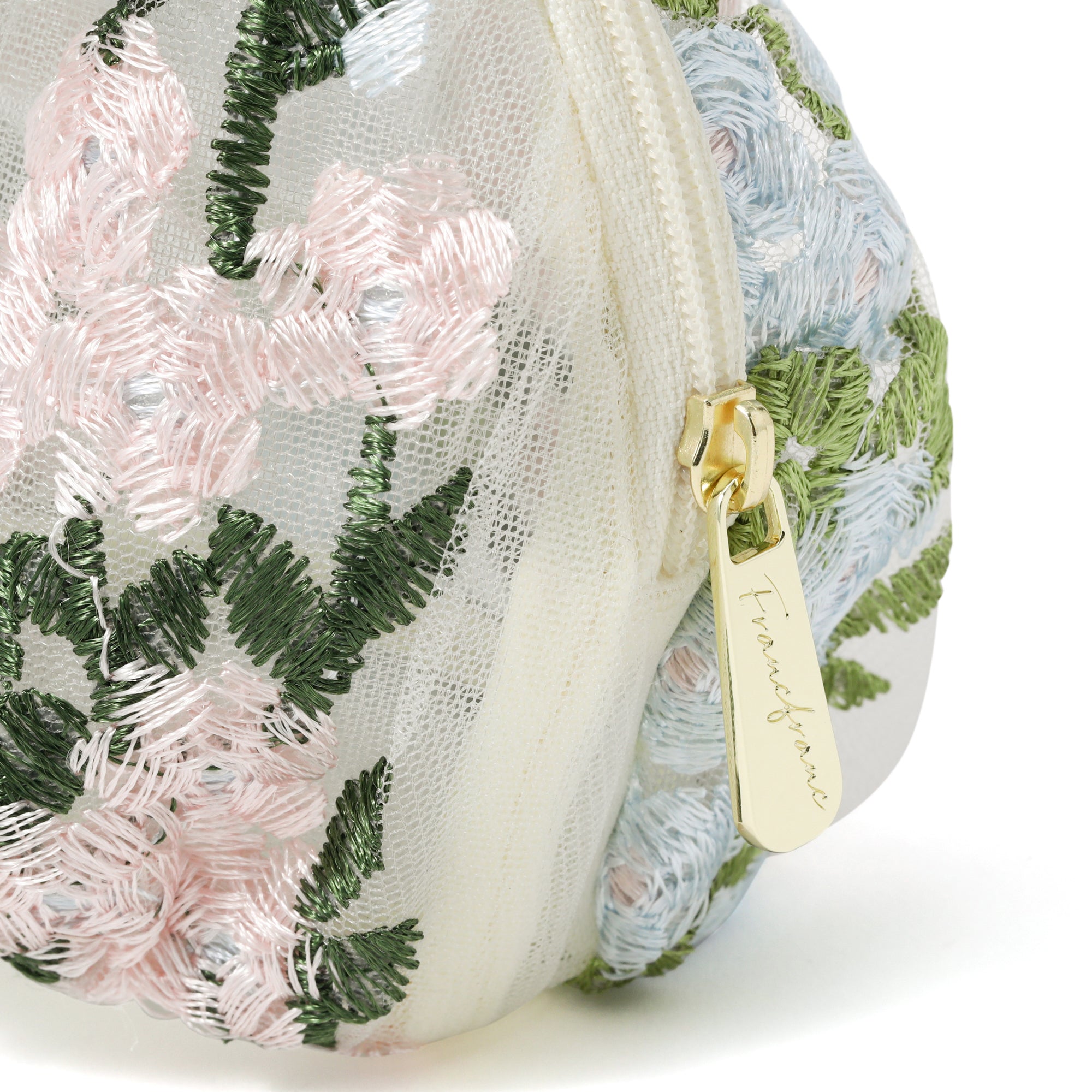 チュール素材の透け感とフラワーモチーフの刺繍がキュートなラウンドポーチです。 チュールのふわふわ感を存分に生かした優しいフォルム。チュールならではの透け感が軽やかな印象です。 内生地をハードチュールにすることできれいなフォルムをキープして、メイク道具を出し入れしやすく仕上げました。
