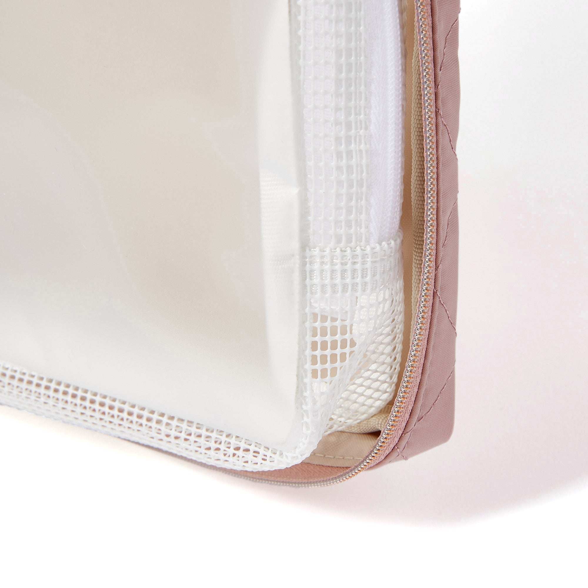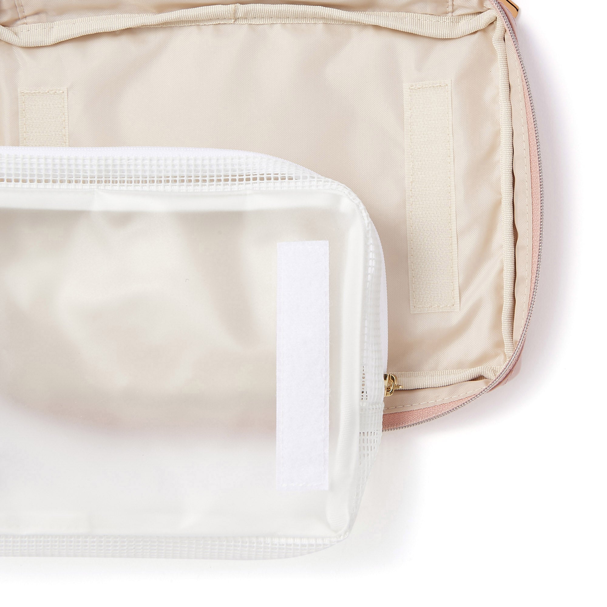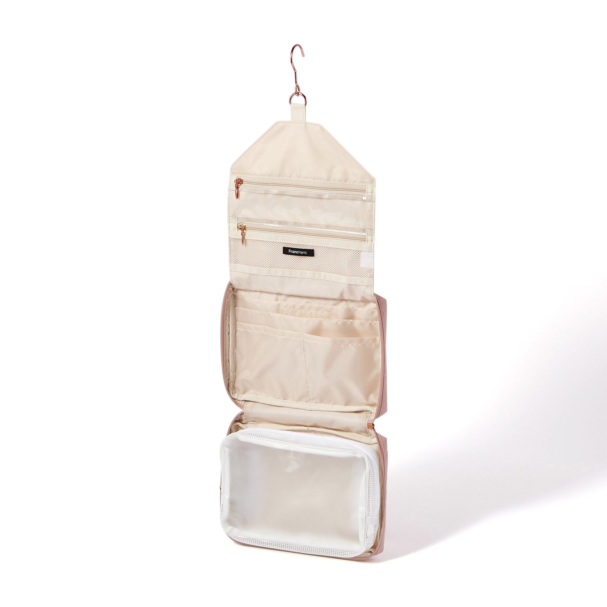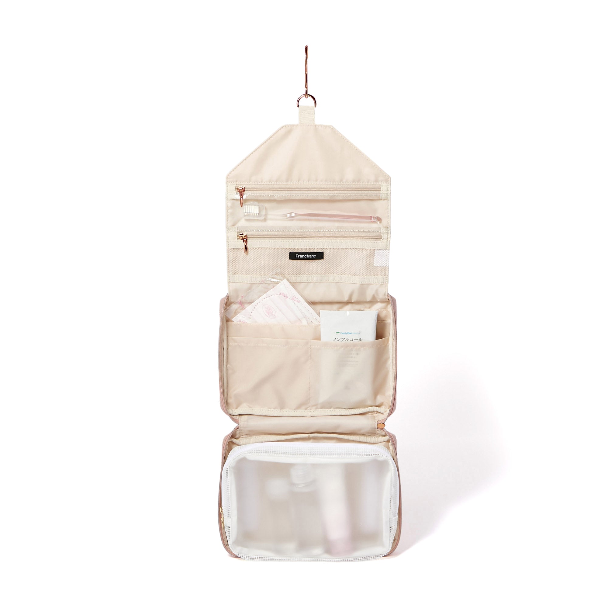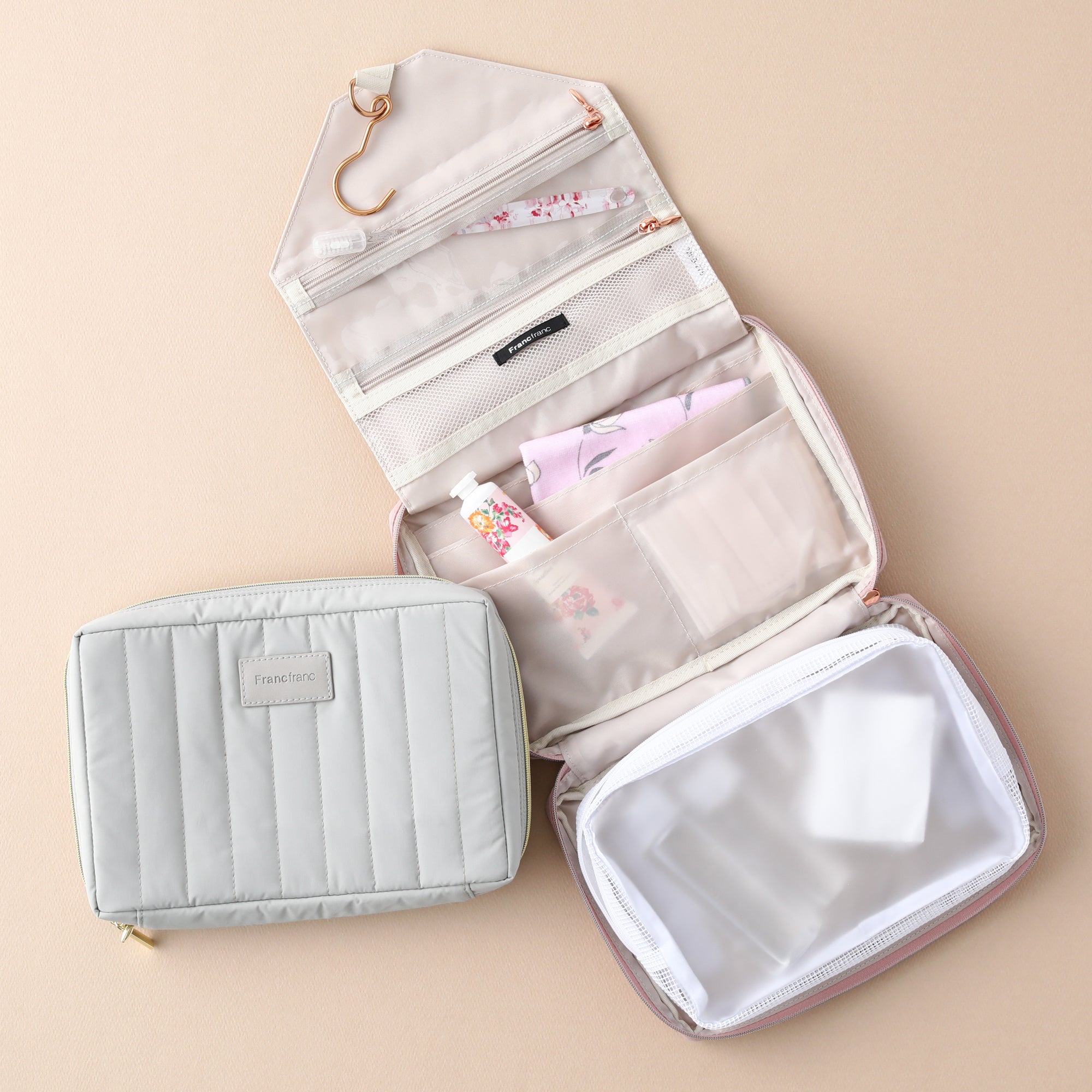 リモートワークグッズで人気のキルティングシリーズにトラベルアイテムが登場しました。旅先のバスルームなどにハンガーフックで吊るして使用できる、便利なハンギングポーチです。 洗面道具だけでなく、マスクの替えや、除菌アイテム、ハンカチの替えなどのこまごましたアイテムの収納にもぴったりです。 お風呂などに持っていきやすい取り外せるビニールポーチ付き。