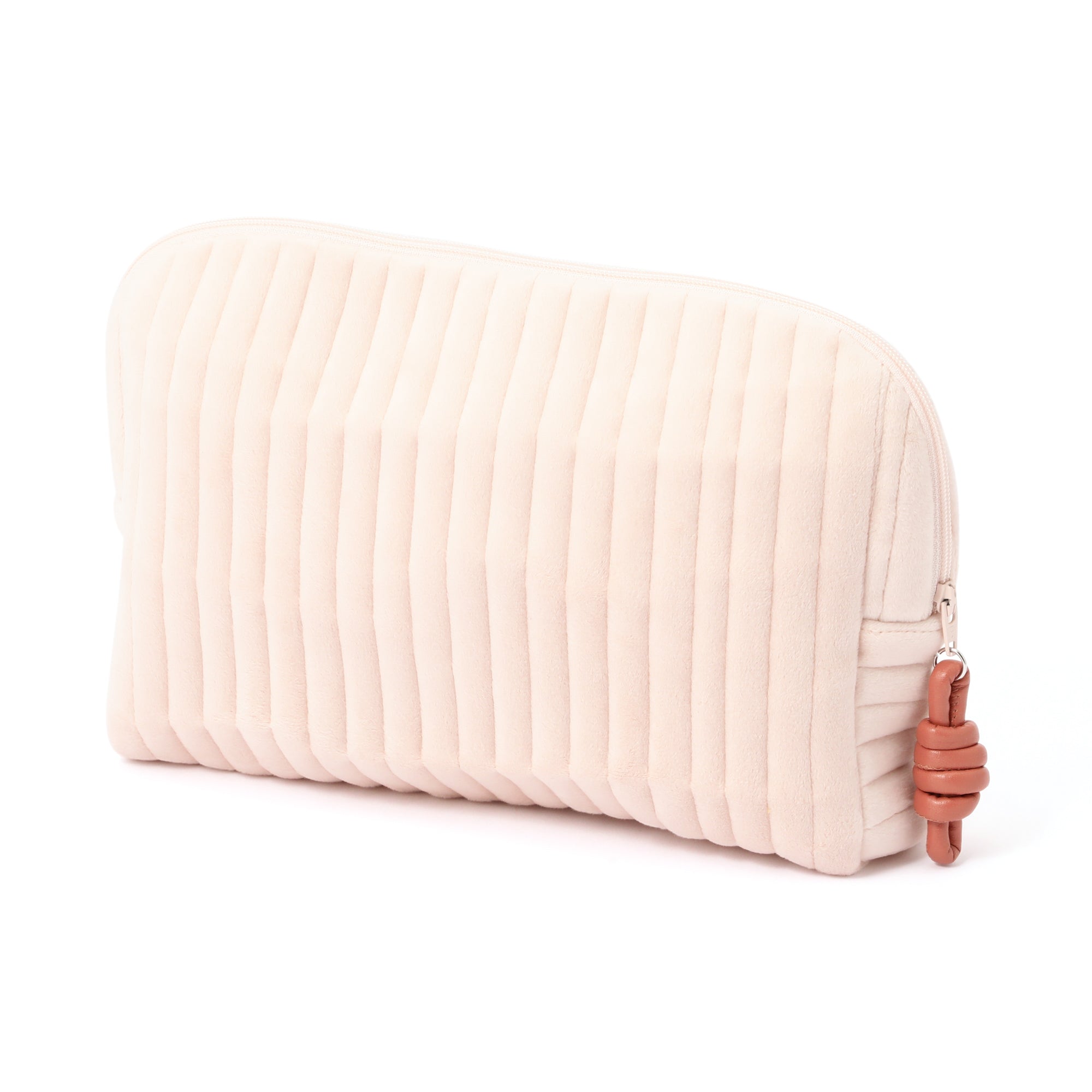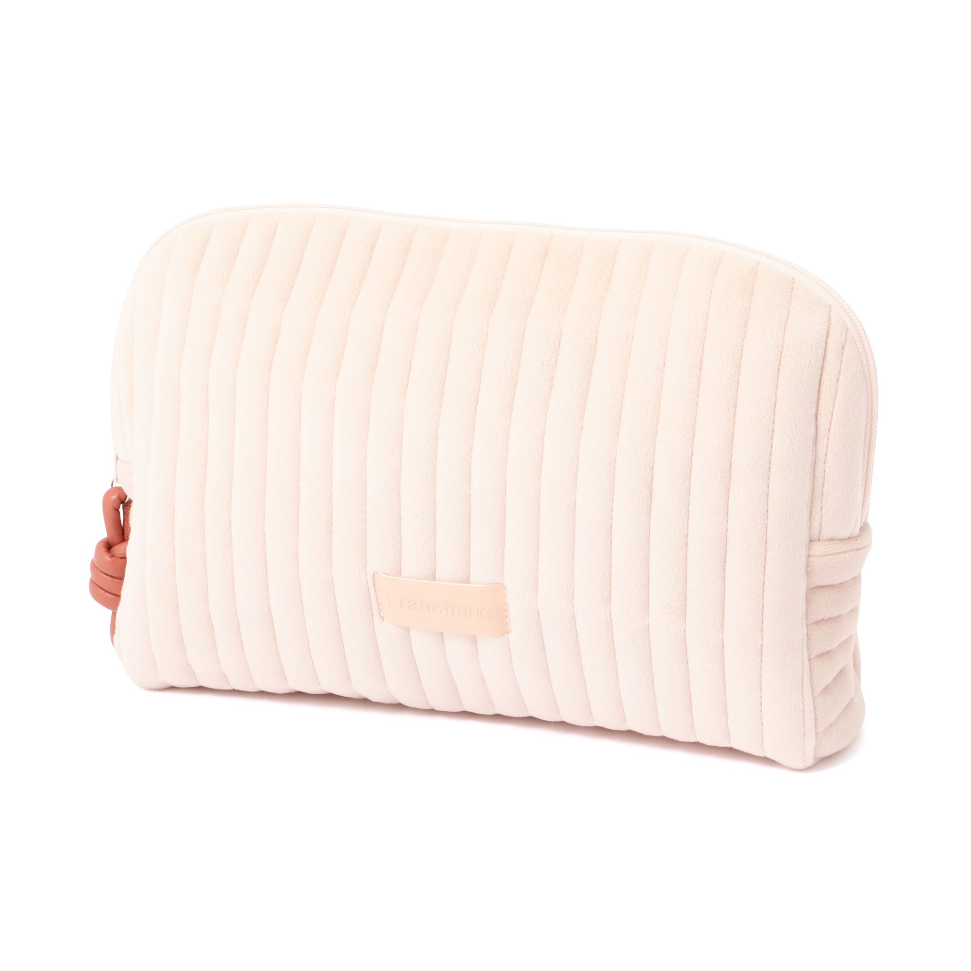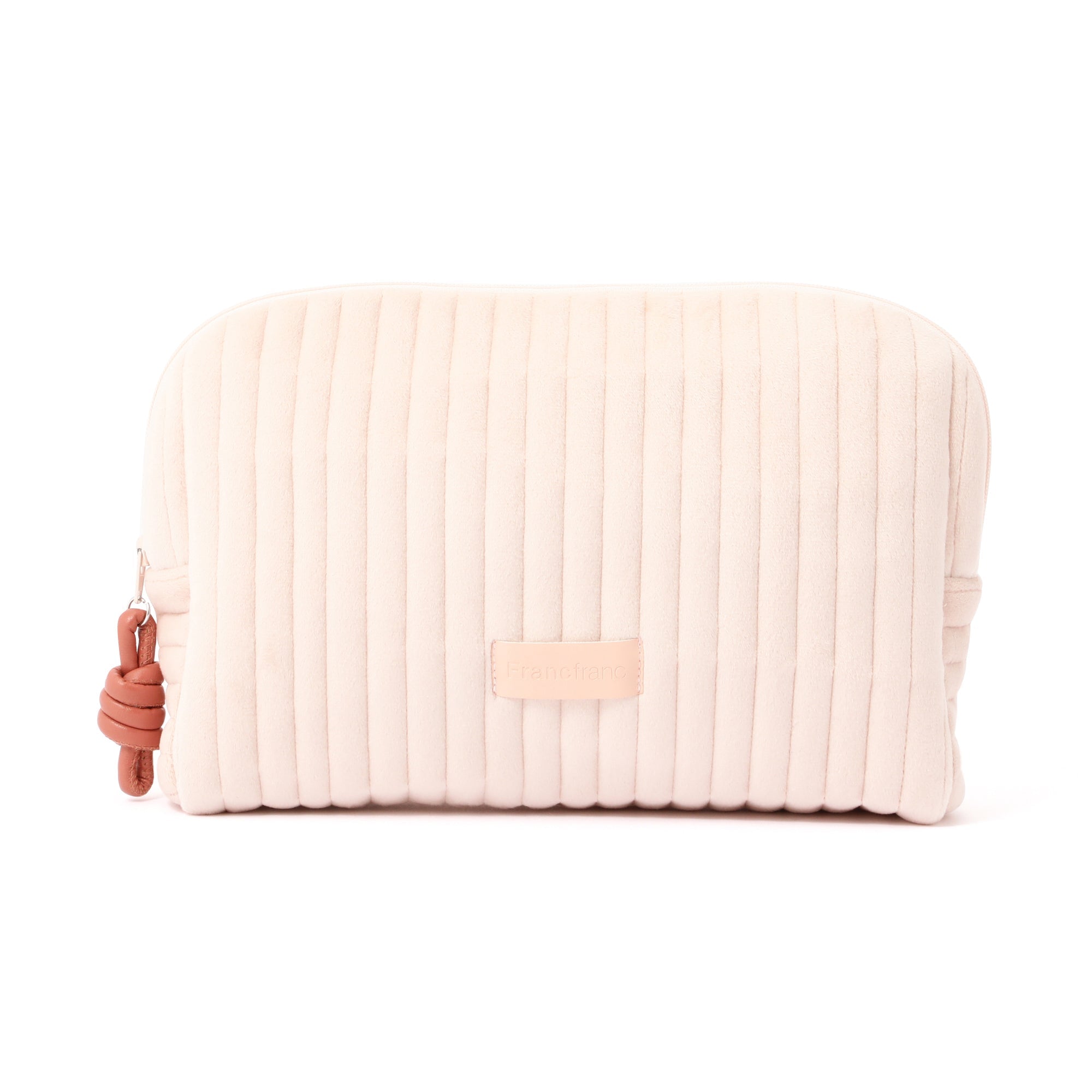 秋冬らしいベロアにストライプ模様のキルティング加工を施したポーチです。 中綿を入れているのでふかふかした触り心地と縄目デザインの引手がアクセントになったキュートなデザインです。 口が大きく開くので物の出し入れがしやすく、大きめサイズでたっぷり収納できる、使い勝手のいいアイテムです。 中はポリエステル地を貼っているので、汚れたら拭き取れるのも嬉しいポイントです。