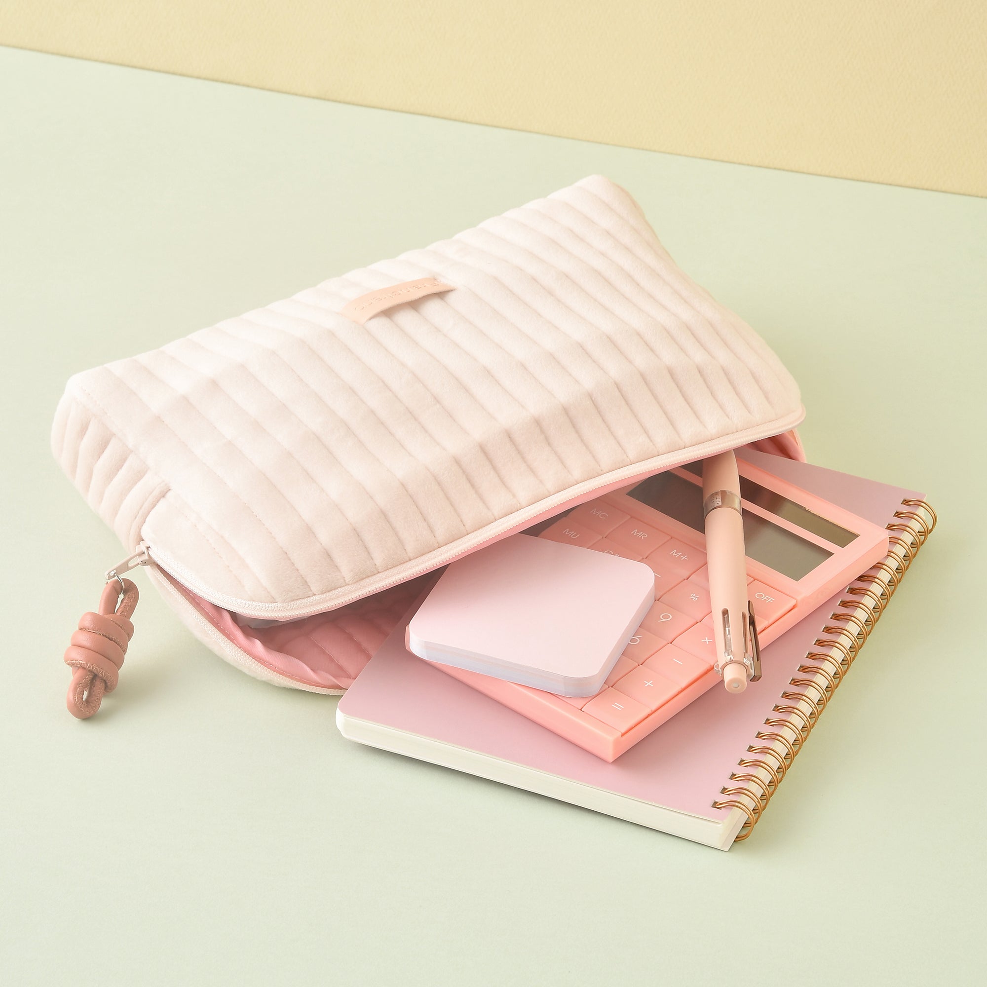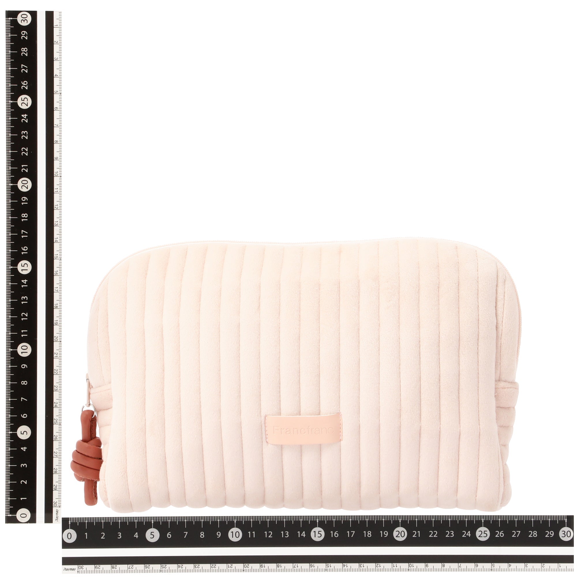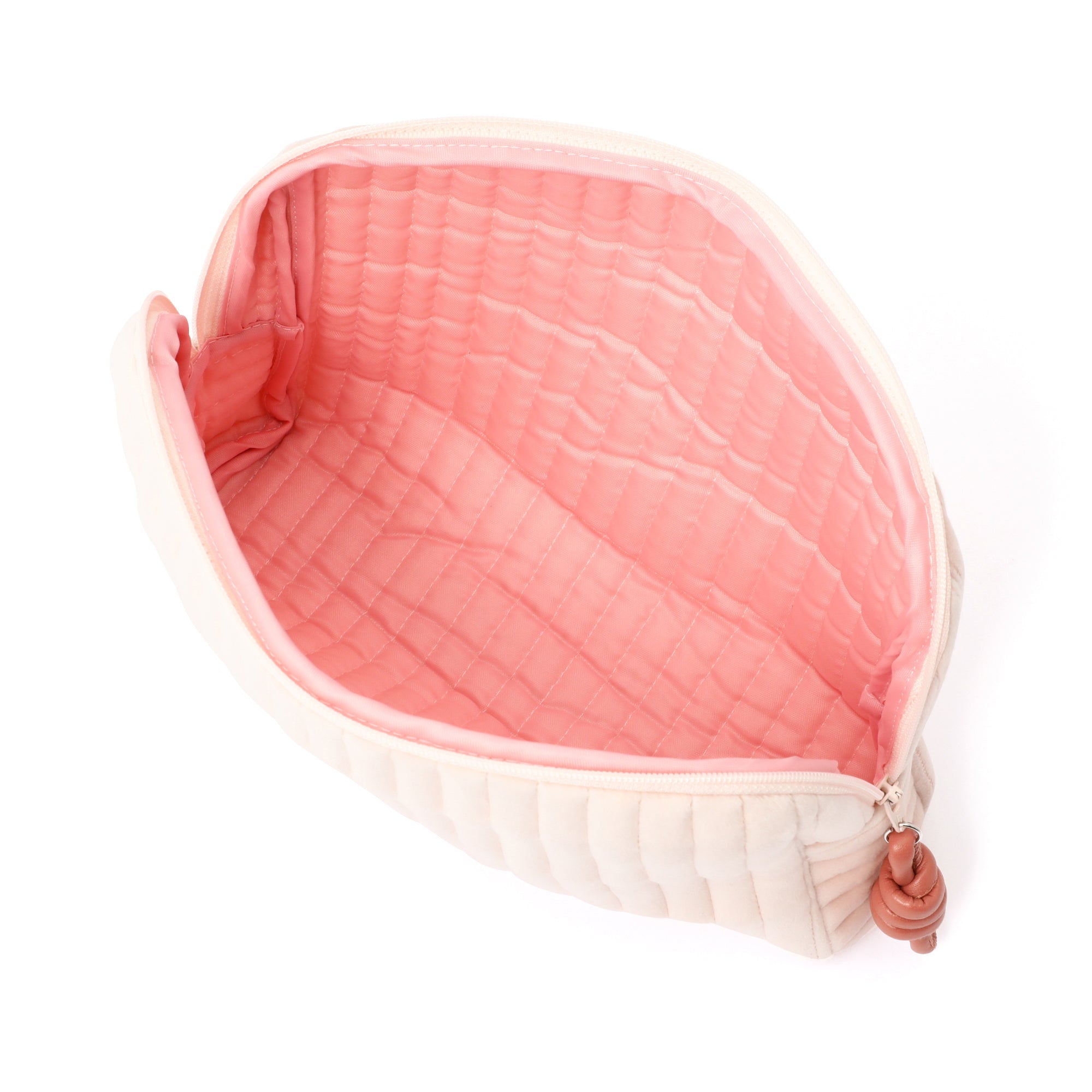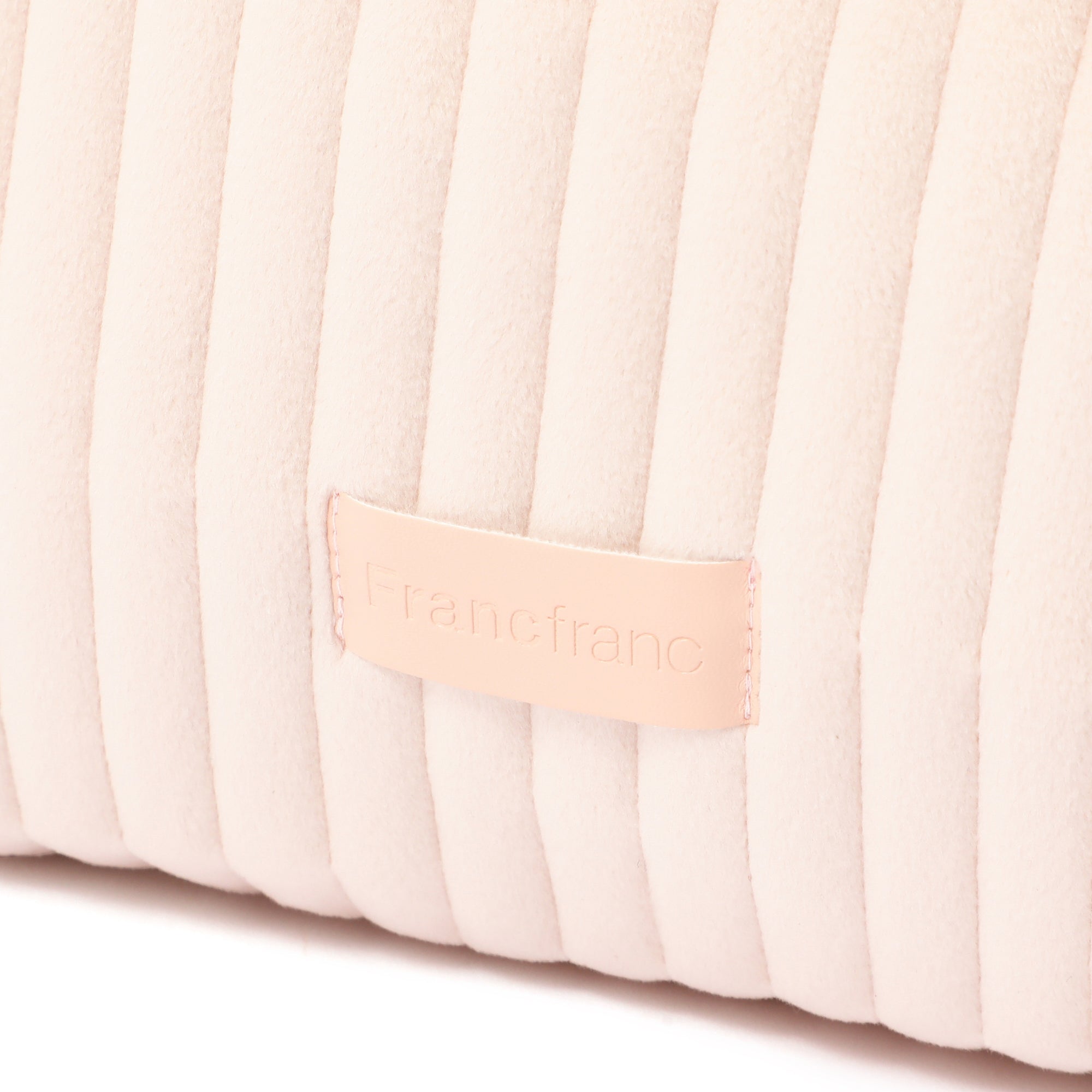 秋冬らしいベロアにストライプ模様のキルティング加工を施したポーチです。 中綿を入れているのでふかふかした触り心地と縄目デザインの引手がアクセントになったキュートなデザインです。 口が大きく開くので物の出し入れがしやすく、大きめサイズでたっぷり収納できる、使い勝手のいいアイテムです。 中はポリエステル地を貼っているので、汚れたら拭き取れるのも嬉しいポイントです。