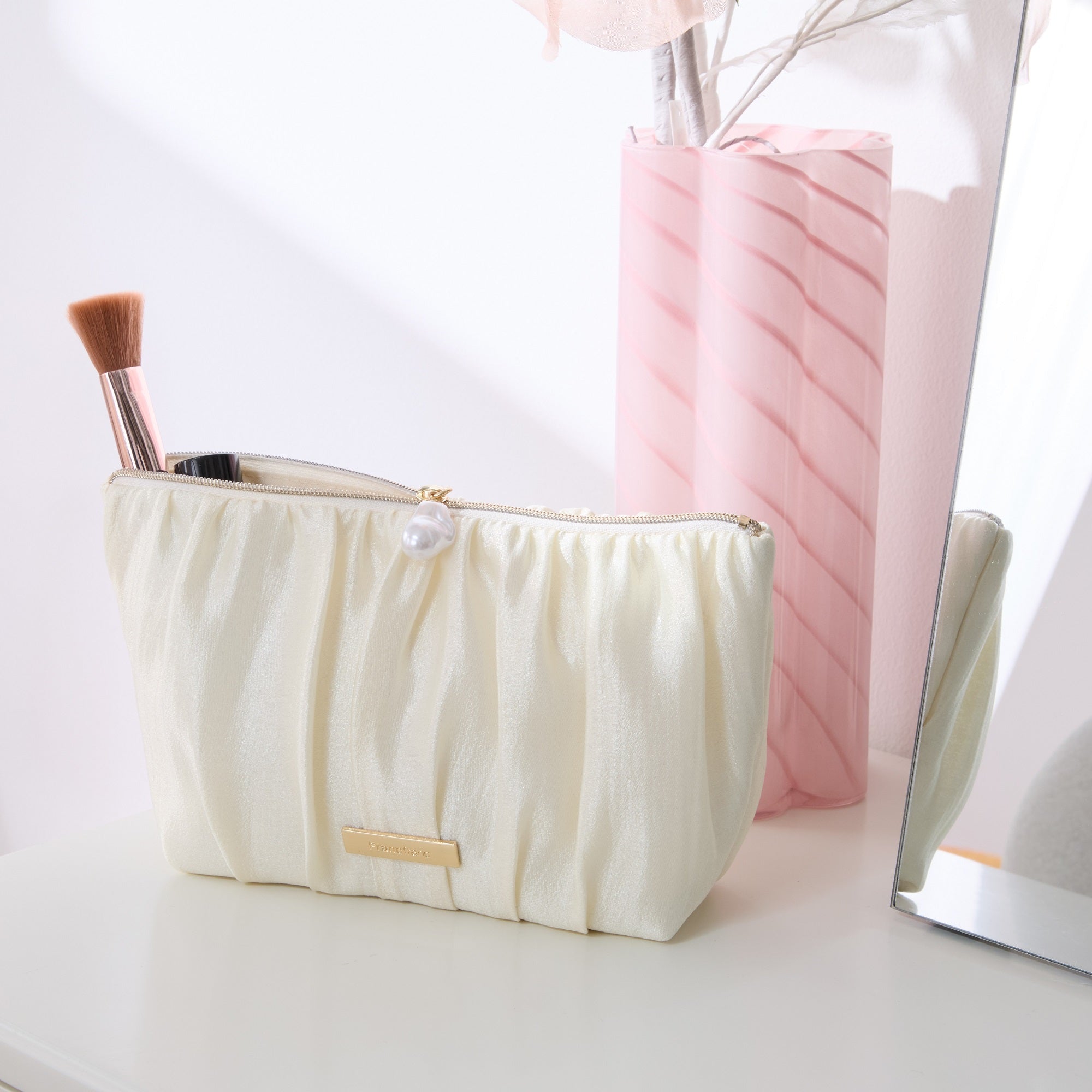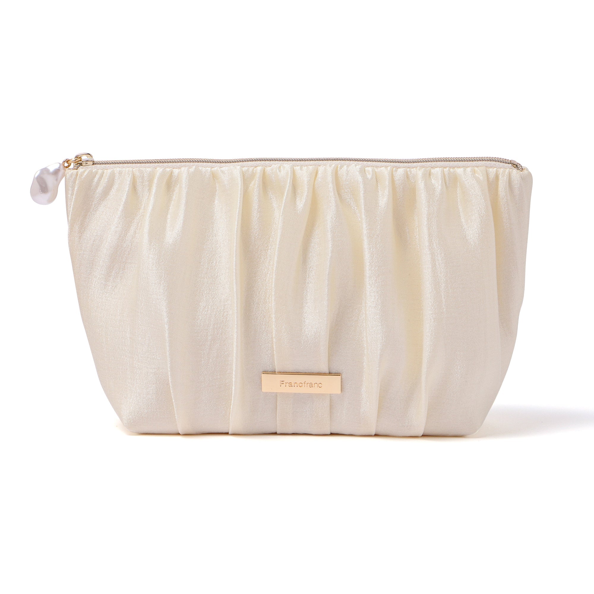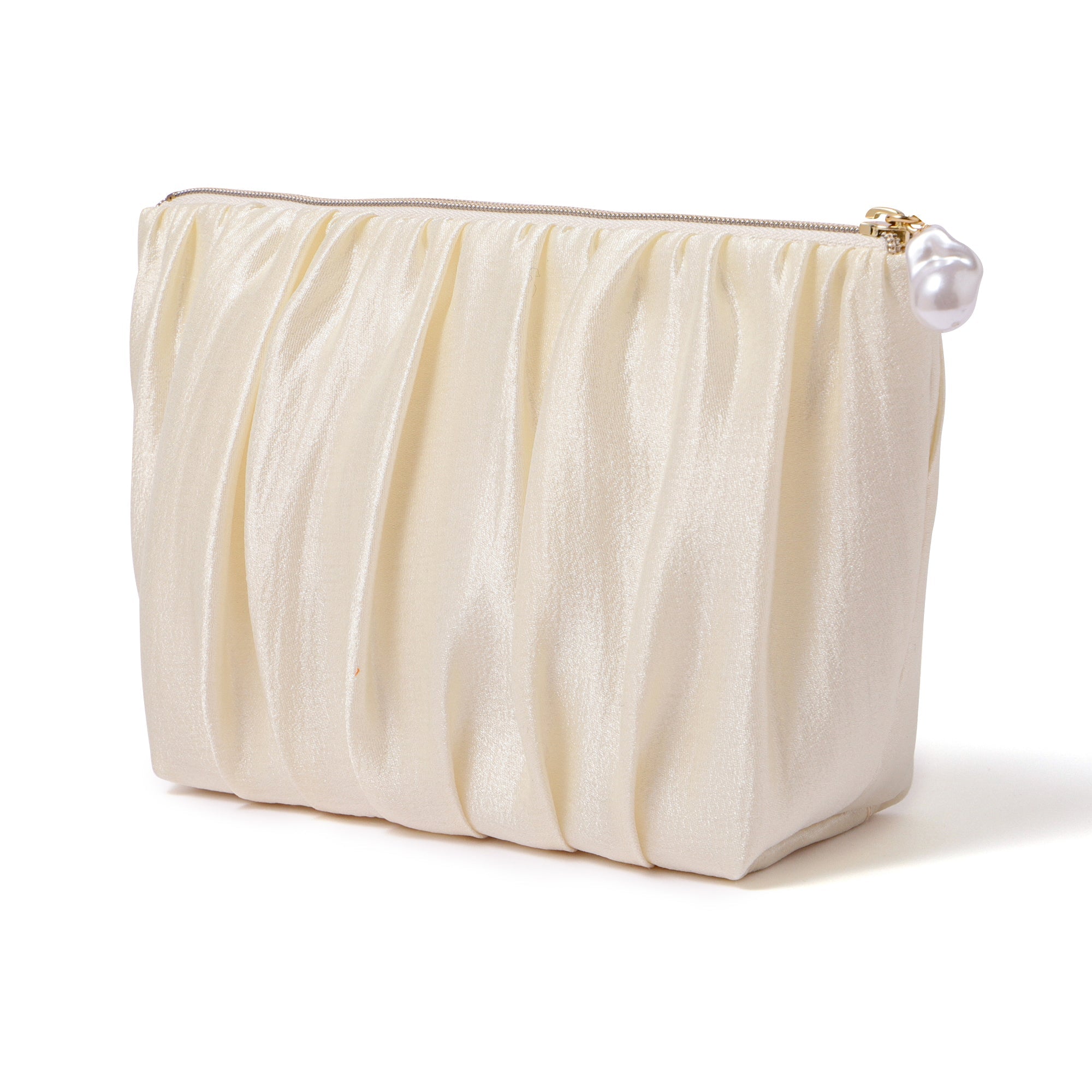 パールのような光沢シフォン生地を使った、柔らかで上品なデザインの化粧ポーチです。ジッパー引き手には淡水パール風のモチーフがついており、細部まで可愛い仕上がりです。Lサイズは沢山のコスメを持ち歩きたい方にぴったり。旅行にもおすすめです。