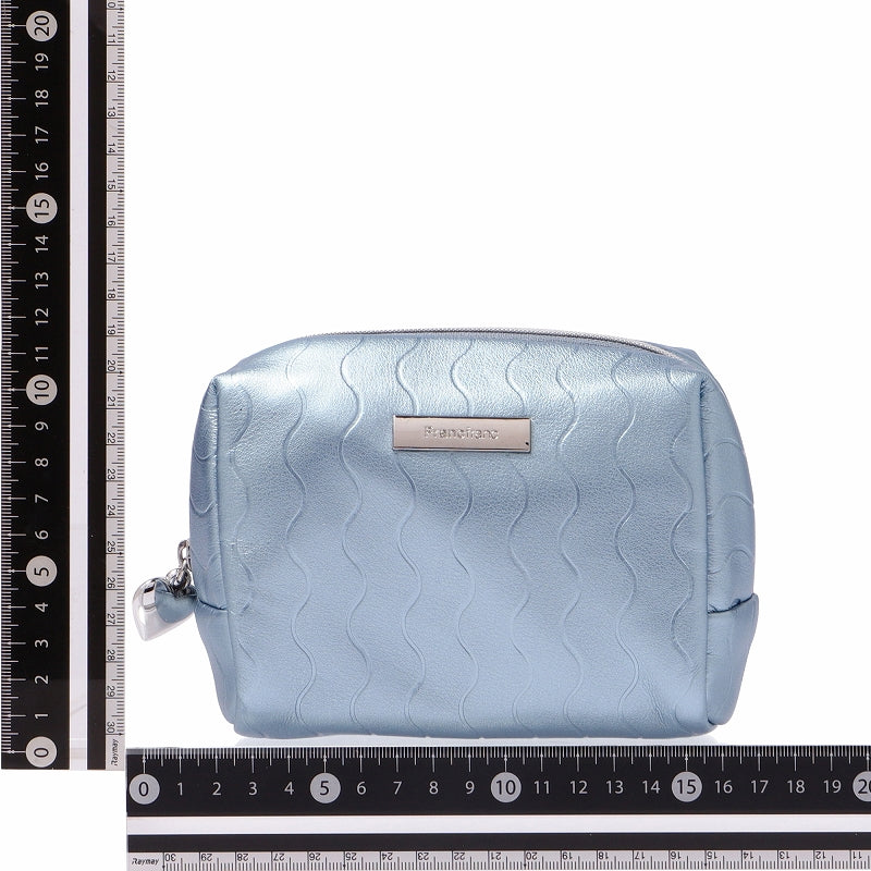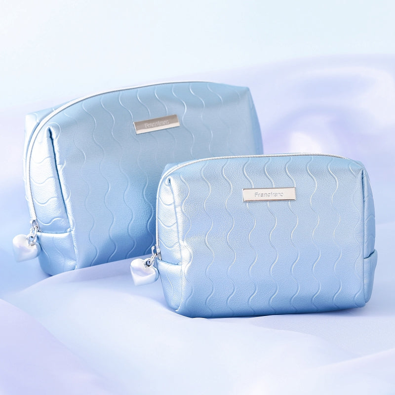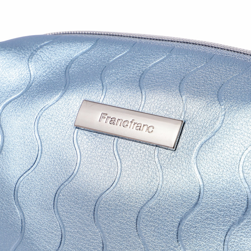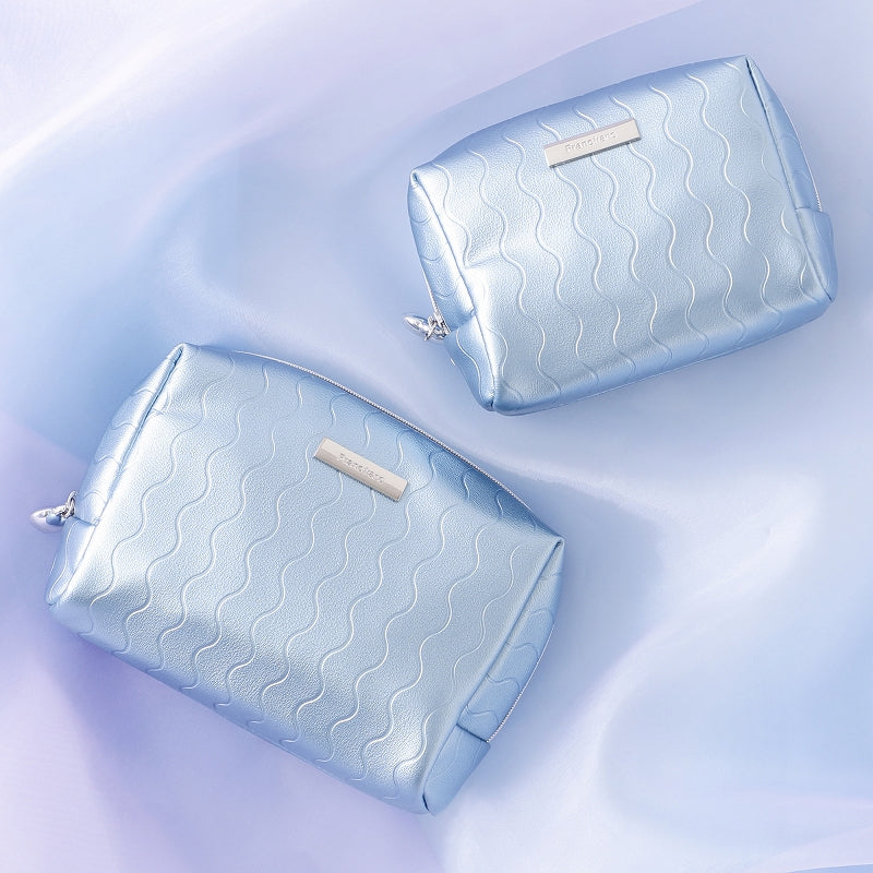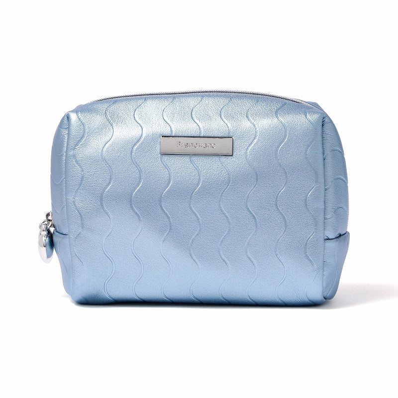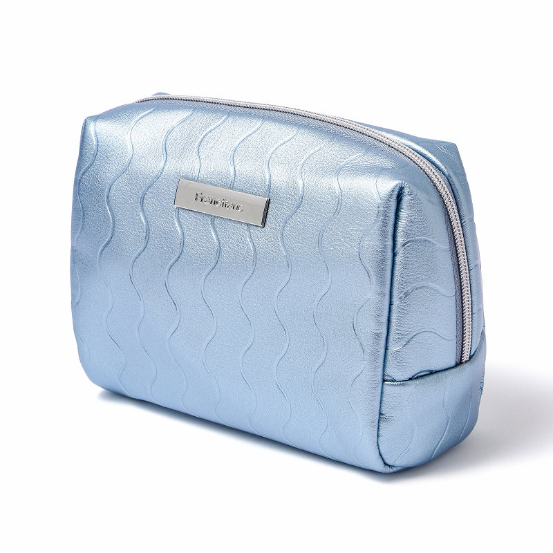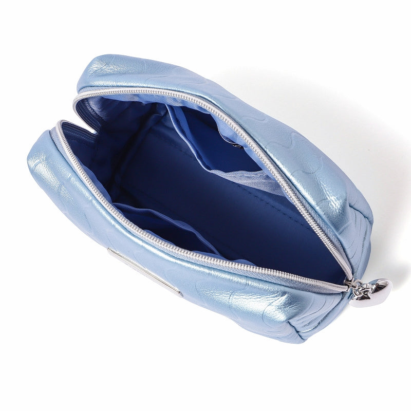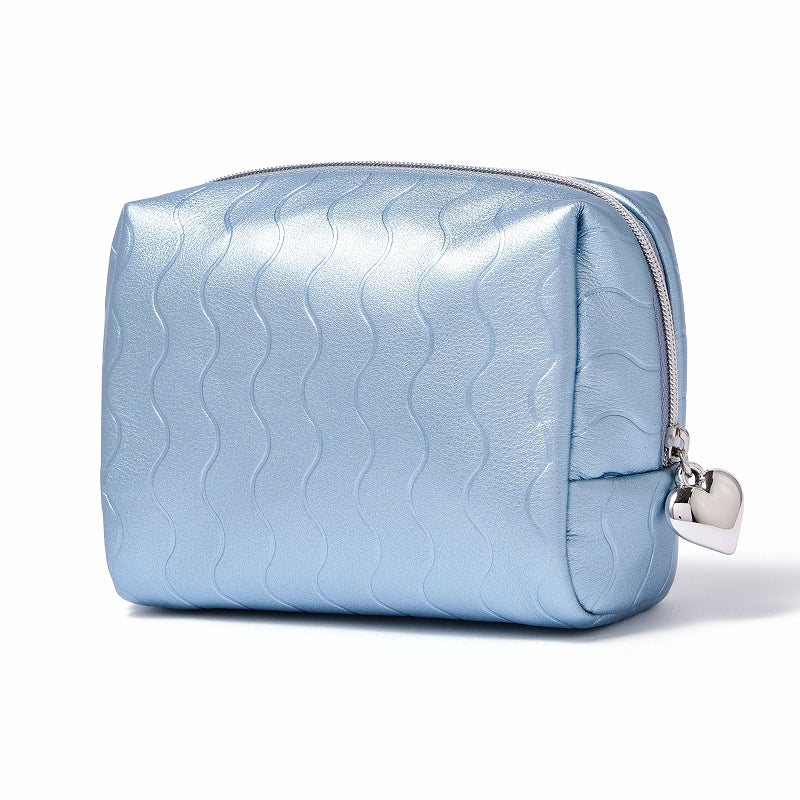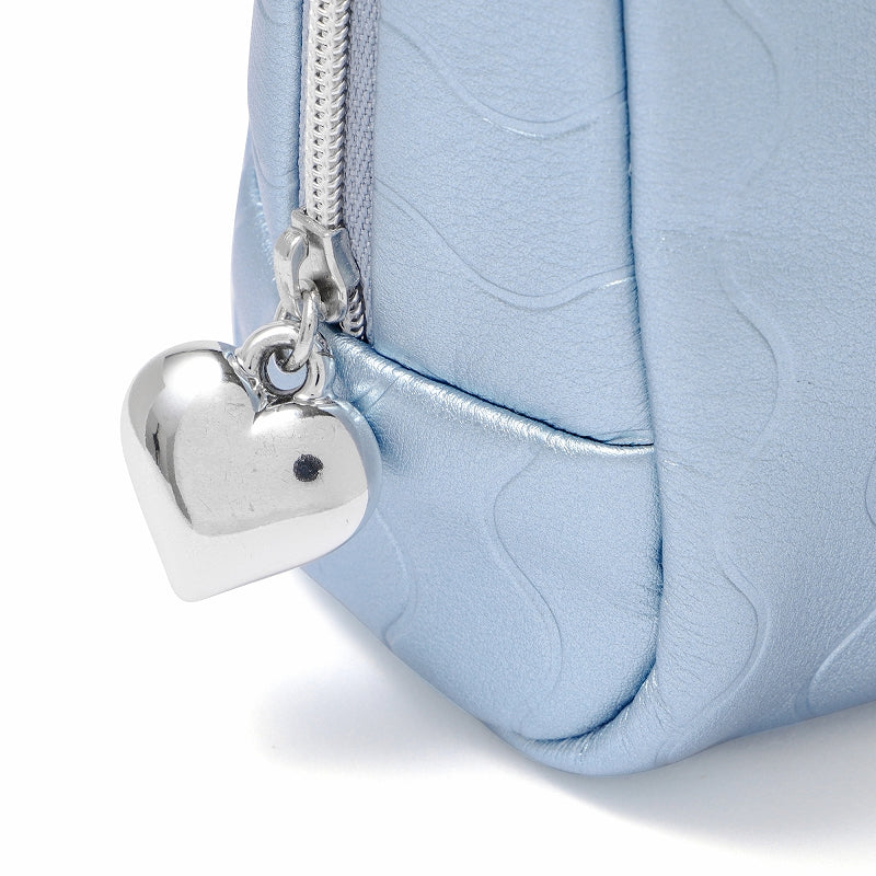 近未来的なメタリックブルーの素材にウェーブ模様を型押しした、個性的なデザインの化粧ポーチです。ジッパーの引き手はころんとしたシルバーのハート型で可愛らしさをプラスしました。Sサイズはどんなサイズのバッグにも入れやすいコンパクトな大きさで、普段使いにぴったりです。