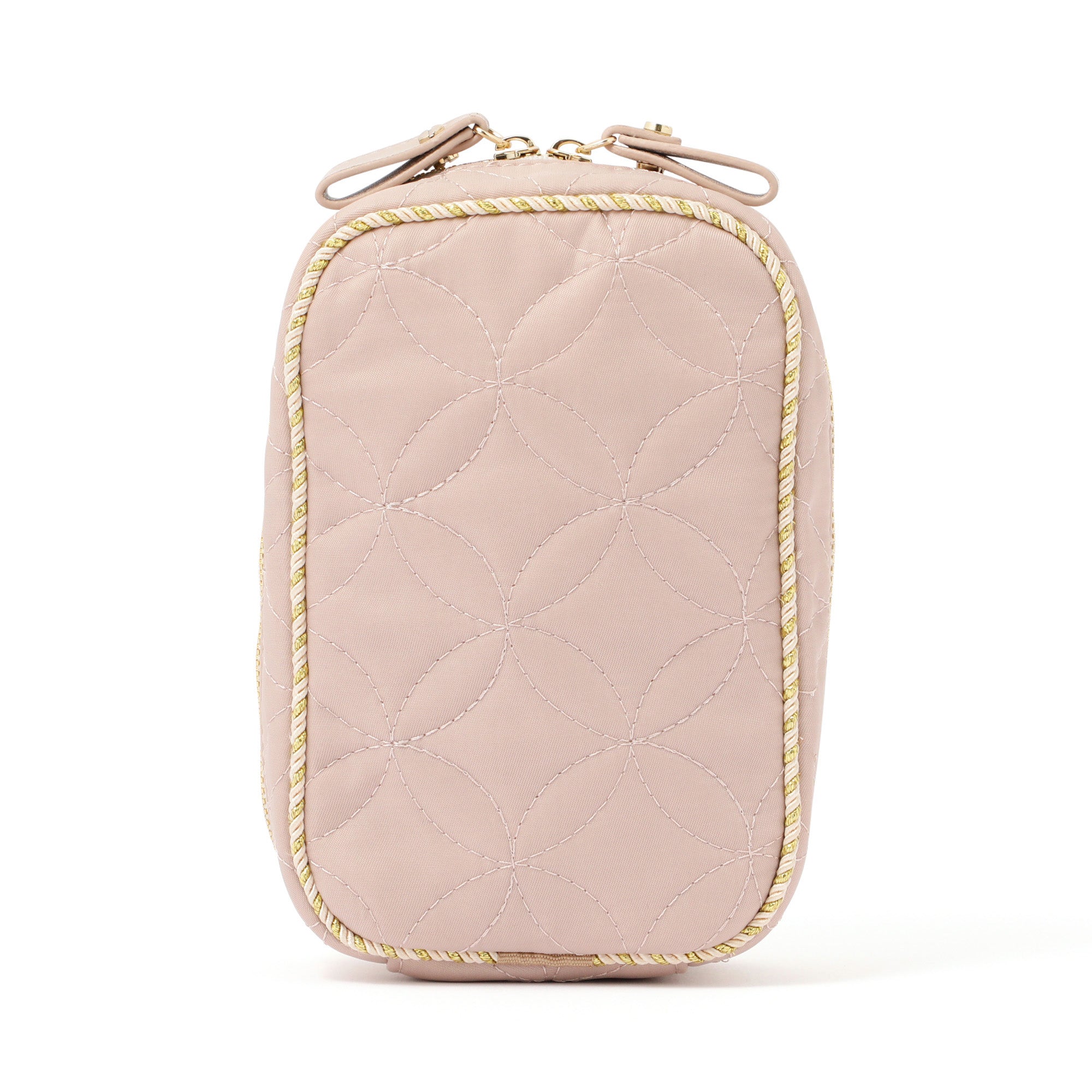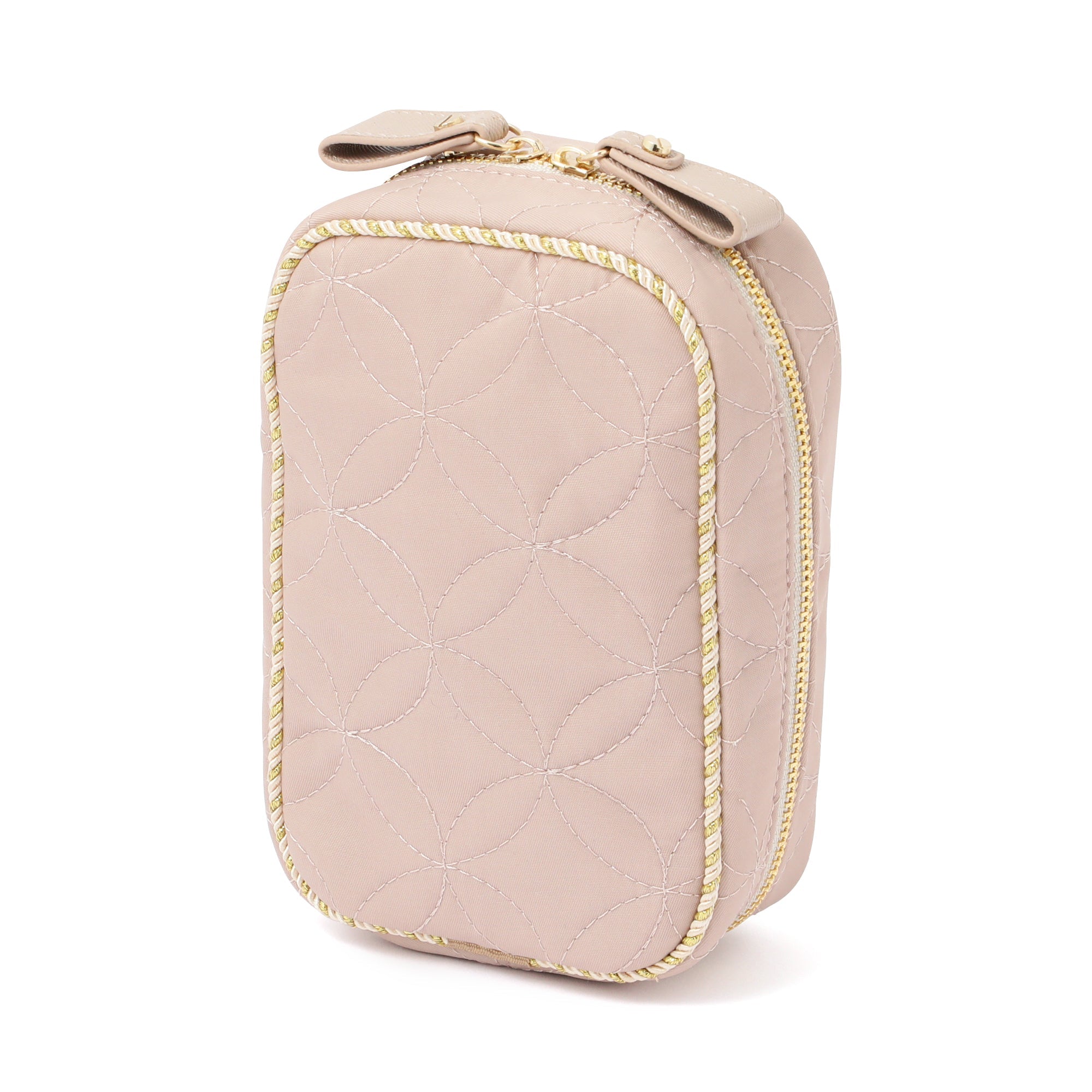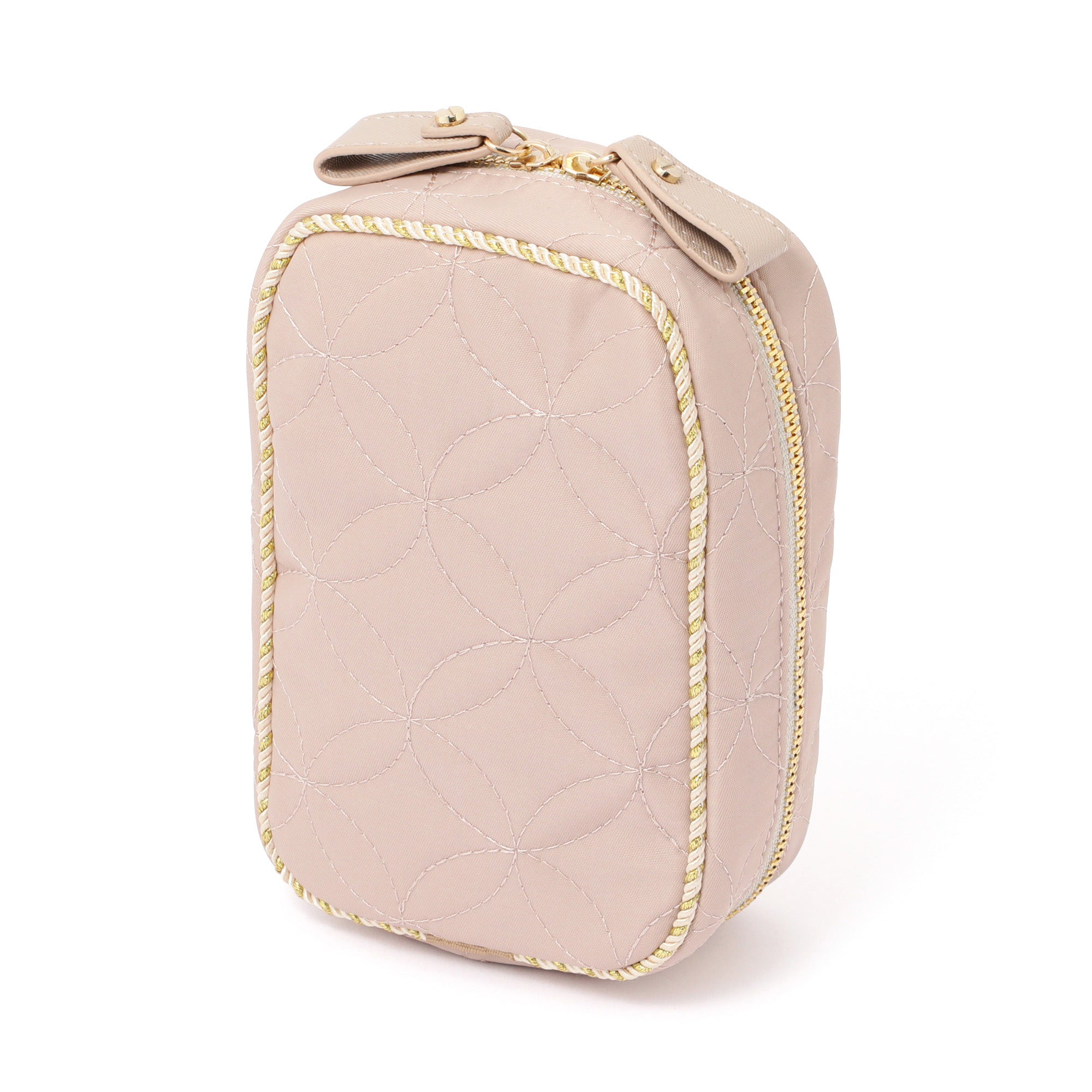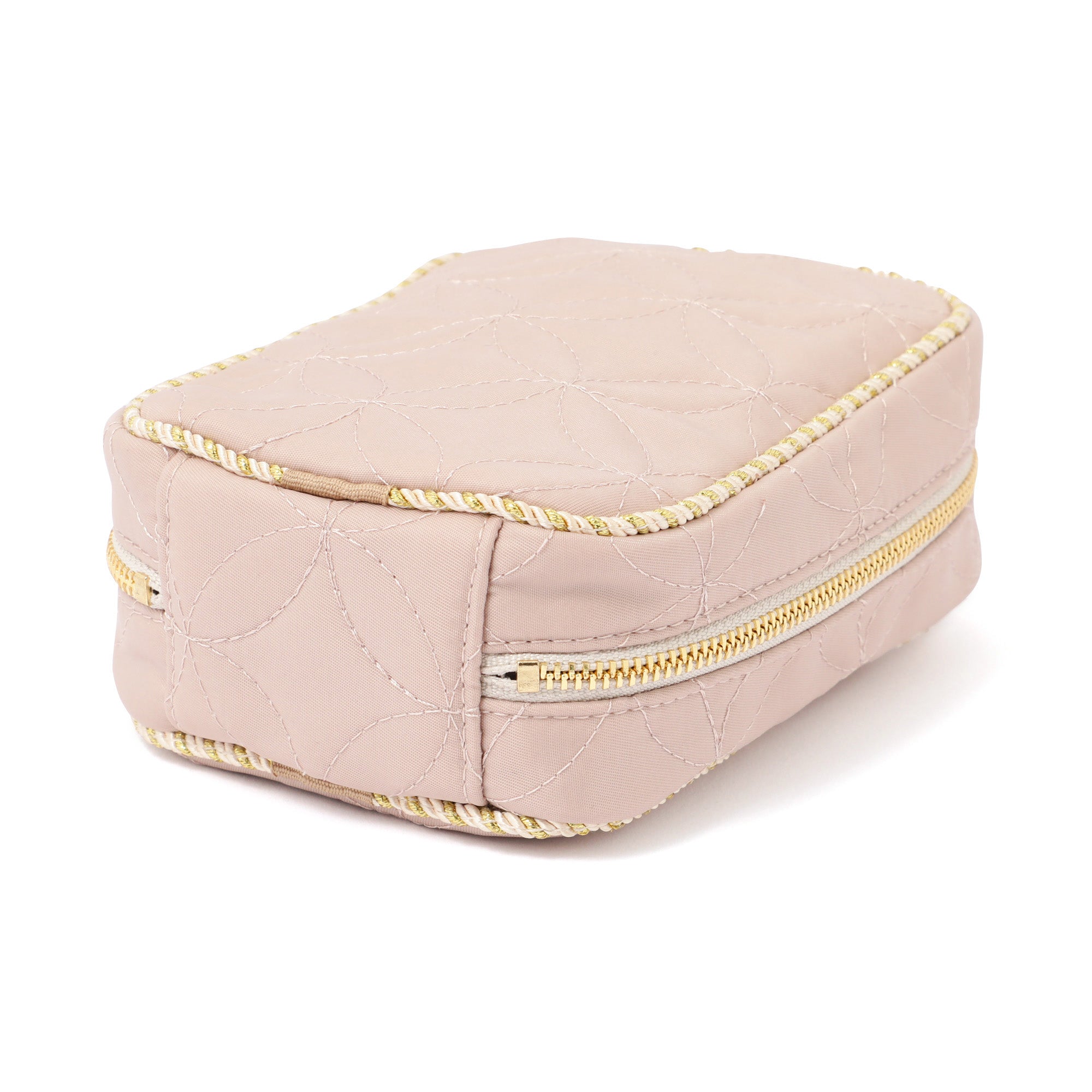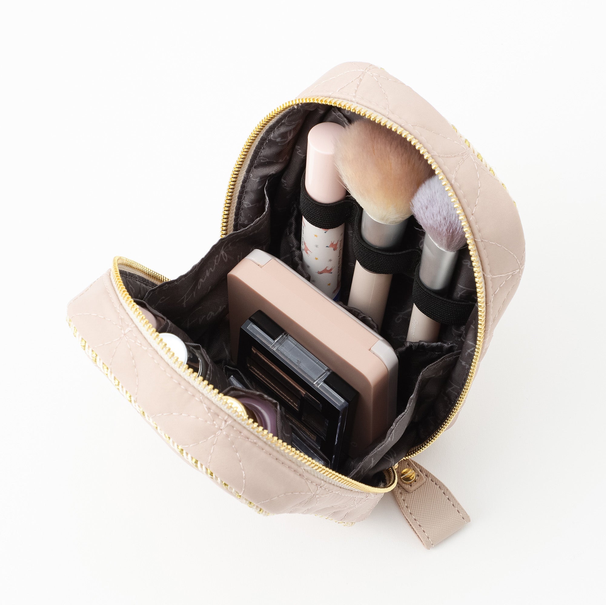 キルティングとゴールドのパイピングがエレガントな、立てて収納できる化粧ポーチです。側面に二段ポケットが付いていて、お気に入りのコスメをすっきり、たっぷり収納できちゃう優秀アイテム。ブラシホルダー付きでメイクブラシやペンシルなどもきれいに収まり、マチがあるのでコンパクトやパレットタイプのコスメもしっかり収納できます。サッと取り出せてしまいやすいので使い勝手抜群。短時間でお化粧を直したい時にも大活躍です。淡いグレーはお化粧直しの時間がときめくような優しいカラーで、リムに縁取られたゴールドとの相性もばっちり。引手は大きめで使いやすく、高級感のあるデザインです。年代を問わずに使いやすいデザイン、機能面も魅力的なので、お誕生日やちょっとした贈り物など様々なギフトシーンでもおすすめのアイテムです。色違いやサイズ違いでポーチを揃えてカバンの中を可愛く、メイク時間を楽しくしていただけます。