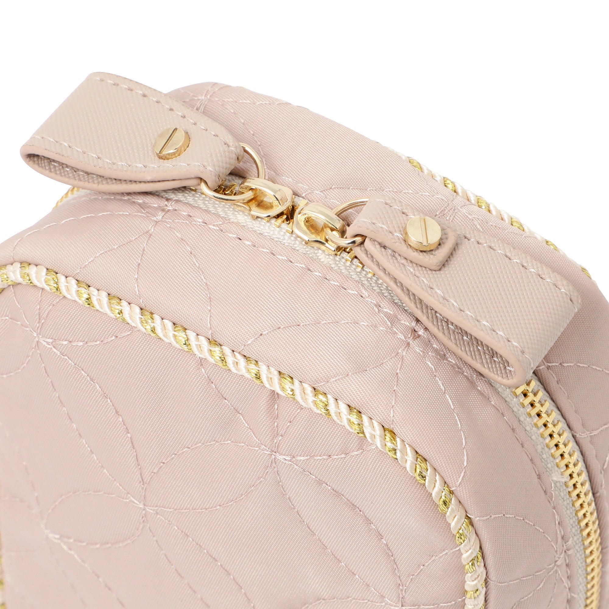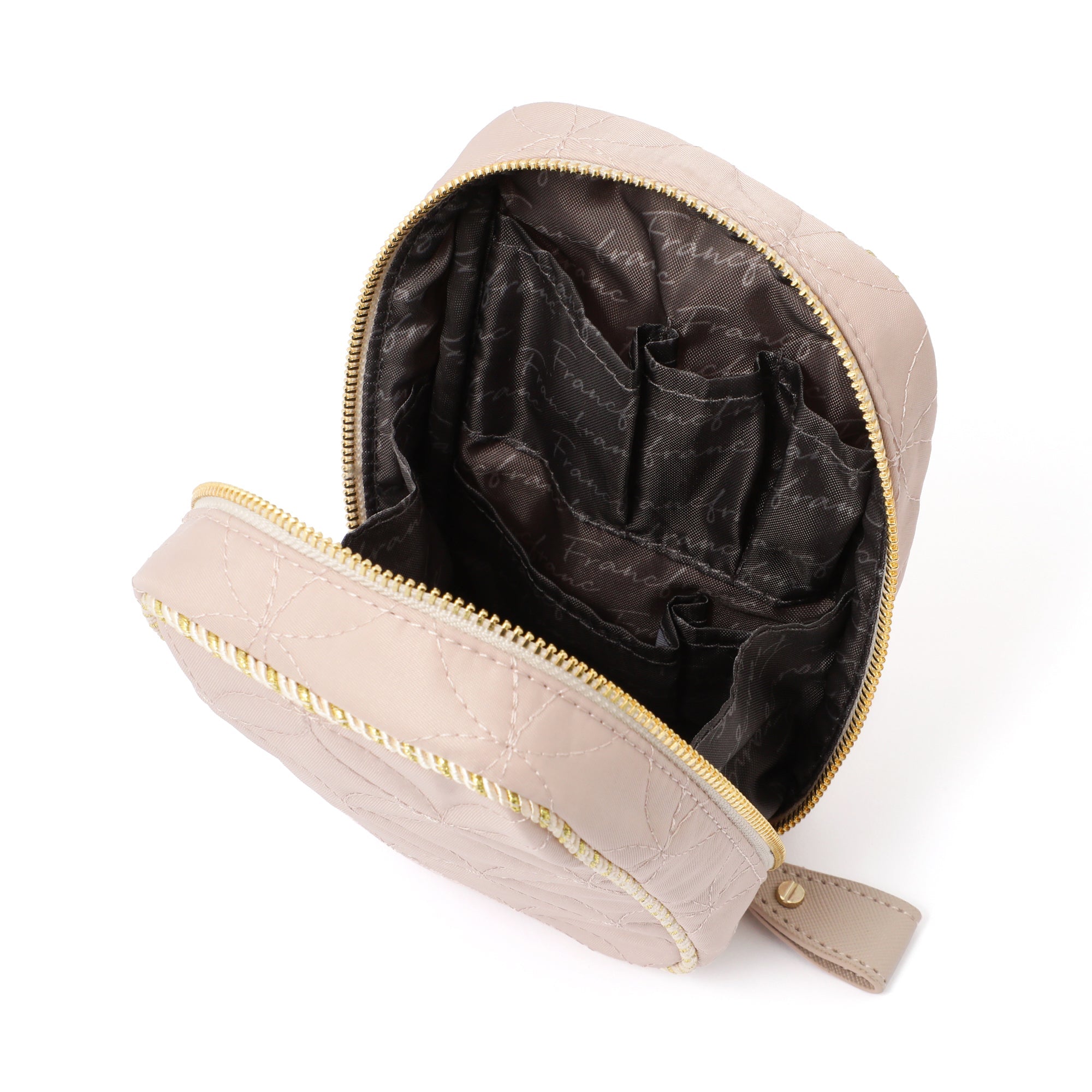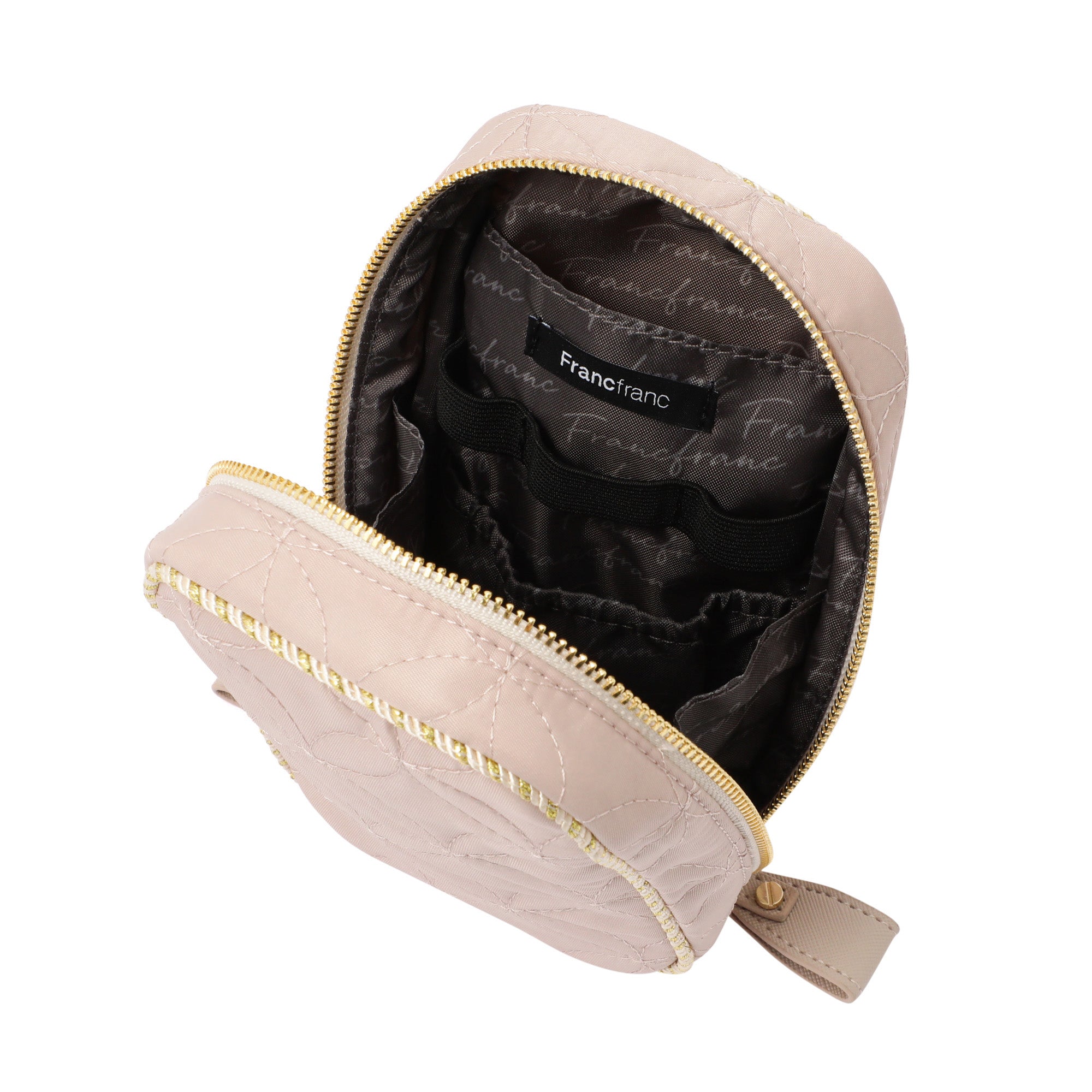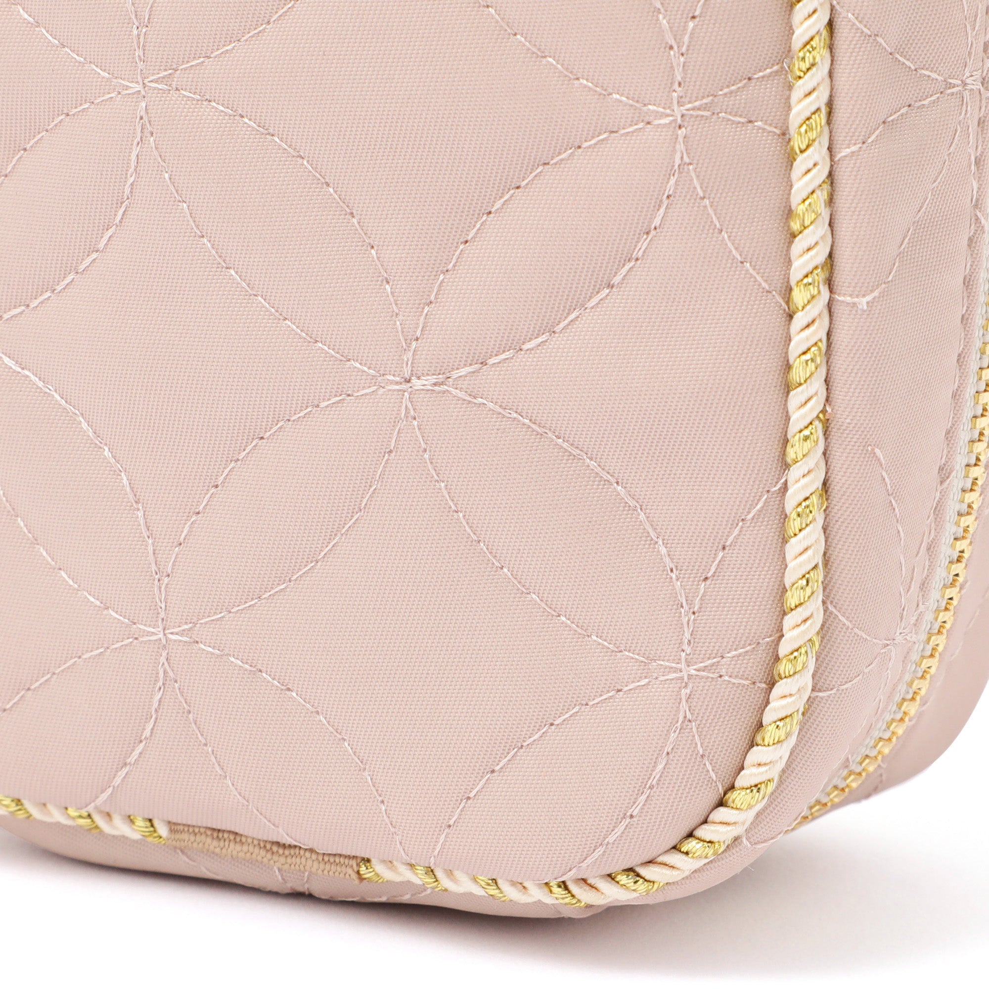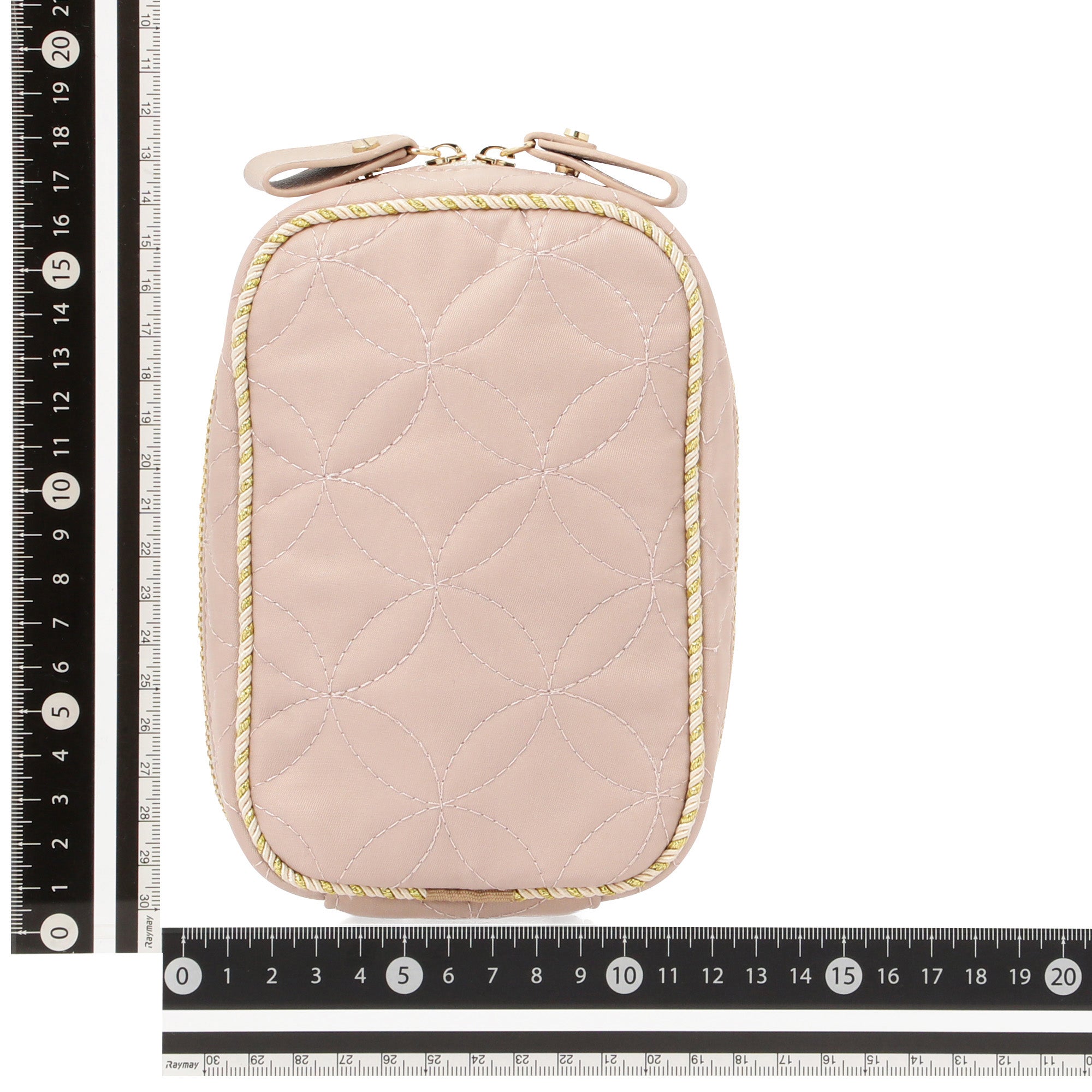 キルティングとゴールドのパイピングがエレガントな、立てて収納できる化粧ポーチです。側面に二段ポケットが付いていて、お気に入りのコスメをすっきり、たっぷり収納できちゃう優秀アイテム。ブラシホルダー付きでメイクブラシやペンシルなどもきれいに収まり、マチがあるのでコンパクトやパレットタイプのコスメもしっかり収納できます。サッと取り出せてしまいやすいので使い勝手抜群。短時間でお化粧を直したい時にも大活躍です。淡いグレーはお化粧直しの時間がときめくような優しいカラーで、リムに縁取られたゴールドとの相性もばっちり。引手は大きめで使いやすく、高級感のあるデザインです。年代を問わずに使いやすいデザイン、機能面も魅力的なので、お誕生日やちょっとした贈り物など様々なギフトシーンでもおすすめのアイテムです。色違いやサイズ違いでポーチを揃えてカバンの中を可愛く、メイク時間を楽しくしていただけます。