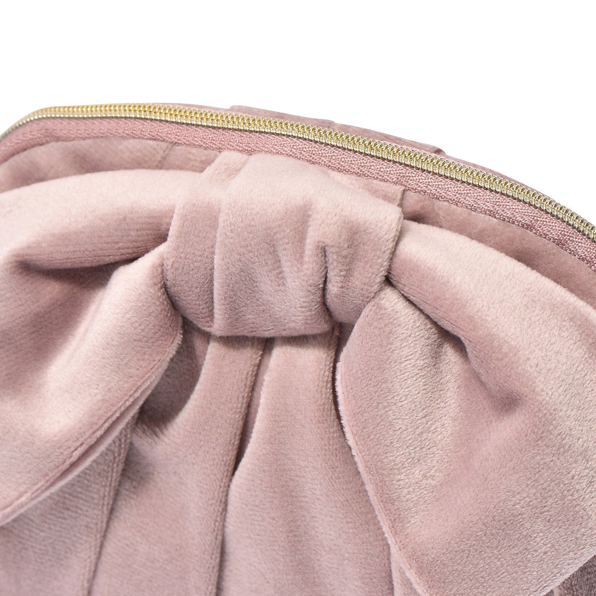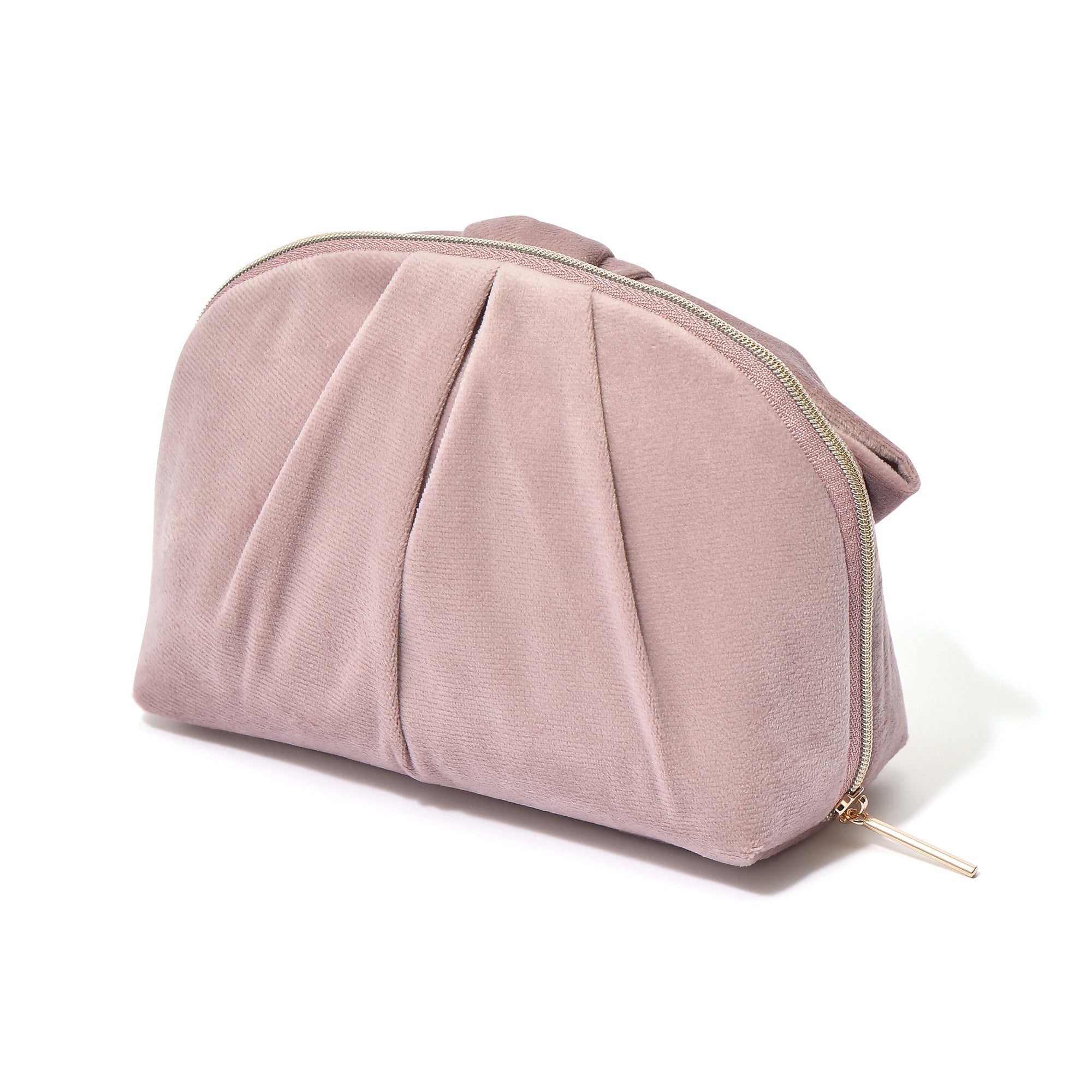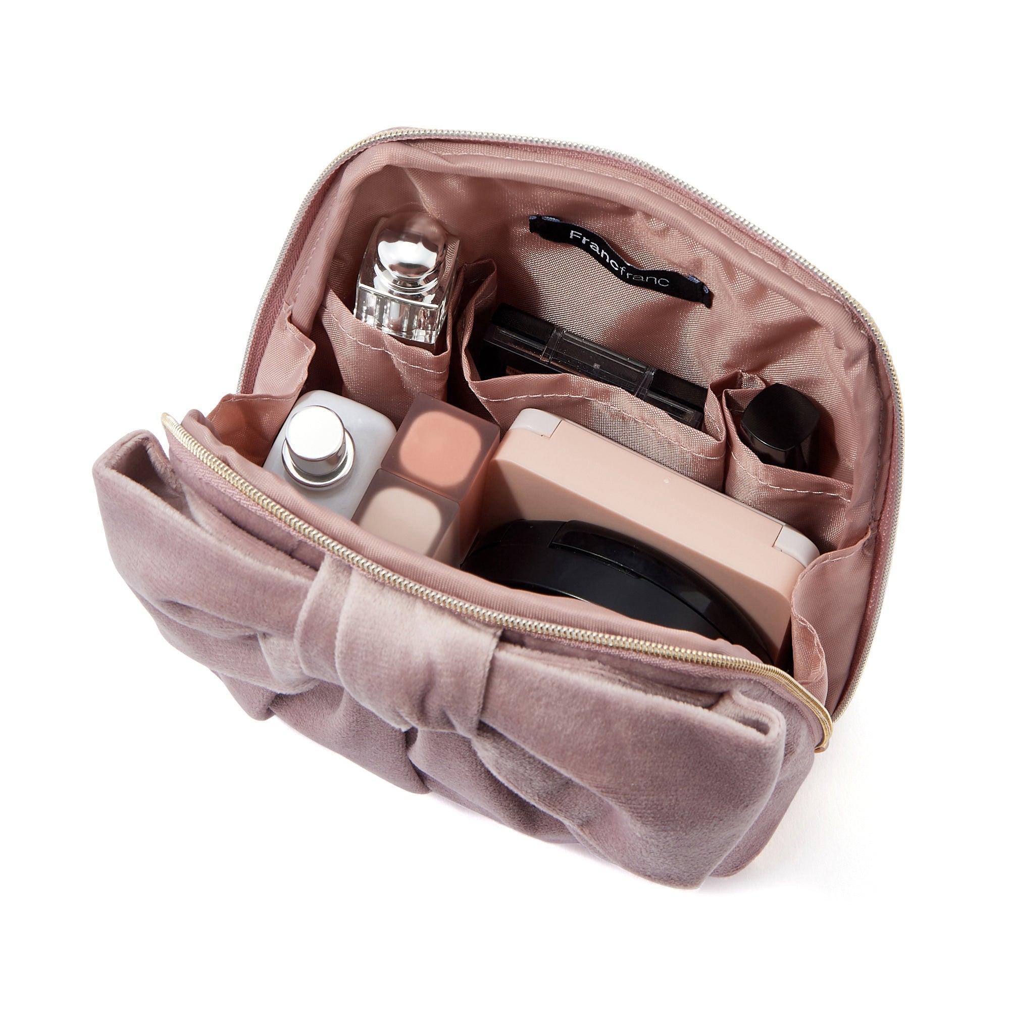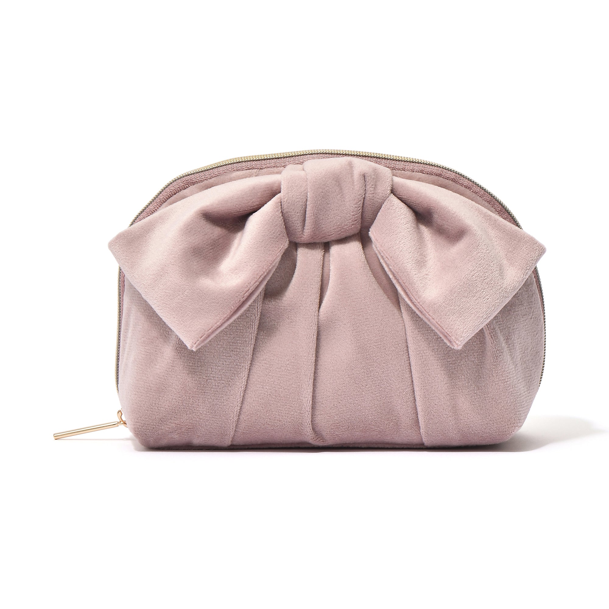 光沢感のあるベロア生地で大きなリボンをあしらったポーチです。可愛らしいリボンモチーフと落ち着いた配色のバランスが絶妙で、普段使いに取り入れやすいデザイン。Sサイズはコンパクトで日常的な持ち運びに便利です。内側にはポケット付きで細かいアイテムの整理に活躍します。