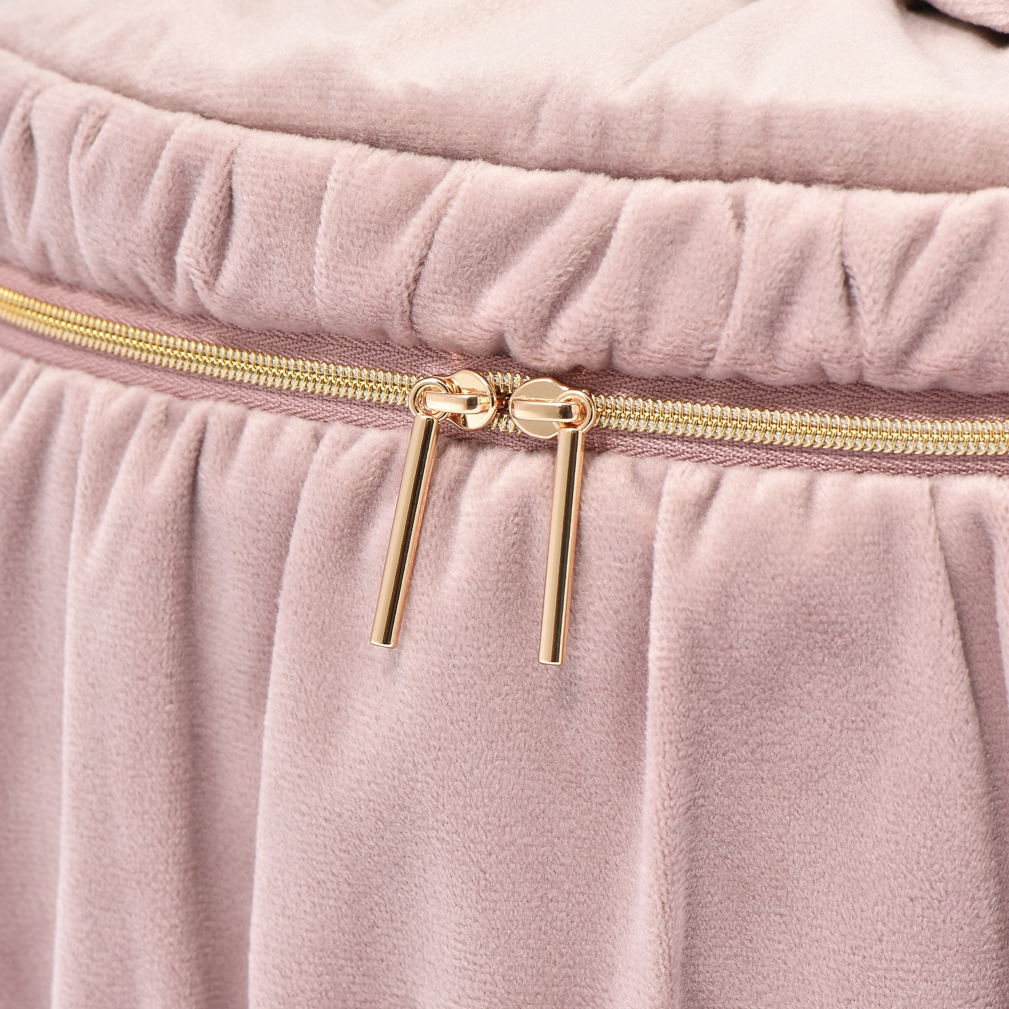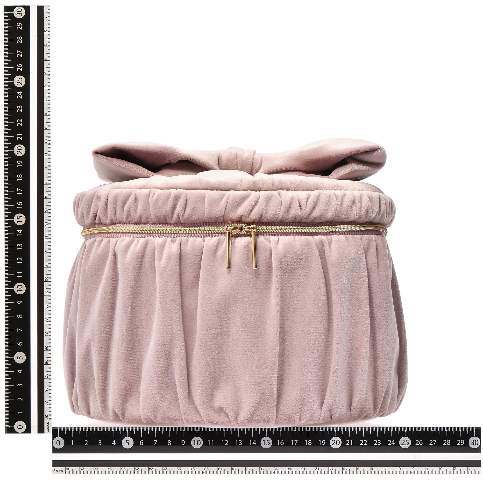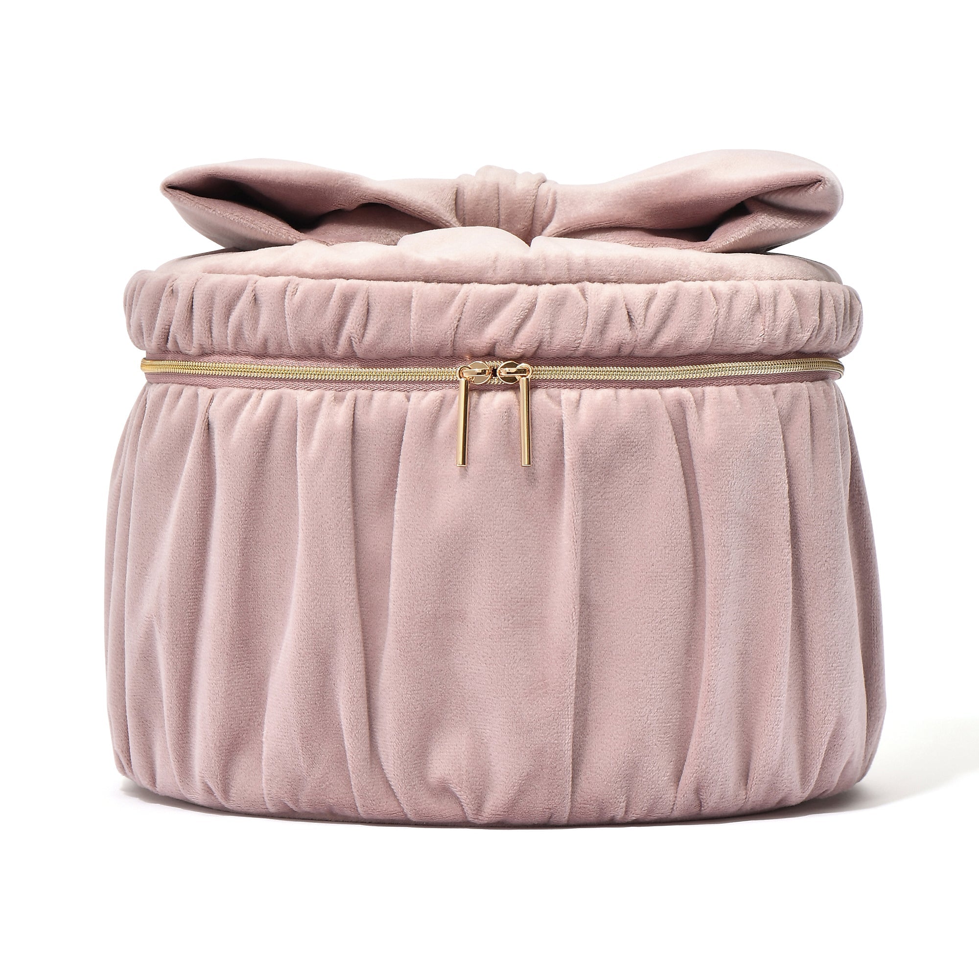 光沢感のあるベロア生地で大きなリボンをあしらったポーチです。可愛らしいリボンモチーフと落ち着いた配色のバランスが絶妙で、普段使いに取り入れやすいデザイン。バニティポーチはキュートな円形に仕上げ、ゴールドのハンドルで高級感をプラスしました。ご自宅で毎日のメイク用品を収納しておくのにぴったりな大容量サイズです。中央には取り外しが可能な仕切りも付いていて機能性抜群。随所に使いやすさの詰まった名品です。