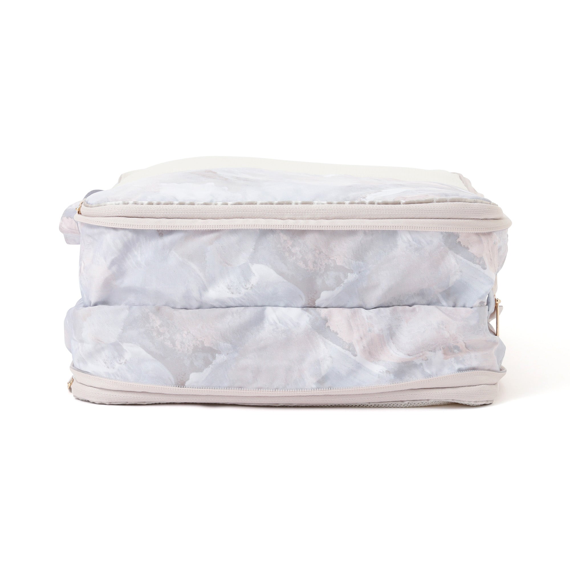 衣類をぎゅぎゅっと圧縮できる収納グッズです。オーガナイザーの外側についているファスナーをぐるっと1周半閉めると中の衣類が簡単に圧縮されます。かさばりがちな荷物をコンパクトに持ち運べるので旅行に大活躍。使わない時は小さく折りたためます。中は仕切りで二つに分かれているので、着用前後で衣類を分けて収納できます。水彩画のような美しいペイント柄が旅支度を楽しく盛り上げてくれます。