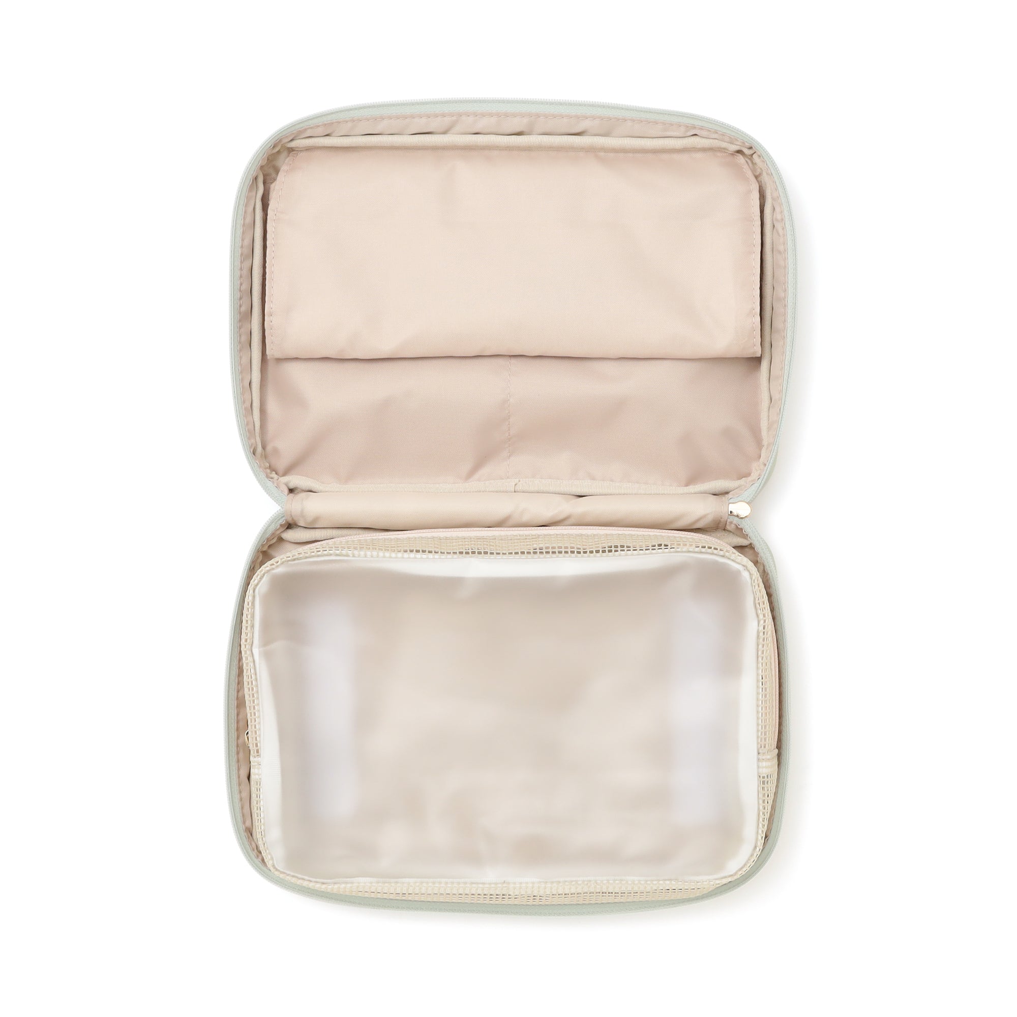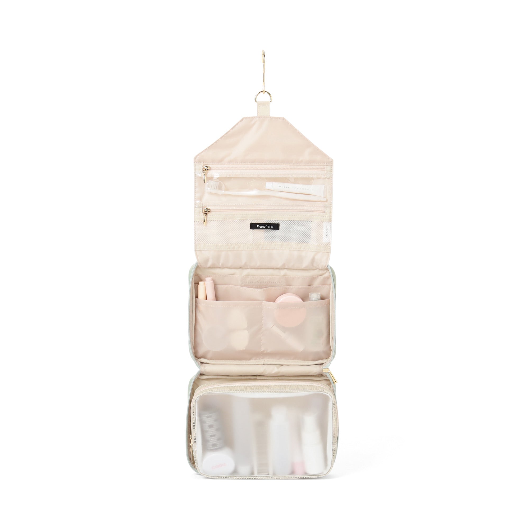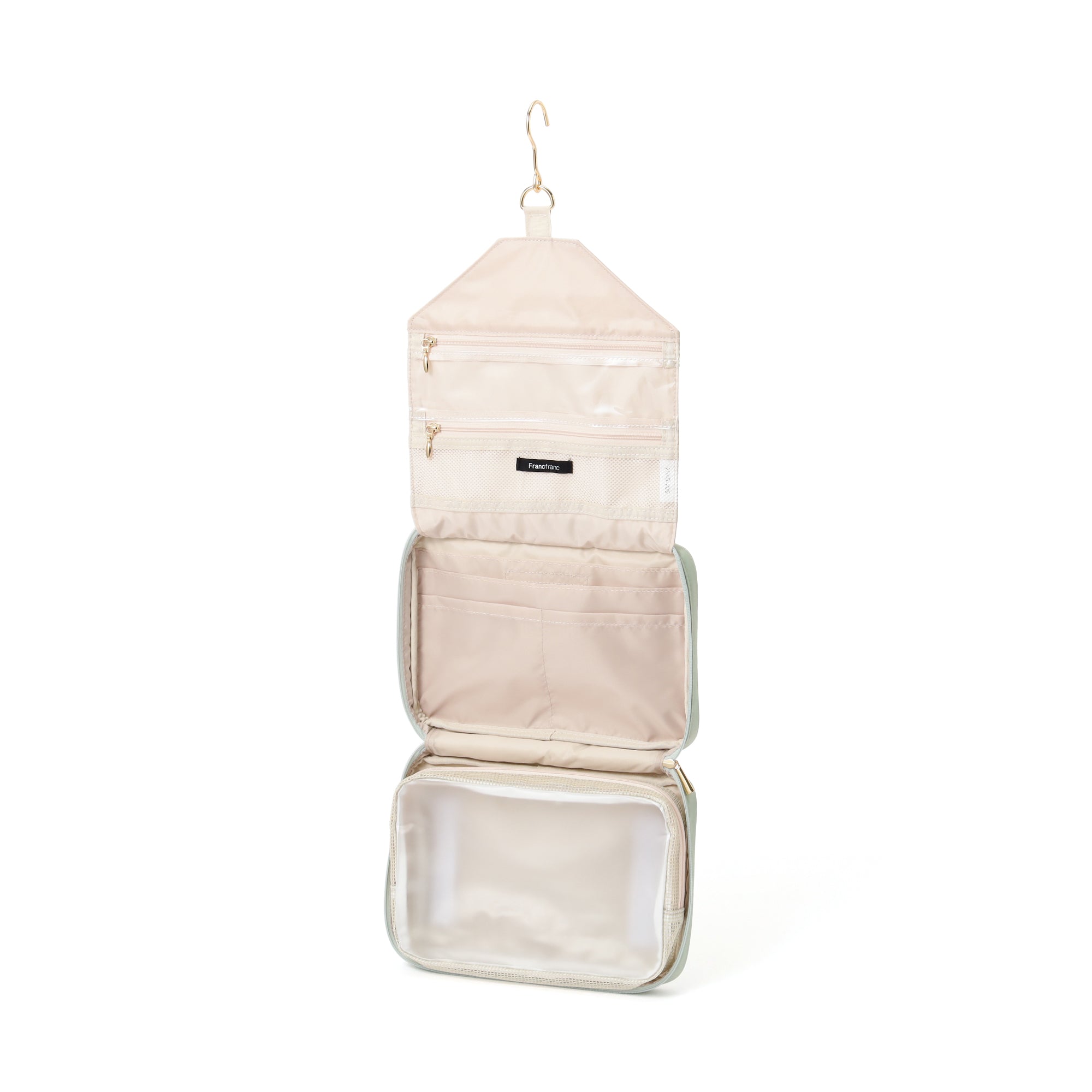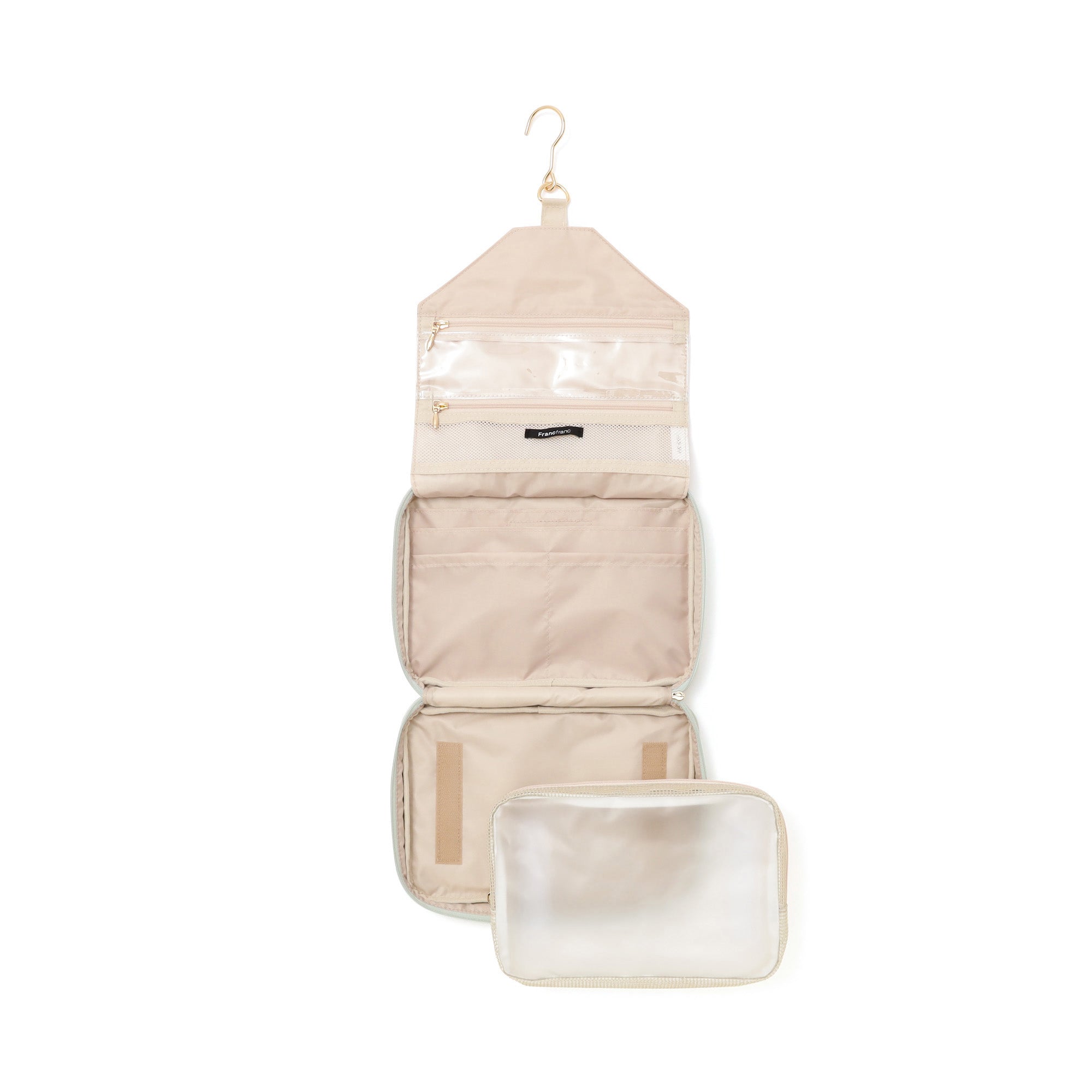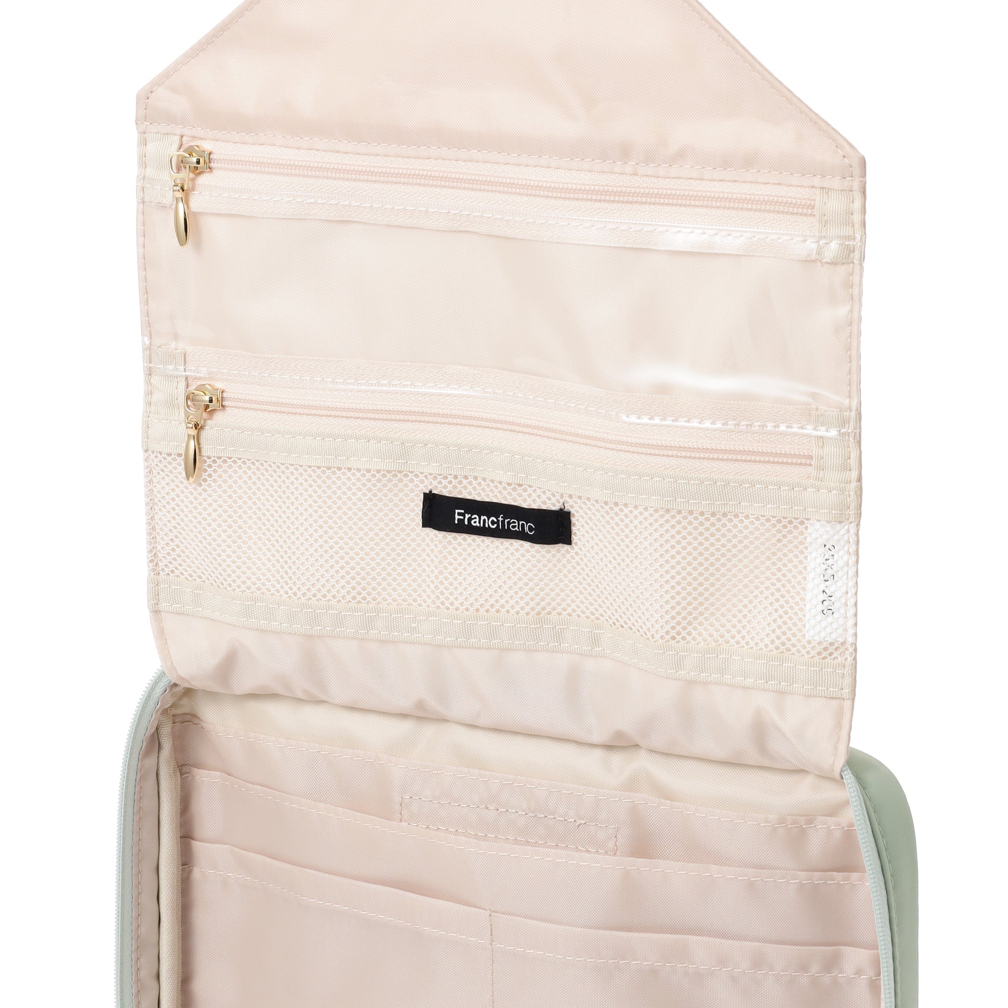 旅先のバスルームなどにハンガーフックで吊るして使用できる、便利なハンギングポーチです。メッシュのファスナーポケットがコスメや歯ブラシ、ヘアピンなどこまごましたアイテムの収納にぴったり。取り外し可能なクリアポーチはスパバッグにもおすすめです。おしゃれなバイカラーの配色が旅支度を楽しく盛り上げてくれます。