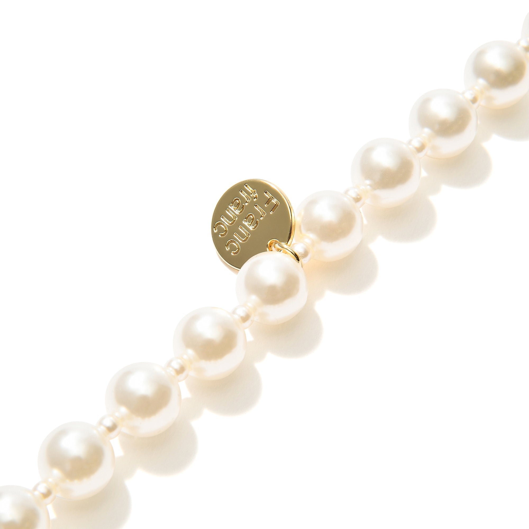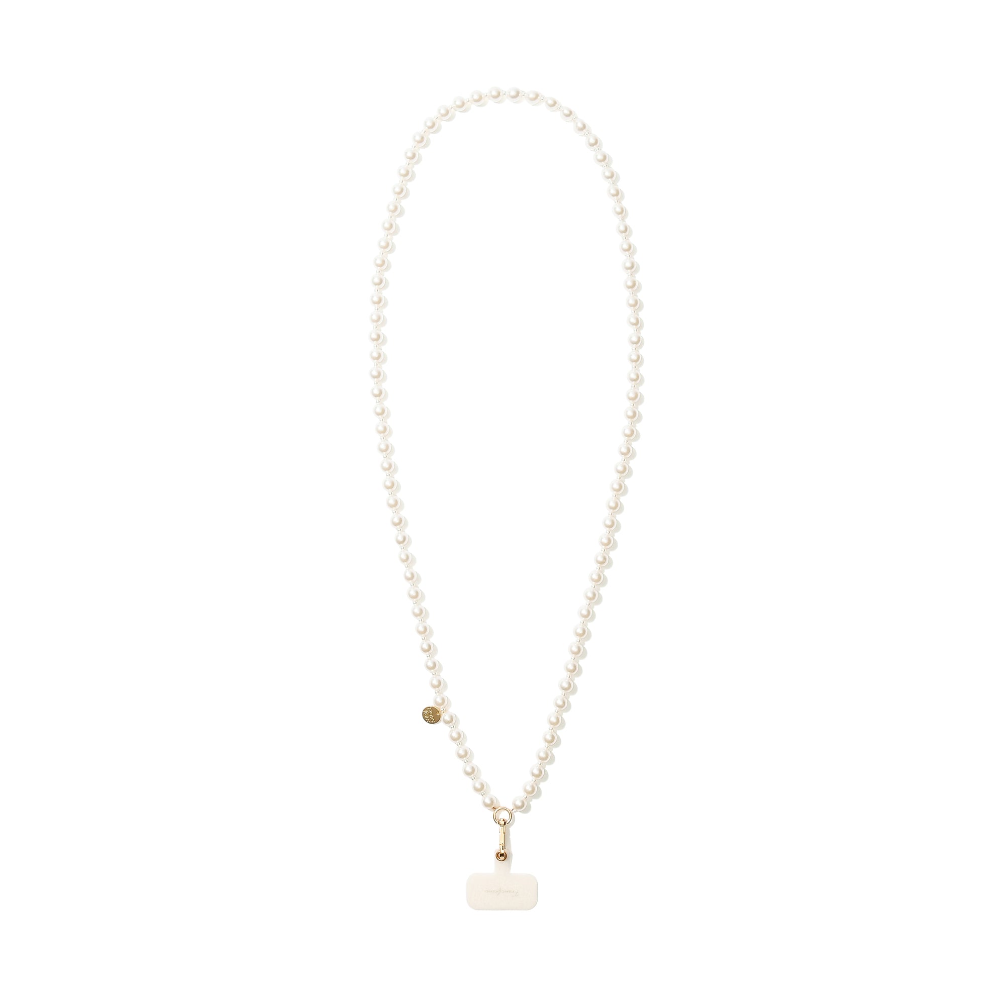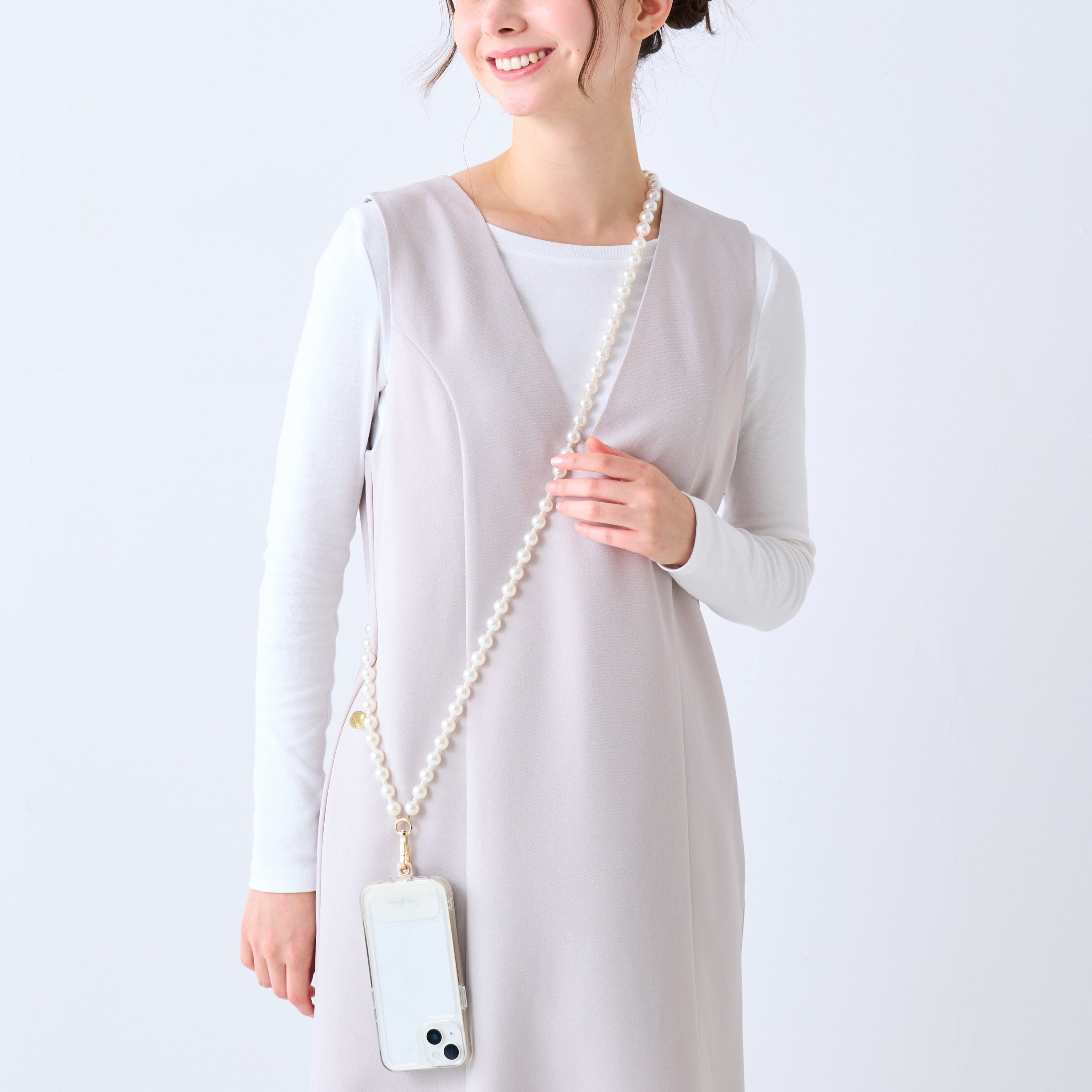 スマートフォンに付けられるネックストラップです。 お手持ちのスマホとスマホケースの間にシートを挟むことで取り付け可能。 大小のパールが連なった高級感のあるデザインがスイートなコーディネートにぴったりです。