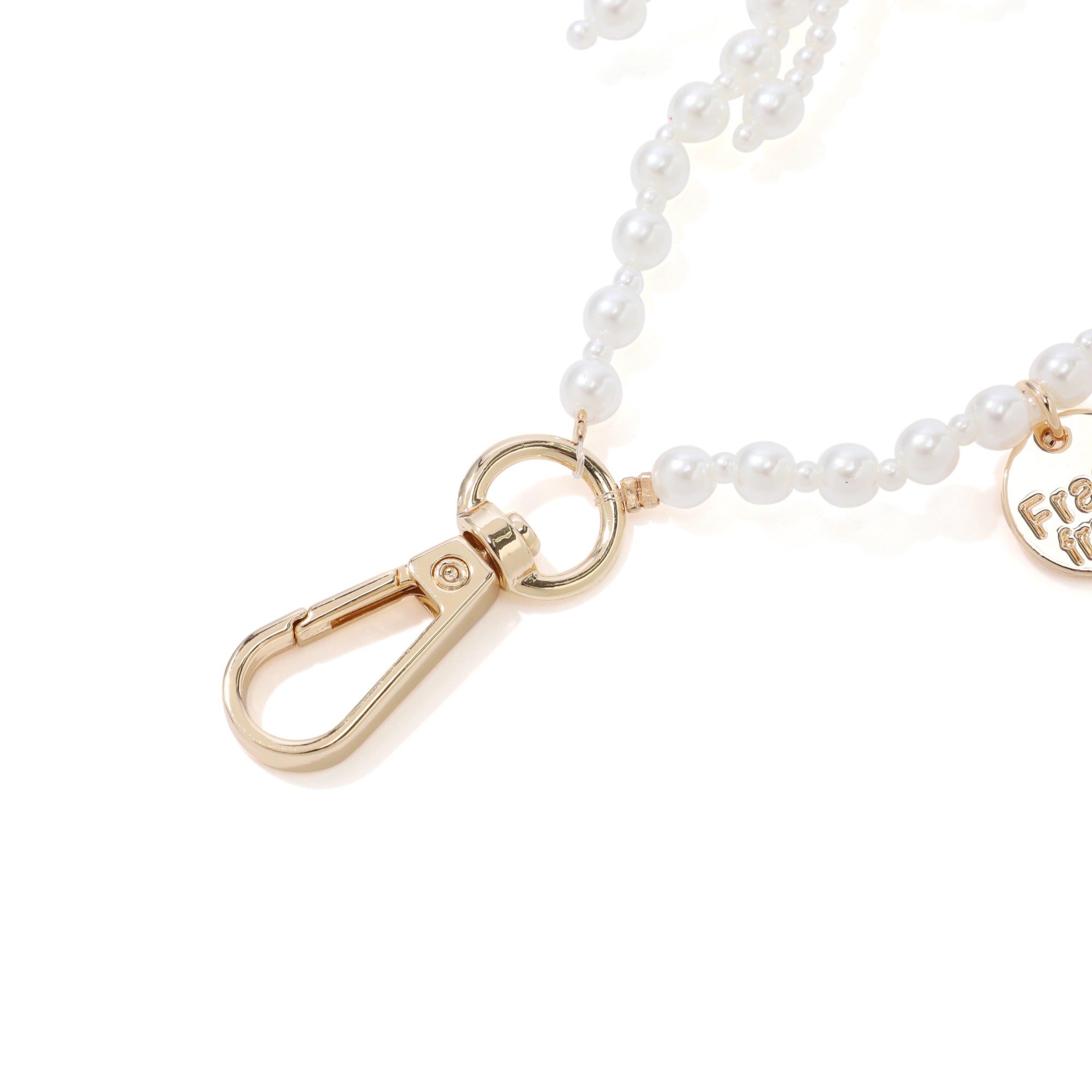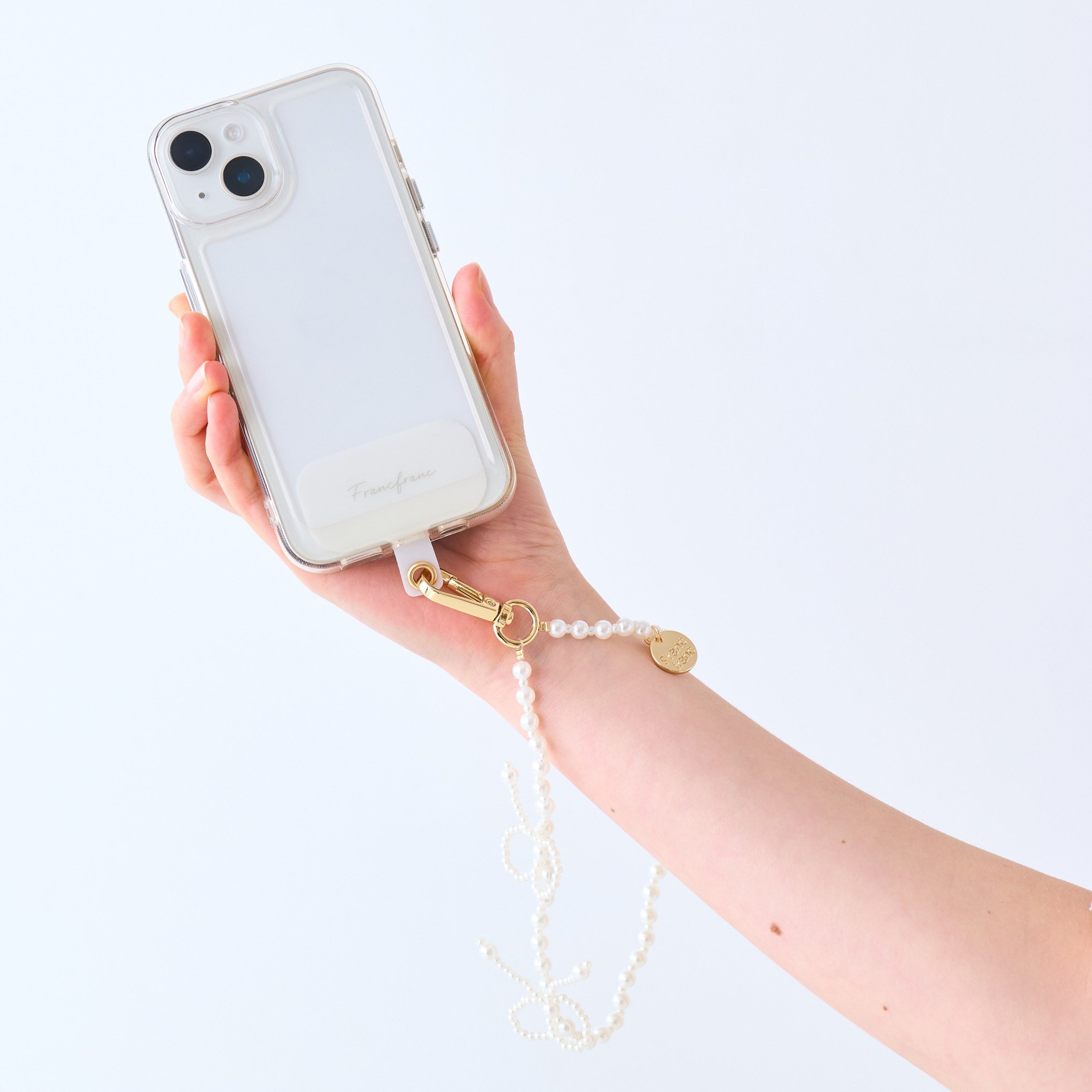 スマートフォンに付けられるハンドストラップです。 お手持ちのスマホとスマホケースの間にシートを挟むことで取り付け可能。 華奢で小さなパールに小さなリボン結びが2つ付いたデザインがスイートなコーディネートにぴったりです。