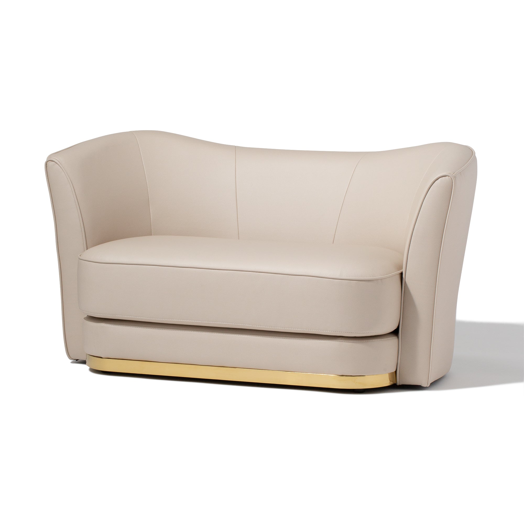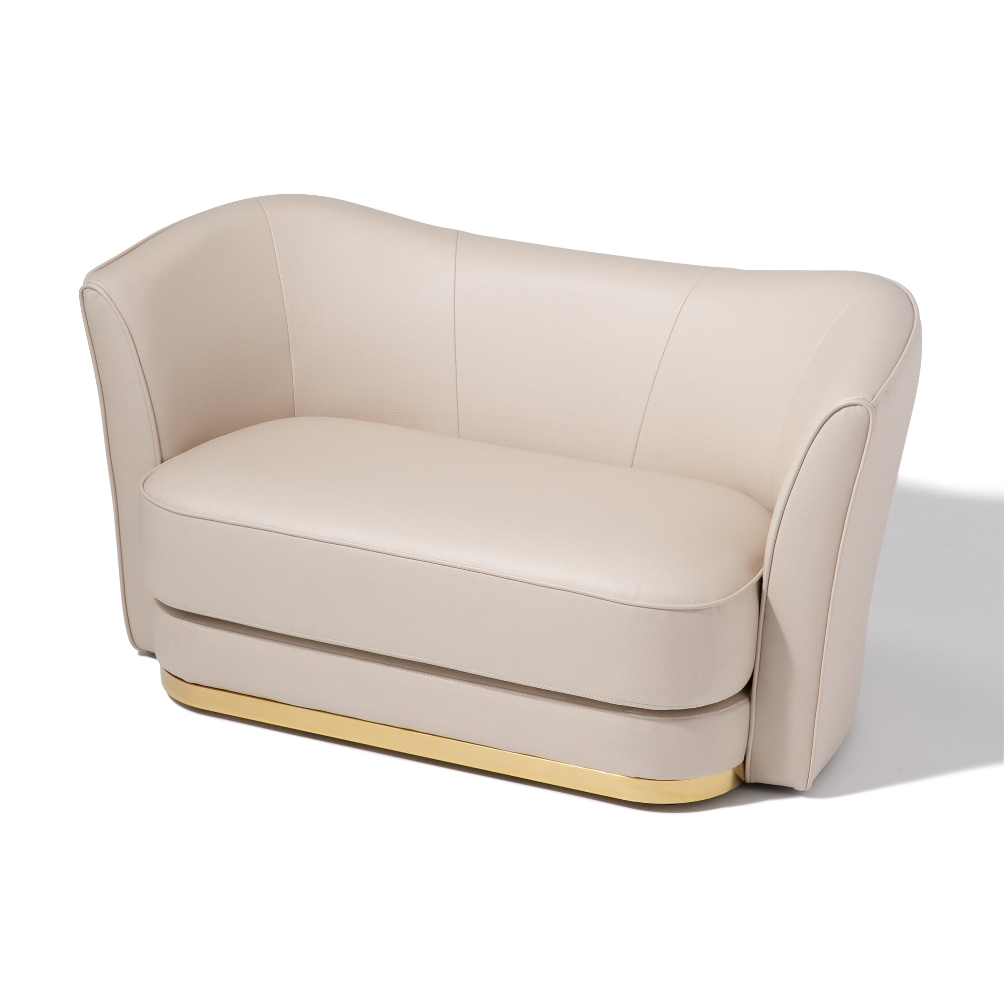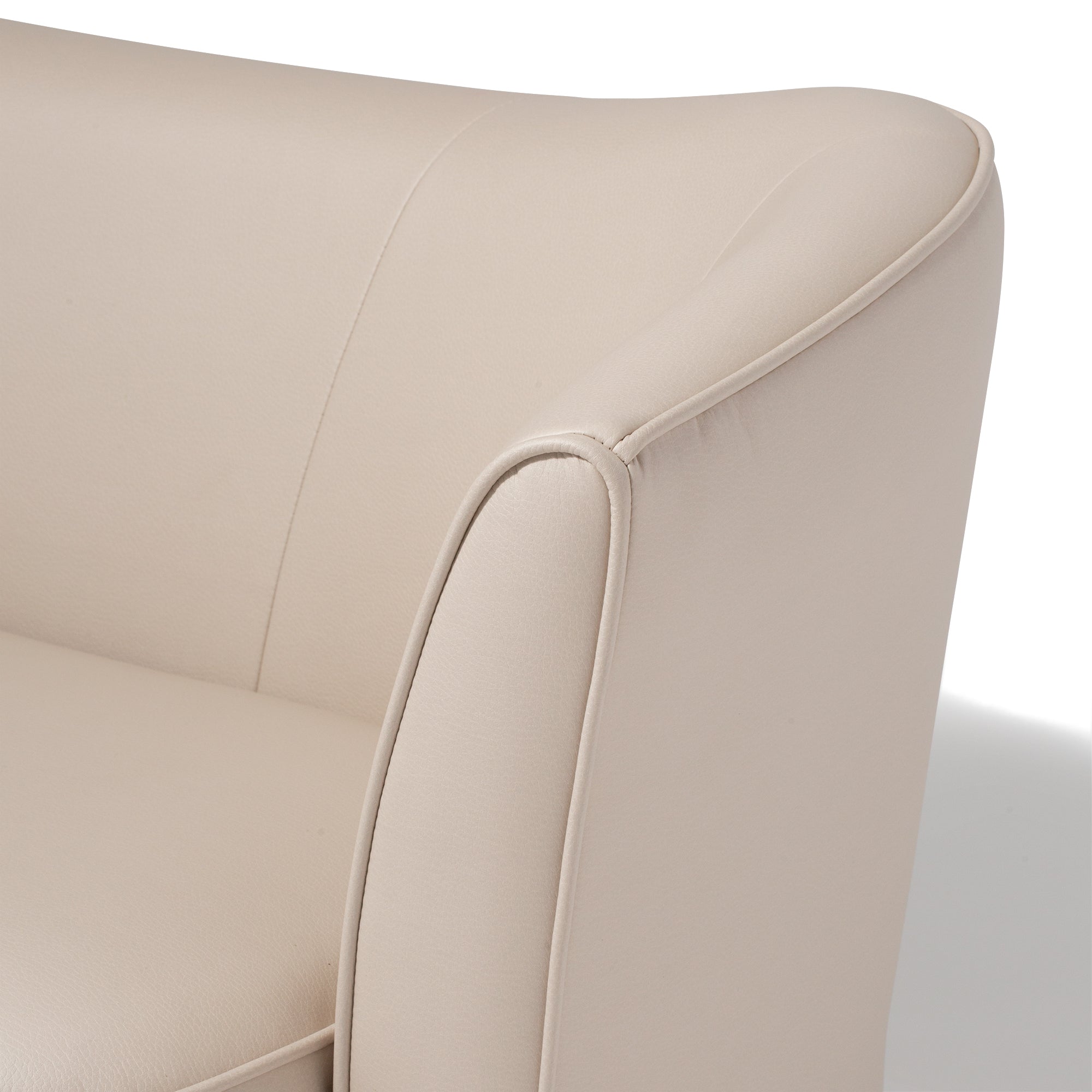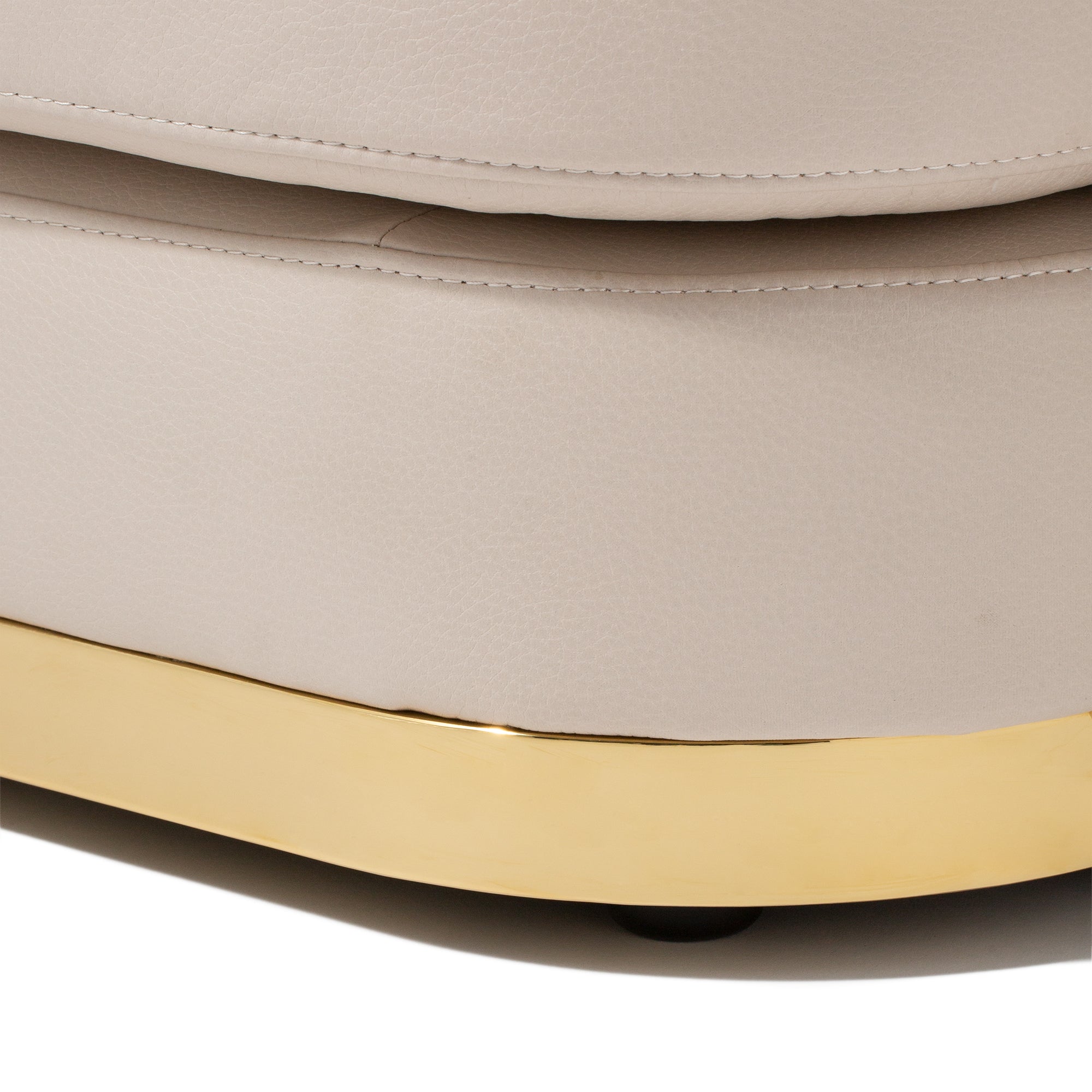 足飾りをつけたような足元のゴールドの台輪がアクセントの大人かわいいレザーソファです。足元のゴールドの台輪はかわいいだけじゃなく、生地への汚れも防いでくれます。肘かけと背もたれが一体となり、包み込まれるような曲線を描いた柔らかいデザイン。圧迫感もなく心地よく体にフィットして支えてくれます。座面はカバーを外してクリーニング可能。見た目も触り心地もレザーのようなお手入れがしやすい合成皮革のソファです。硬めなので長く座っていても疲れにくい仕様です。合わせやすいカラーなので、お気に入りの家具や小物とのコーディネートがしやすいところもおすすめです。