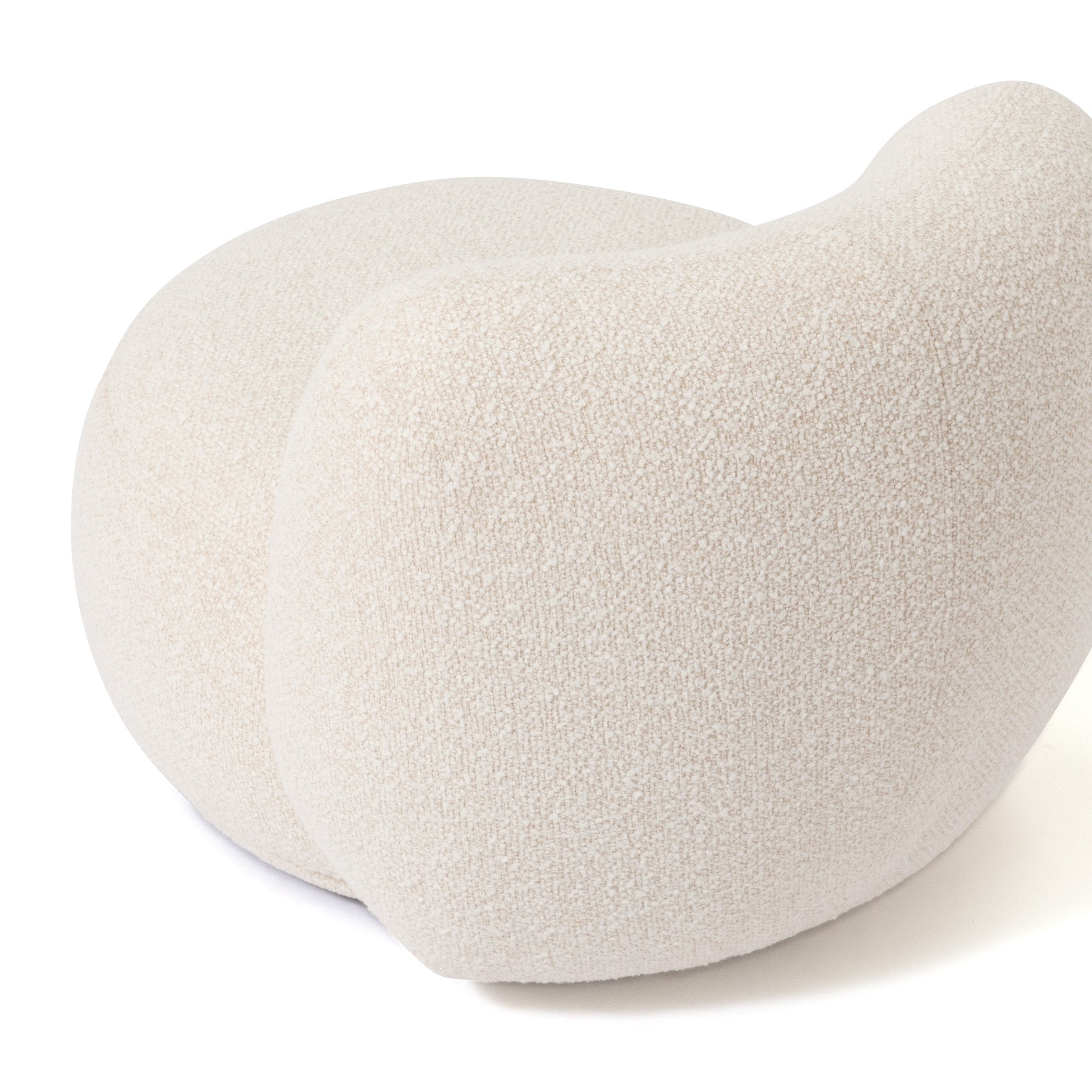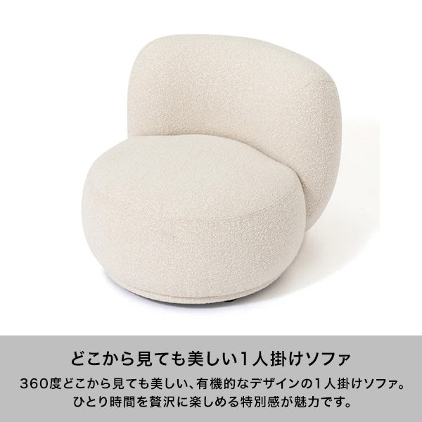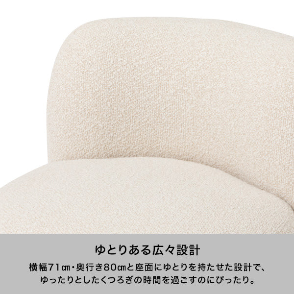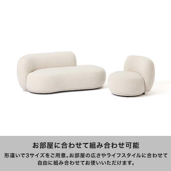 ぽってりと丸みを帯びたトレンドソファリビングの一角やベッドサイドなどに置きたい、有機的なデザインの1人掛けソファです。壁付けだけでなく好きな場所に自由にレイアウトできるのは360度どこから見ても美しいフォルムならでは。かわいらしい円形の座面は十分な奥行きがあり、ゆったりとしたくつろぎの時間を過ごすのにぴったりです。触れるたび、幸せいっぱいファブリックにはインテリアトレンドとして人気のブークレ素材を採用。もこもことした柔らかい肌触りと凹凸感のある印象的なテクスチャーが楽しめるソファに仕上げました。独特のふんわりとした質感に包まれるたび、日々の疲れがふわっとほどけるような心地よさを味わえます。ゆったりとした1人掛けサイズ横幅71cm・奥行き80cmのゆとりある設計で、リラックスタイムの定位置にぴったり。ロータイプでアームがないデザインなので圧迫感を感じさせません。選べる3サイズ展開で自由なレイアウト形違いで3サイズをご用意しました。お部屋の広さやライフスタイルに合わせて「2人掛け+1人掛け」「3人掛け+1人掛け」など自由に組み合わせてお使いいただけます。