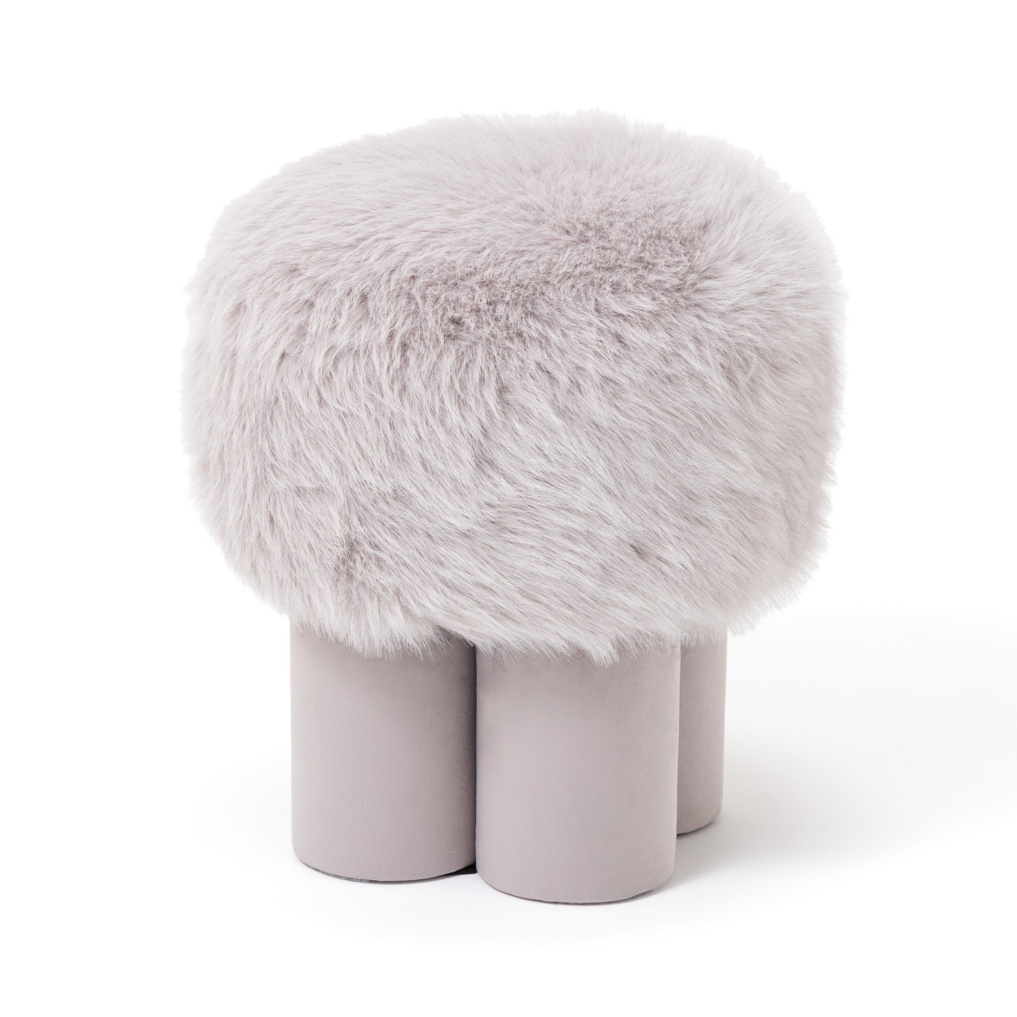 キラッと光るラメ入りの長毛ファーと、コロンとしたフォルムが特徴的なスツールです。脚までファブリックを使用した温かみのあるデザイン。底面はフェルト張りでがたつきを軽減しています。個性的でインテリアコーディネートのアクセントになります。長毛でもふもふした様子から「モフィ」と名付けました。