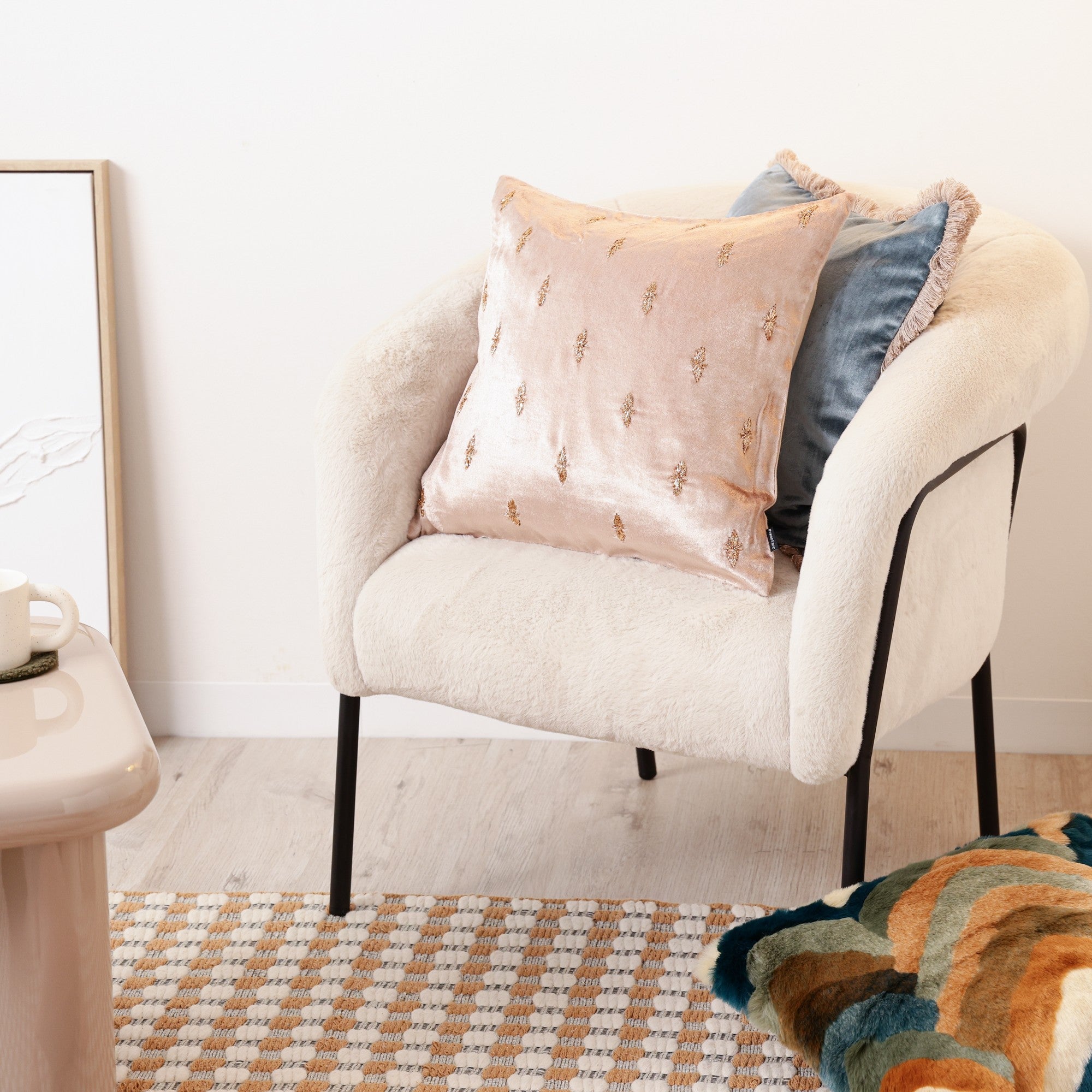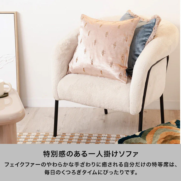 肌触りのよいフェイクファー生地の一人掛けソファです。ボリューム感のある洗練されたデザインで一脚でも十分に存在感のあるアイテム。触れた瞬間柔らかく心地よい肌触り。座面の奥行きを広くとったゆったりとくつろげる設計で、座面にはポケットコイルを搭載しているので体圧分散で快適な座り心地です。ホテルライクなコーディネートにおすすめ。ベッド横に置くなどプラス1アイテムとして重宝します。フランス語でふわふわのファーの意味を持つ「Peluche」と、夢のような世界観を表現する「Fantasia」を組み合わせ、「Pelucia(ペルシア)」と名付けました。