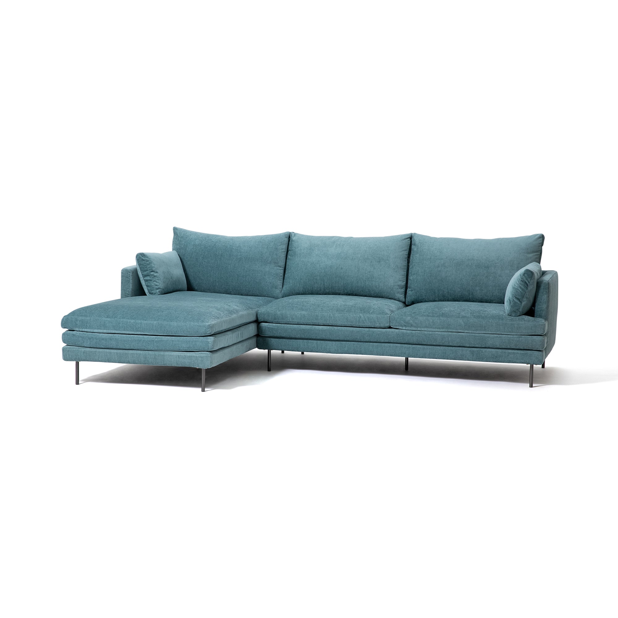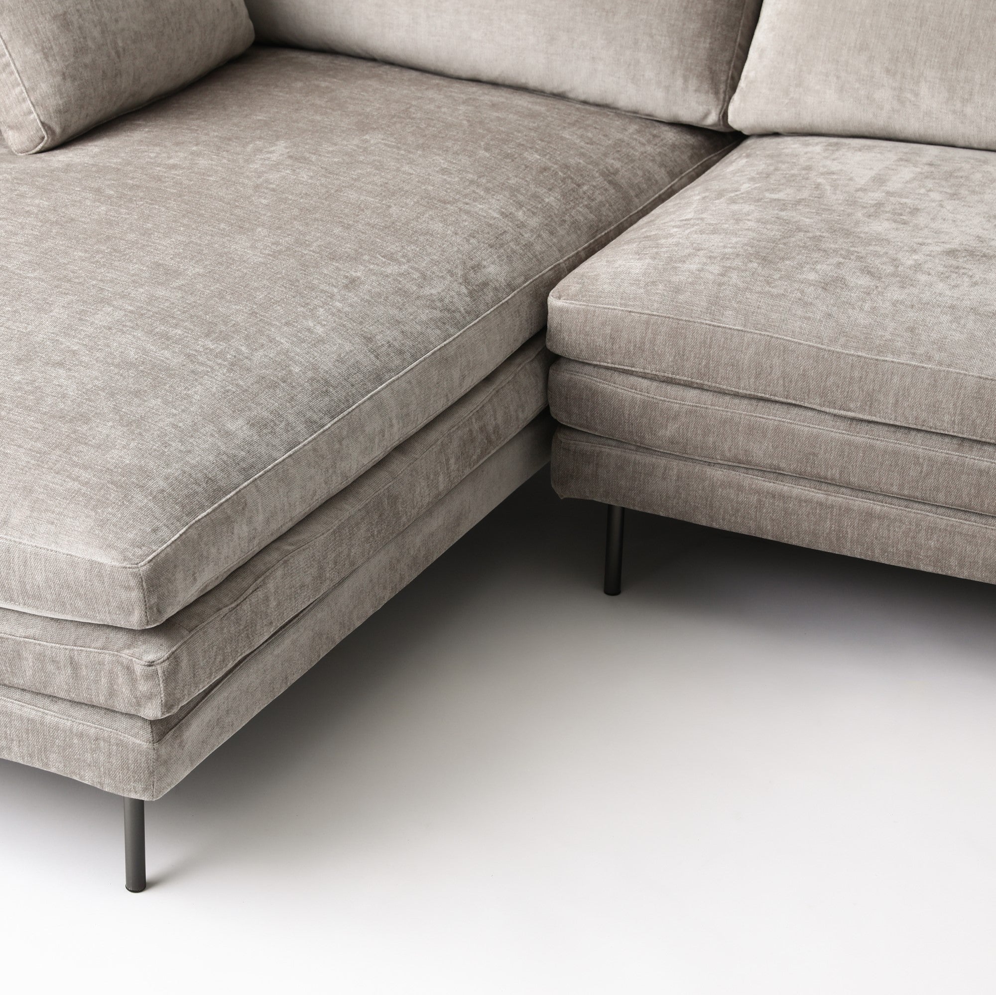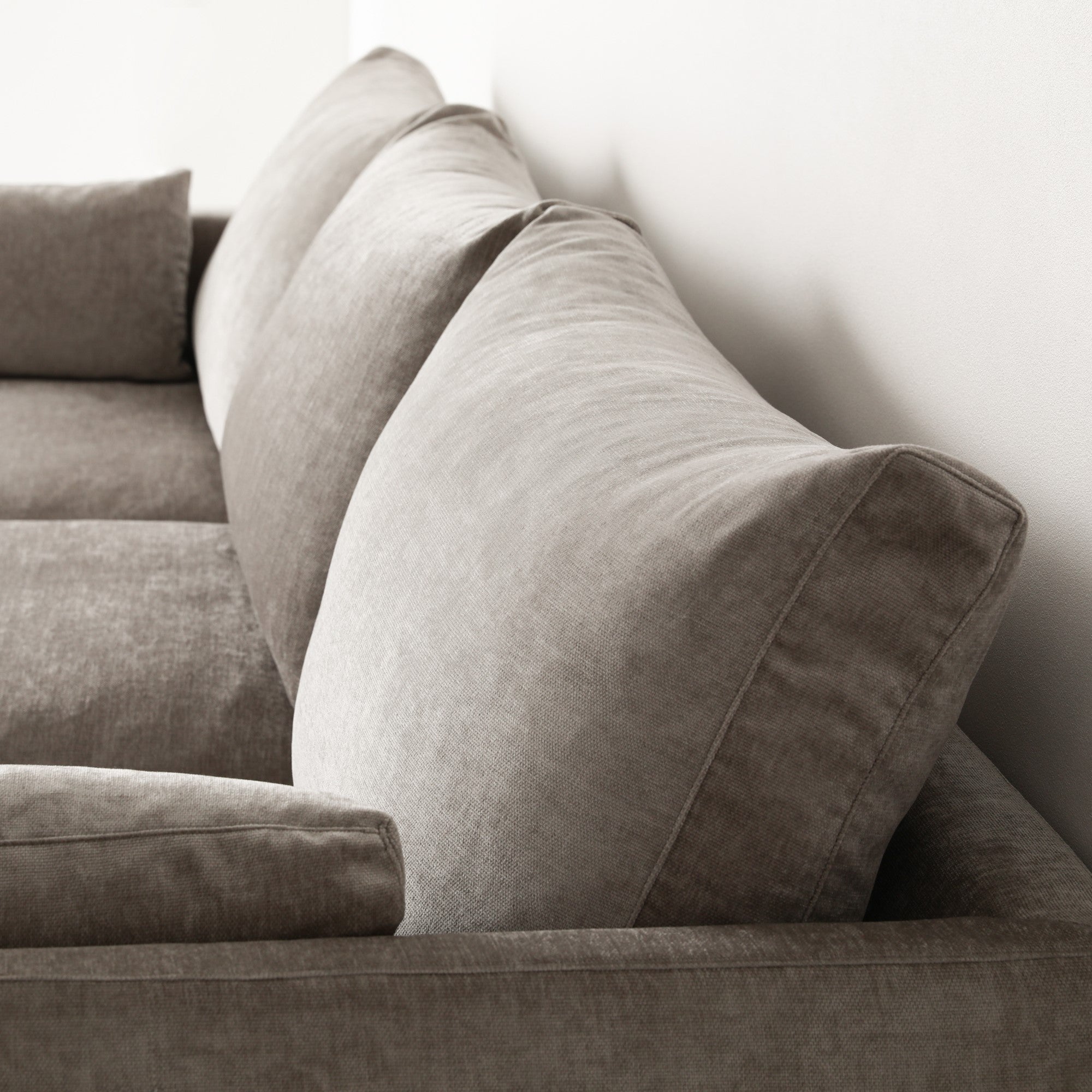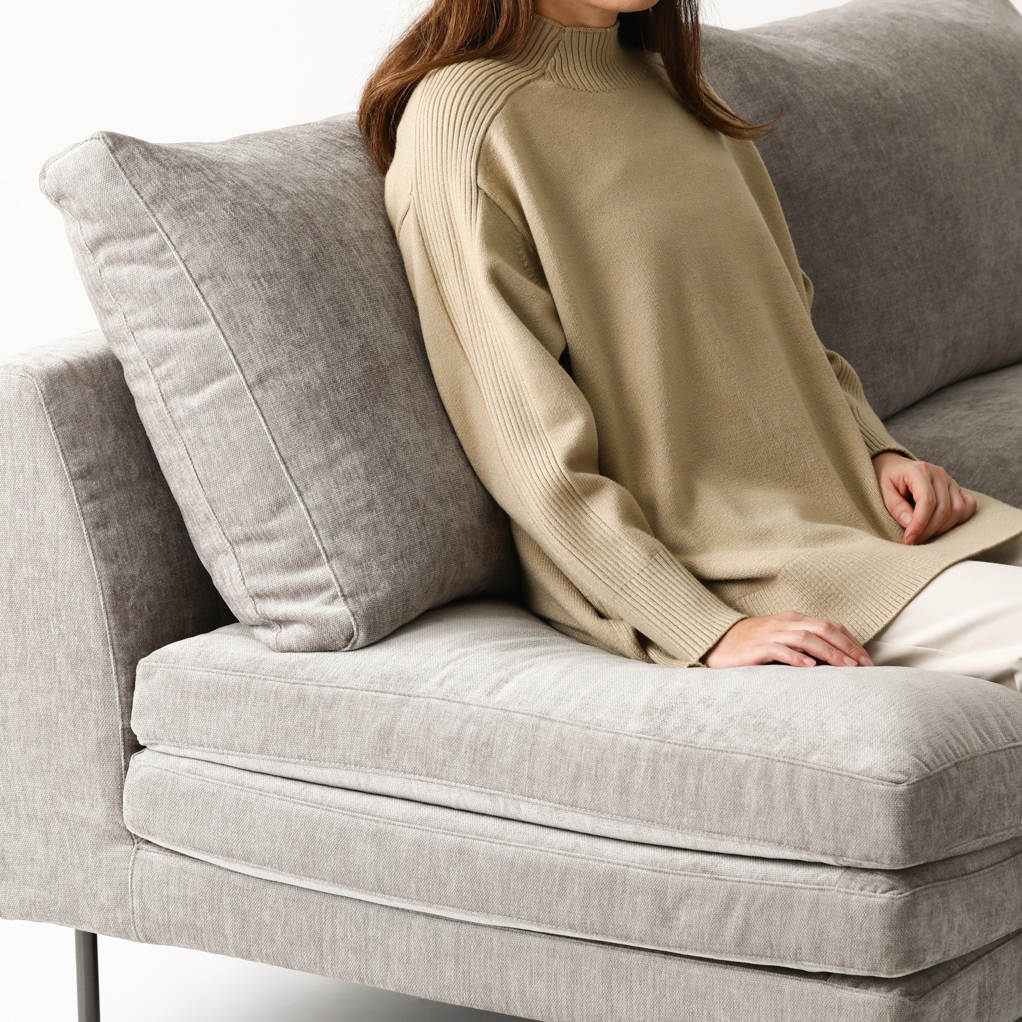 ゆったりサイズのエレガントなソファです。光沢のある起毛生地使いと色合いは圧迫感を感じさせず、広い空間を演出してくれます。背・座クッションにはフェザーを贅沢に使用し、座り心地にもこだわりました。エレガントな大型ソファソファ・カウチを合わせて幅2690mmの大型ソファですが、アームやフレーム・脚部を細身に作り薄めの座クッションを2段重ねるなどディテールにこだわることで、圧迫感を感じさせない軽快な印象に仕上げています。こだわりのクッション座クッションは、下層に硬めのウレタン、上層にフェザーとチップウレタンを9:1の割合で配合した素材を使用しており、硬すぎず柔らかすぎない絶妙な座り心地を実現しました。同様に、背クッションにもフェザーとチップウレタンを9:1の割合で配合した素材を使用しており、快適な座り心地をキープしながら経年使用によるへたりを軽減させます。スマートな脚部丈夫なステンレス素材を使用しており、細身で軽快な印象に仕上げました。表面にはチタンメッキを施し、光沢のあるグレーの高級感あふれる脚線美が楽しめます。本体より少し奥まった位置に脚部を取り付けることで、座った時に足がぶつかりにくいよう工夫しています。