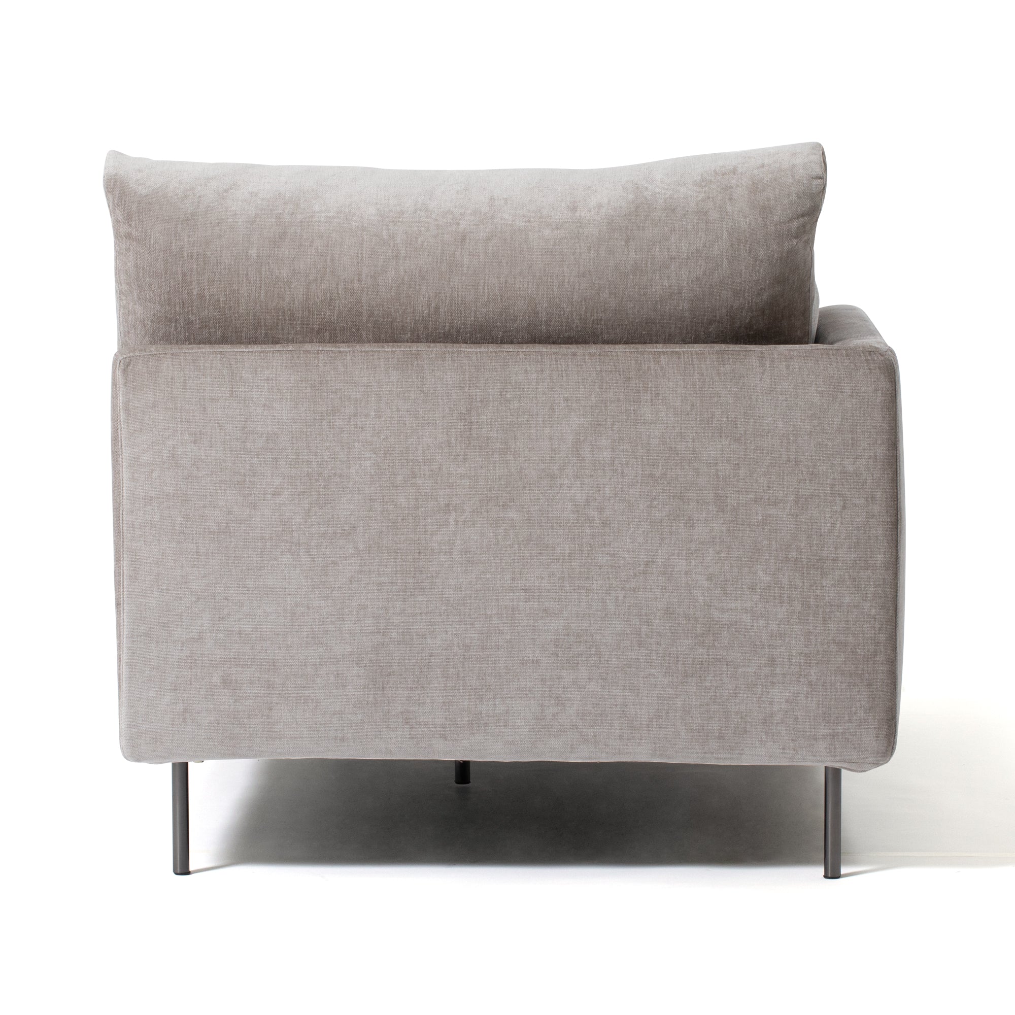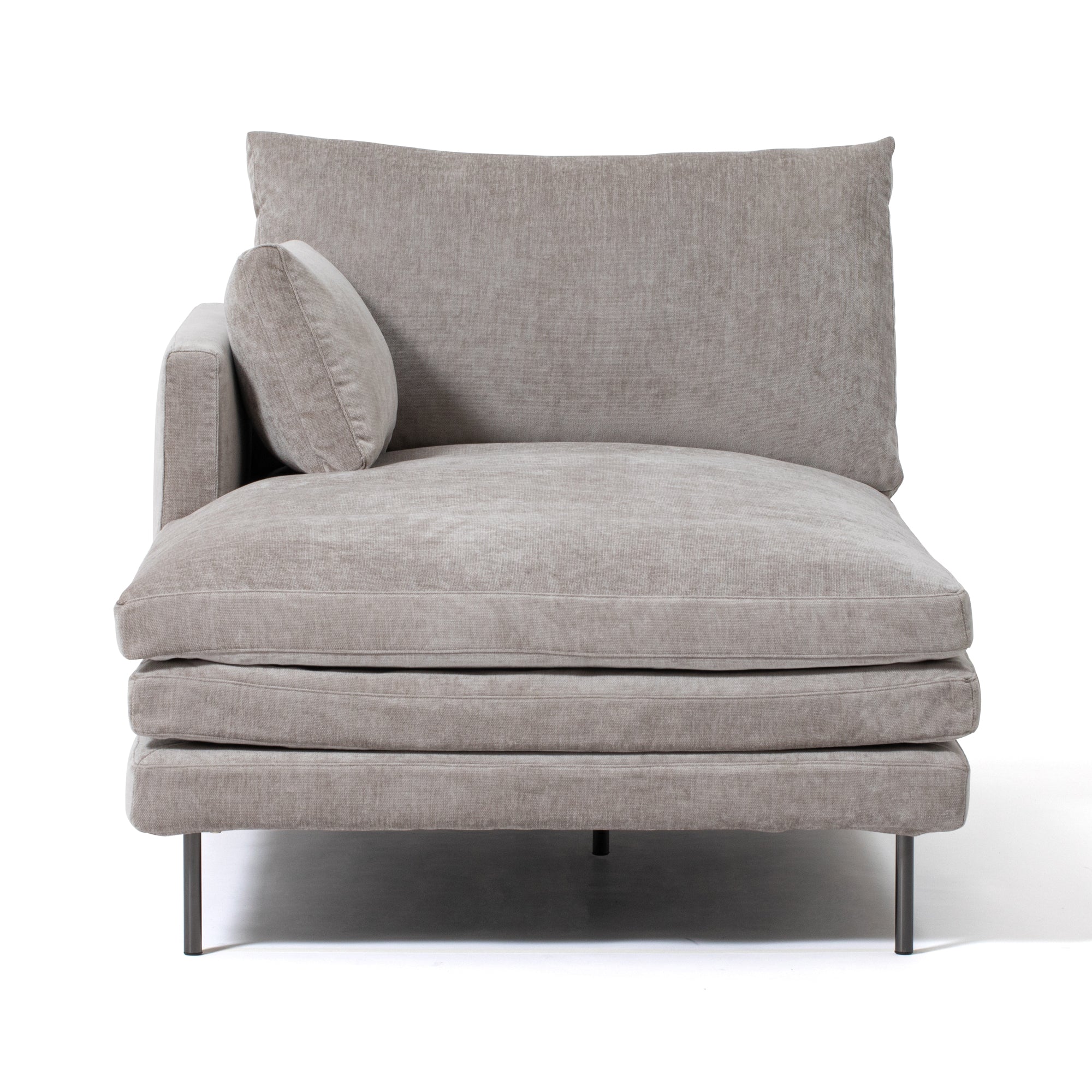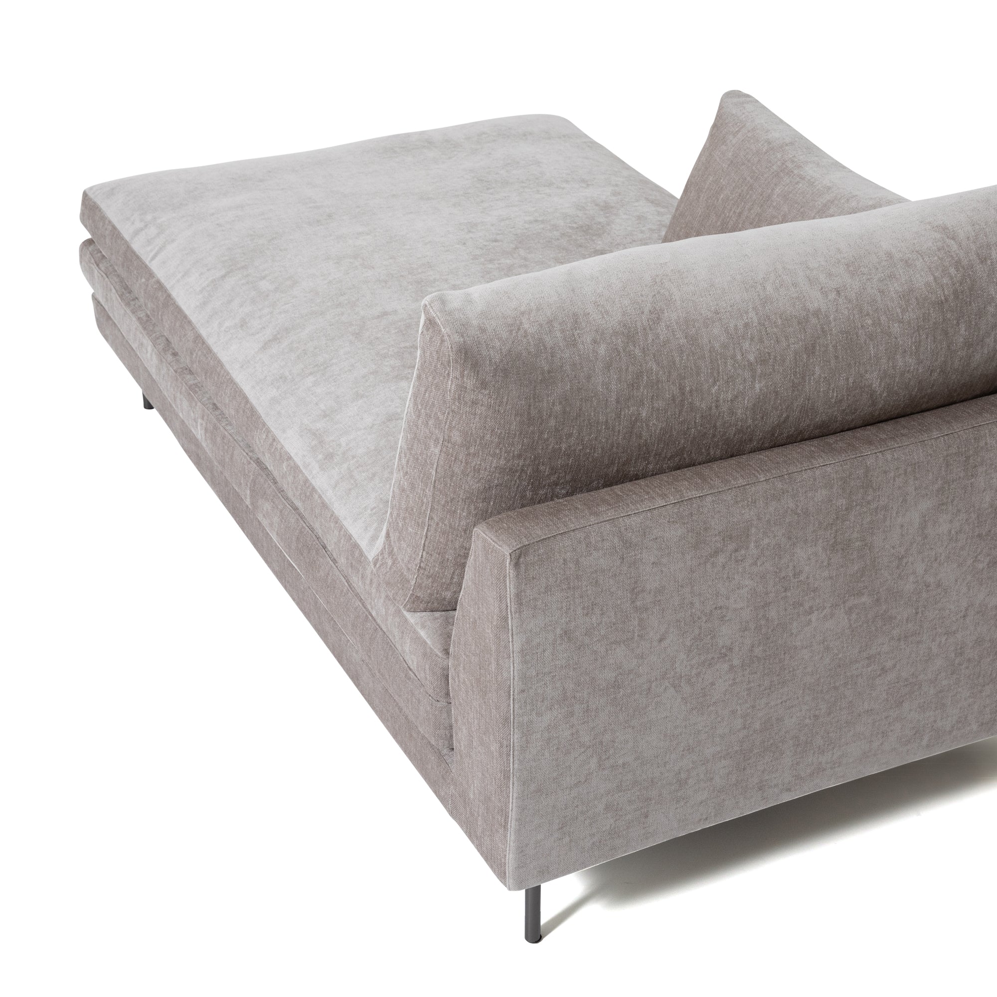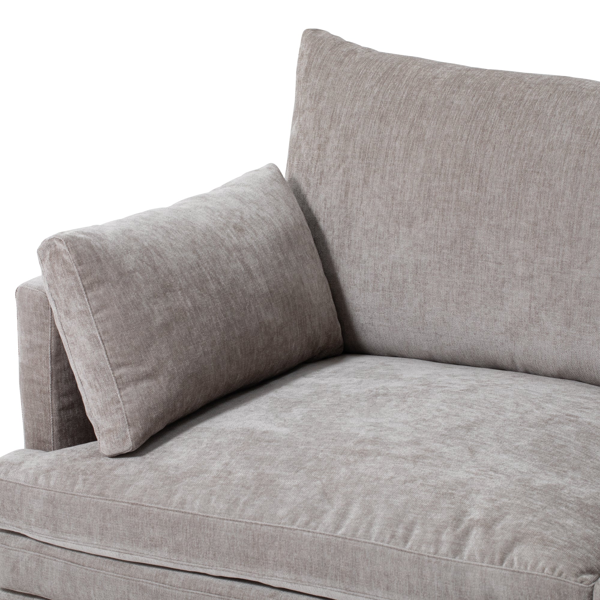 ゆったりサイズのエレガントなソファです。光沢のある起毛生地使いと色合いは圧迫感を感じさせず、広い空間を演出してくれます。背・座クッションにはフェザーを贅沢に使用し、座り心地にもこだわりました。エレガントな大型ソファソファ・カウチを合わせて幅2690mmの大型ソファですが、アームやフレーム・脚部を細身に作り薄めの座クッションを2段重ねるなどディテールにこだわることで、圧迫感を感じさせない軽快な印象に仕上げています。こだわりのクッション座クッションは、下層に硬めのウレタン、上層にフェザーとチップウレタンを9:1の割合で配合した素材を使用しており、硬すぎず柔らかすぎない絶妙な座り心地を実現しました。同様に、背クッションにもフェザーとチップウレタンを9:1の割合で配合した素材を使用しており、快適な座り心地をキープしながら経年使用によるへたりを軽減させます。スマートな脚部丈夫なステンレス素材を使用しており、細身で軽快な印象に仕上げました。表面にはチタンメッキを施し、光沢のあるグレーの高級感あふれる脚線美が楽しめます。本体より少し奥まった位置に脚部を取り付けることで、座った時に足がぶつかりにくいよう工夫しています。
