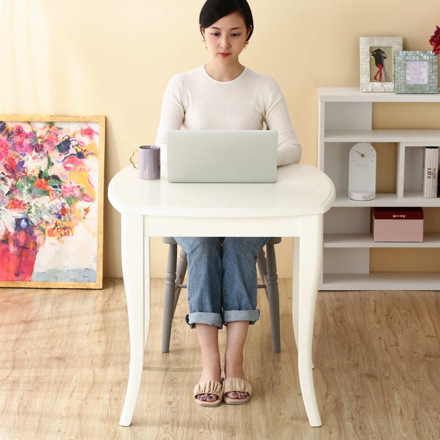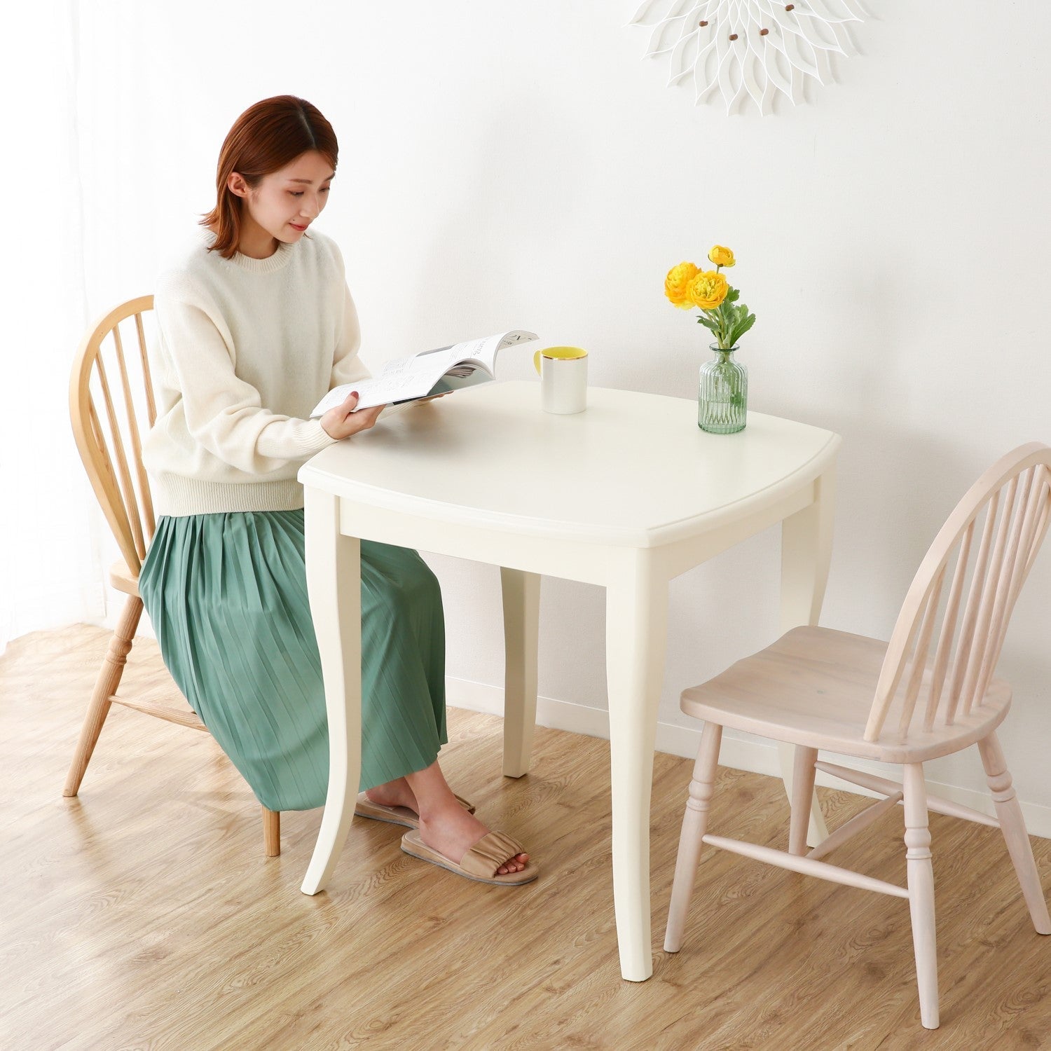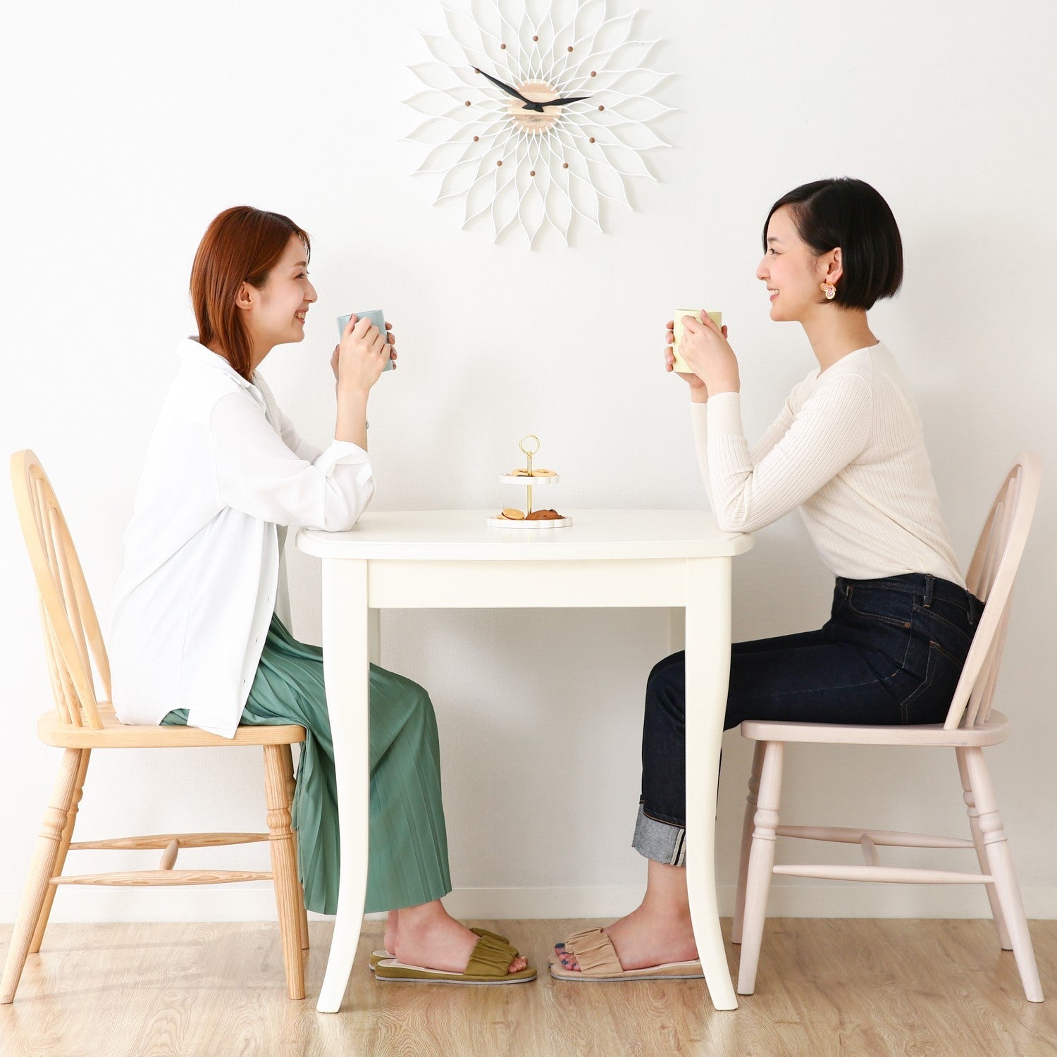 一人暮らし女性にぴったりなフェミニンデザインのダイニングテーブルです。コンパクトサイズなので、1Rや1DKなど1人暮らしのお部屋に丁度良いサイズ。繊細な雰囲気を持たせる、細くしなやかな曲線の脚部は、猫脚ラインで女性らしくクラシカルなデザイン。天板表面の最終仕上げはアクリル樹脂塗装ですが、下地にUV塗装を施すことにより、塗膜の強度が非常に高く、耐摩耗性、耐薬品性、耐溶剤性、耐熱性などにとても優れていて、汚れも拭き取りやすいのが特徴です。
