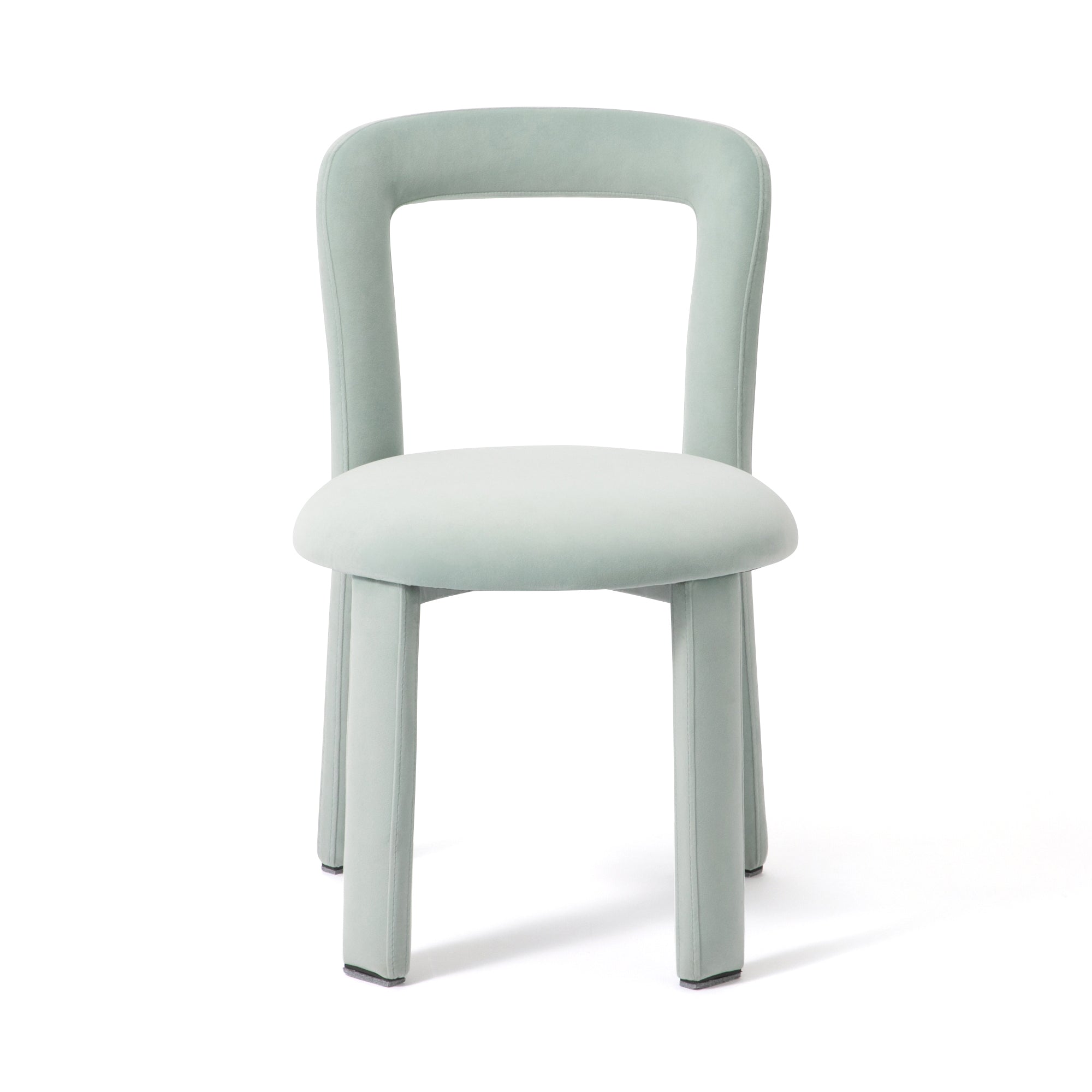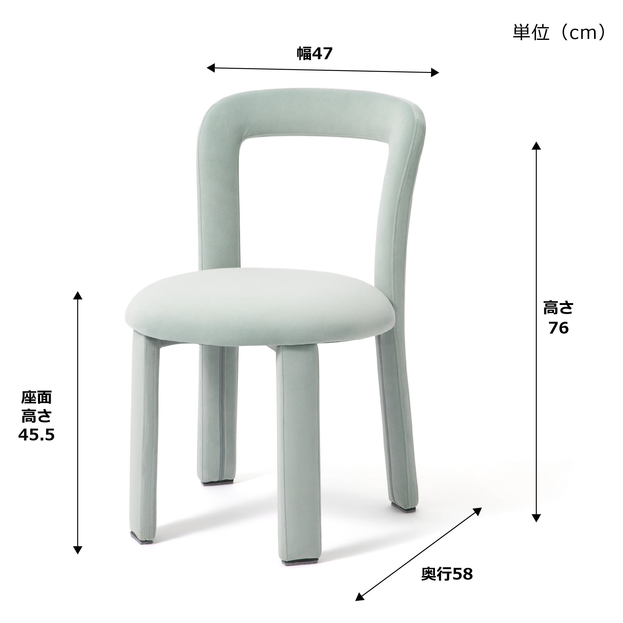 トレンド感のある個性的なデザインが特徴のチェアです。目を引くポップなデザインが印象的な雰囲気を与え、お部屋のインテリアのアクセントにもなります。ダイニングシーンにはもちろん、ベッドルームにもおすすめ。なめらかな起毛生地を採用し、ソフトな肌触りとなっています。座り心地の良さから、お気に入りのチェアでくつろいでもらいたい思いを込めて、フランス語で「ルポ/REPOS=くつろぎ、気楽な」と名付けました。