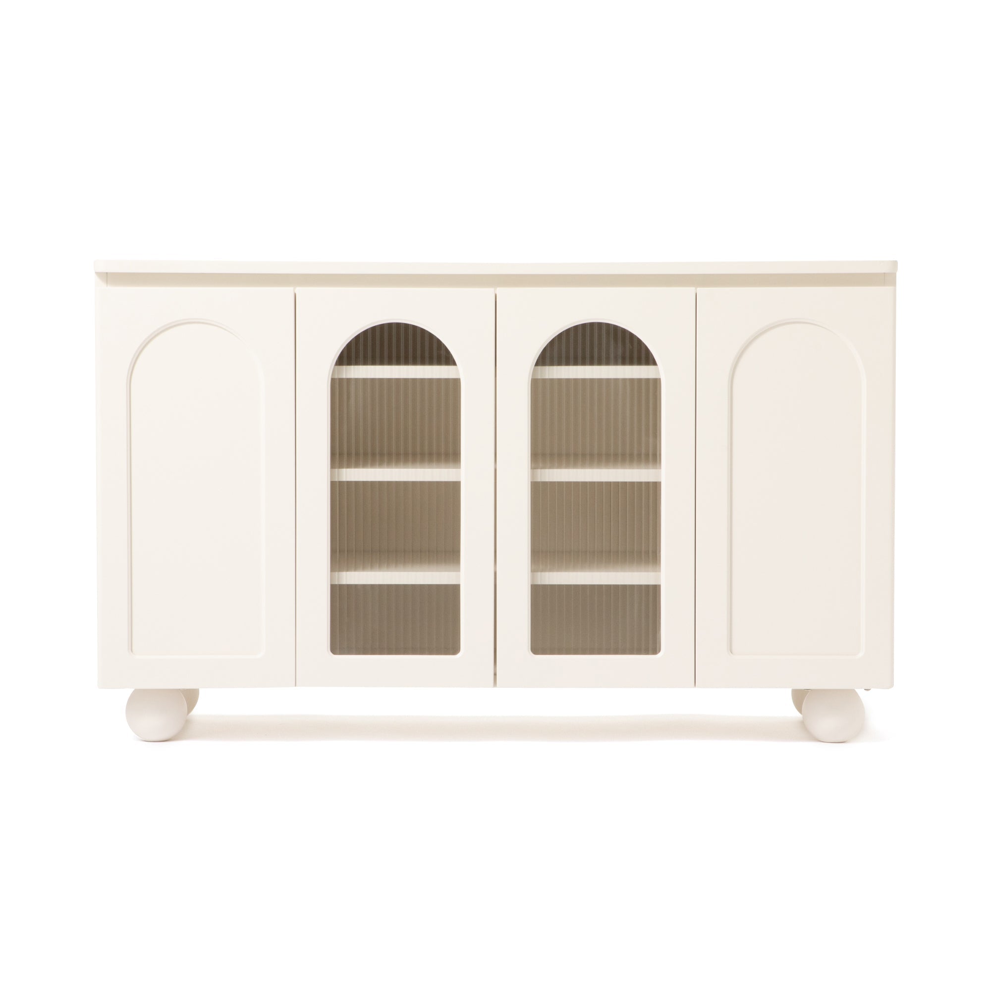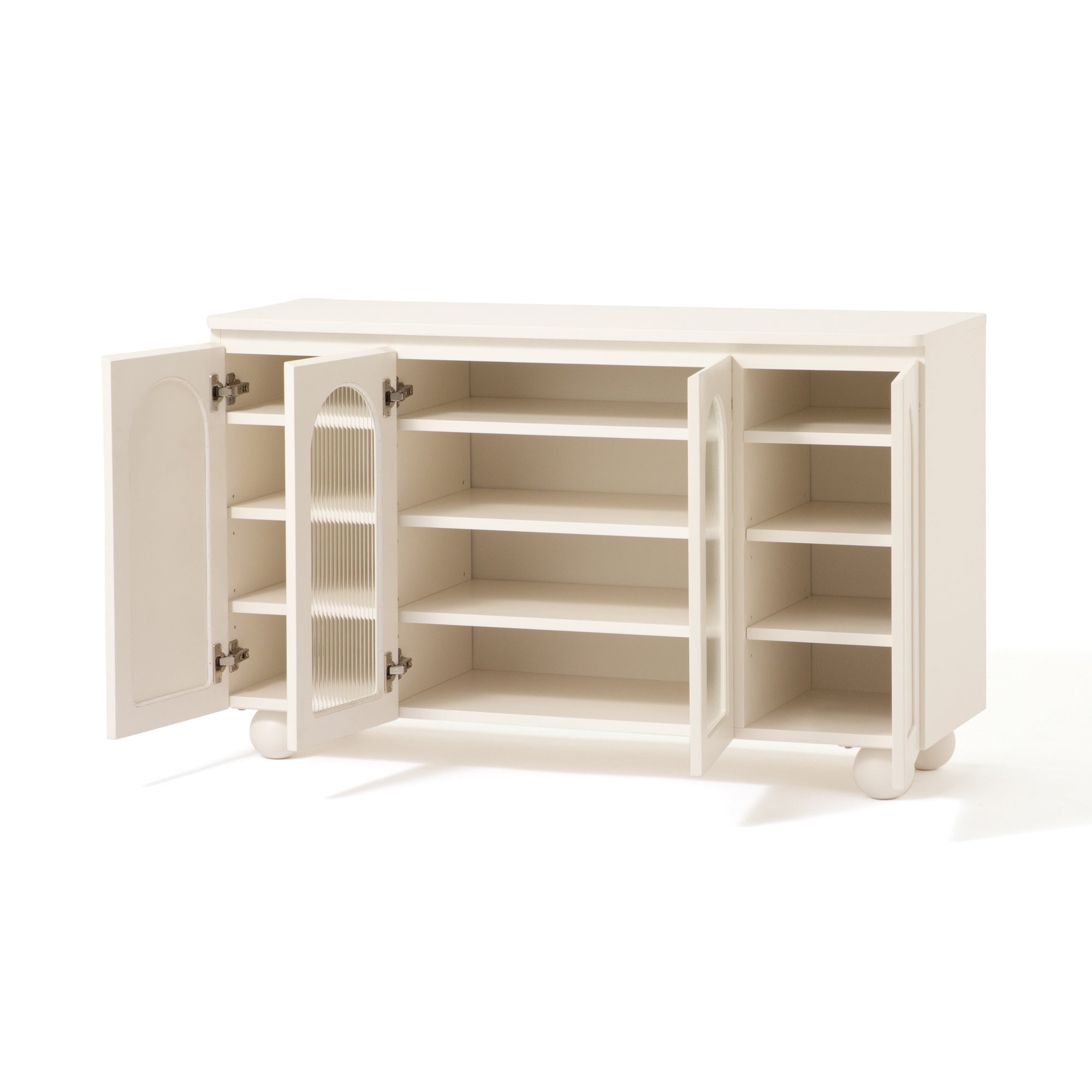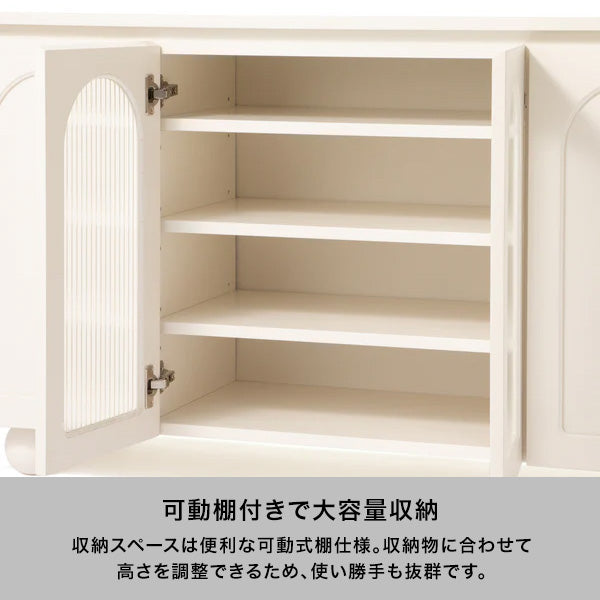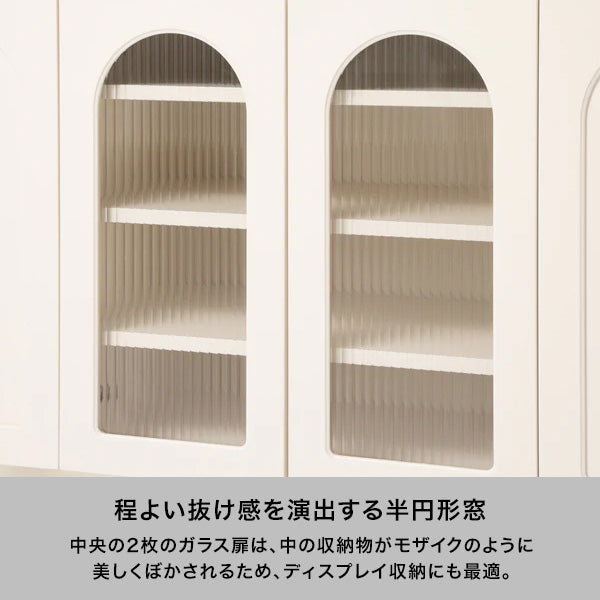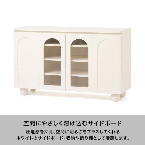 印象的な扉のデザインと角にアールを利かせたデザインが上品でトレンド感のあるサイドボードです。中央の2つのモールガラスの扉は、中の収納物がモザイクが掛かったように見えることを活用したディスプレイ収納もおすすめです。トレンドの球体脚は、個性的でありながらも、重みのある箱ものを柔らかい印象にしてくれます。丸みやアーチ型が特徴のデザイン形状から、英語で「パルム(PALM)」=手のひら、と名付けました。