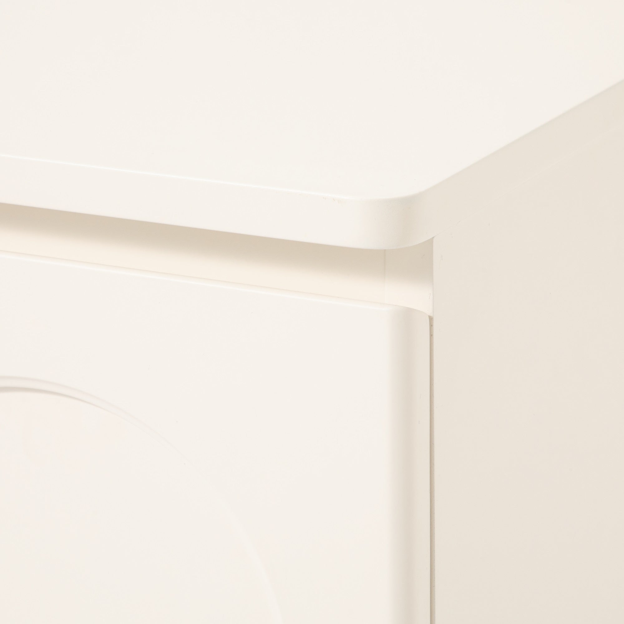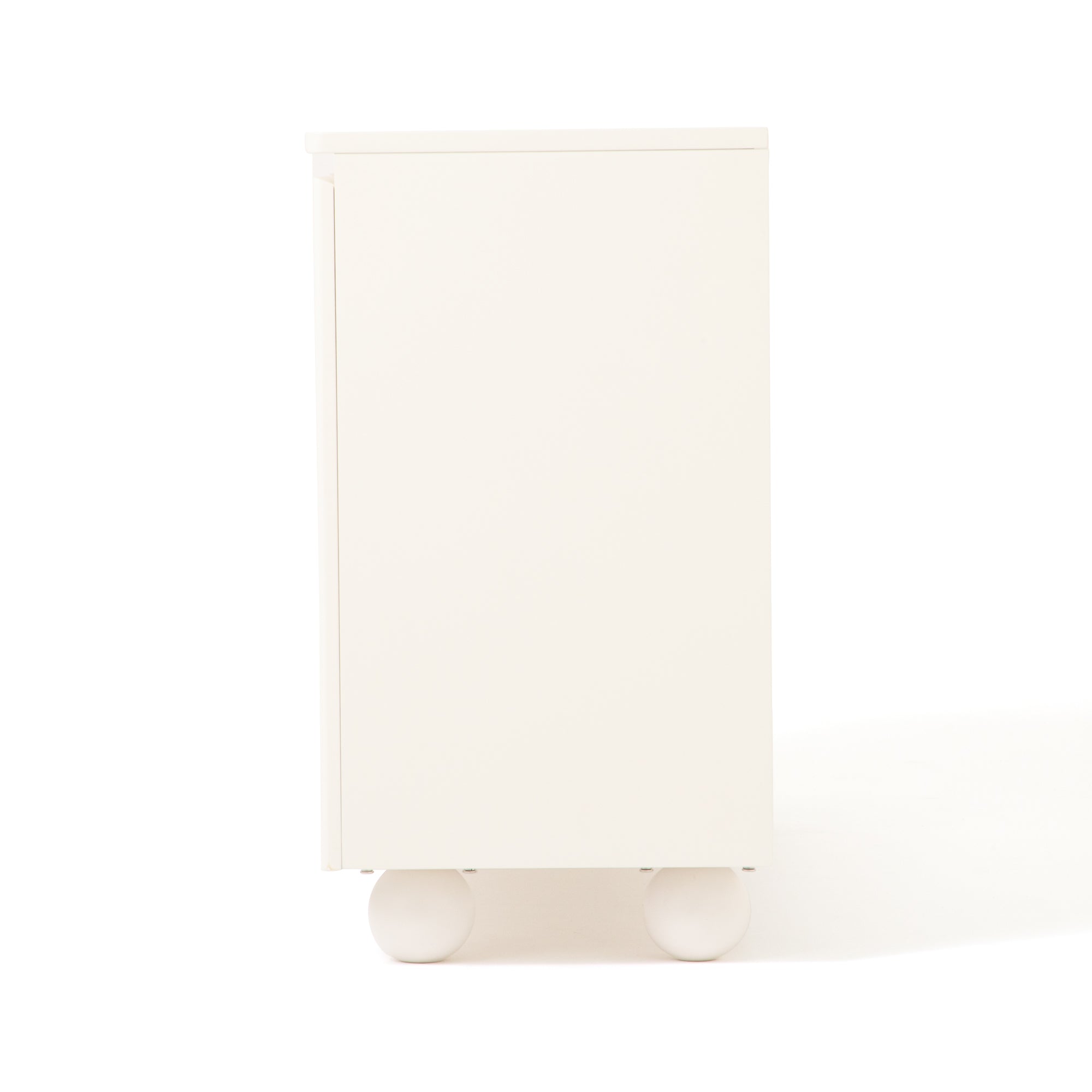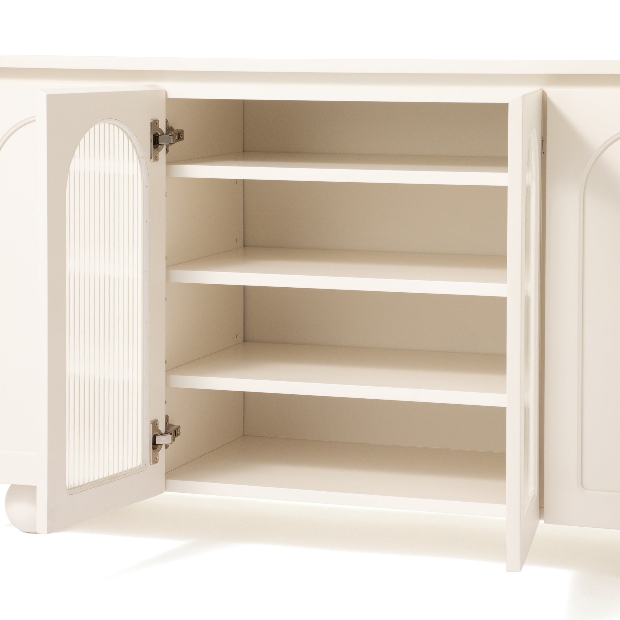 印象的な扉のデザインと角にアールを利かせたデザインが上品でトレンド感のあるサイドボードです。中央の2つのモールガラスの扉は、中の収納物がモザイクが掛かったように見えることを活用したディスプレイ収納もおすすめです。トレンドの球体脚は、個性的でありながらも、重みのある箱ものを柔らかい印象にしてくれます。丸みやアーチ型が特徴のデザイン形状から、英語で「パルム(PALM)」=手のひら、と名付けました。