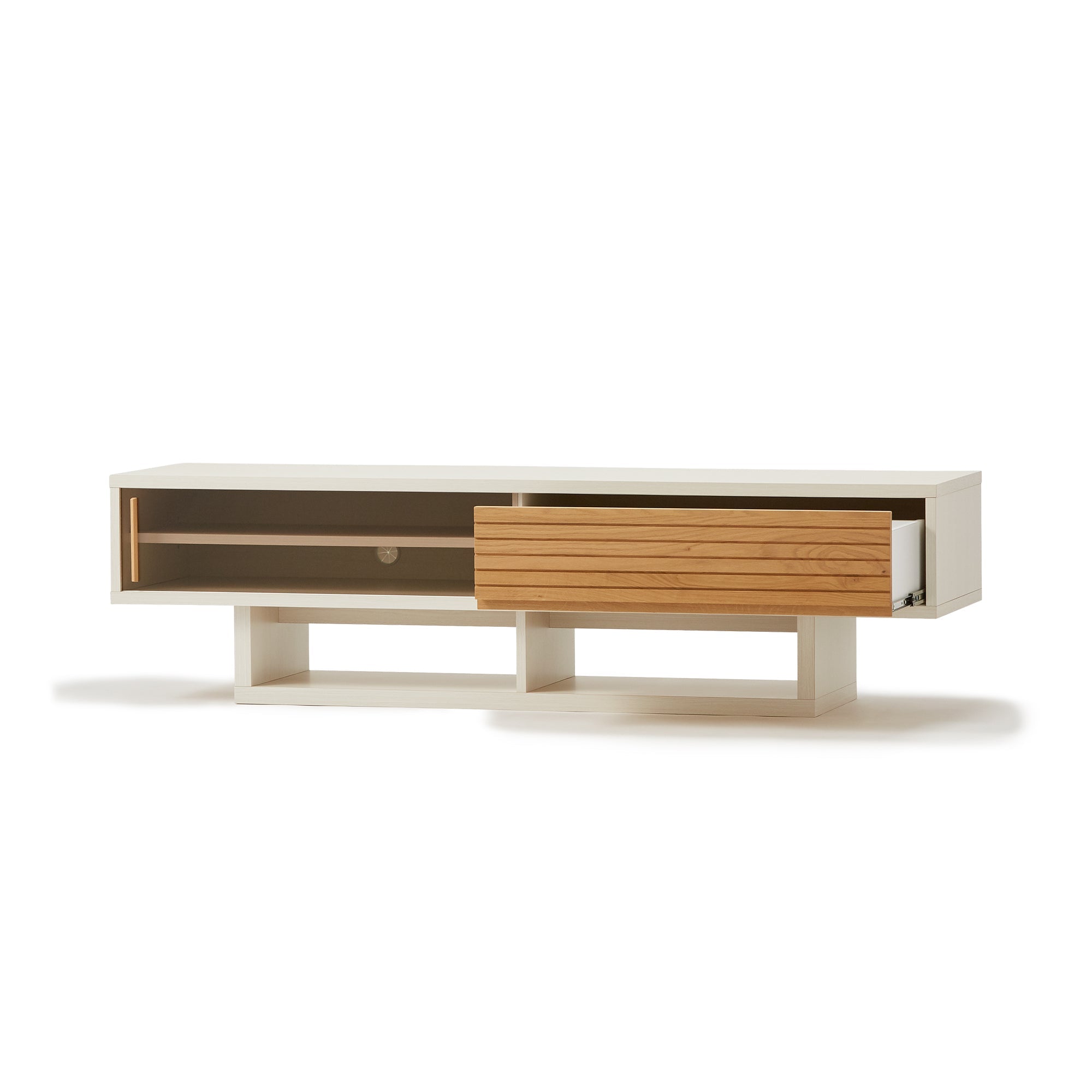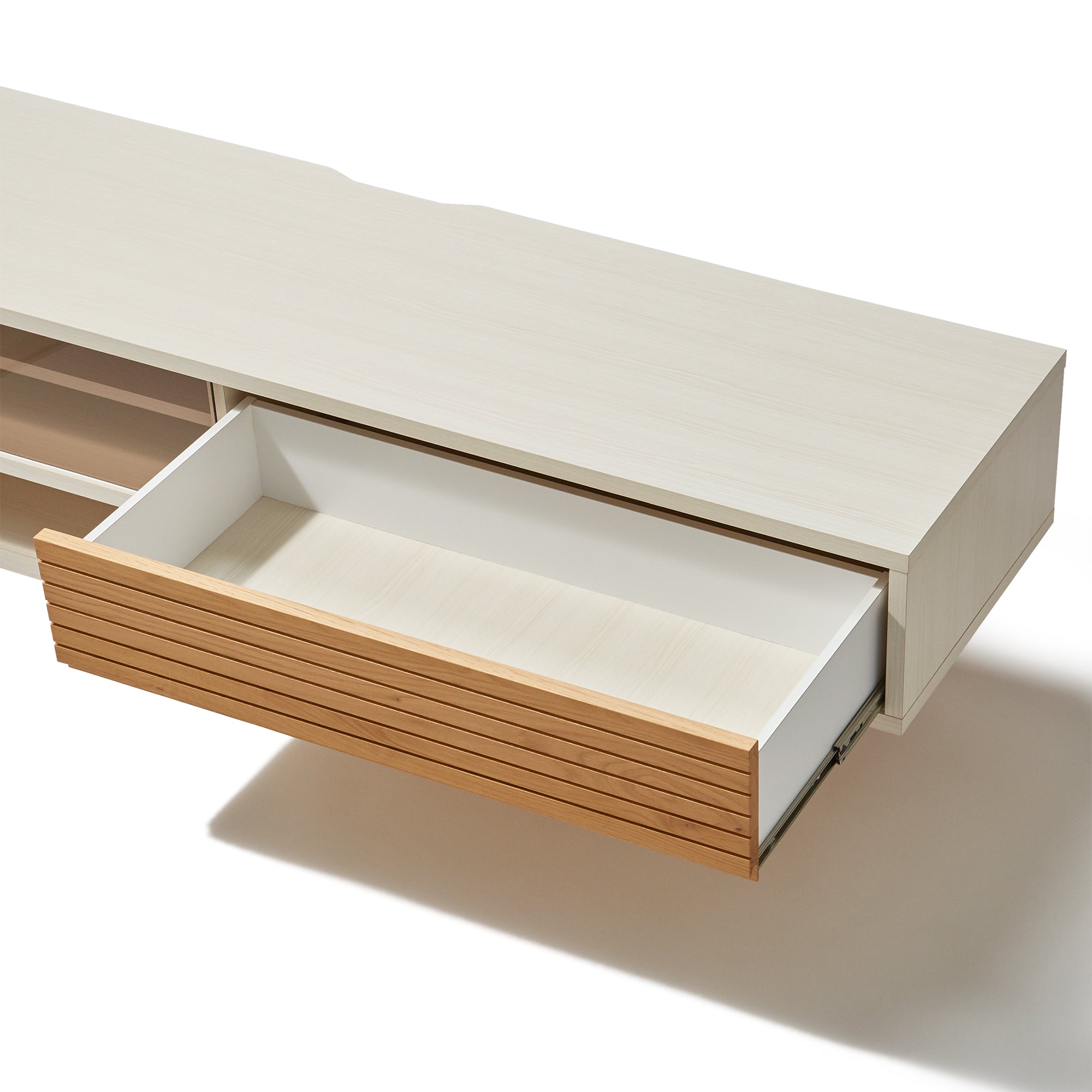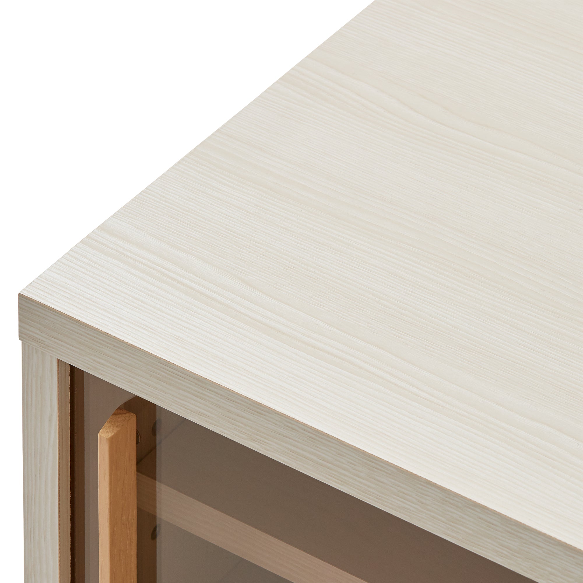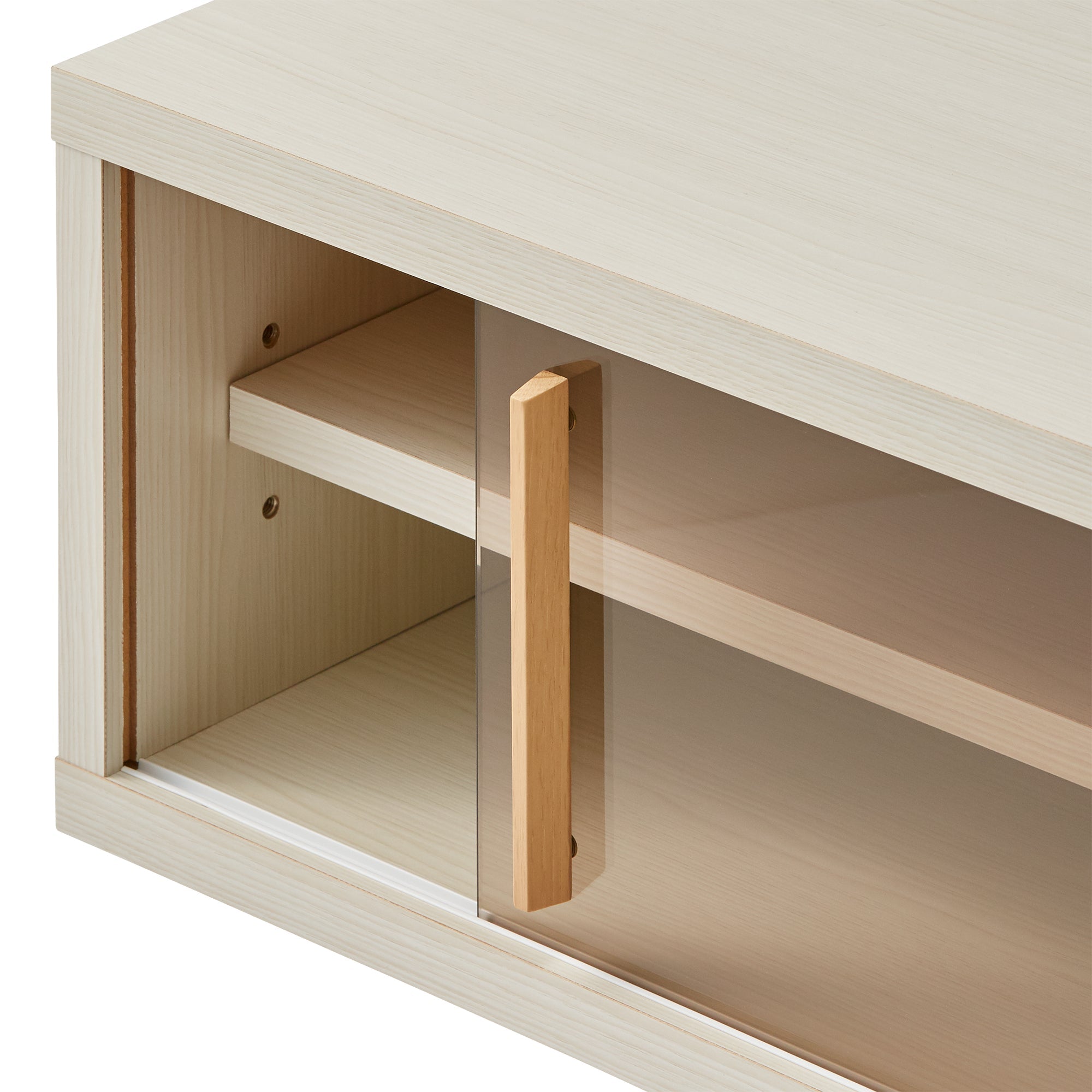 木目の美しいオーク材を採用し、重厚感のあるモダンなTVボードです。天然素材のため、色や木目に個体差があるため、お客様唯一のものになります。明るすぎないナチュラルな色味が、どんなお部屋にも合わせやすいデザインです。優しいアイボリーと、自然な木目調の組み合わせが高級感があり魅力的です。すっきりとしたデザインの脚部により圧迫感がなく、お部屋をスタイリッシュな雰囲気にしてくれます。DVDやリモコン等を収納でき、TV周りをすっきり見せることができる収納力も魅力です。