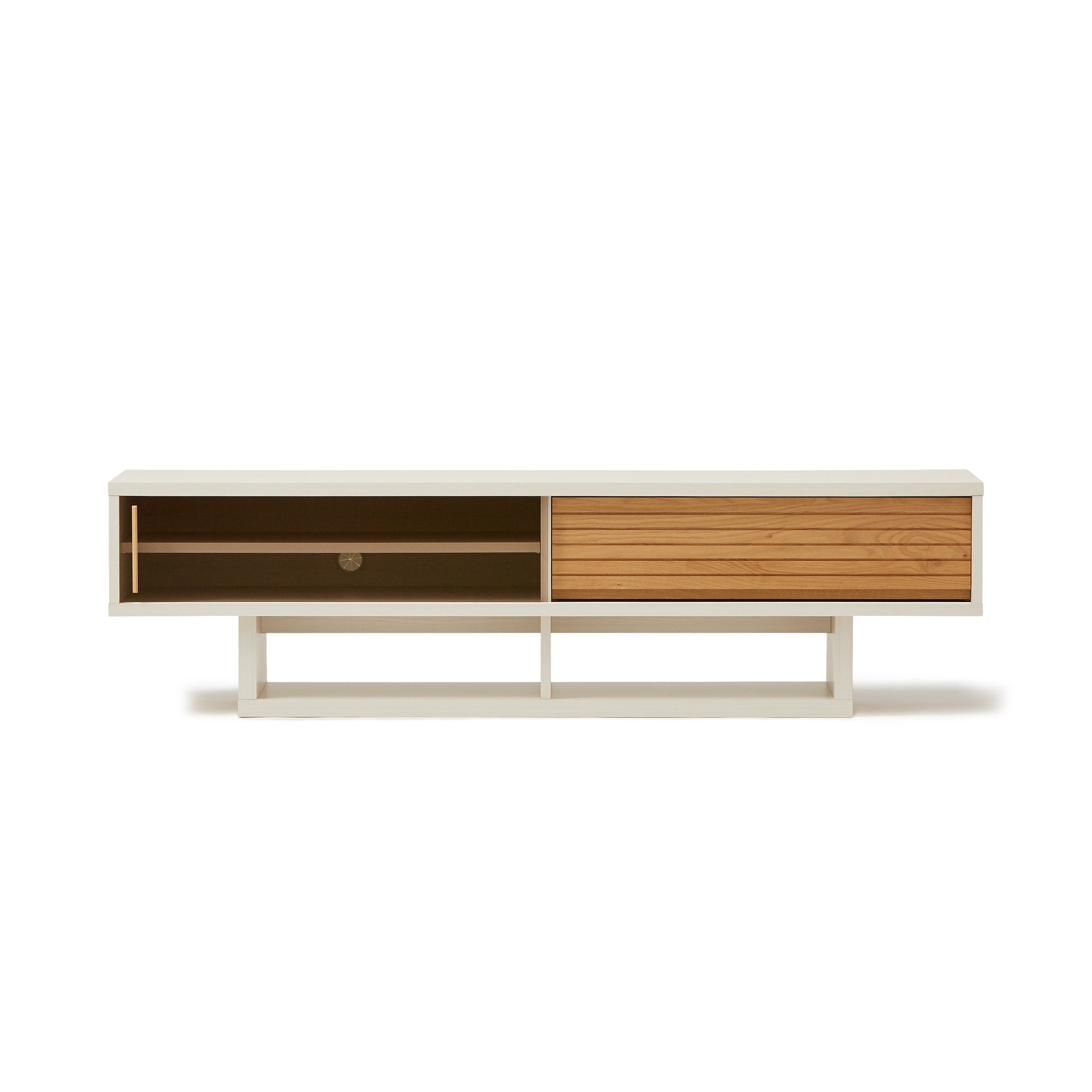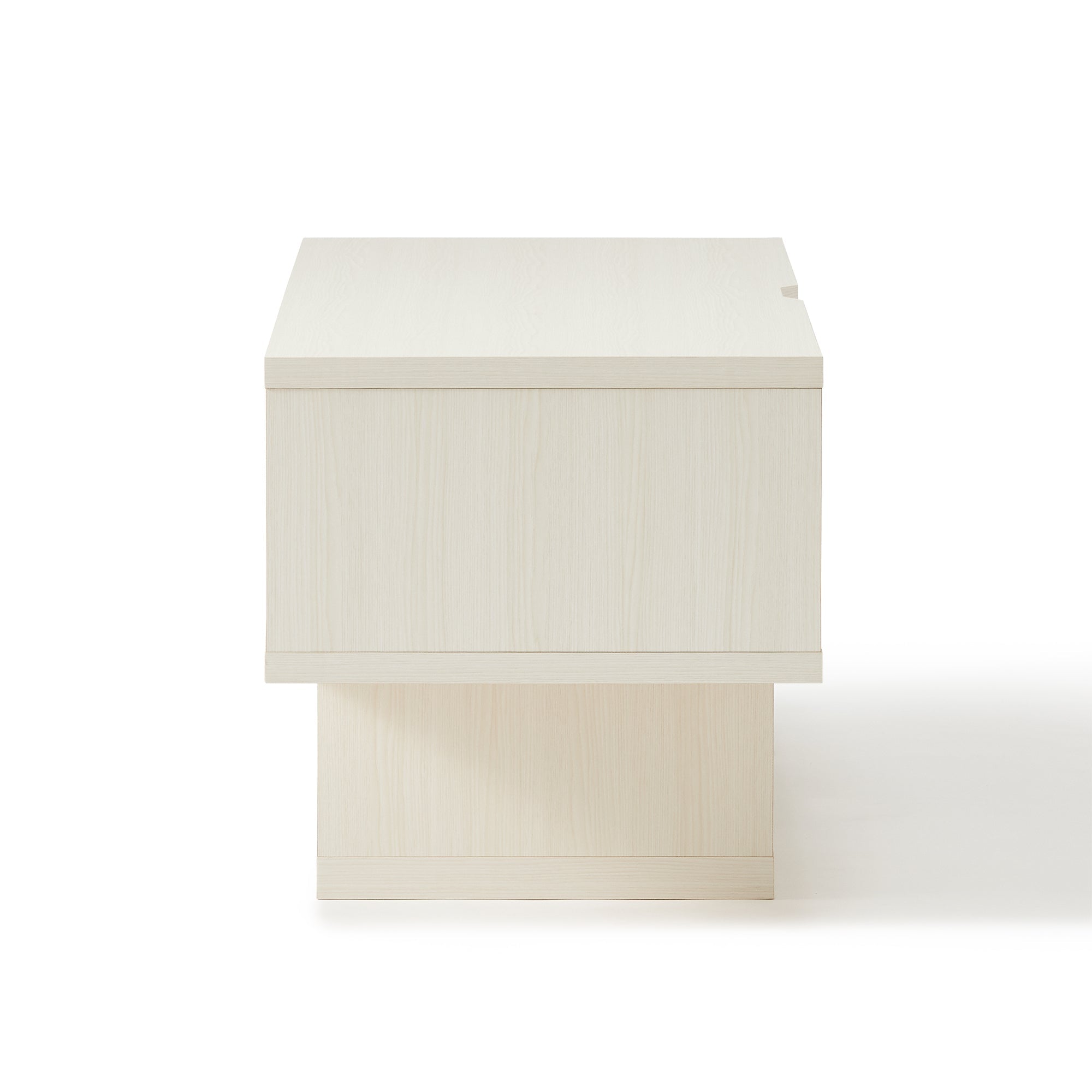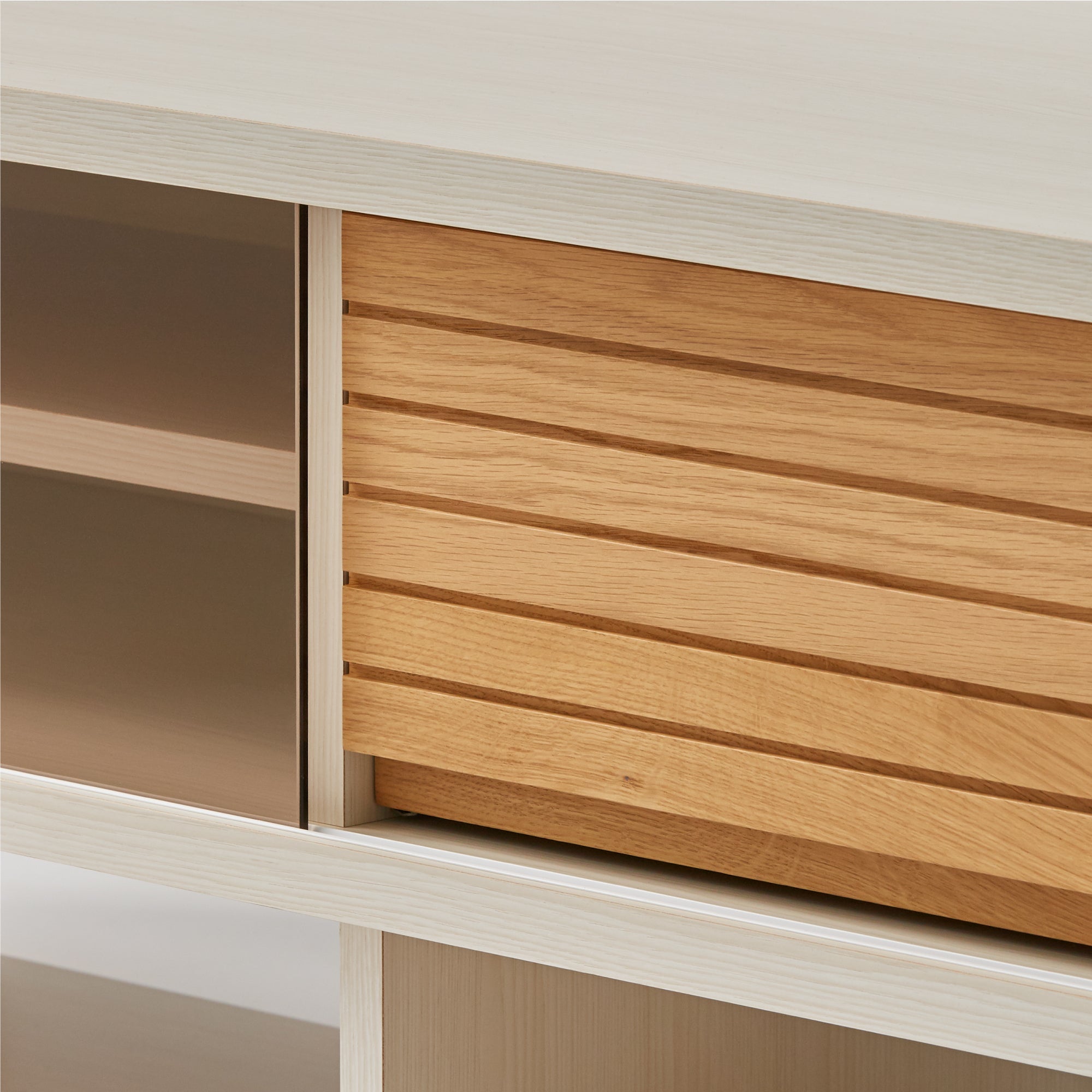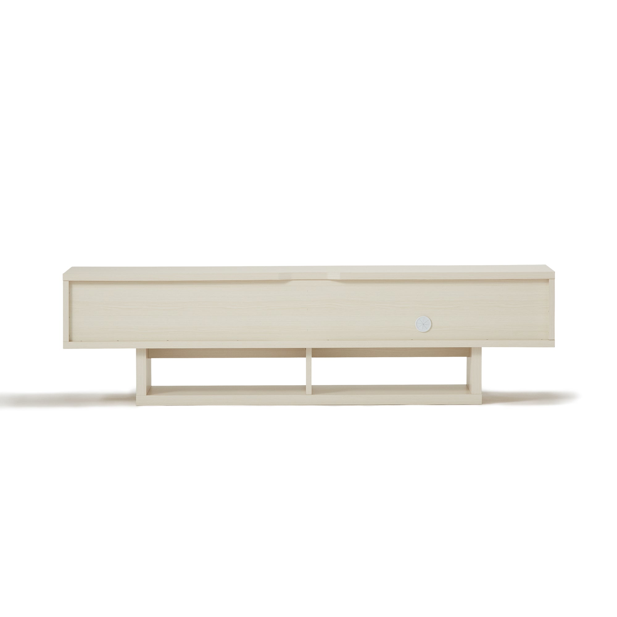 木目の美しいオーク材を採用し、重厚感のあるモダンなTVボードです。天然素材のため、色や木目に個体差があるため、お客様唯一のものになります。明るすぎないナチュラルな色味が、どんなお部屋にも合わせやすいデザインです。優しいアイボリーと、自然な木目調の組み合わせが高級感があり魅力的です。すっきりとしたデザインの脚部により圧迫感がなく、お部屋をスタイリッシュな雰囲気にしてくれます。DVDやリモコン等を収納でき、TV周りをすっきり見せることができる収納力も魅力です。