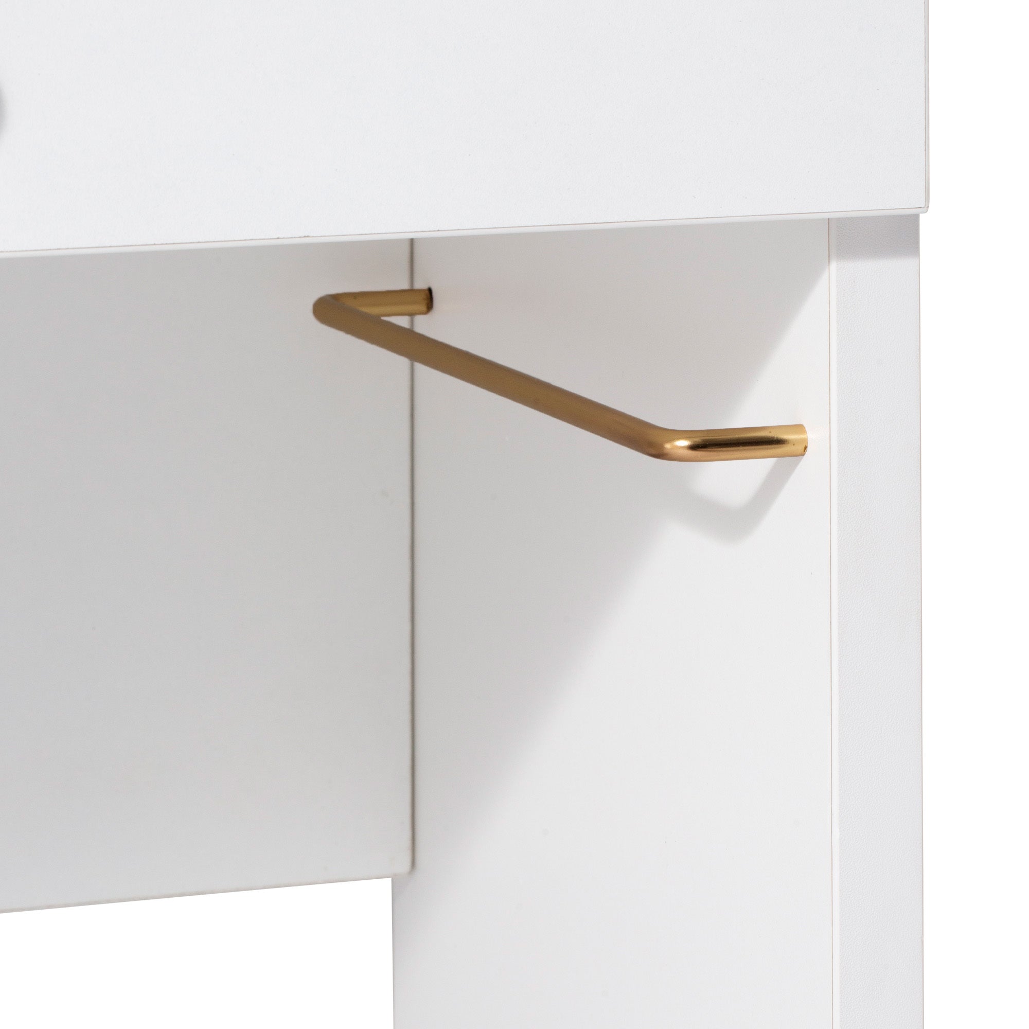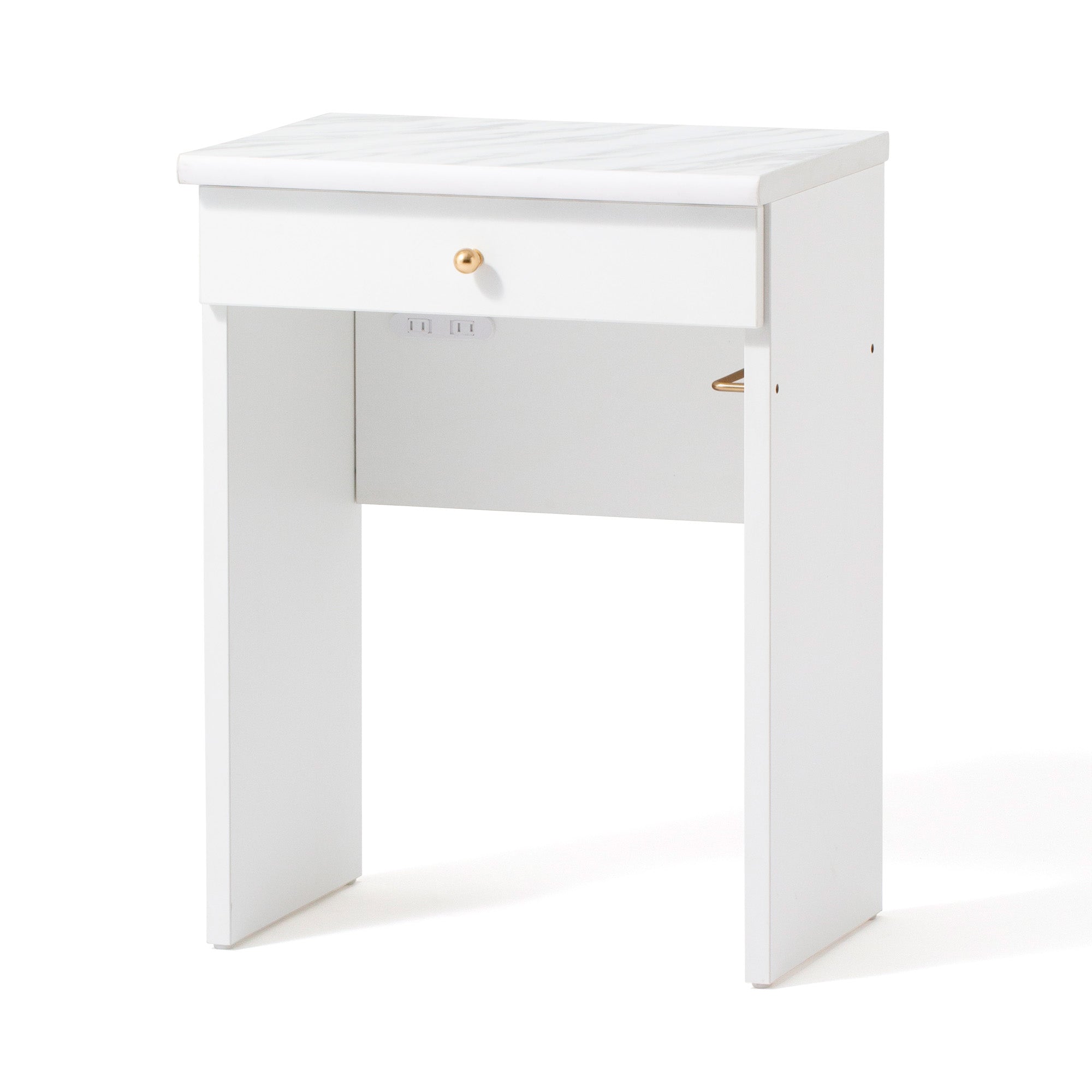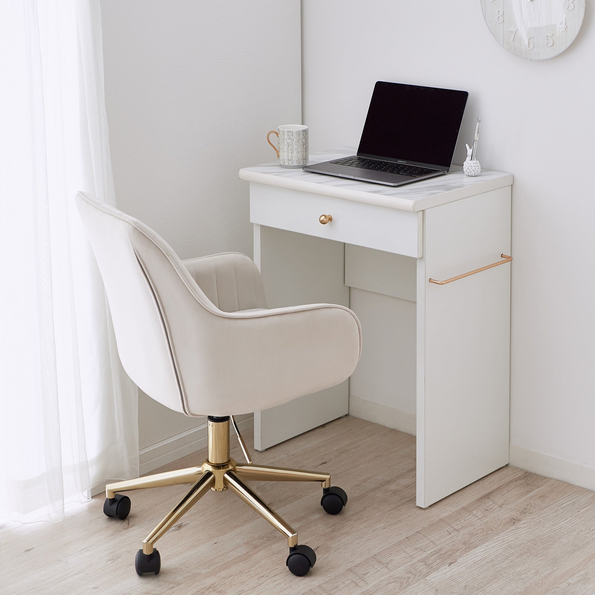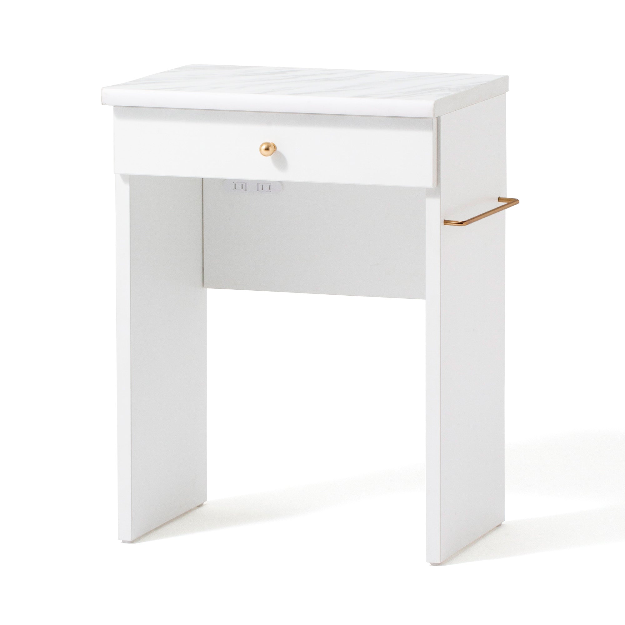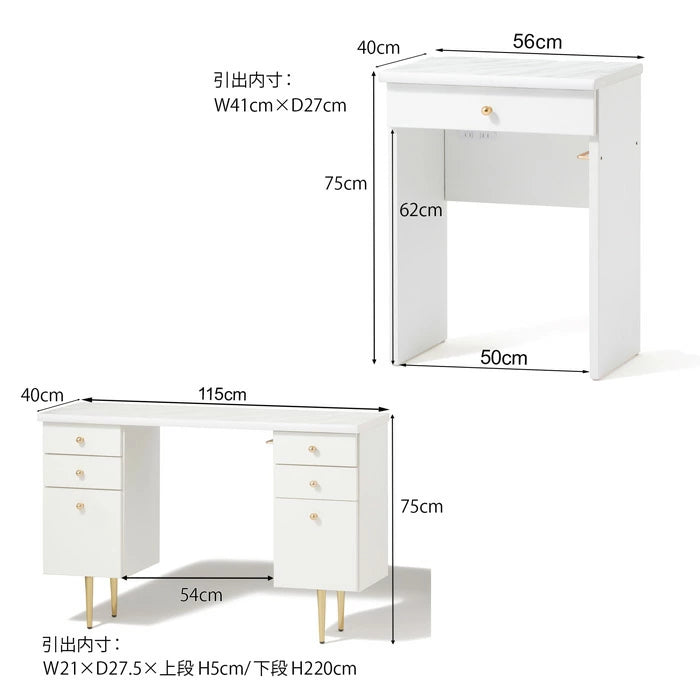 【エルドラドシリーズの仕様変更について】 この商品は2024年8月までに生産されたモデルです。2024年9月以降に生産された商品には一部仕様の変更がございます。新仕様品と組み合わせて使用する際はご注意ください。 詳しくは商品ページ下部の【仕様変更箇所について】をご確認ください。 ============ ワークデスクとしても使用できるコンパクトなドレッサーです。 汚れに強いメラミン天板、引出し、コンセントもついて使い勝手のいい機能が充実しています。 別売りのLED付ミラーをセットすることで、コンパクトながらも大きなミラーでゆったりメイクをお楽しみいただけます。 デザインは清潔感のあるホワイトに、大理石柄の天板、ゴールドの取手がエレガントさを演出します。 コンパクトサイズで一人暮らしのお部屋にもフィットします。 コンセントタップが付属しており、ドライヤーやヘアアイロンなどもご使用いただけます。 引き出しのサイドにはドライヤーが掛けられるハンガーもついていてぬかりありません。 なくしてしまいがちなリップなどの小物も引き出しにまとめて収納できます。 ミニデスクとしてもご使用いただけます。 お部屋に置いても圧迫感がなく、作業スペースとして大活躍。 別売りのLED付ミラーをセットすれば、気分も高まるドレッサーに。 お気に入りのコスメやスキンケア用品を並べて、毎日のメイク時間を快適に。 ▼あわせて使える女優ミラーはこちら エルドラド ハリウッドミラー 【仕様変更箇所について】 商品サイズに大きな変更はございませんが、新旧モデルを並べて使用する際は以下の点に特にご注意ください。 ①天板の厚みと天板エッジ前面のカーブ 新:25mm、カーブが弱い 旧:27mm、カーブが強い ※総高は同じです。 ②取手、脚、ハンガーバーのメッキの色 新:パーツそれぞれの色味を統一しました。 旧:パーツごとに若干色味が異なります。 ※パーツごとに多少の色差はございます。 ③チェストベッドのスライド天板の奥行、レールの色 新:奥行 最大32.5cm、黒 旧:奥行 最大28.5cm、シルバー