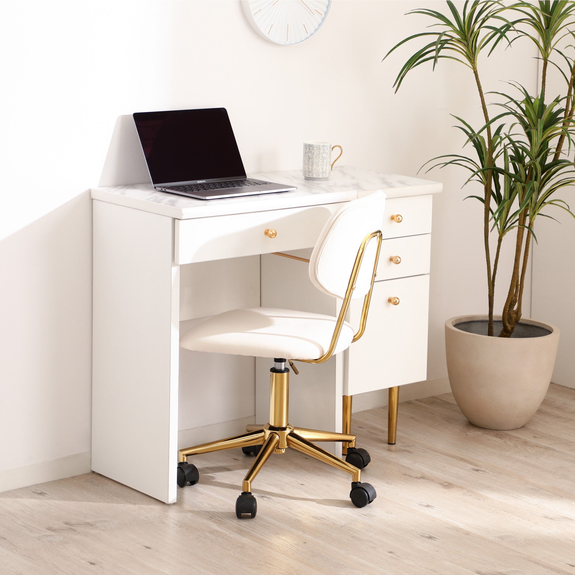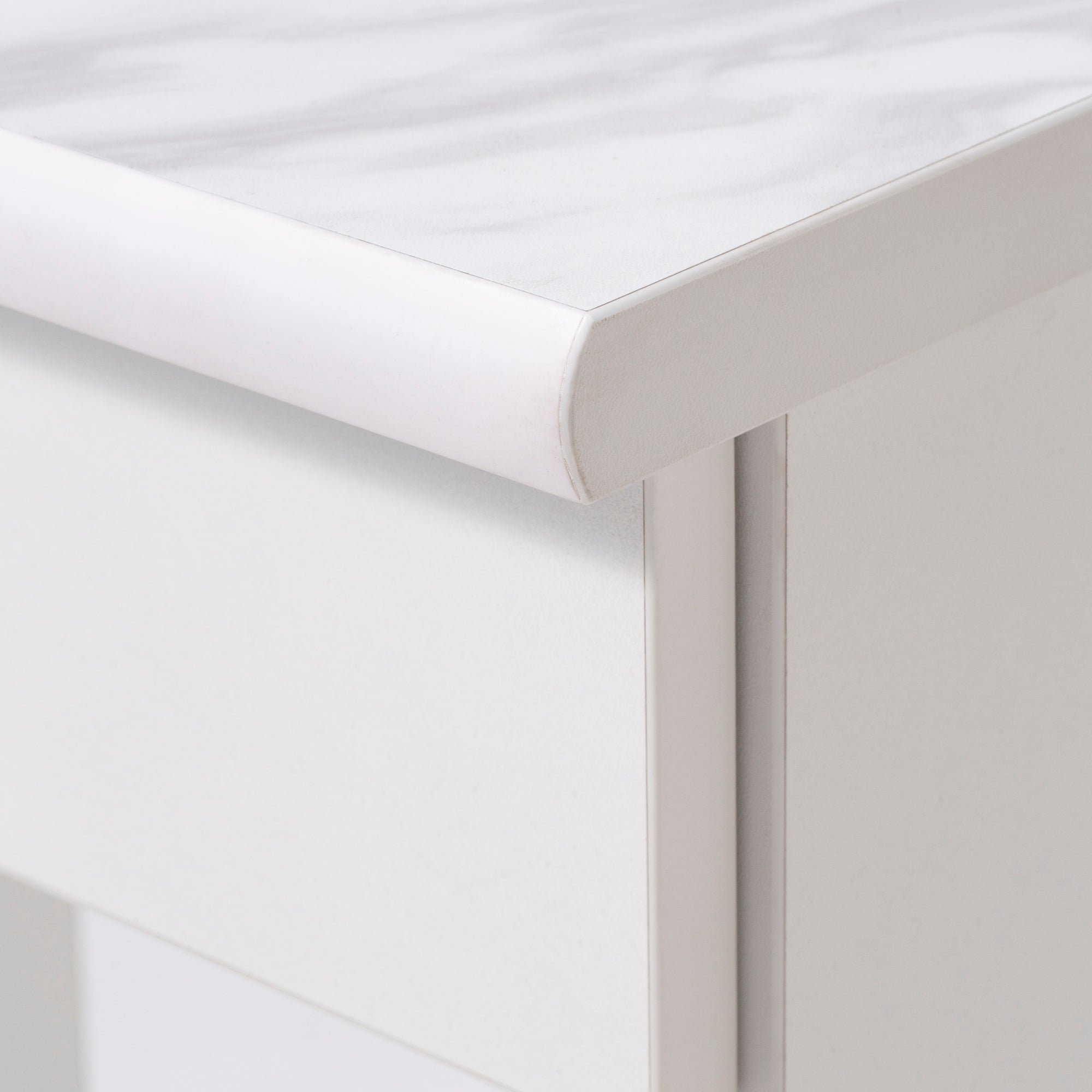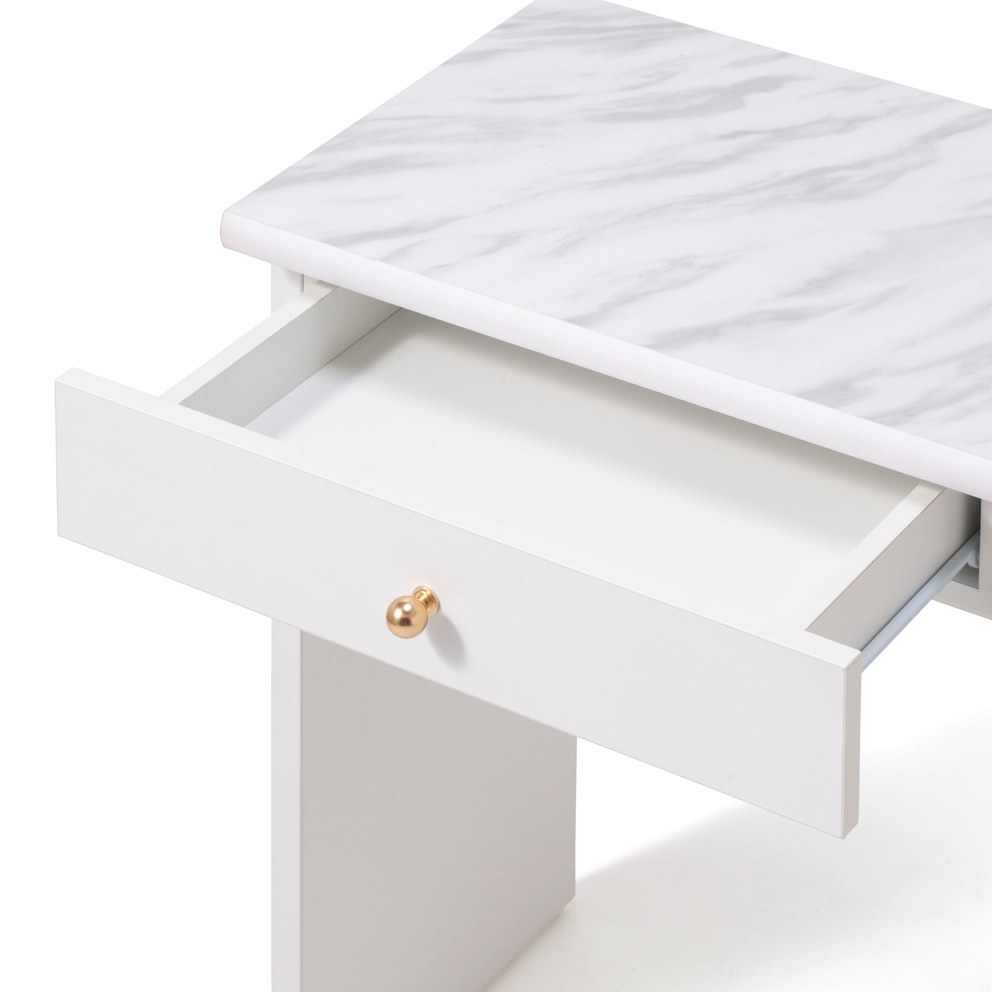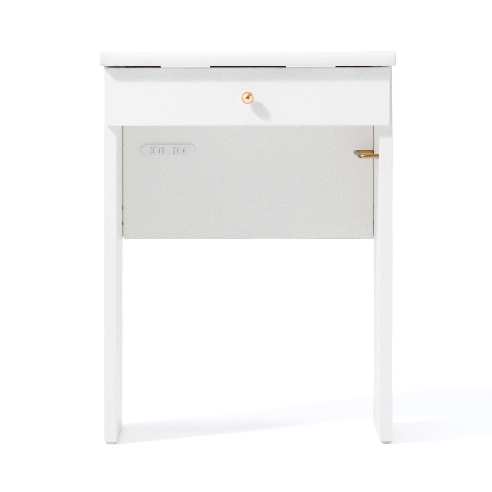 【エルドラドシリーズの仕様変更について】 この商品は2024年8月までに生産されたモデルです。2024年9月以降に生産された商品には一部仕様の変更がございます。新仕様品と組み合わせて使用する際はご注意ください。 詳しくは商品ページ下部の【仕様変更箇所について】をご確認ください。 ============ ワークデスクとしても使用できるコンパクトなドレッサーです。 汚れに強いメラミン天板、引出し、コンセントもついて使い勝手のいい機能が充実しています。 別売りのLED付ミラーをセットすることで、コンパクトながらも大きなミラーでゆったりメイクをお楽しみいただけます。 デザインは清潔感のあるホワイトに、大理石柄の天板、ゴールドの取手がエレガントさを演出します。 コンパクトサイズで一人暮らしのお部屋にもフィットします。 コンセントタップが付属しており、ドライヤーやヘアアイロンなどもご使用いただけます。 引き出しのサイドにはドライヤーが掛けられるハンガーもついていてぬかりありません。 なくしてしまいがちなリップなどの小物も引き出しにまとめて収納できます。 ミニデスクとしてもご使用いただけます。 お部屋に置いても圧迫感がなく、作業スペースとして大活躍。 別売りのLED付ミラーをセットすれば、気分も高まるドレッサーに。 お気に入りのコスメやスキンケア用品を並べて、毎日のメイク時間を快適に。 ▼あわせて使える女優ミラーはこちら エルドラド ハリウッドミラー 【仕様変更箇所について】 商品サイズに大きな変更はございませんが、新旧モデルを並べて使用する際は以下の点に特にご注意ください。 ①天板の厚みと天板エッジ前面のカーブ 新:25mm、カーブが弱い 旧:27mm、カーブが強い ※総高は同じです。 ②取手、脚、ハンガーバーのメッキの色 新:パーツそれぞれの色味を統一しました。 旧:パーツごとに若干色味が異なります。 ※パーツごとに多少の色差はございます。 ③チェストベッドのスライド天板の奥行、レールの色 新:奥行 最大32.5cm、黒 旧:奥行 最大28.5cm、シルバー