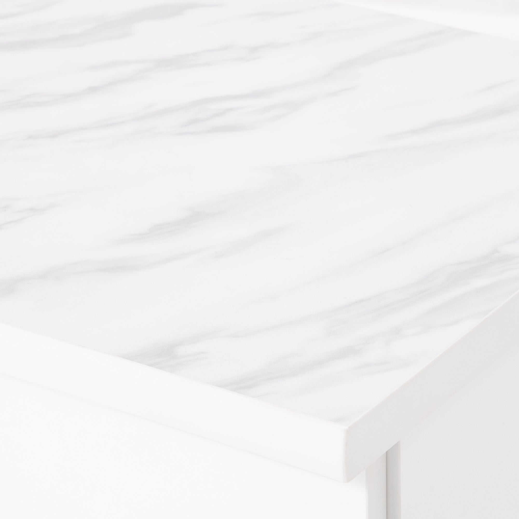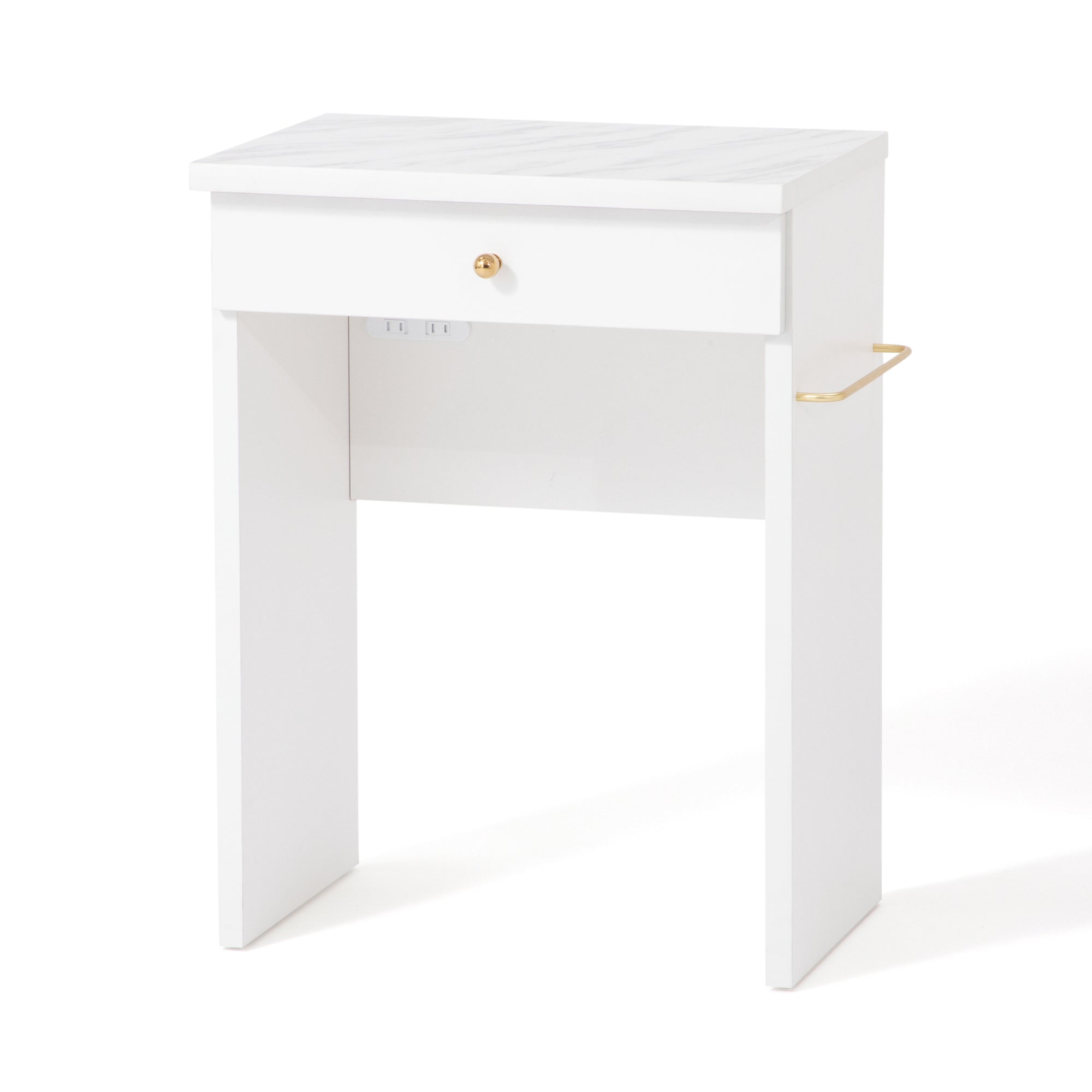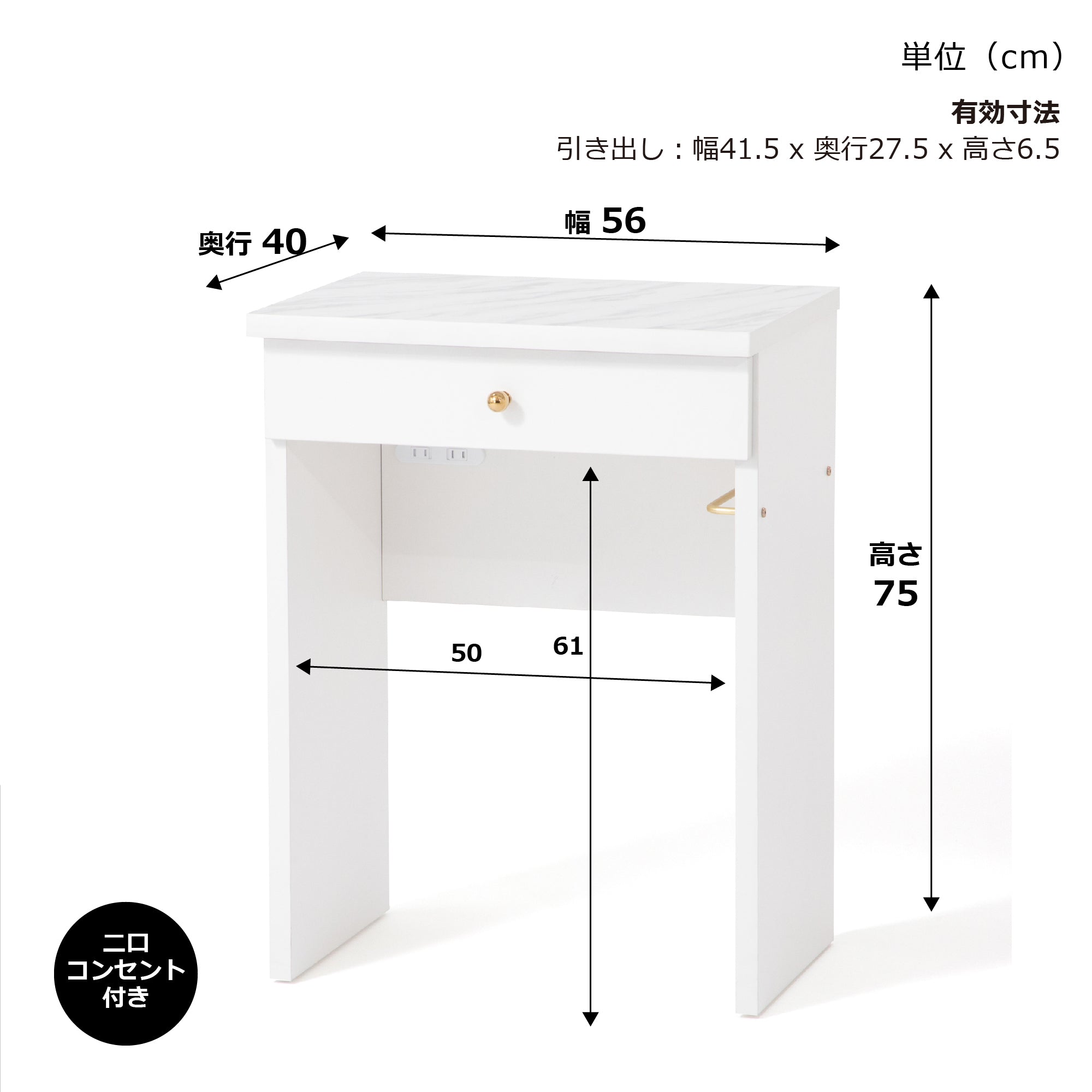 【エルドラドシリーズの仕様変更について】 この商品は生産時期によって一部仕様が異なります。2024年8月以前に生産されたシリーズと組み合わせて使用する際はご注意ください。 詳しくは商品ページ下部の【仕様変更箇所について】をご確認ください。 ============ ワークデスクとしても使用できるコンパクトなドレッサーです。 汚れに強いメラミン天板、引出し、コンセントもついて使い勝手のいい機能が充実しています。 別売りのLED付ミラーをセットすることで、コンパクトながらも大きなミラーでゆったりメイクをお楽しみいただけます。 デザインは清潔感のあるホワイトに、大理石柄の天板、ゴールドの取手がエレガントさを演出します。 コンパクトサイズで一人暮らしのお部屋にもフィットします。 コンセントタップが付属しており、ドライヤーやヘアアイロンなどもご使用いただけます。 ▼あわせて使える女優ミラーはこちら エルドラド ハリウッドミラー 【仕様変更箇所について】 商品サイズに大きな変更はございませんが、新旧モデルを並べて使用する際は以下の点に特にご注意ください。 ①天板の厚みと天板エッジ前面のカーブ 新:25mm、カーブが弱い 旧:27mm、カーブが強い ※総高は同じです。 ②取手、脚、ハンガーバーのメッキの色 新:パーツそれぞれの色味を統一しました。 旧:パーツごとに若干色味が異なります。 ※パーツごとに多少の色差はございます。 ③チェストベッドのスライド天板の奥行、レールの色 新:奥行 最大32.5cm、黒 旧:奥行 最大28.5cm、シルバー