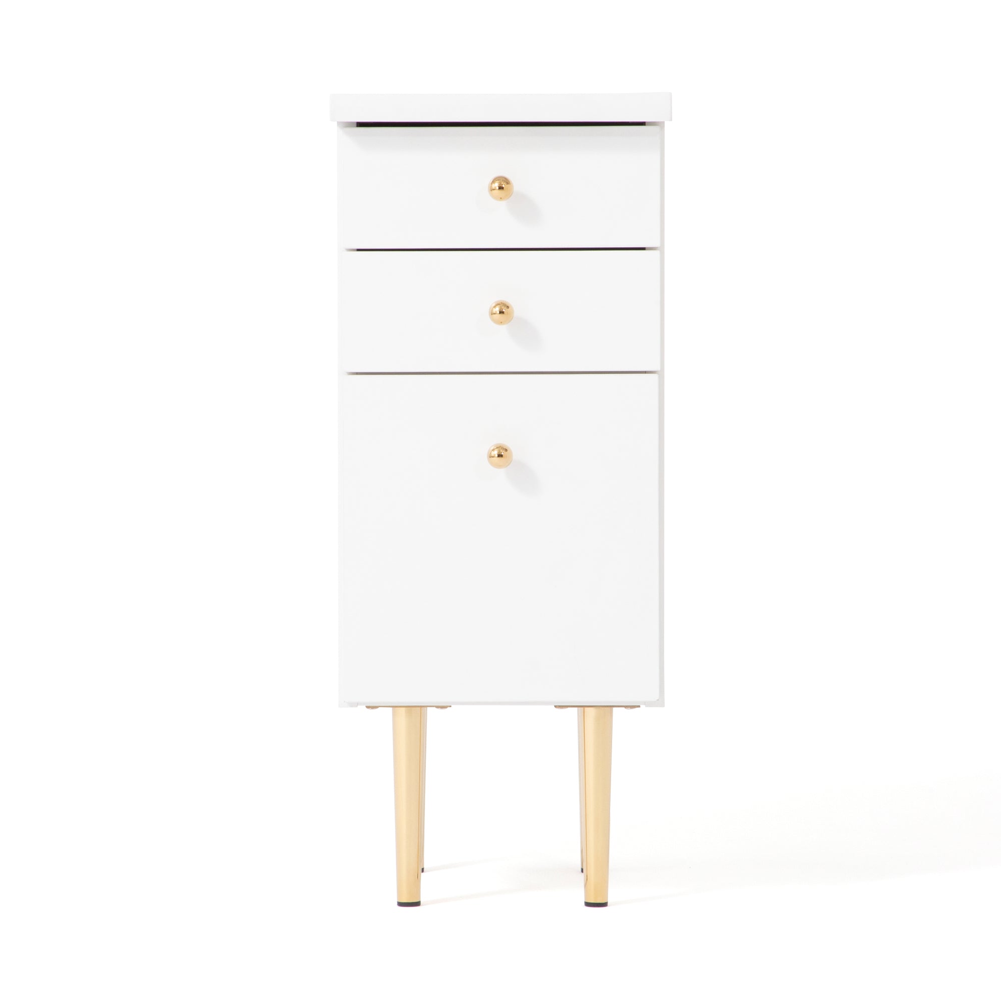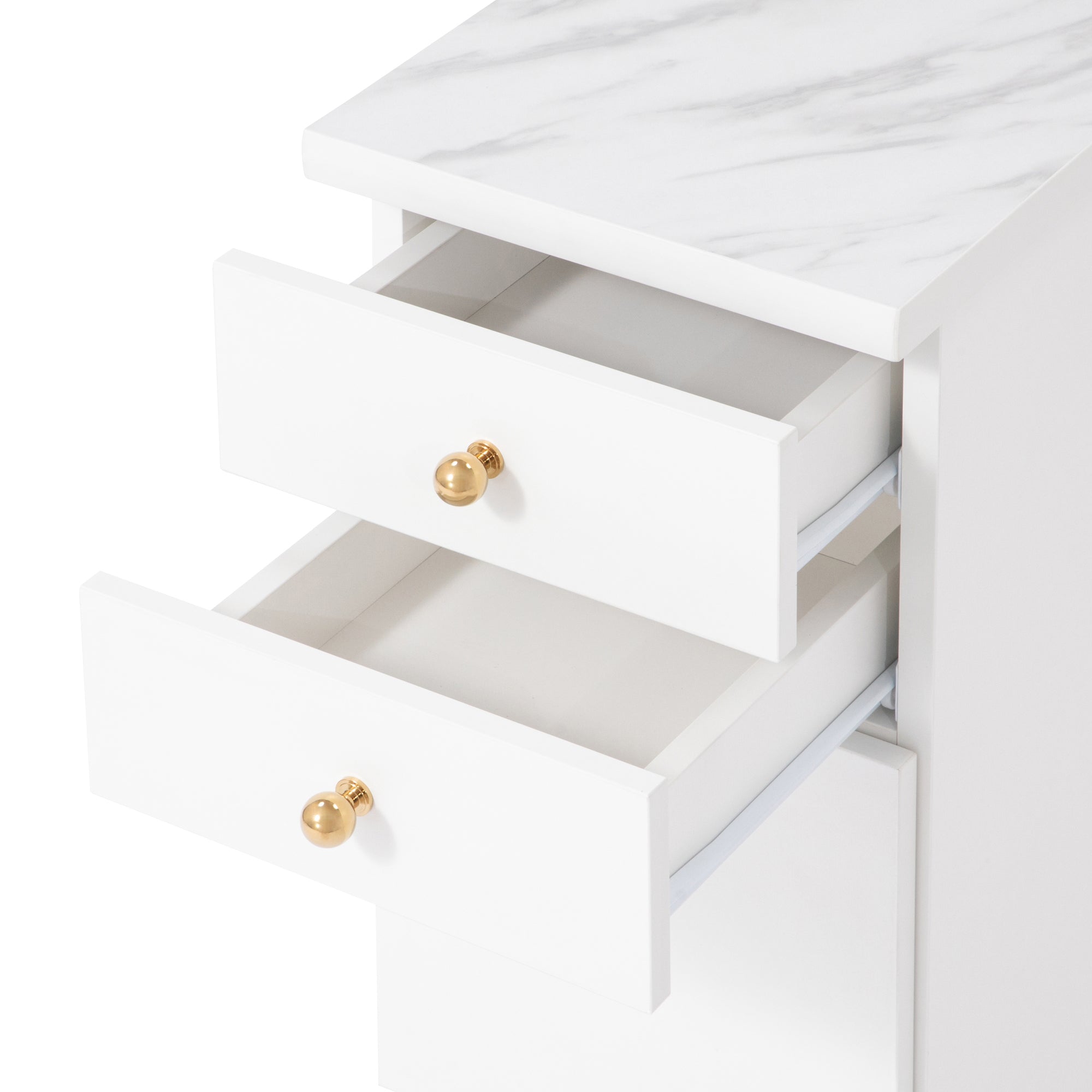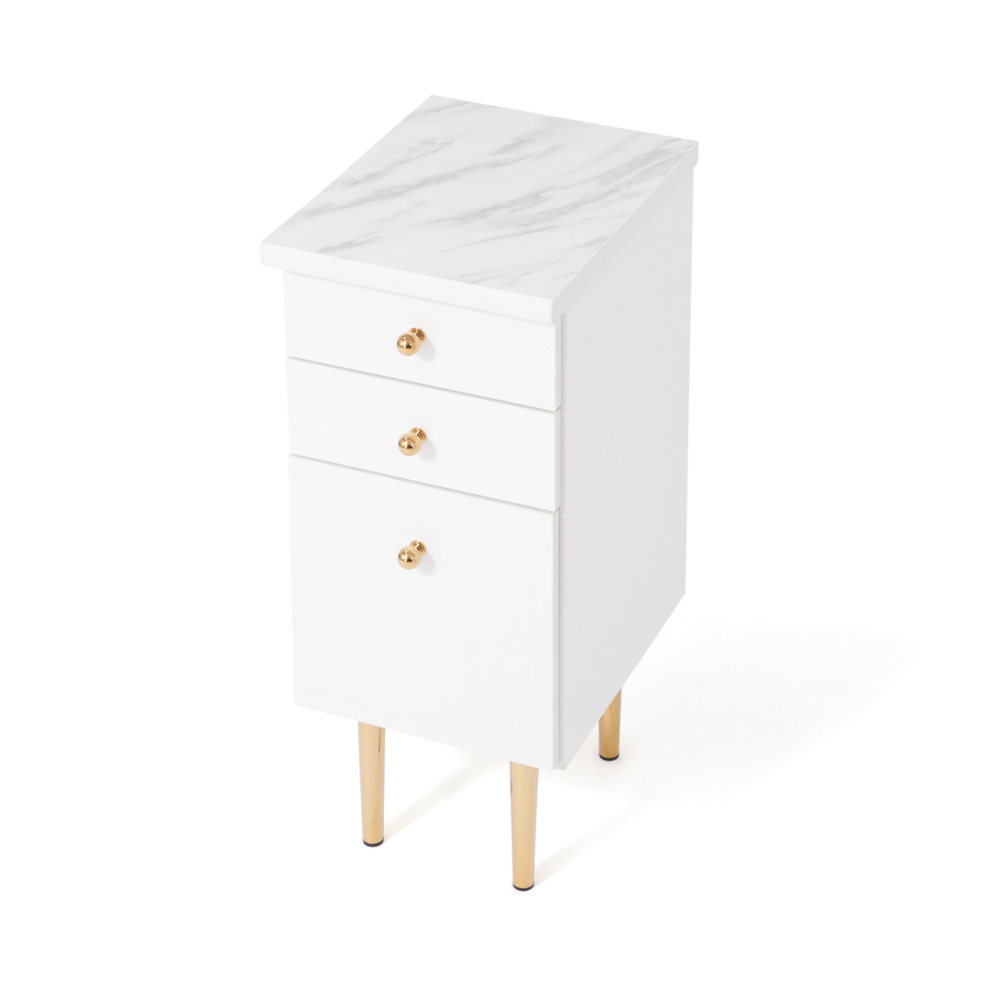 【エルドラドシリーズの仕様変更について】 この商品は生産時期によって一部仕様が異なります。2024年8月以前に生産されたシリーズと組み合わせて使用する際はご注意ください。 詳しくは商品ページ下部の【仕様変更箇所について】をご確認ください。 ============ エルドラド コスメデスクだけでは収納が足りない方にぴったりのサイドチェストです。 清潔感のあるホワイト色に、大理石柄の天板、ゴールドの取手がエレガントさを演出します。 コスメデスクと並べることで収納力がアップすると共に、天板も拡張されるので広々お使いいただけます。 エルドラド サイドボードと並べても、ぴったりなサイズ設計です。 【仕様変更箇所について】 商品サイズに大きな変更はございませんが、新旧モデルを並べて使用する際は以下の点に特にご注意ください。 ①天板の厚みと天板エッジ前面のカーブ 新:25mm、カーブが弱い 旧:27mm、カーブが強い ※総高は同じです。 ②取手、脚、ハンガーバーのメッキの色 新:パーツそれぞれの色味を統一しました。 旧:パーツごとに若干色味が異なります。 ※パーツごとに多少の色差はございます。 ③チェストベッドのスライド天板の奥行、レールの色 新:奥行 最大32.5cm、黒 旧:奥行 最大28.5cm、シルバー