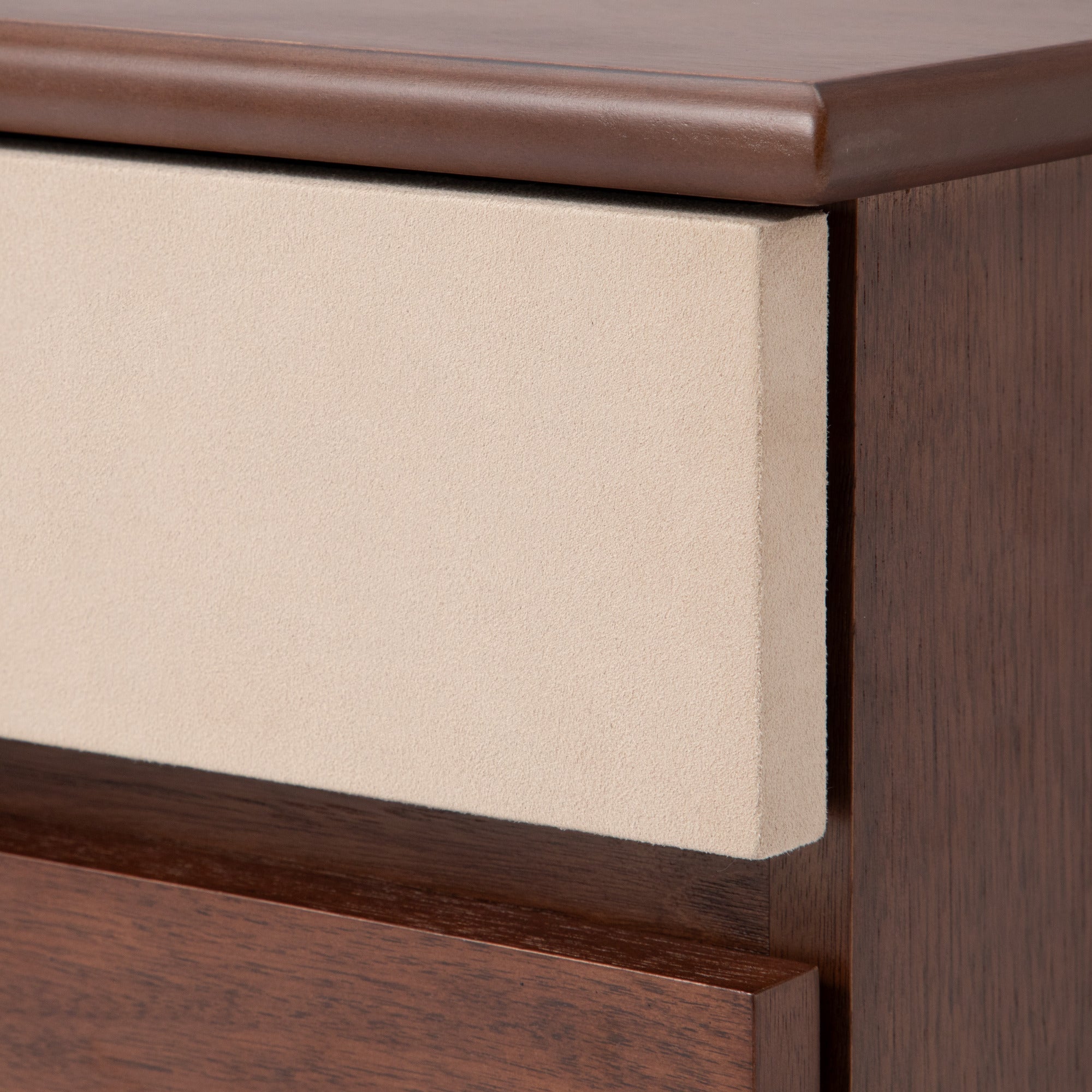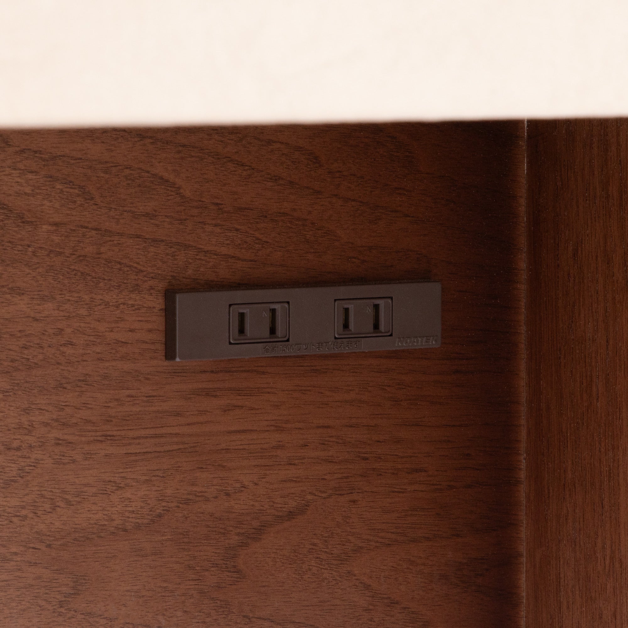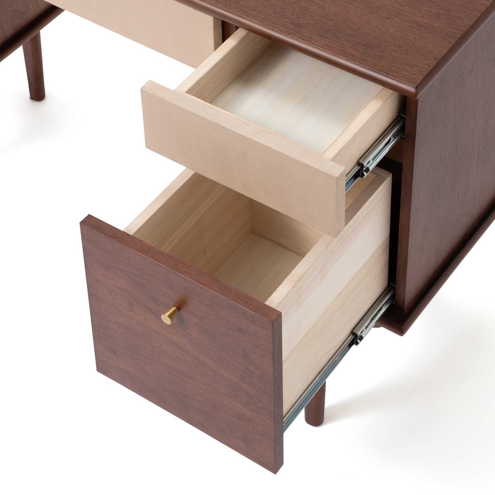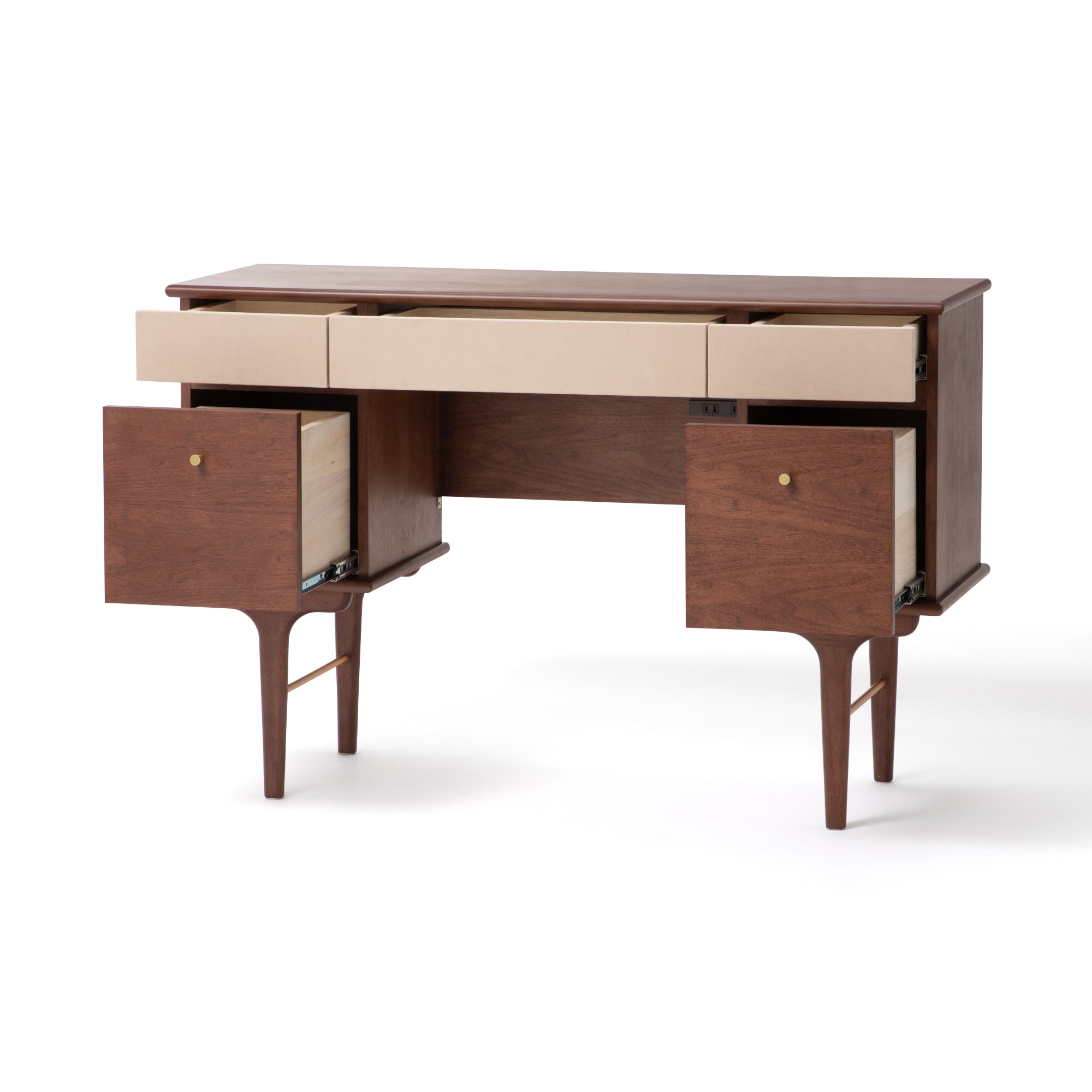 ダークブラウンのオニグルミ材の突板にゴールドを合わせた、女性らしいベーシックなデザインのコスメデスクです。上段の引き出しにはA4サイズのファイルも収納できるのでデスクワークにも重宝します。下段の深引きは丈夫なフルスライドレールを使用しており、書類や化粧水ボトルなど重量のあるものもしっかり収納できます。同シリーズのナイトテーブルやサイドボードとのコーディネートもおすすめです。また、別売りのミラーと組み合わせることで一気に洗練されたドレッサーに仕上がります。夜の静けさや心地よさと洗練された空間からインスピレーションを受け、「Nocturne(夜想曲)」とCOZY CHICの「CHIC」を組み合わせ「ノエティーク」と名付けました。