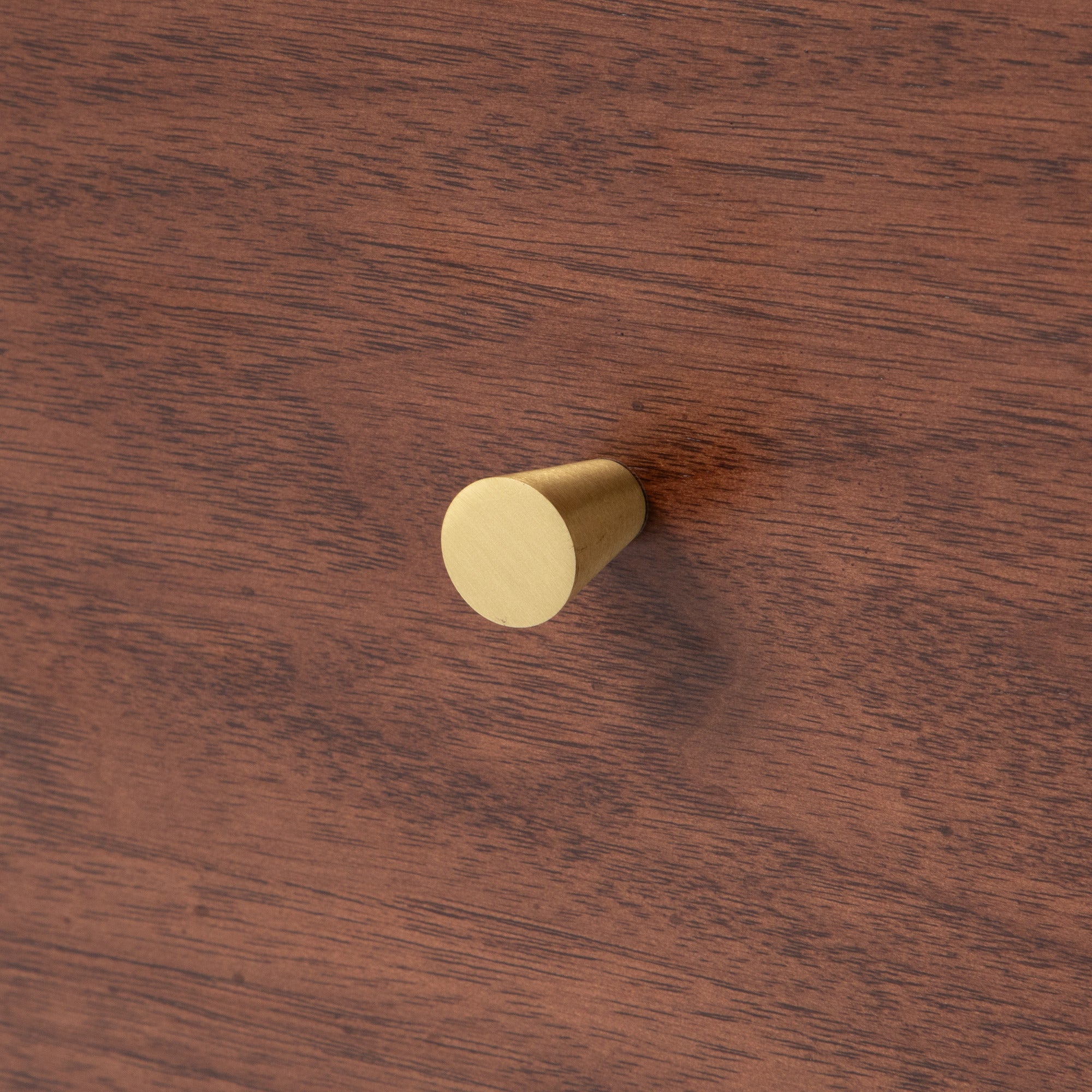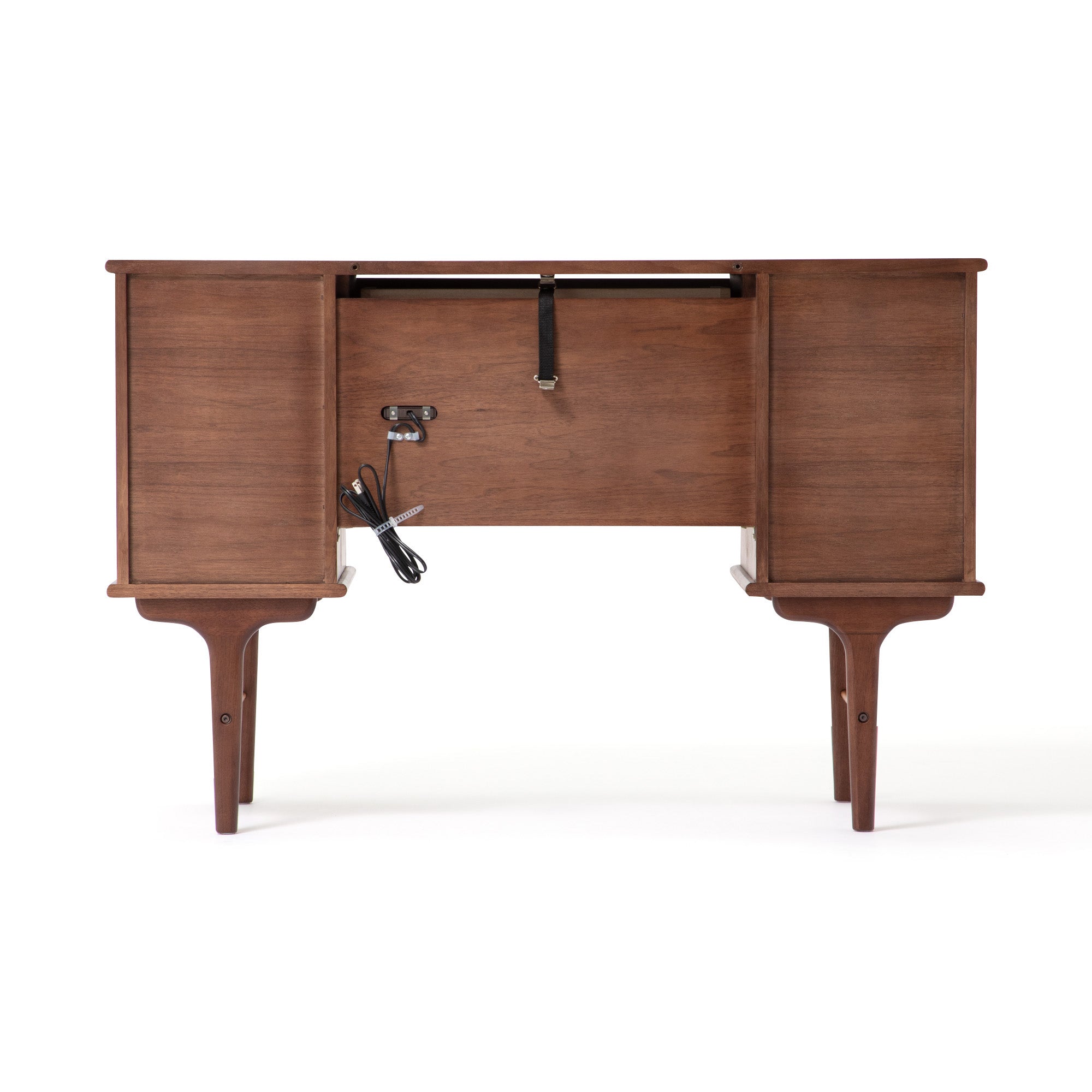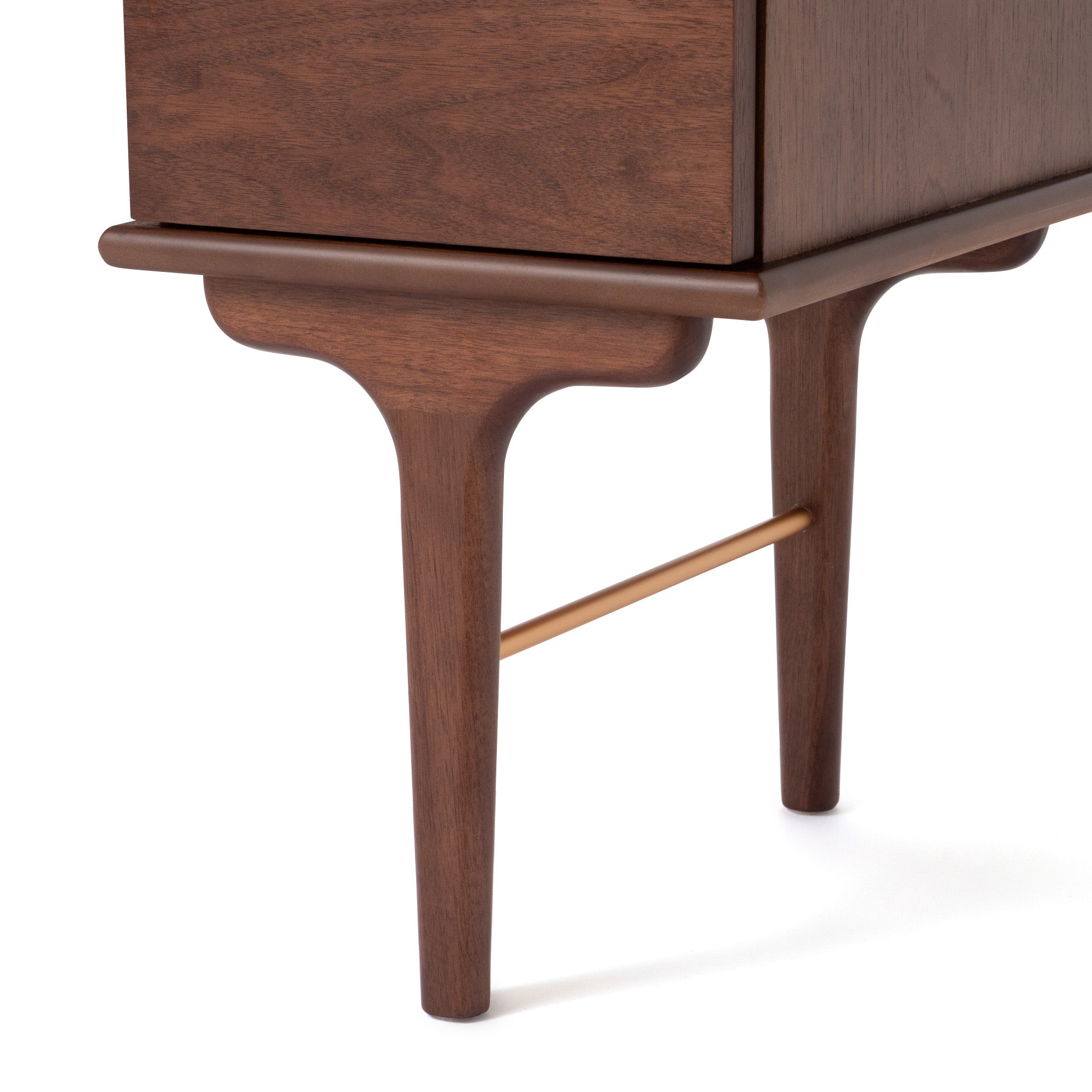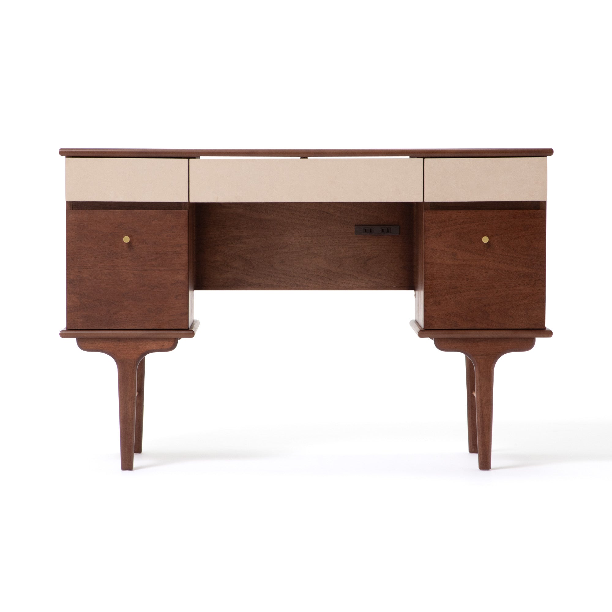 ダークブラウンのオニグルミ材の突板にゴールドを合わせた、女性らしいベーシックなデザインのコスメデスクです。上段の引き出しにはA4サイズのファイルも収納できるのでデスクワークにも重宝します。下段の深引きは丈夫なフルスライドレールを使用しており、書類や化粧水ボトルなど重量のあるものもしっかり収納できます。同シリーズのナイトテーブルやサイドボードとのコーディネートもおすすめです。また、別売りのミラーと組み合わせることで一気に洗練されたドレッサーに仕上がります。夜の静けさや心地よさと洗練された空間からインスピレーションを受け、「Nocturne(夜想曲)」とCOZY CHICの「CHIC」を組み合わせ「ノエティーク」と名付けました。