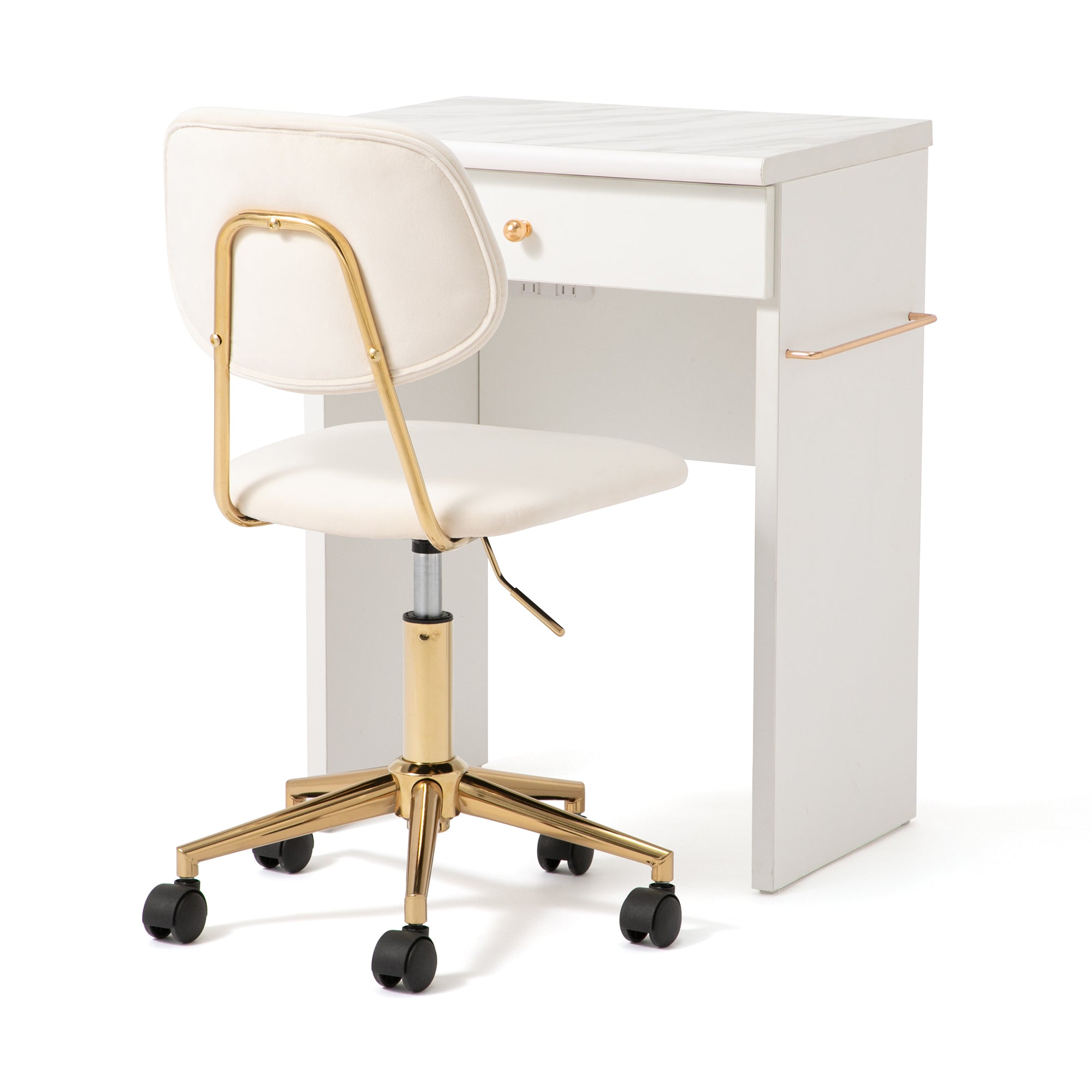 コンパクトサイズのデスクチェアです。フランス語で「ちょうど、ぴったりの」という意味がある「pile-poil 」からポワルと名付けました。エレガントなテイストで、エルドラドコスメデスクSにもぴったり収まるサイズです。