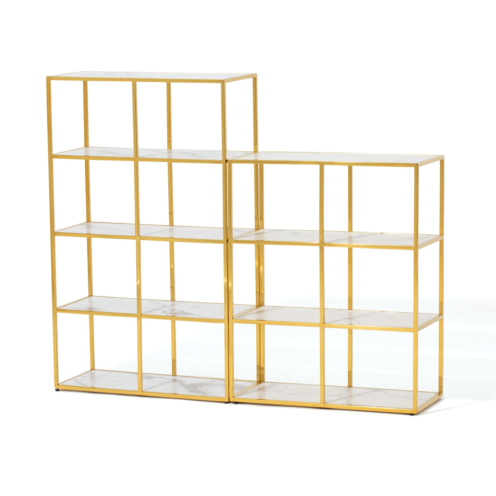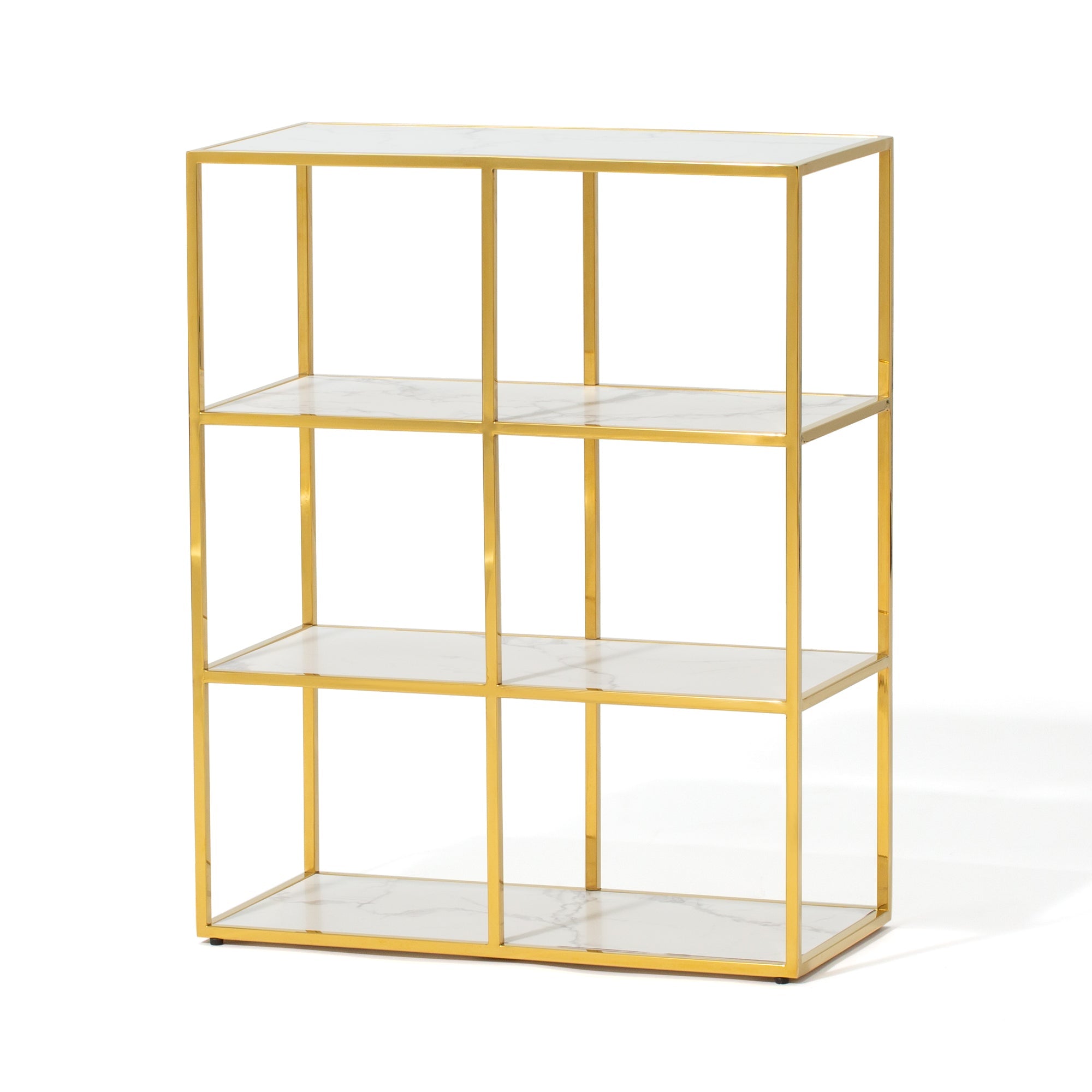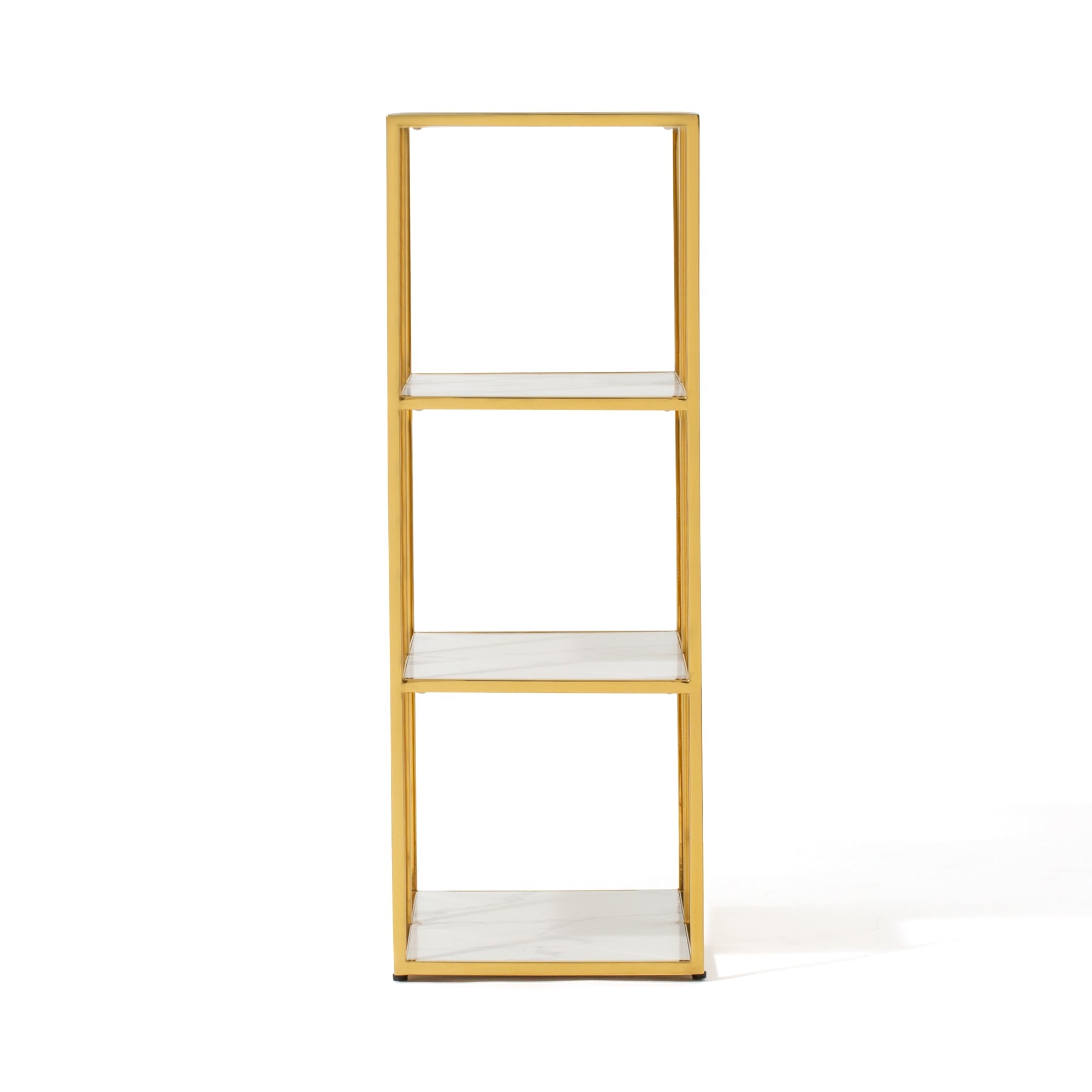 細身のゴールドフレームに大理石柄のシートをあしらった、高級感のあるシェルフです。 コンパクトなサイズ感とすっきりしたフレームで圧迫感を与えることなく、一人暮らしのお部屋にもぴったりです。 シリーズで並べて置けば収納力もさらにアップし、大型のお部屋にもきれいに映えます。 アンクレットソファ、シュエットソファと合わせると空間を煌びやかに彩ります。 ゴールドフレームが小物をいっそう際立たせてくれるためお洒落に収納できます。 棚板にはメラミン素材を使用しているため、耐久性があり、傷もつきにくいです。 書籍やフラワーベースを置いても安心です。 大きすぎないサイズ感で間取りを選ばずご利用いただけます。 ステンレスフレームが床を傷つけないよう、脚部パーツをご用意しています。 ダイニングやキッチンに置いて食器をディスプレイしても映えるデザインです。 TVボードやシェルフを並べて置けば広めのリビングにもきれいに映えます。 ボタニカルなお部屋にも、スタイリッシュさをプラスしてくれます。 シェルフに合わせるインテリアによって、可愛いテイストにも、恰好良いテイストにも。お部屋の雰囲気を残したまますっきりと収納することができます。 同じレーヌシリーズのネストテーブルと合わせればお部屋全体の統一感が生まれます。 デスクと並べてリモートワークも快適に。 自分だけのお気に入りの空間をぜひレーヌシェルフでデザインしてください。