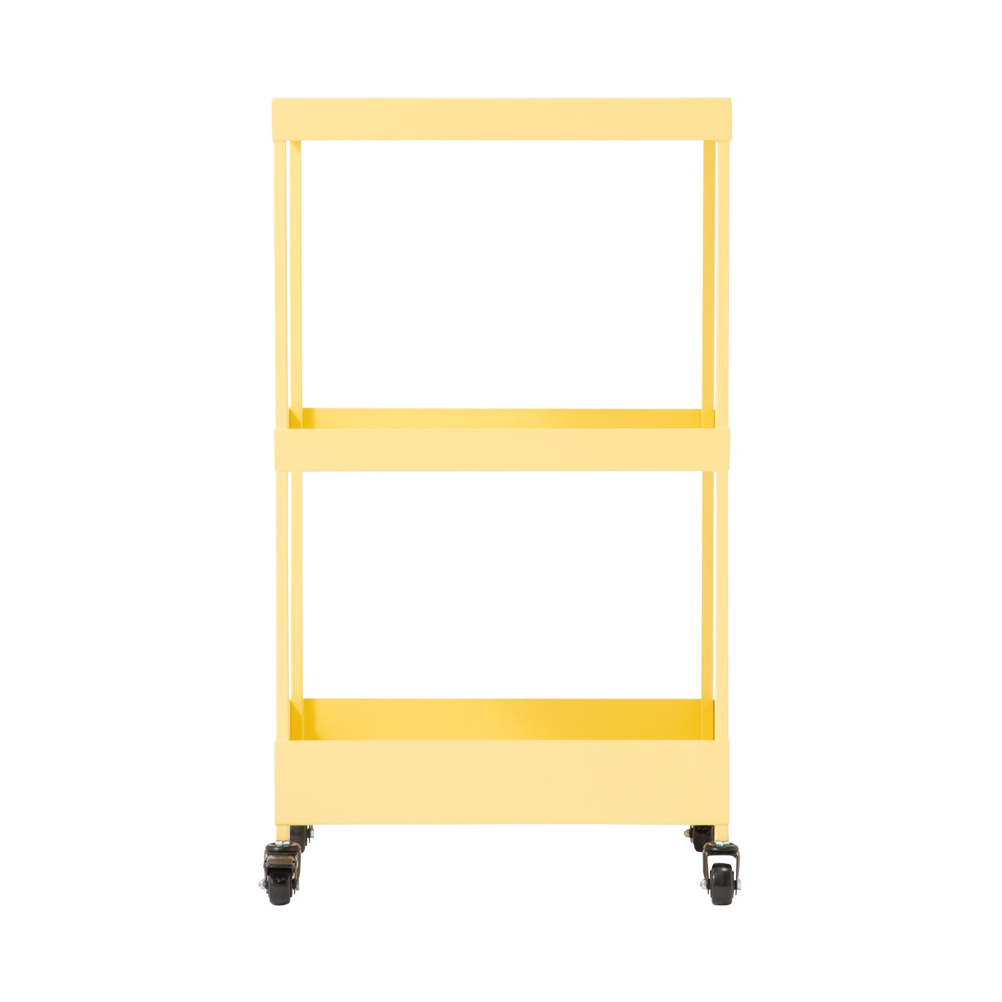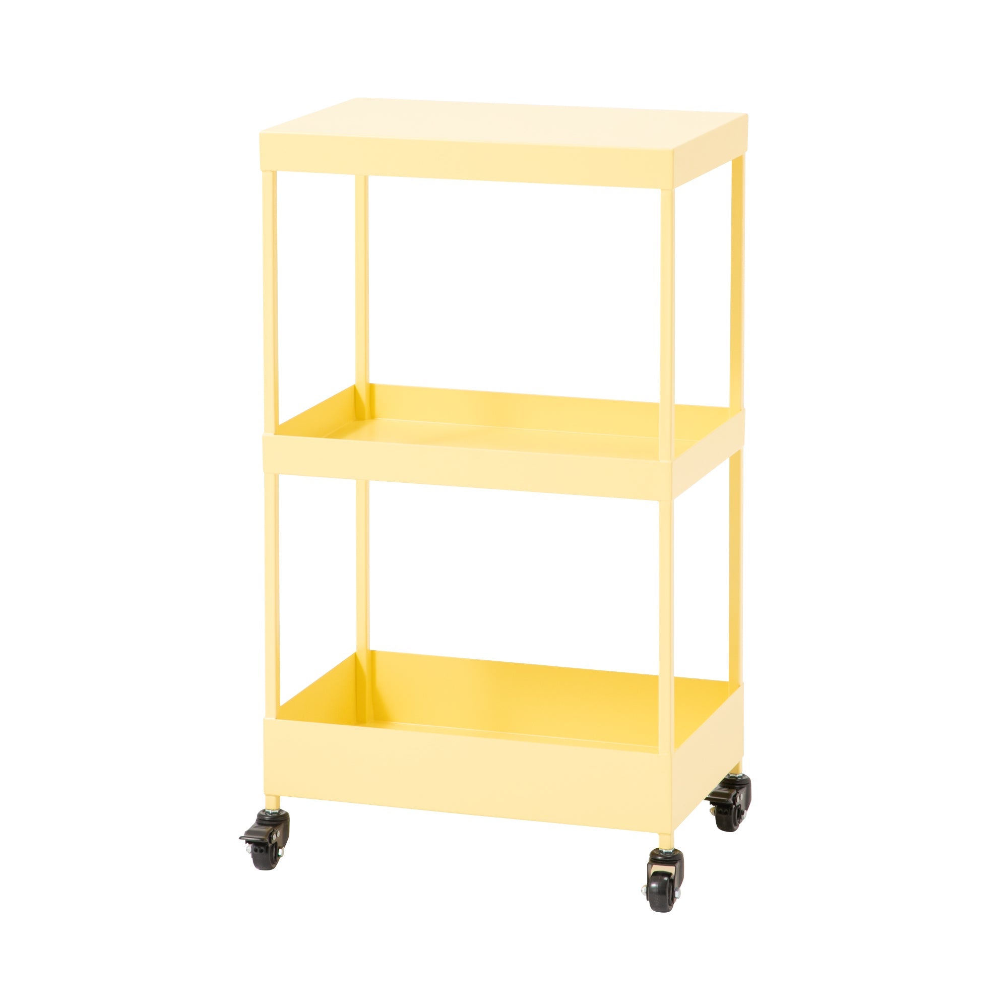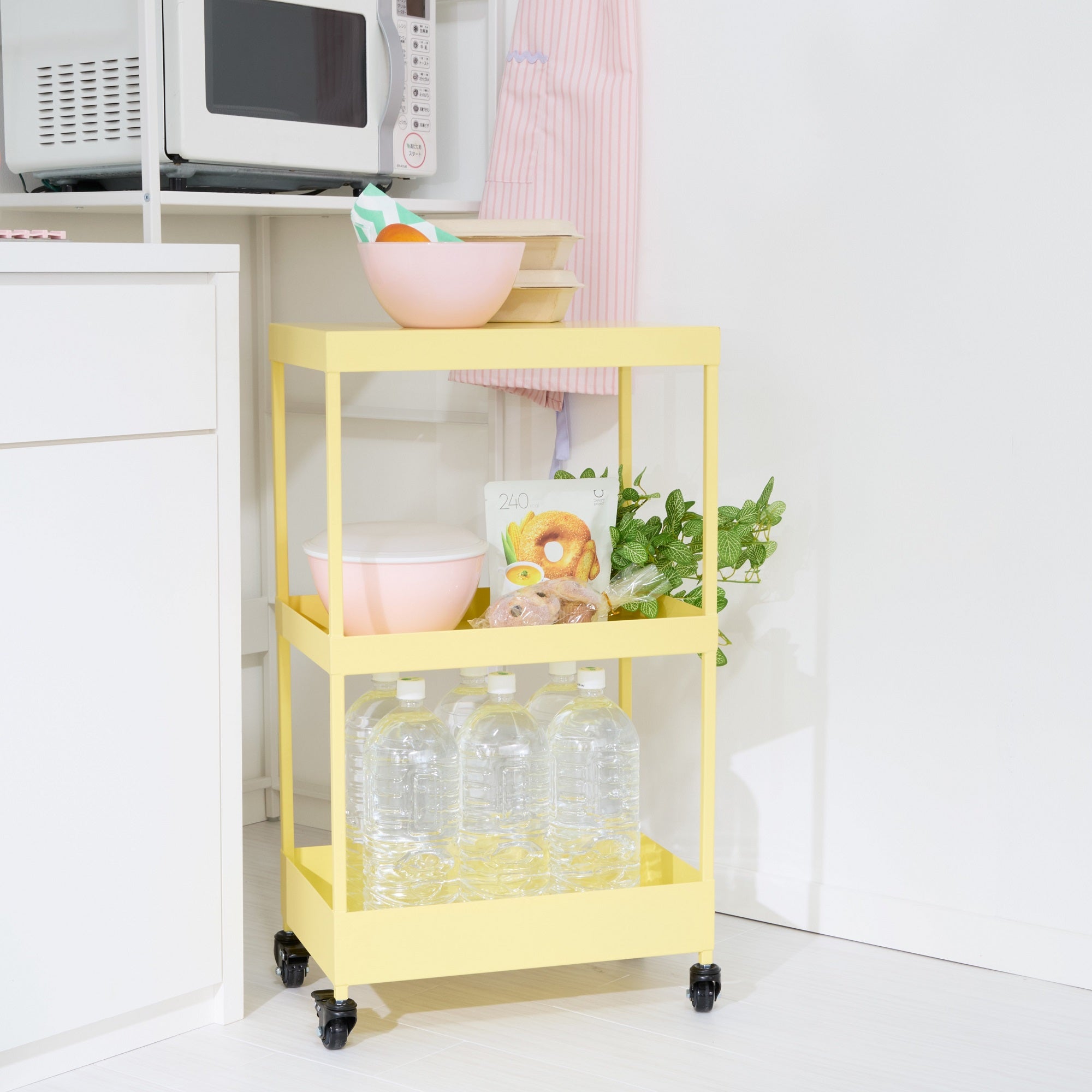 カラフルでお洒落なトレンドカラーが目を引くワゴンです。いろいろなシーンでさまざまな使い方ができるように、タオルや2Lペットボトル、柔軟剤やA4用紙など、様々なアイテムが収納+取り出しのしやすいサイズ感に設計しました。天板はフラットな仕様で、ダイニングテーブルよりもやや高めの設計にしているから、一人暮らしのキッチンでの調理台やデスクワーク時のサブデスクとしてもご使用いただけます。キャスターを取り付けるだけの簡単組み立てなのも嬉しいポイントです。生活に色と彩りを与える楽しさを表現して、「メリー/MERRY=楽しい・にぎやかな」と名付けました。耐荷重:天板5kg、中段5kg、下段12kg