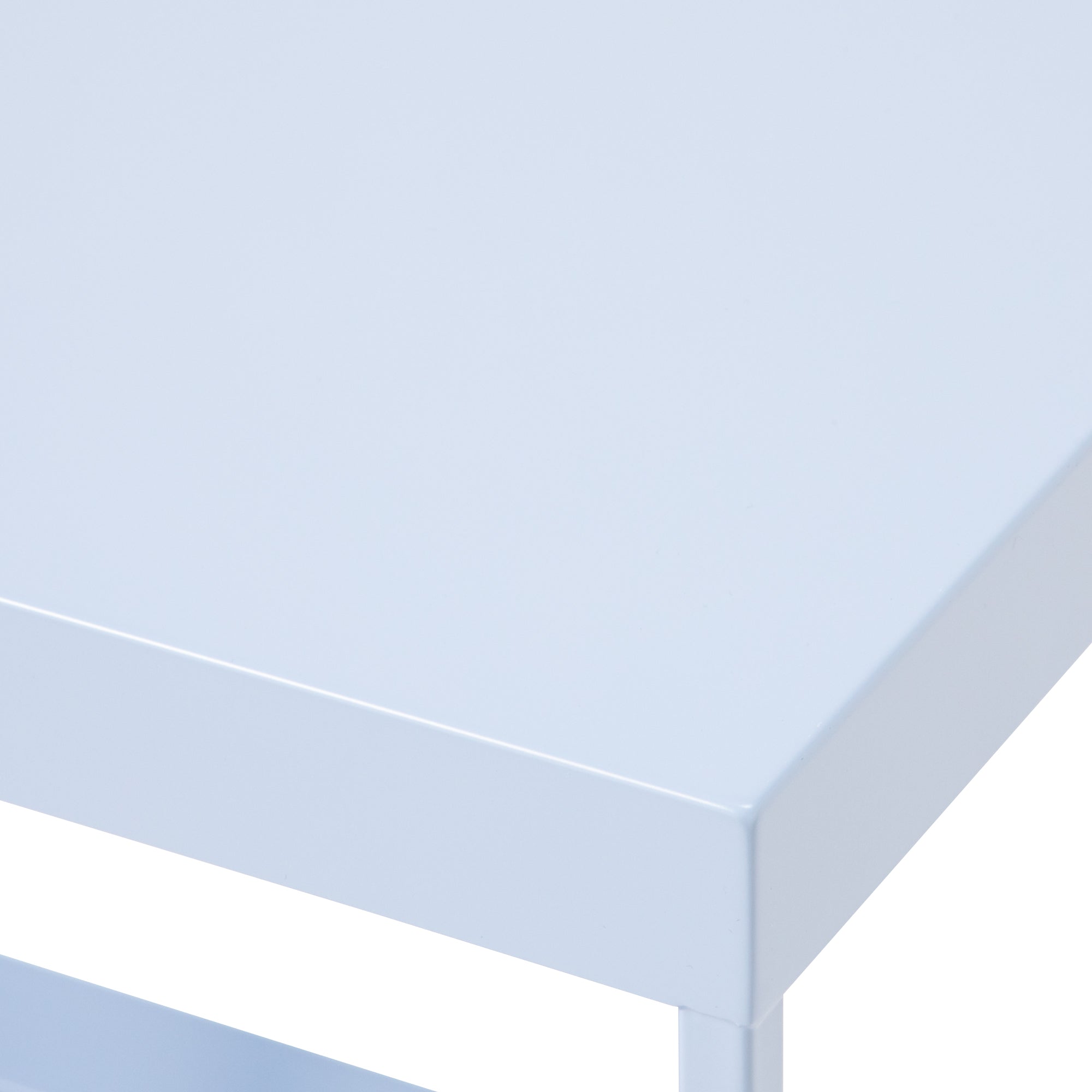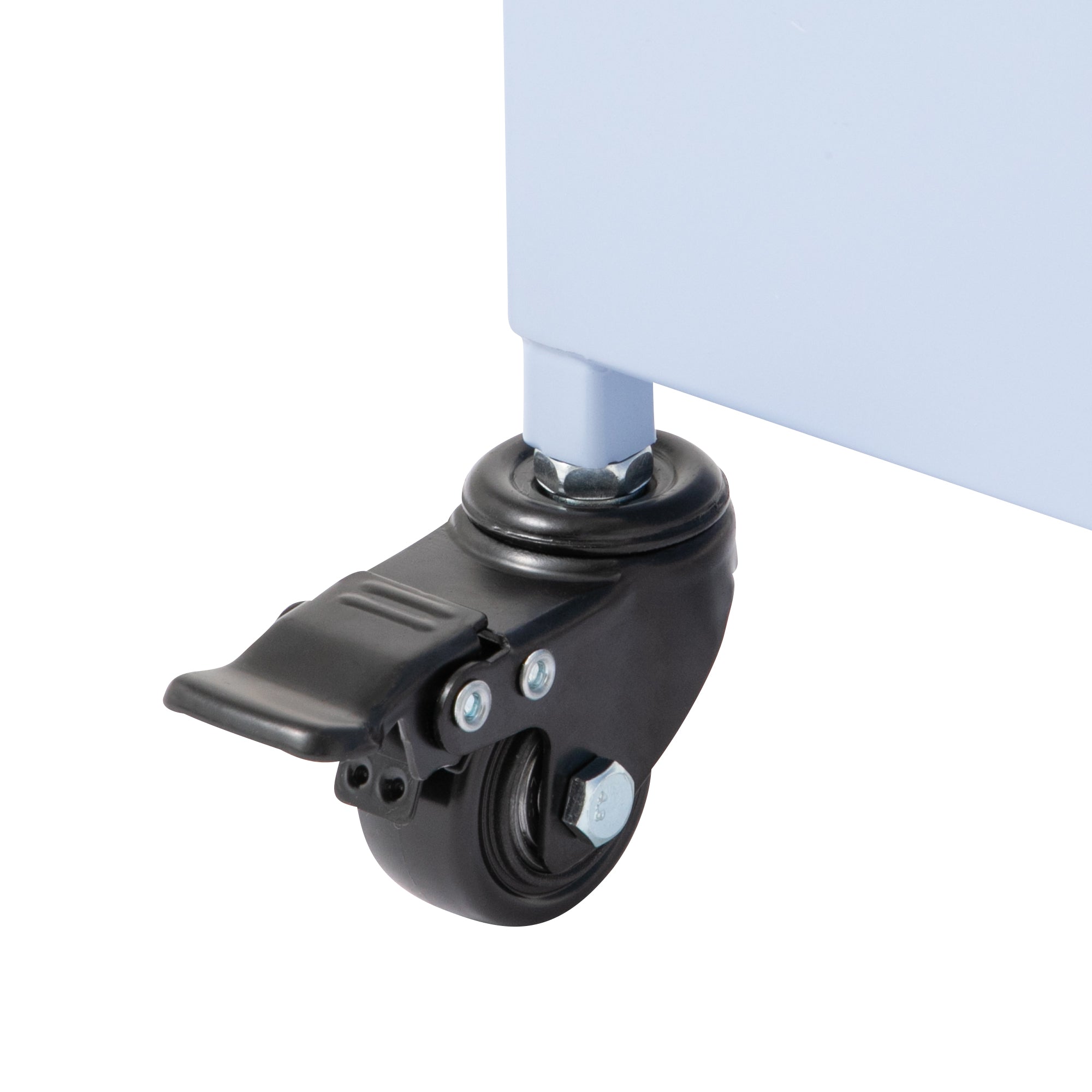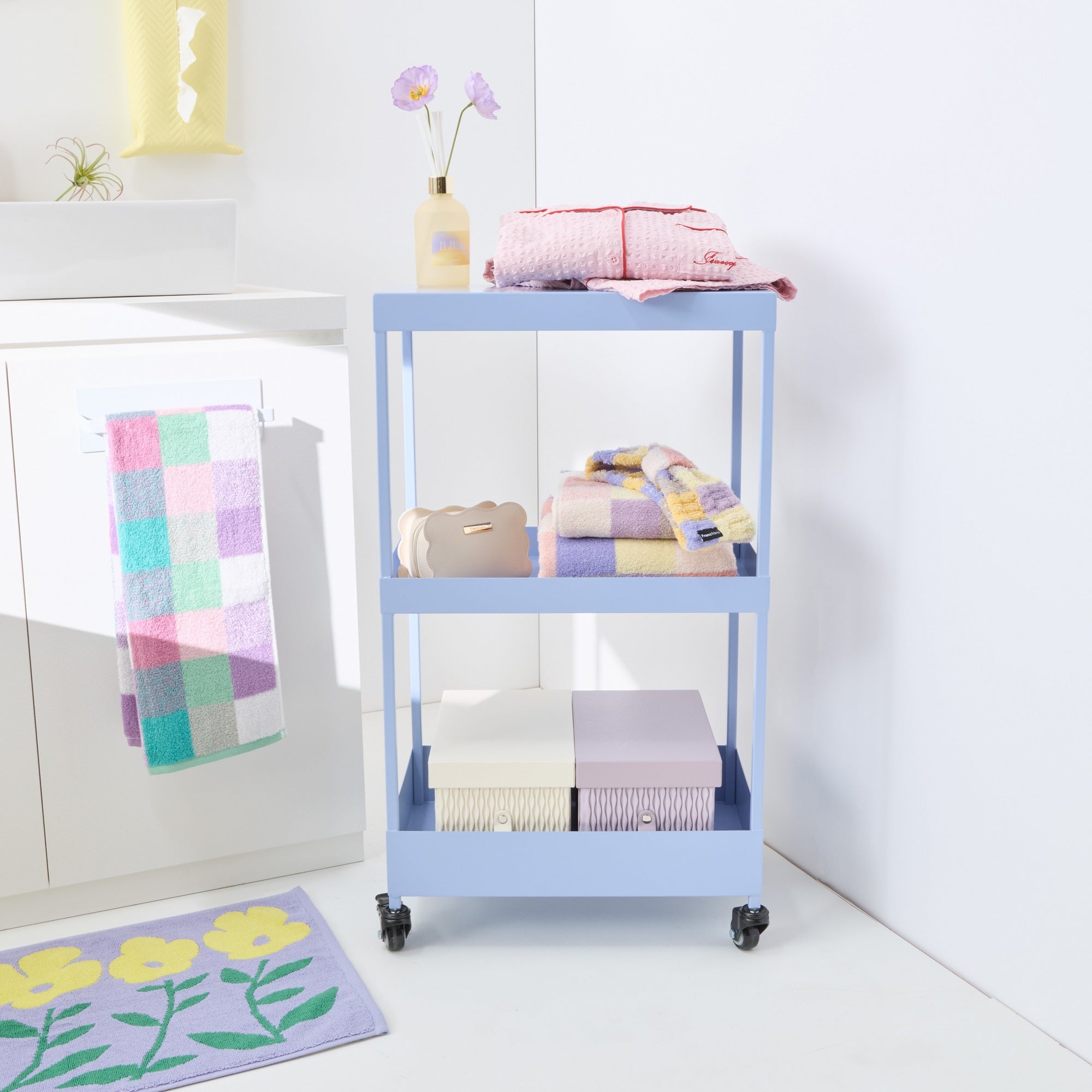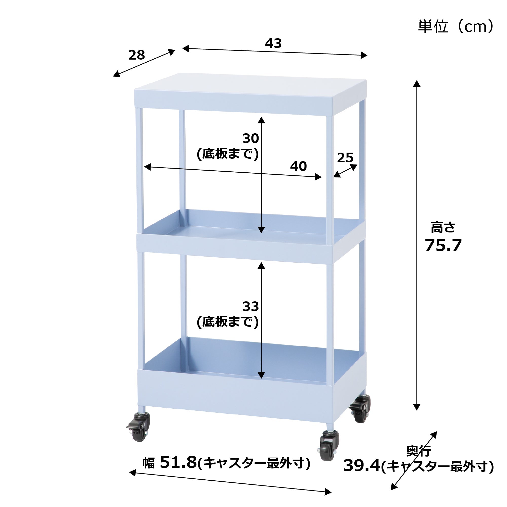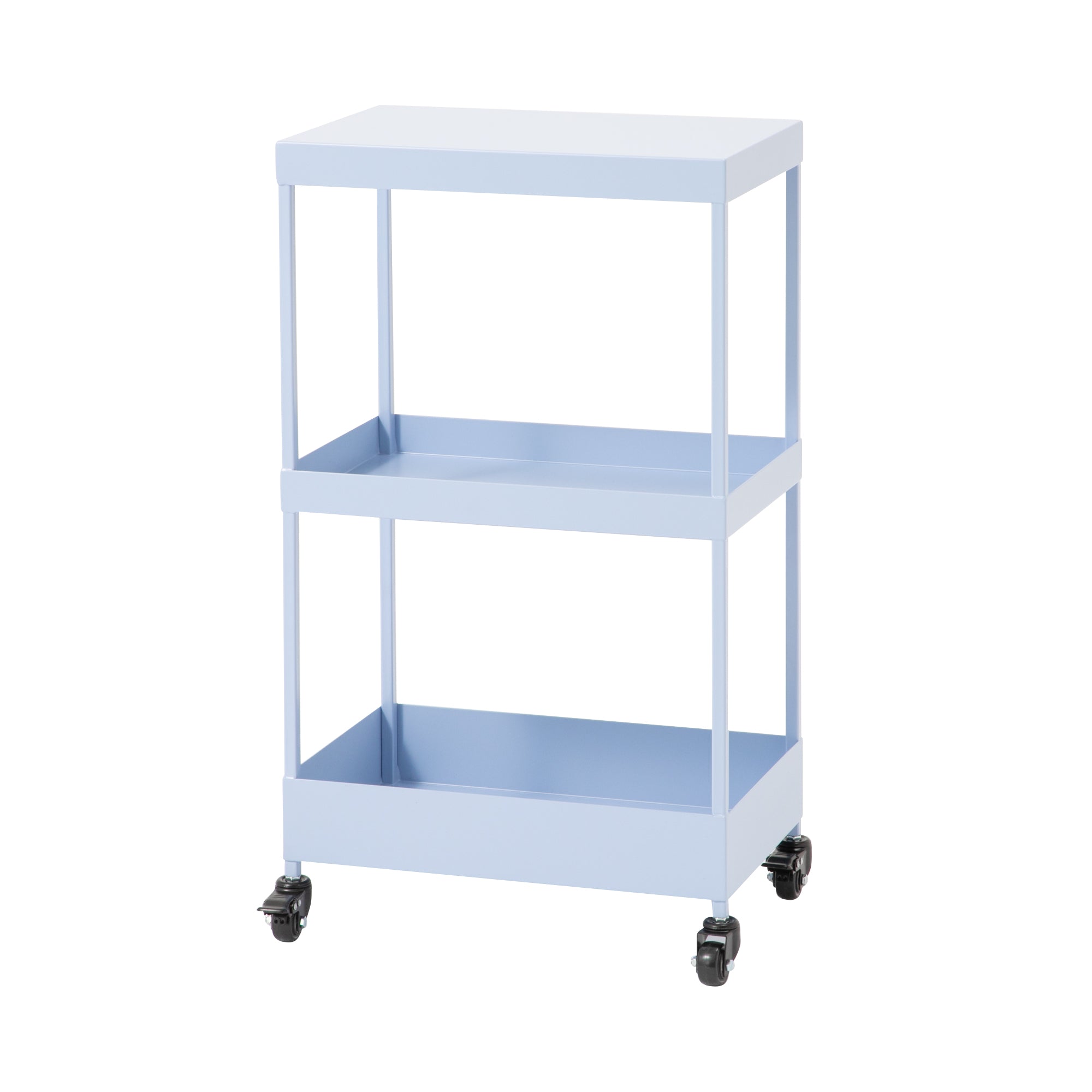 カラフルでお洒落なトレンドカラーが目を引くワゴンです。いろいろなシーンでさまざまな使い方ができるように、タオルや2Lペットボトル、柔軟剤やA4用紙など、様々なアイテムが収納+取り出しのしやすいサイズ感に設計しました。天板はフラットな仕様で、ダイニングテーブルよりもやや高めの設計にしているから、一人暮らしのキッチンでの調理台やデスクワーク時のサブデスクとしてもご使用いただけます。キャスターを取り付けるだけの簡単組み立てなのも嬉しいポイントです。生活に色と彩りを与える楽しさを表現して、「メリー/MERRY=楽しい・にぎやかな」と名付けました。耐荷重:天板5kg、中段5kg、下段12kg