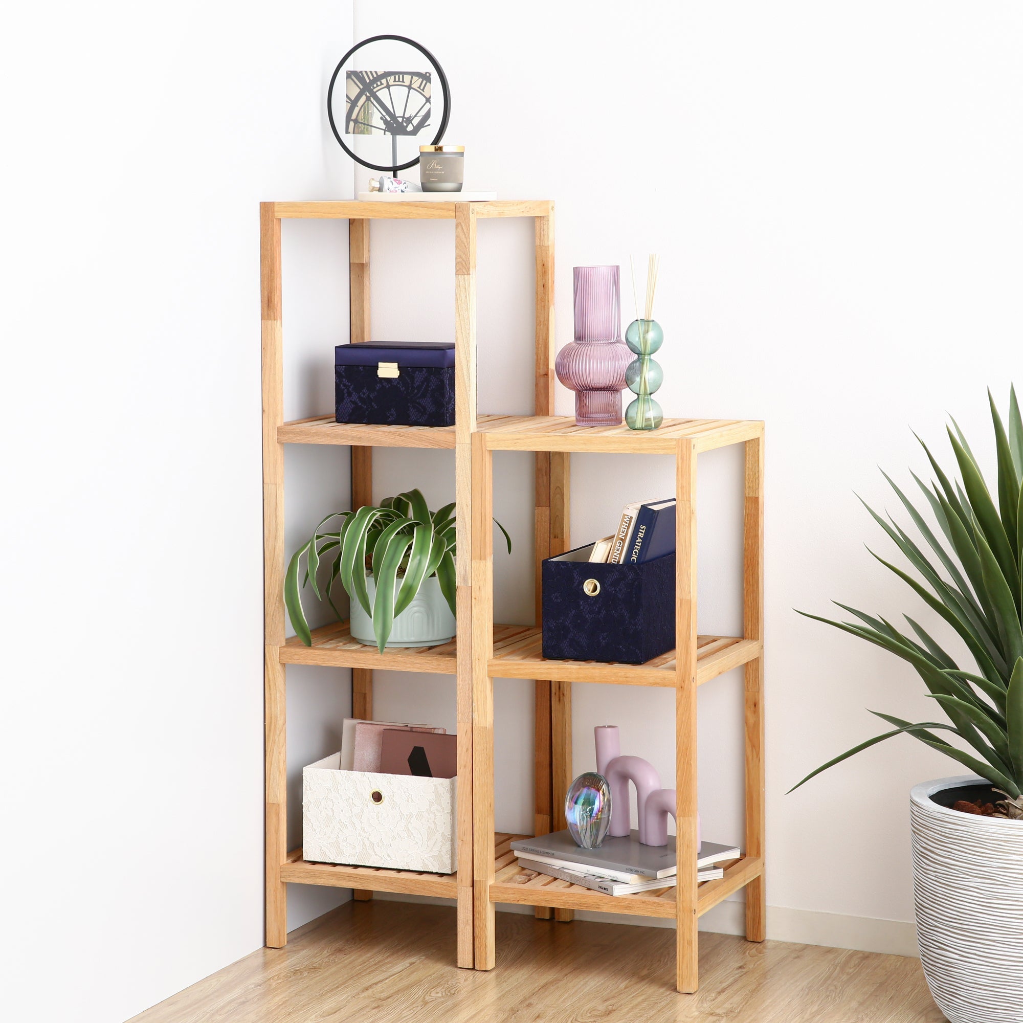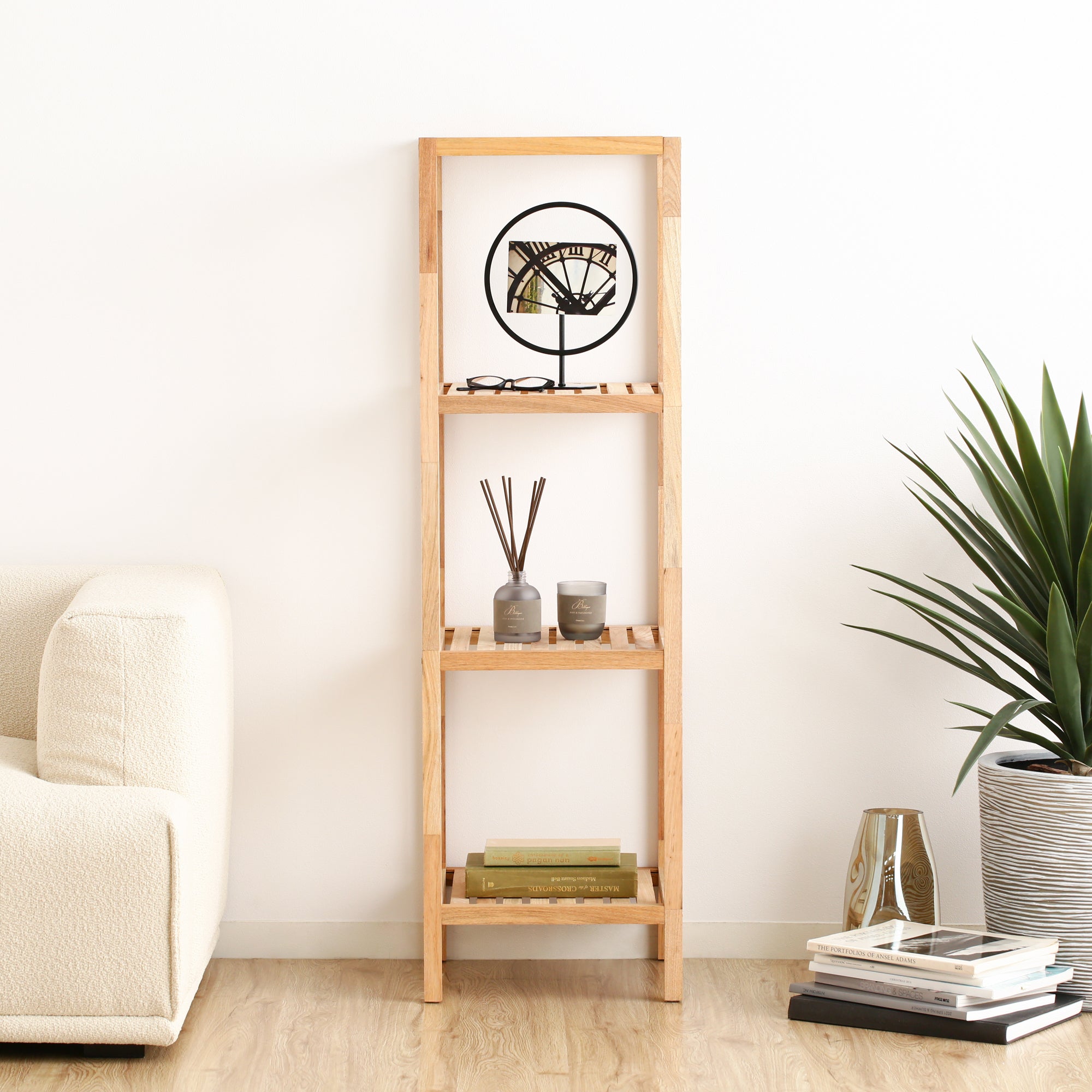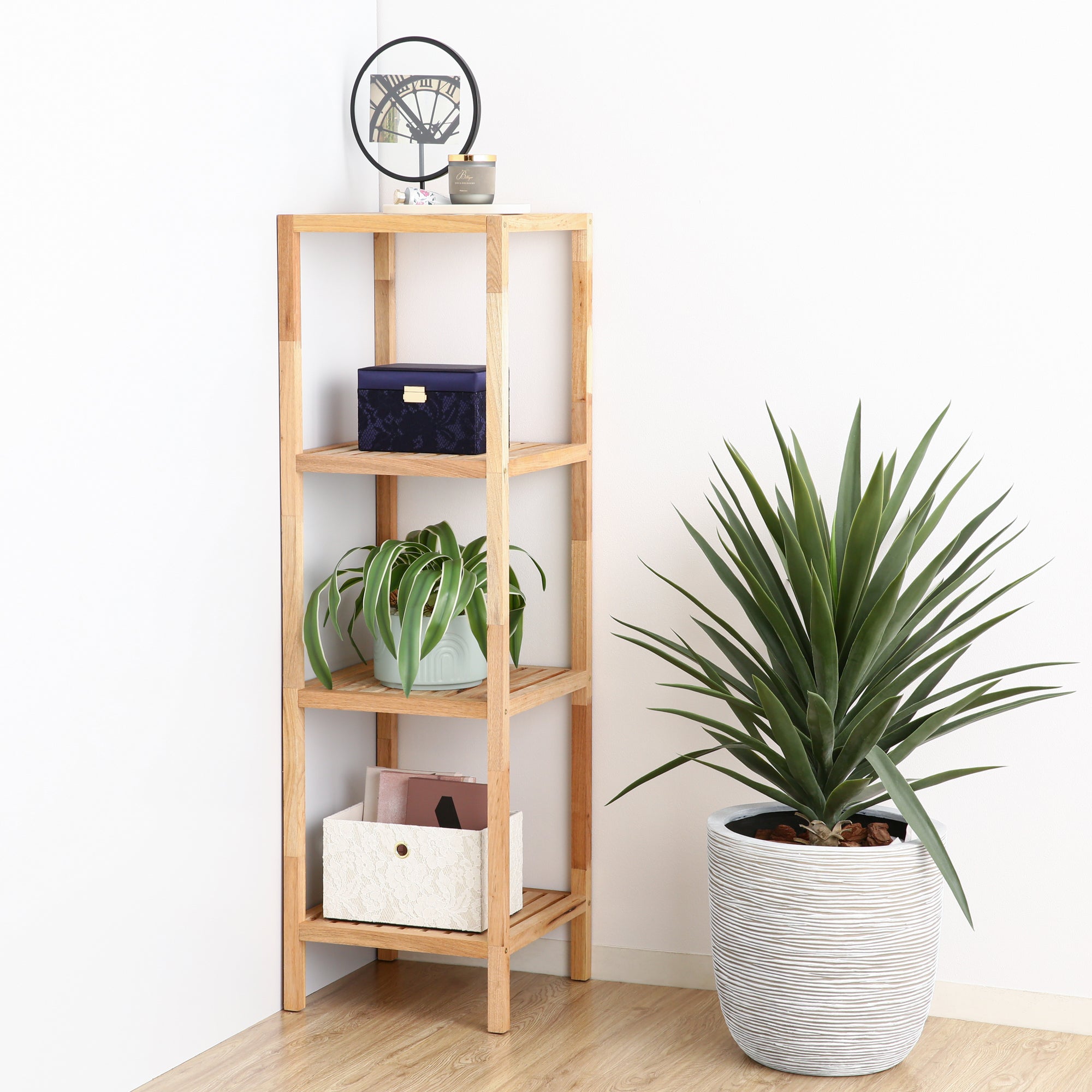 天然木の暖かみを感じる木製シェルフです。 部屋に馴染みやすいシンプルなデザインです。 リビング、ダイニング、洗面所など幅広いシーンにご利用いただけます。