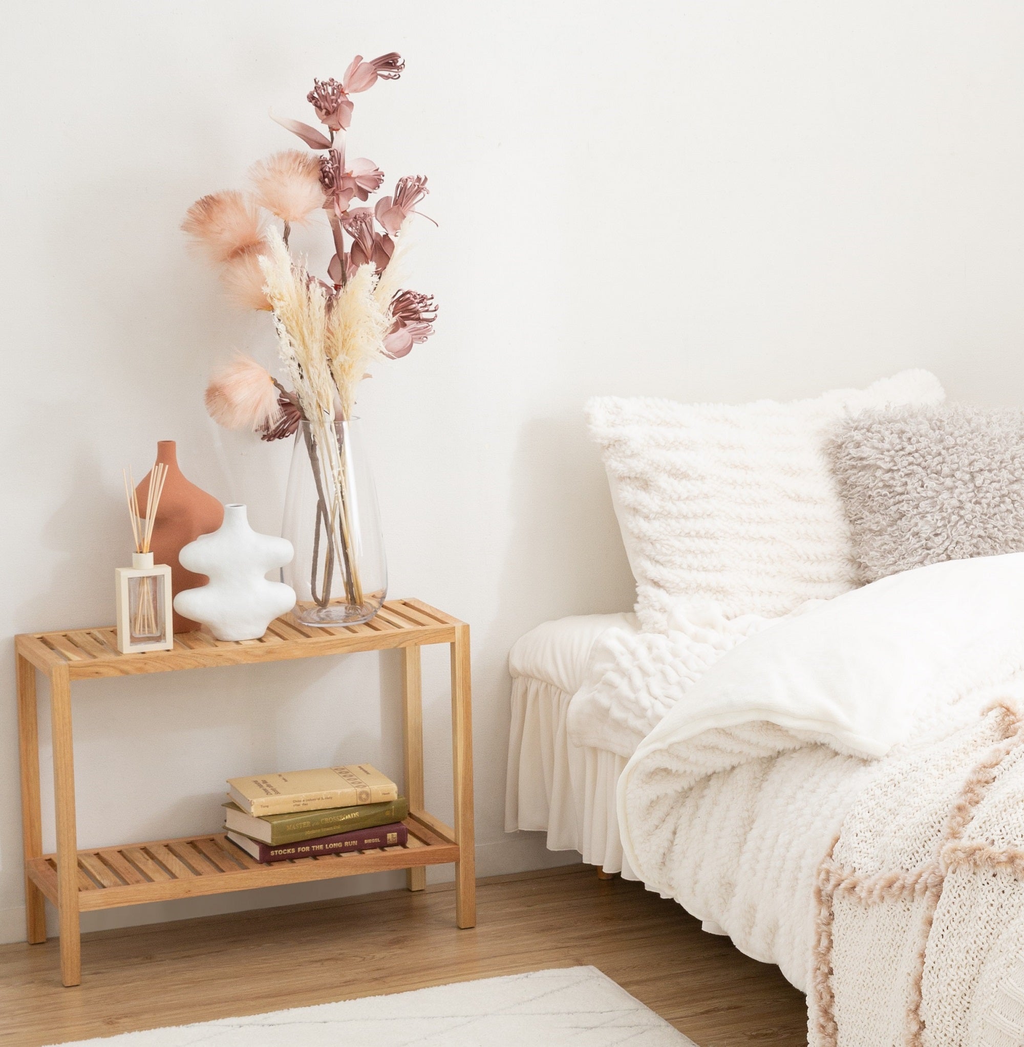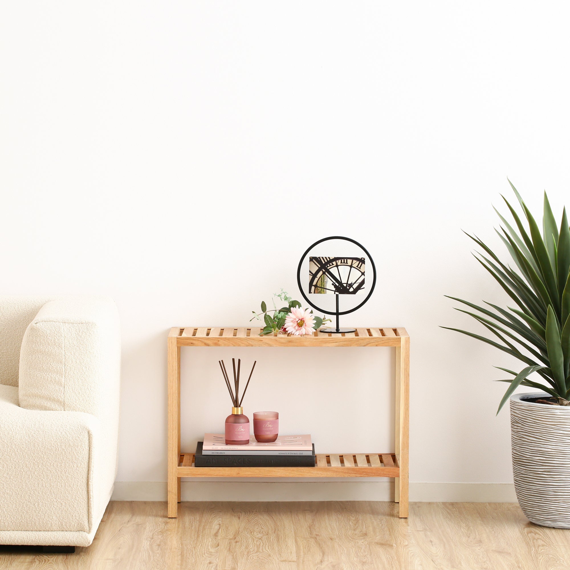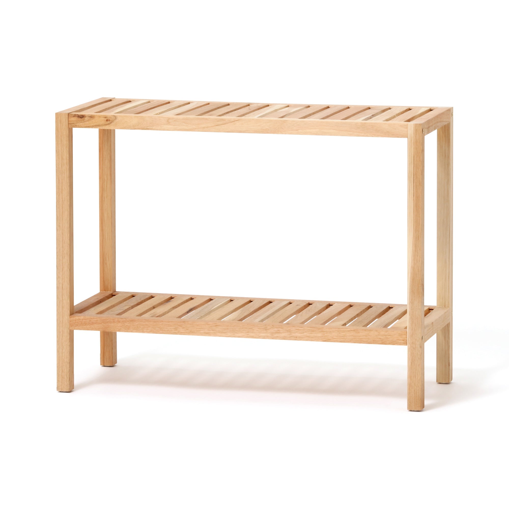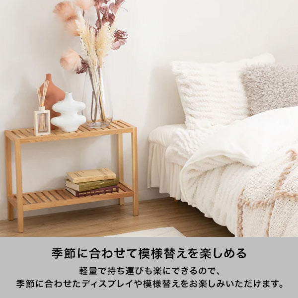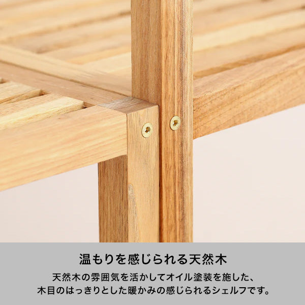 天然木の暖かみを感じる木製シェルフです。部屋に馴染みやすいシンプルなデザインです。リビング、ダイニング、洗面所など幅広いシーンにご利用いただけます。
