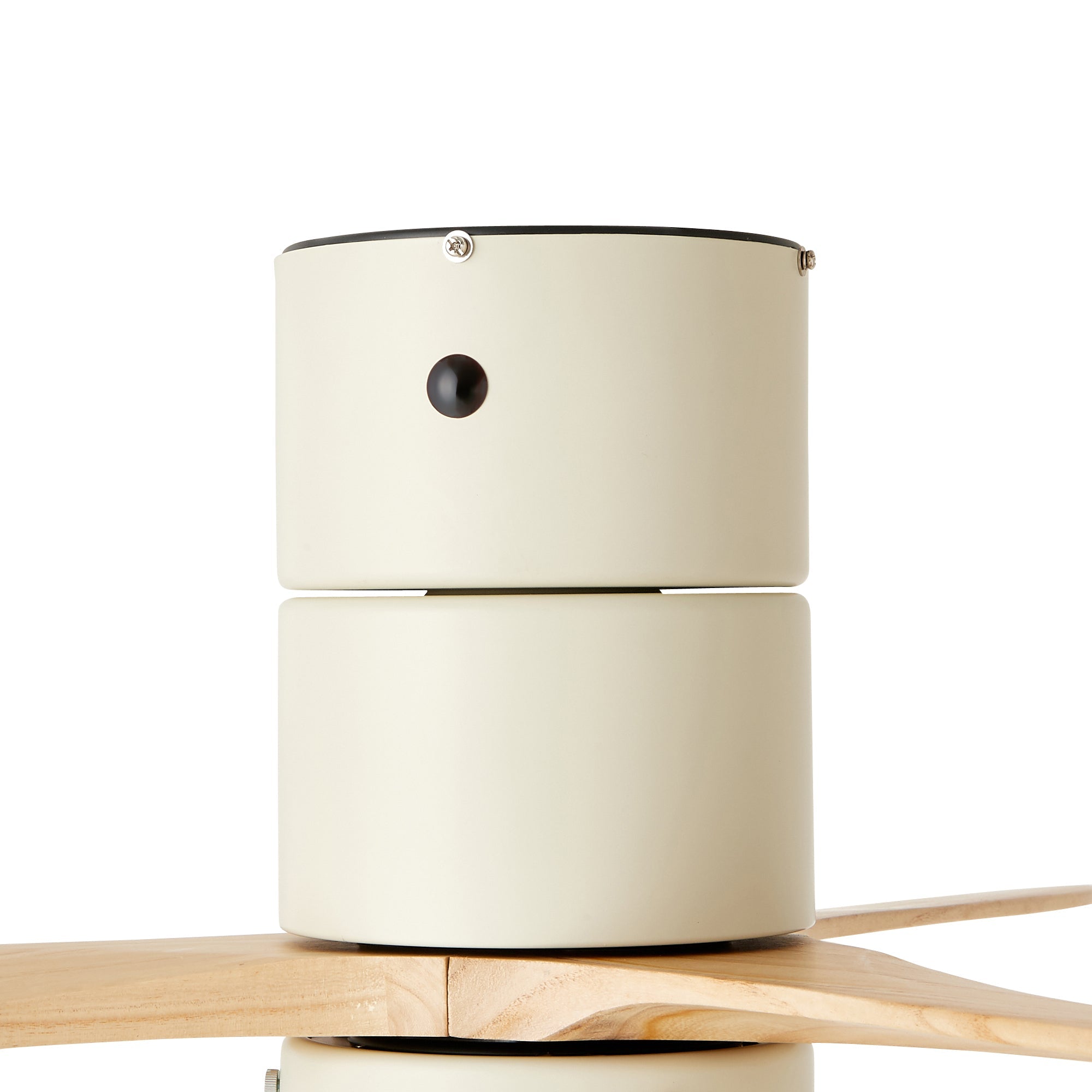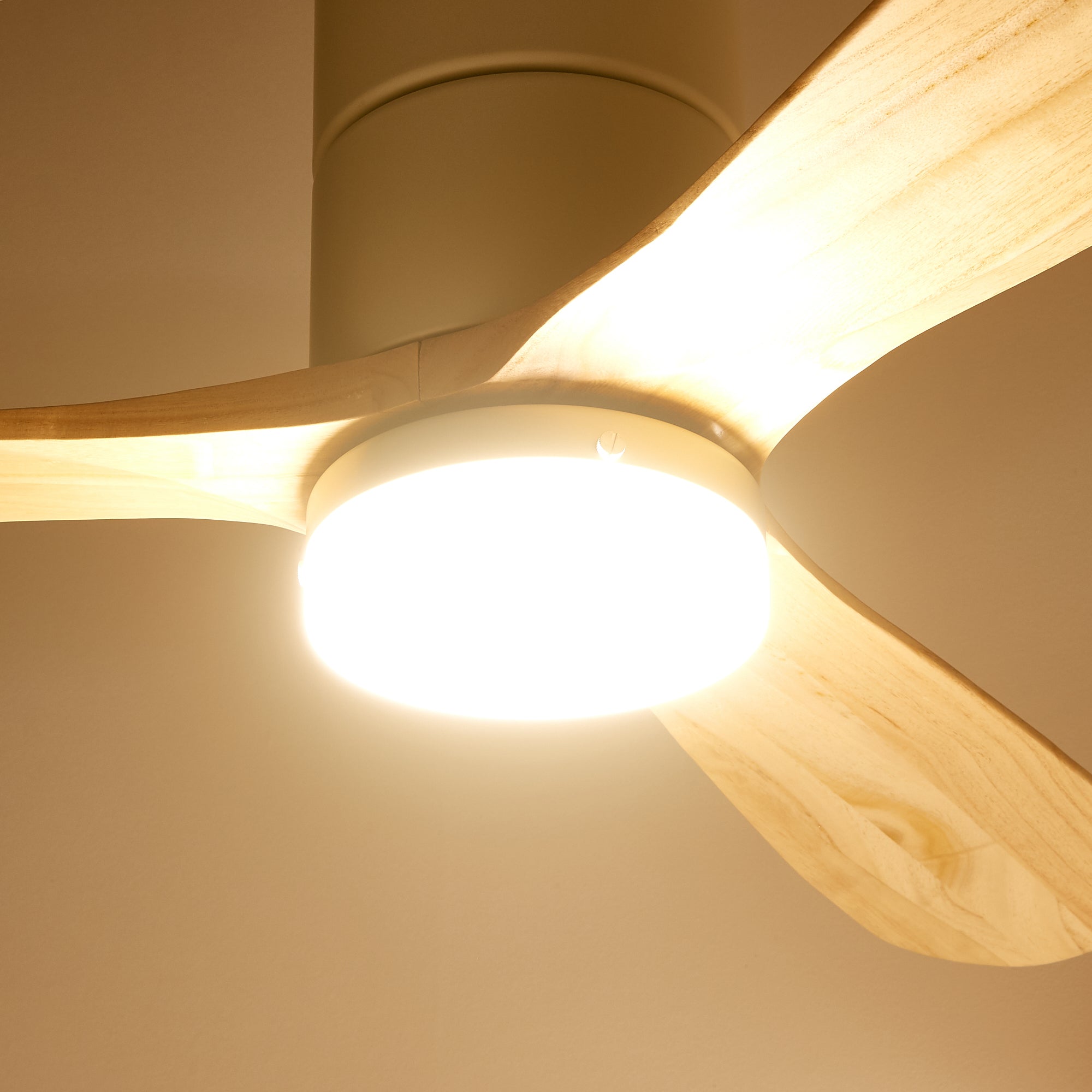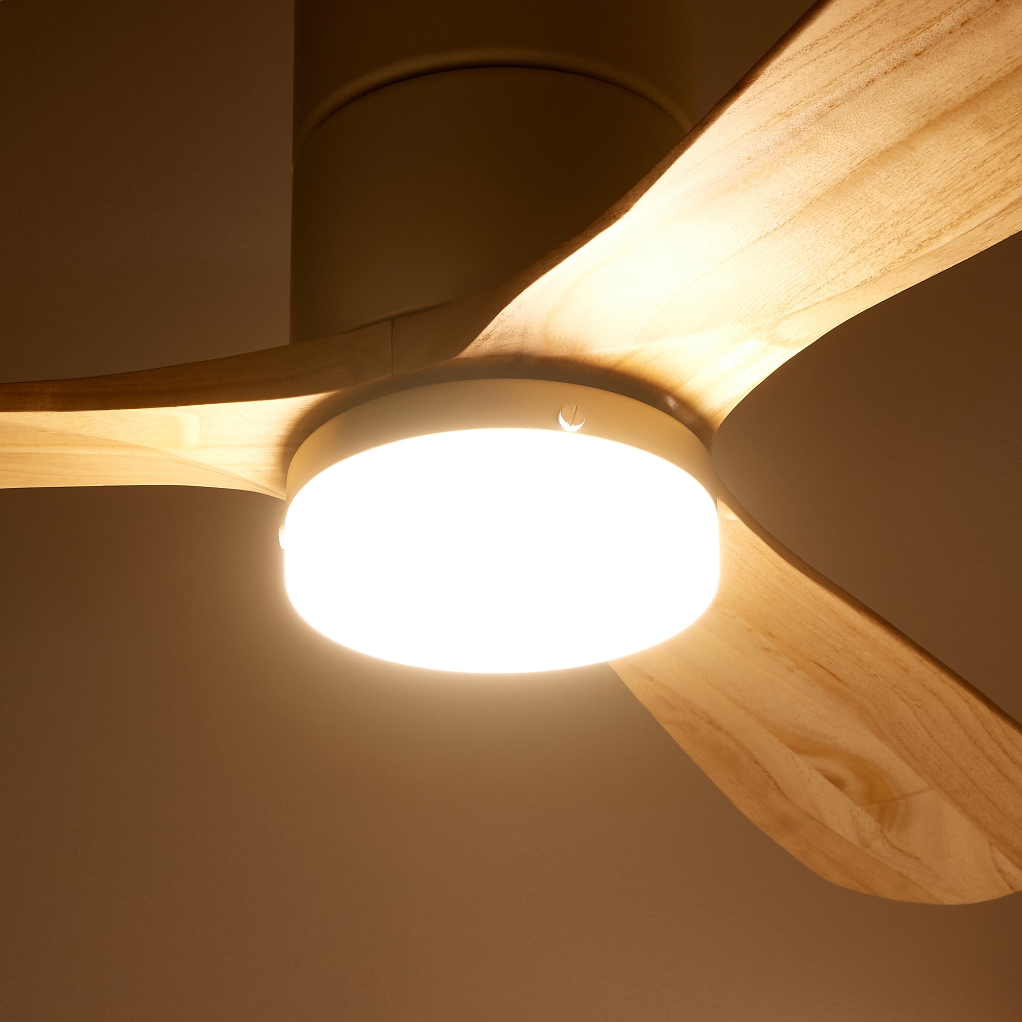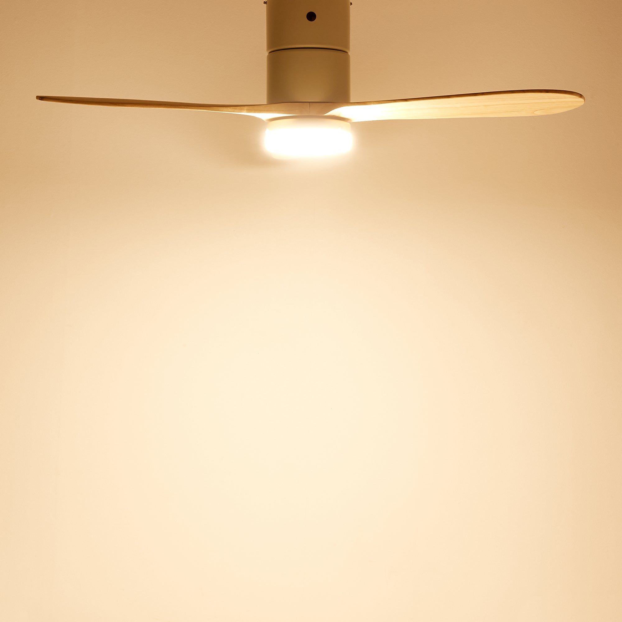 照明とファンが一体化したシーリングタイプのLEDライトです。リアルウッドを採用したブレードは集積材とは違い無垢の木材で、質感はしっとりと滑らかです。しっかりとした厚みがあり、優美な形状です。LED内蔵なので電球交換の必要はなく、内蔵だから実現できるすっきりとしたデザインです。4段階の調光機能はお部屋やシーンに合わせて調節が可能です。部屋の空気を循環させることでエアコンの節電になるシーリングファンは1年中使える1台2役のとても便利な製品です。