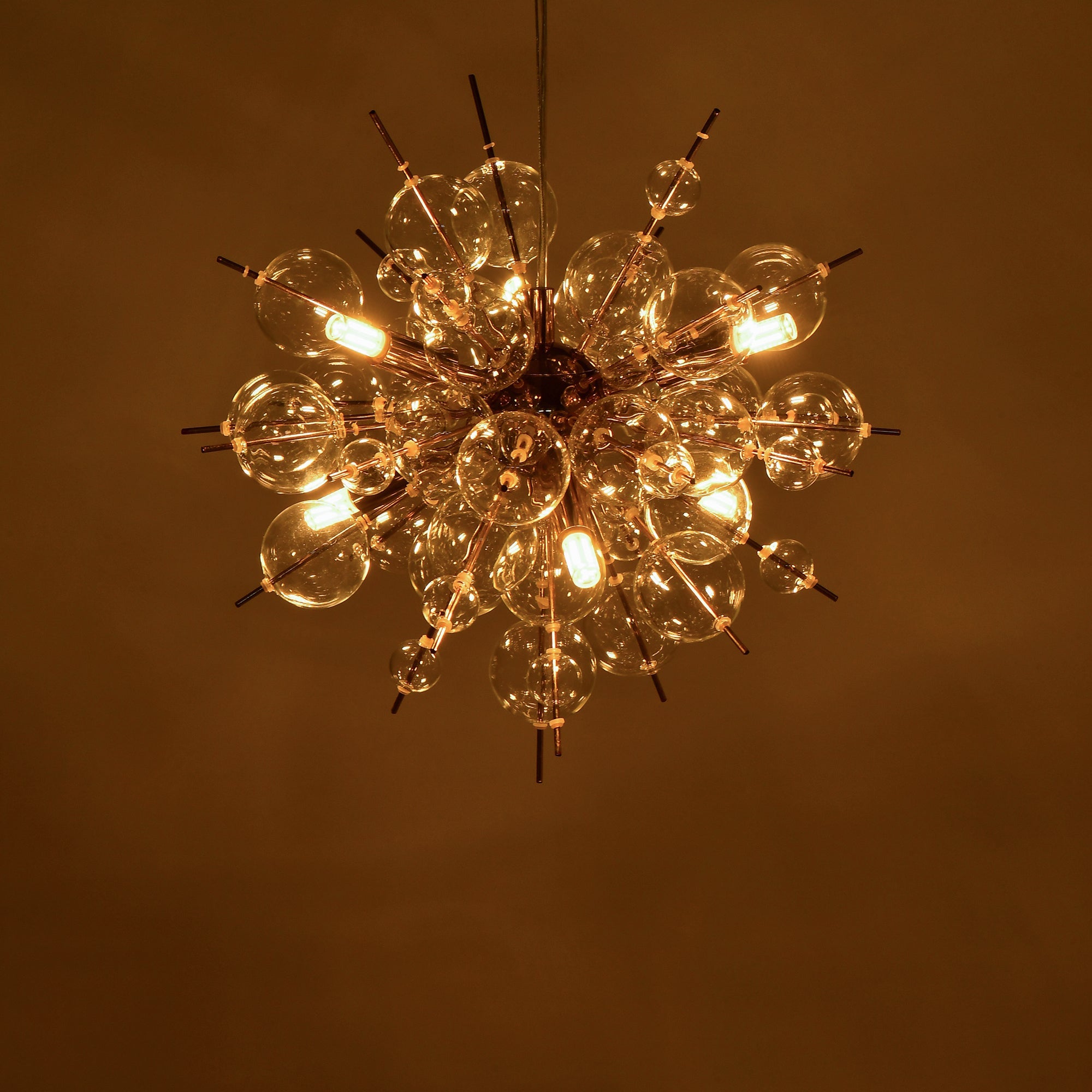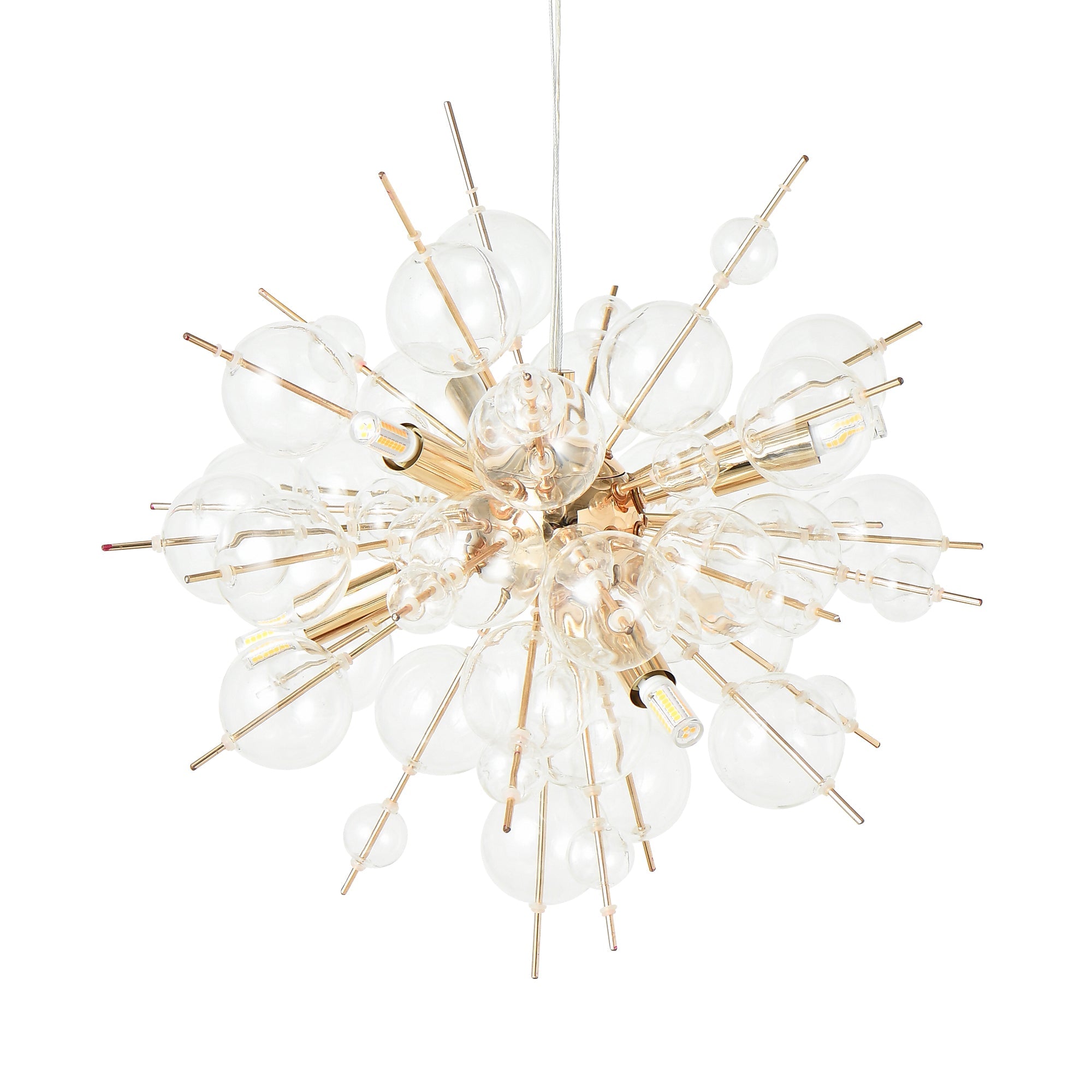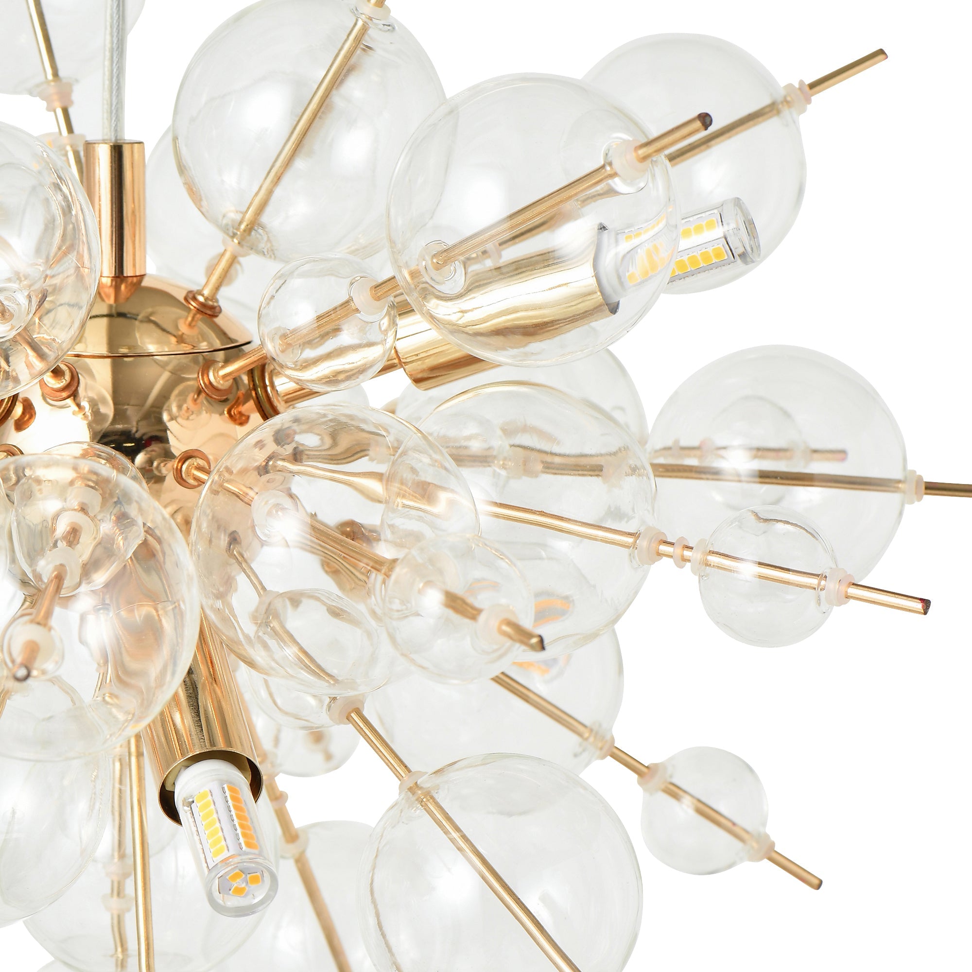 インテリアの主役になるバブルシャンデリアです。ゴールド×クリアガラスなので、個性的ながらもコーディネートしやすい仕上がりです。シャボン玉のようなガラスが幻想的な光の輝きを描き出します。6灯・2580lm相当の明るさで5畳程度の空間に適しています。複数使いや、他の照明との組み合わせでの使用もおすすめです。