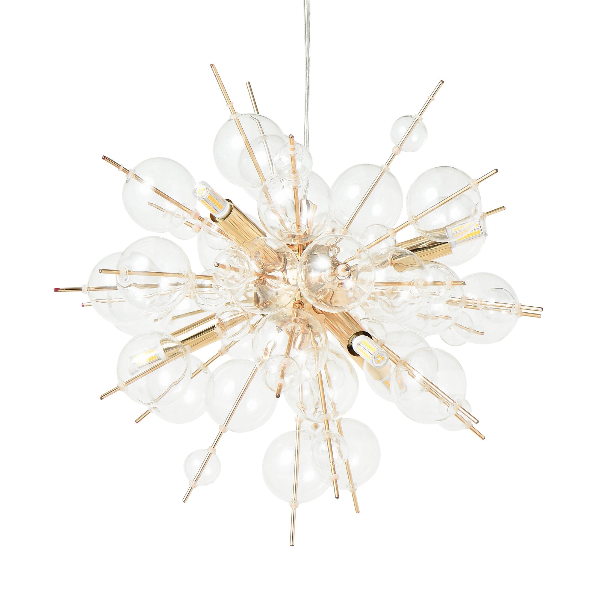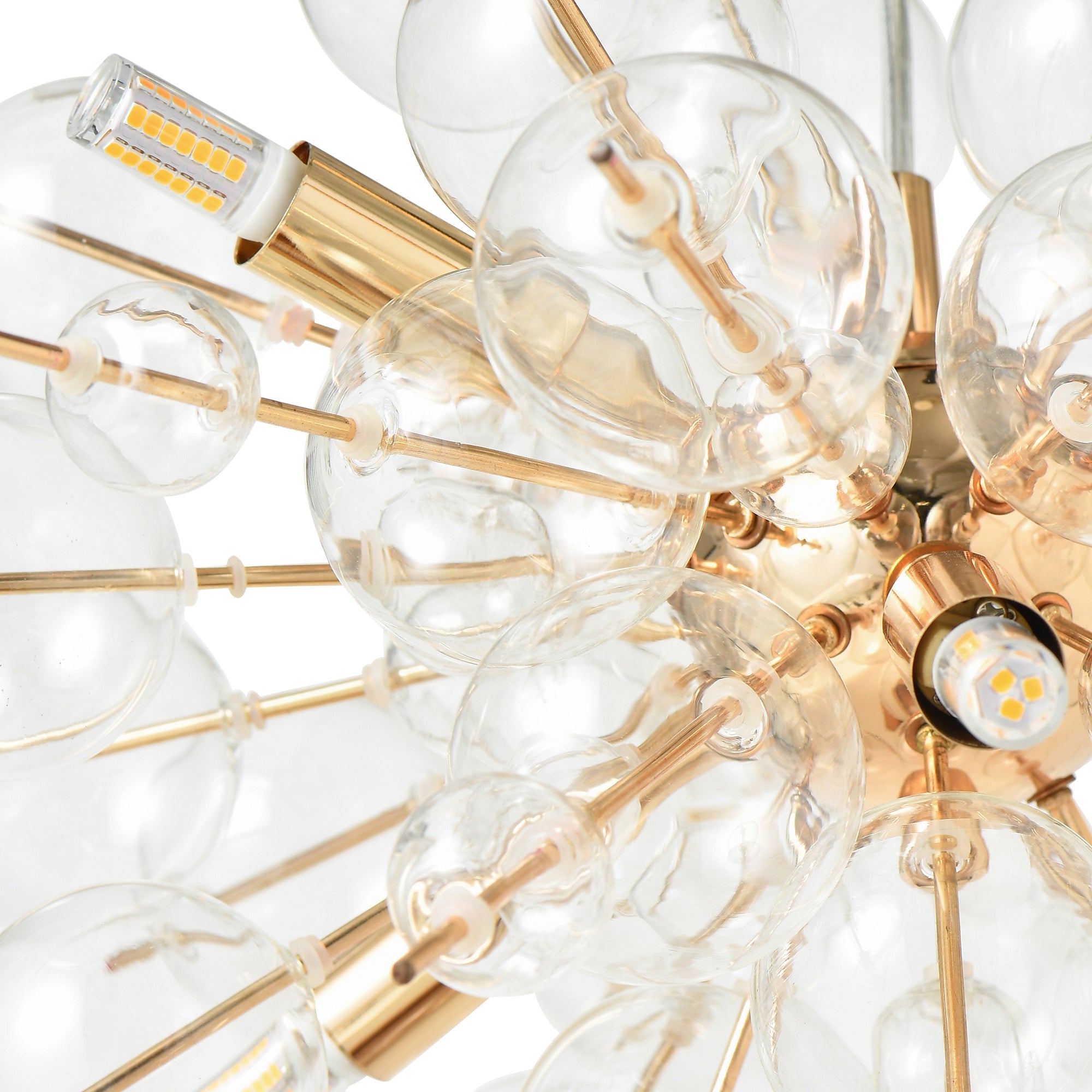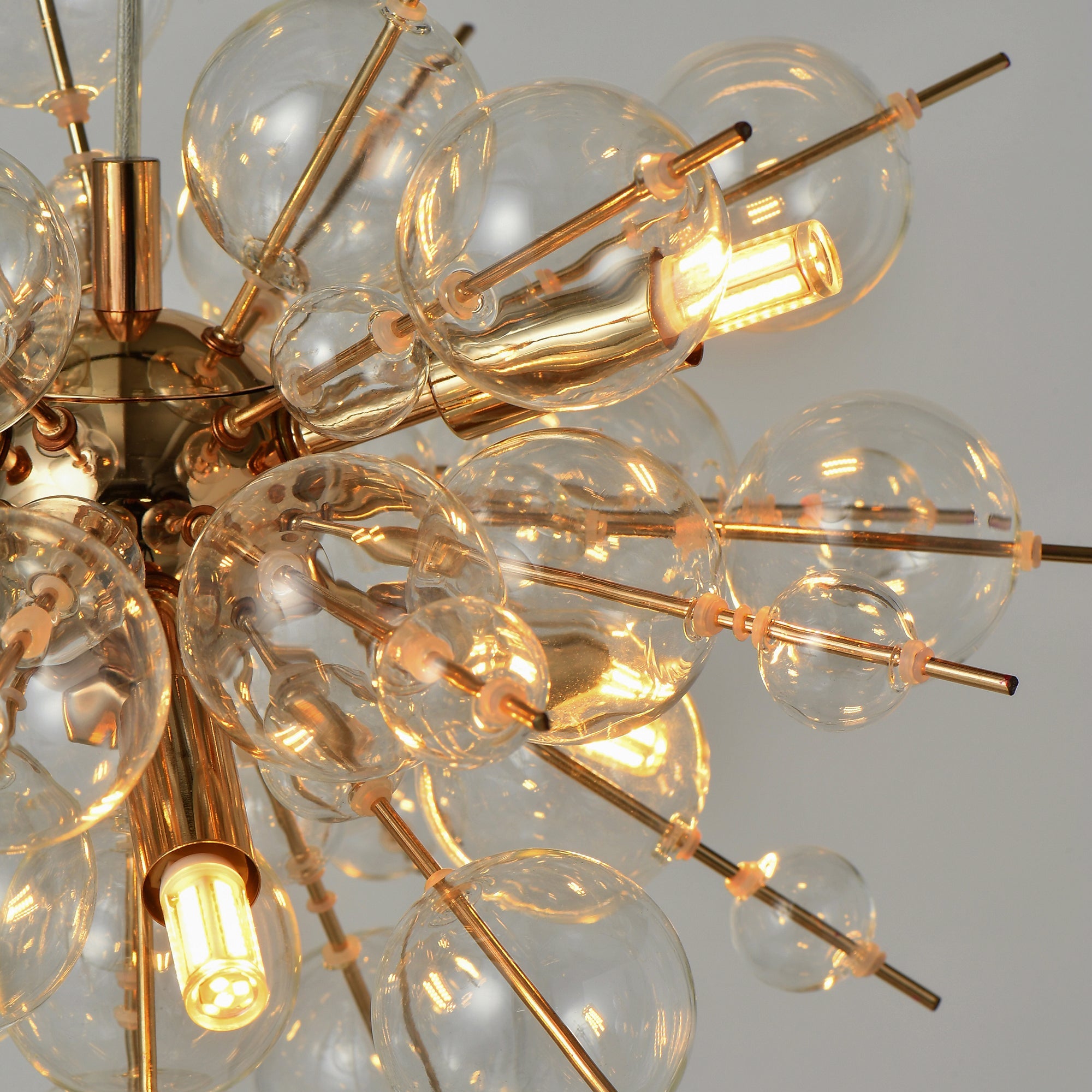 インテリアの主役になるバブルシャンデリアです。ゴールド×クリアガラスなので、個性的ながらもコーディネートしやすい仕上がりです。シャボン玉のようなガラスが幻想的な光の輝きを描き出します。6灯・2580lm相当の明るさで5畳程度の空間に適しています。複数使いや、他の照明との組み合わせでの使用もおすすめです。