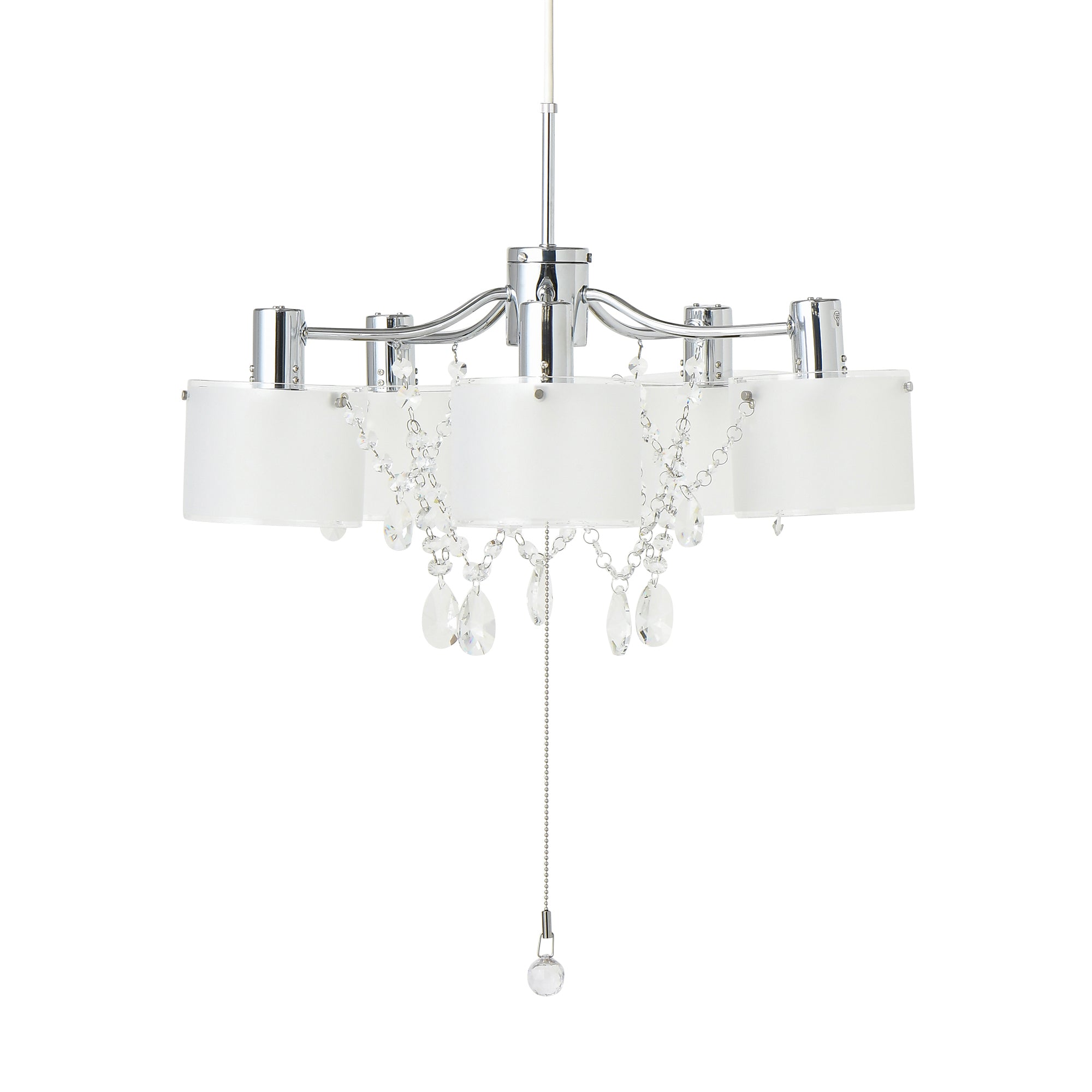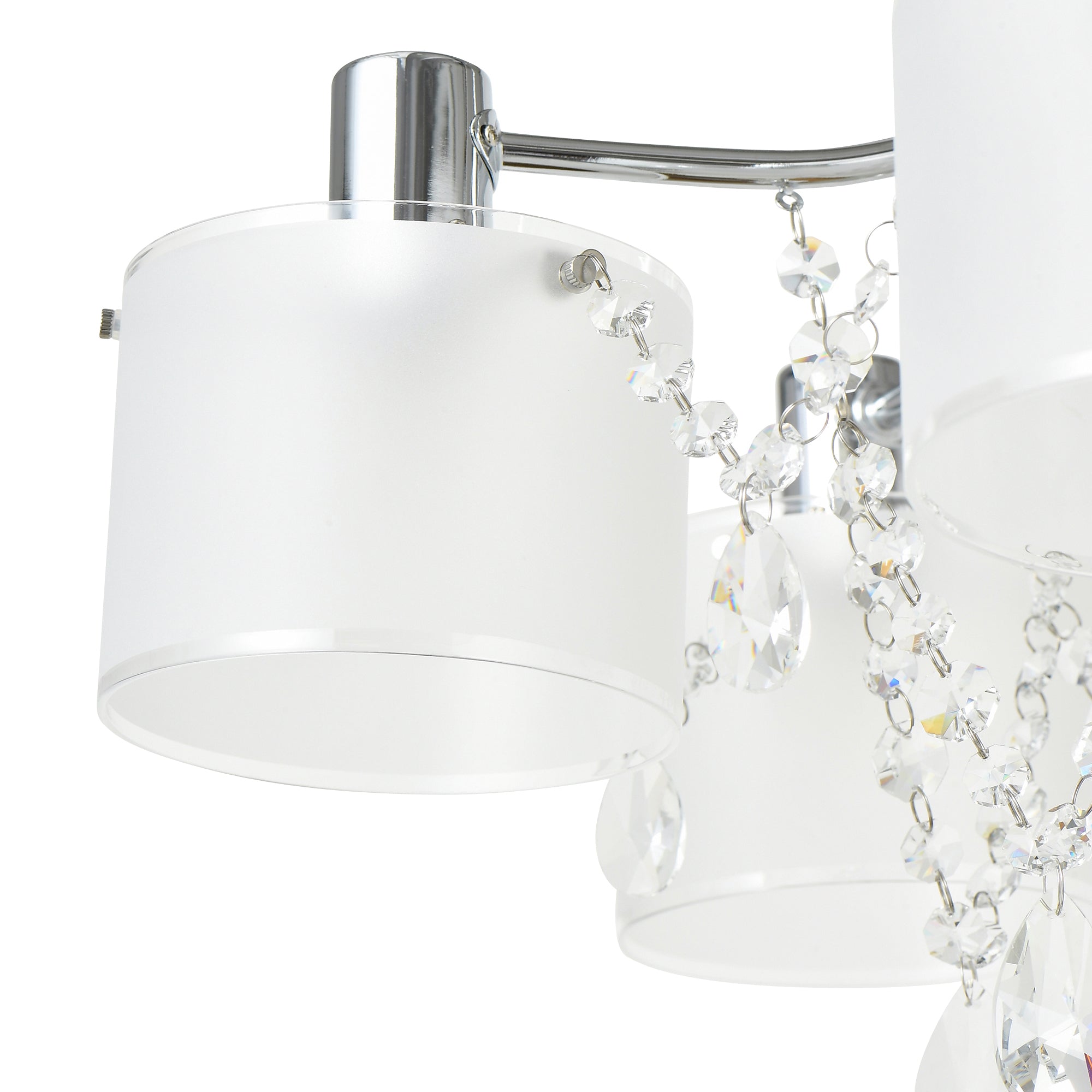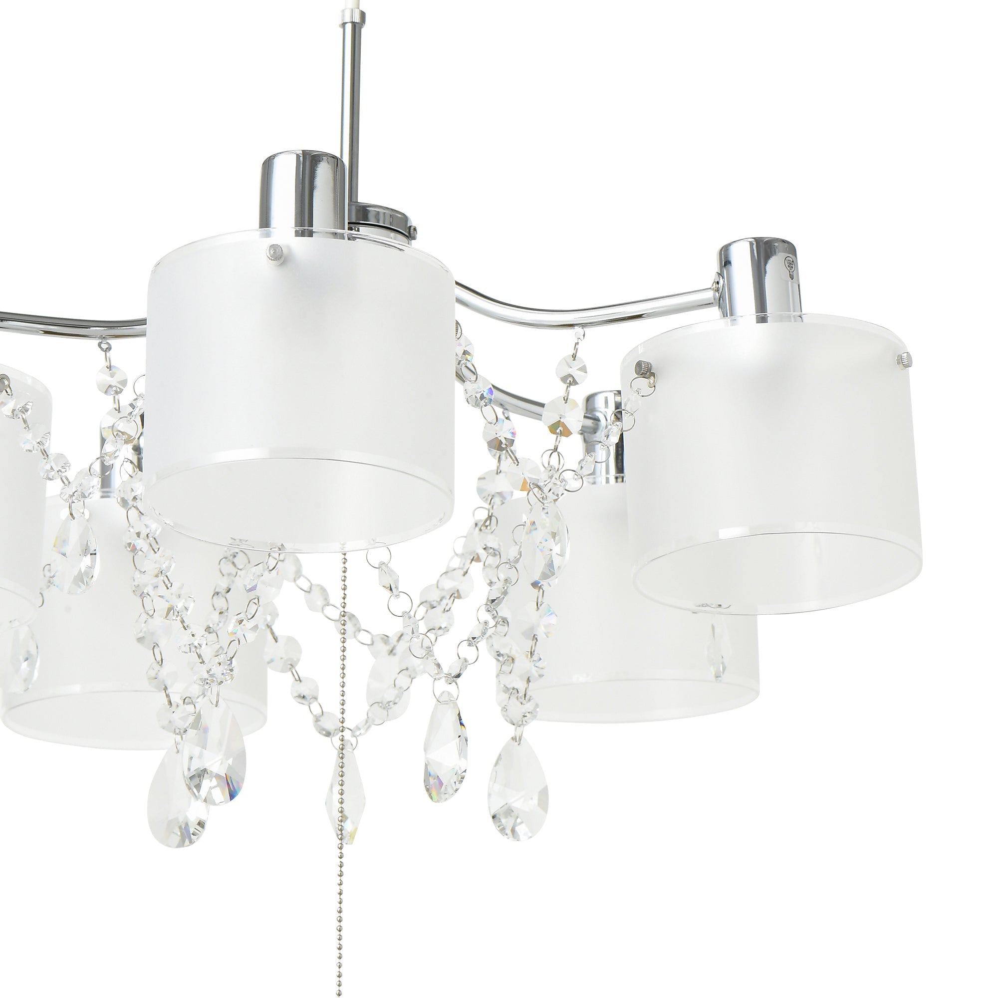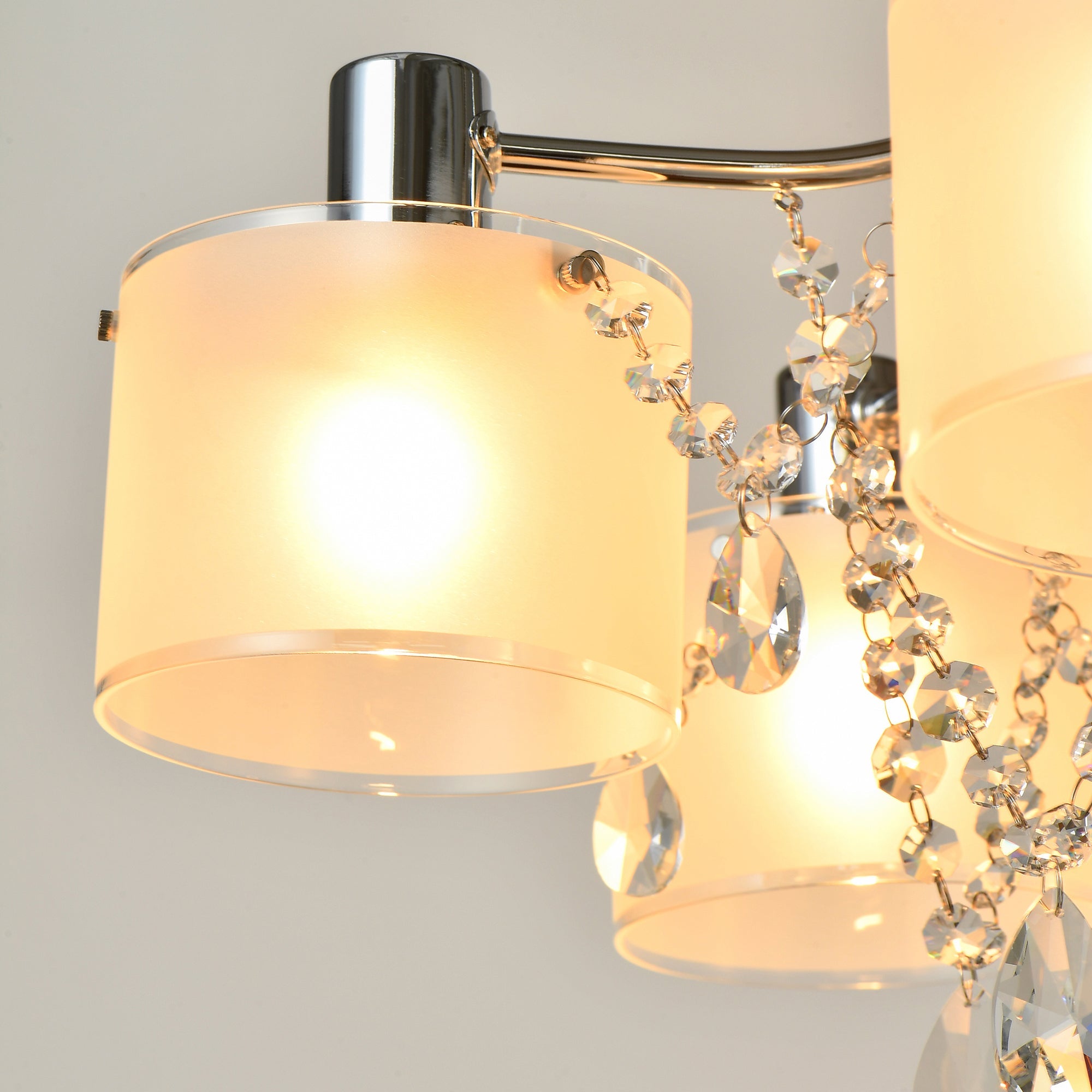 高級感と透明感あふれる現代風シャンデリアです。まるで幾重にも重なるネックレスを纏ったようなゴージャス感。シンプルさの中に輝く洗練されたモダンな仕上がりが魅力です。ガラスセードの間を行き来するように配置されたクリスタルガラスの装飾が電球の明かりを乱反射させて、ゴージャスなキラキラを生みだします。5つの電球にガラスセードを被せることで、ボリューム感がプラスされ、一層モダンで華やかな印象に。派手になりすぎないのでご自宅にはもちろん、サロンやショップにもおすすめのデザインです。できるだけシンプルにまとめた本体と、キラキラと光るクリスタルガラスの装飾の対比に目を奪われる美しい佇まいで、華やかさのある空間づくりにおすすめのペンダントライトです。余分なコードはシーリングカップの中にスッキリと収納できます。